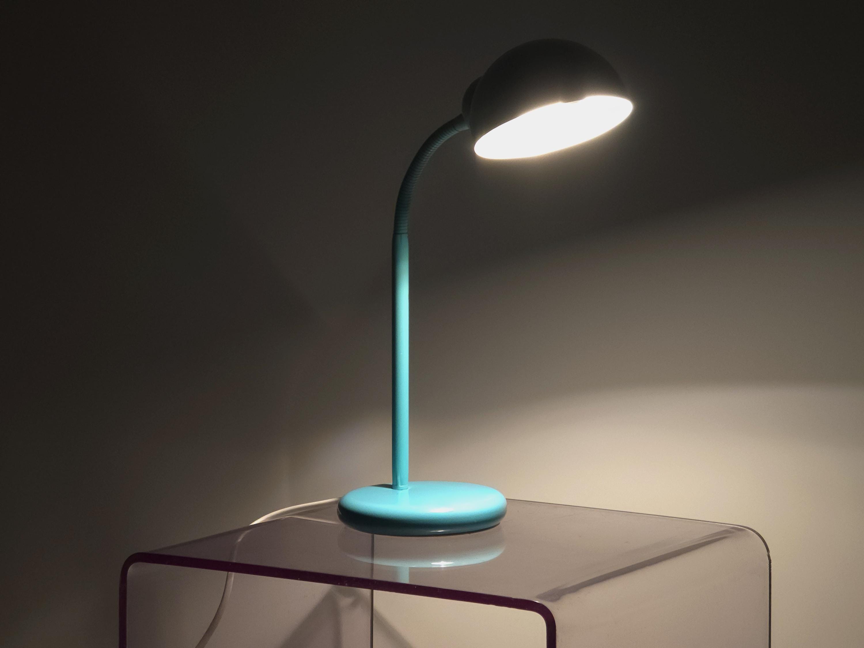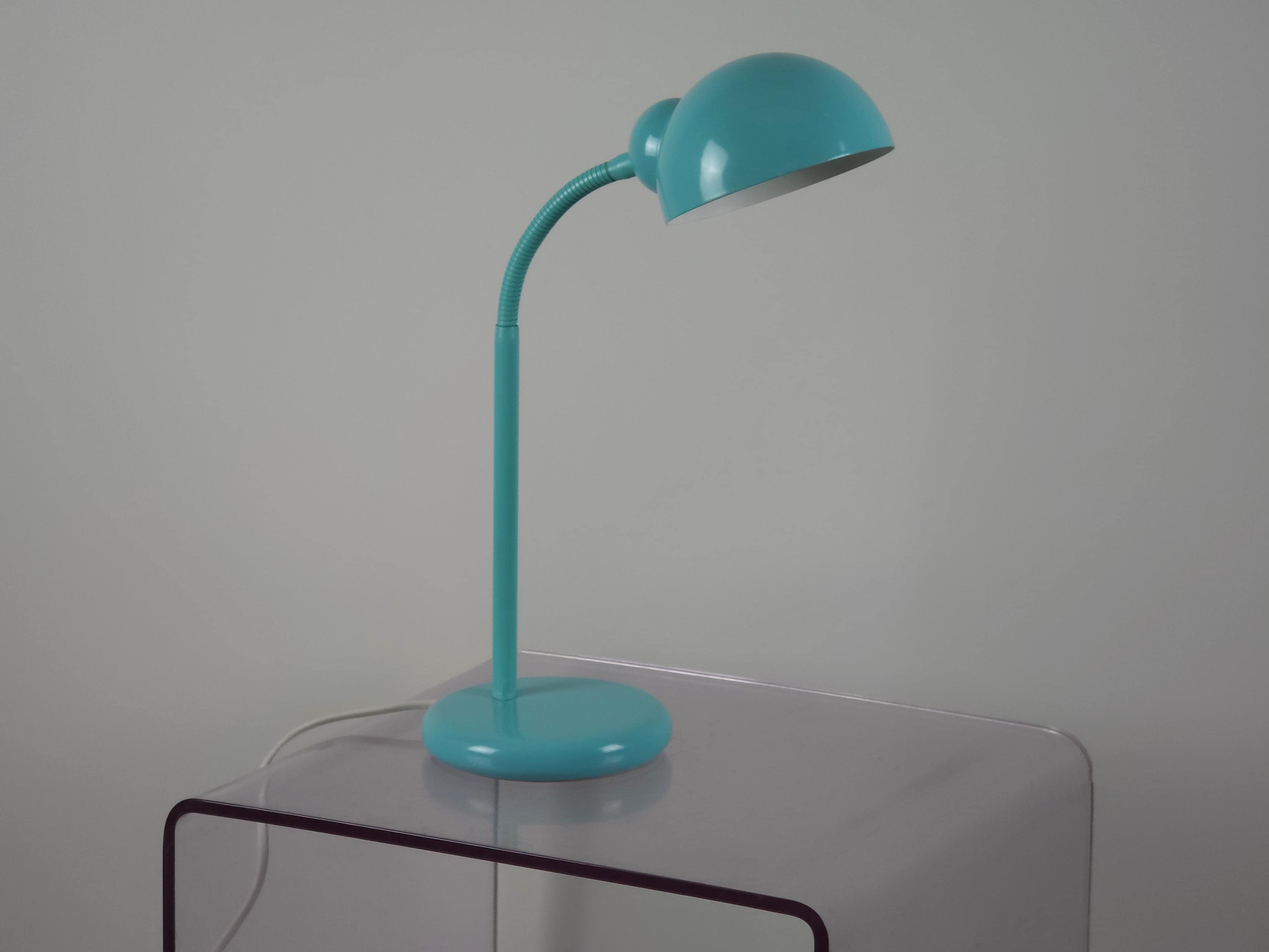 Vintage 1980s postmodern industrial style aqua-blue lacquered utilitarian gooseneck desk lamp by Happylight Holland.