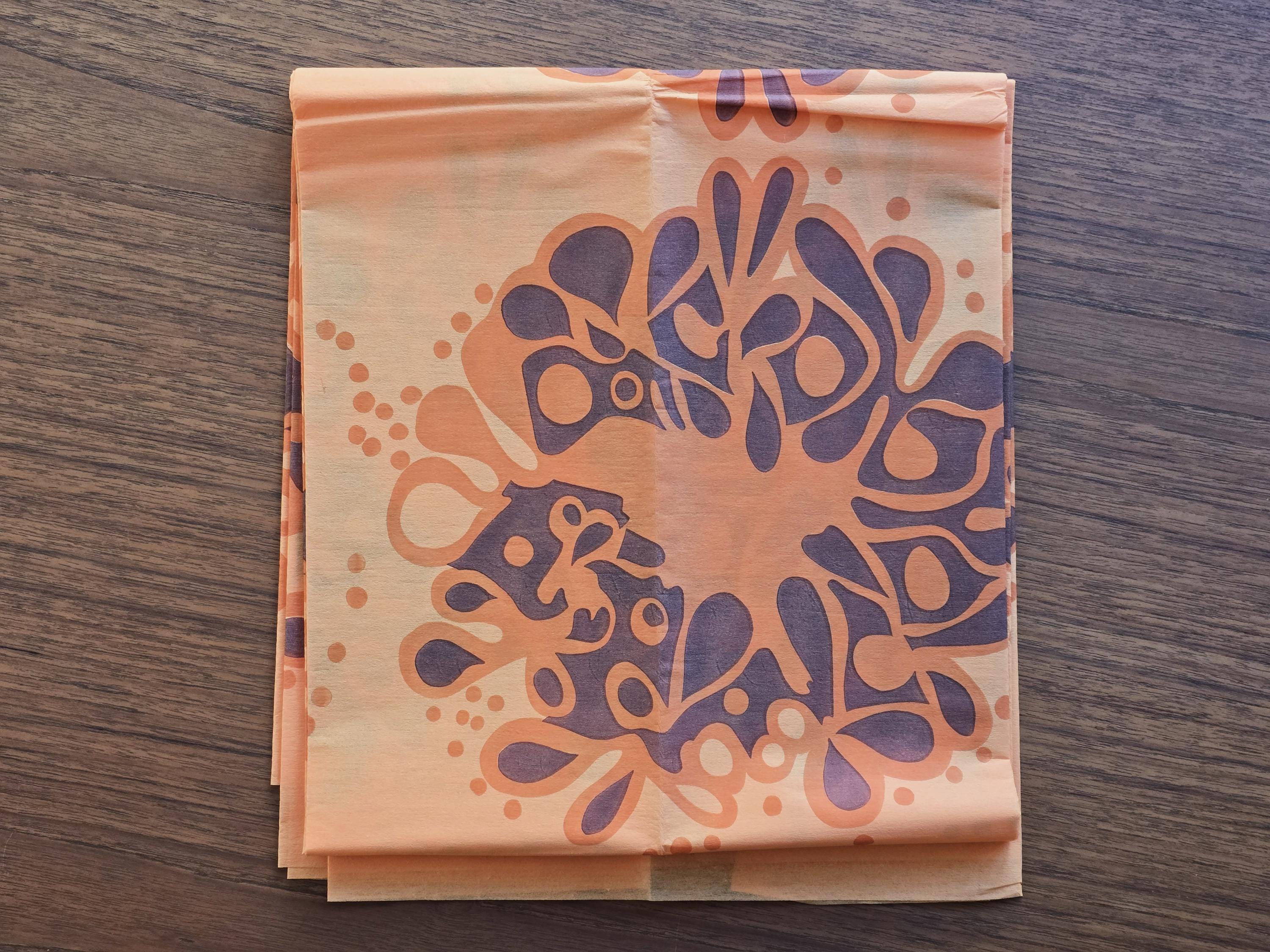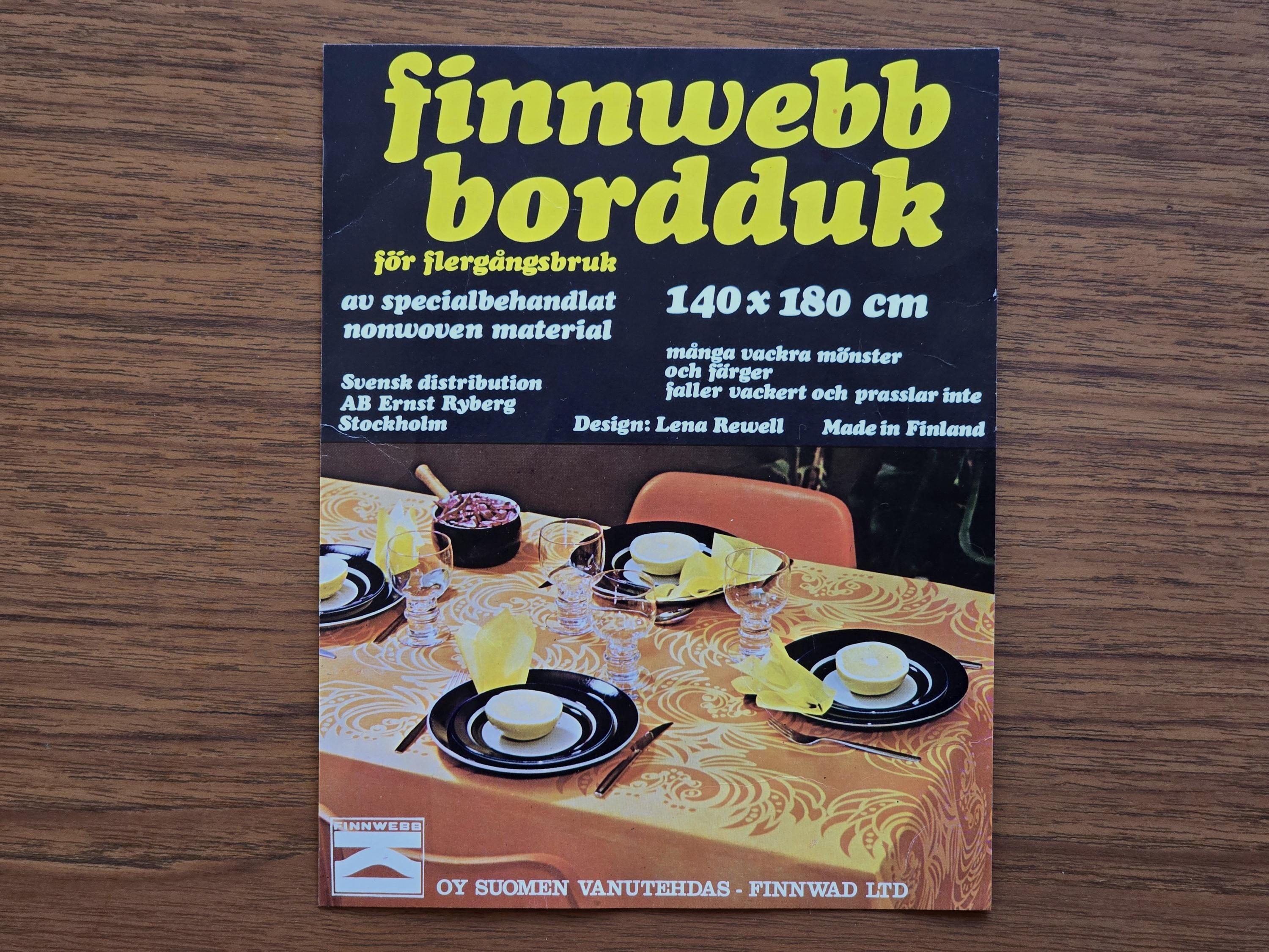 New old stock 1970s vintage paper tablecloth from the Finnish brand Finnweb. This "Finnwebb" cloth is made from a specialized nonwoven material that is soft to the touch and designed for multiple uses rather than single-use disposal.