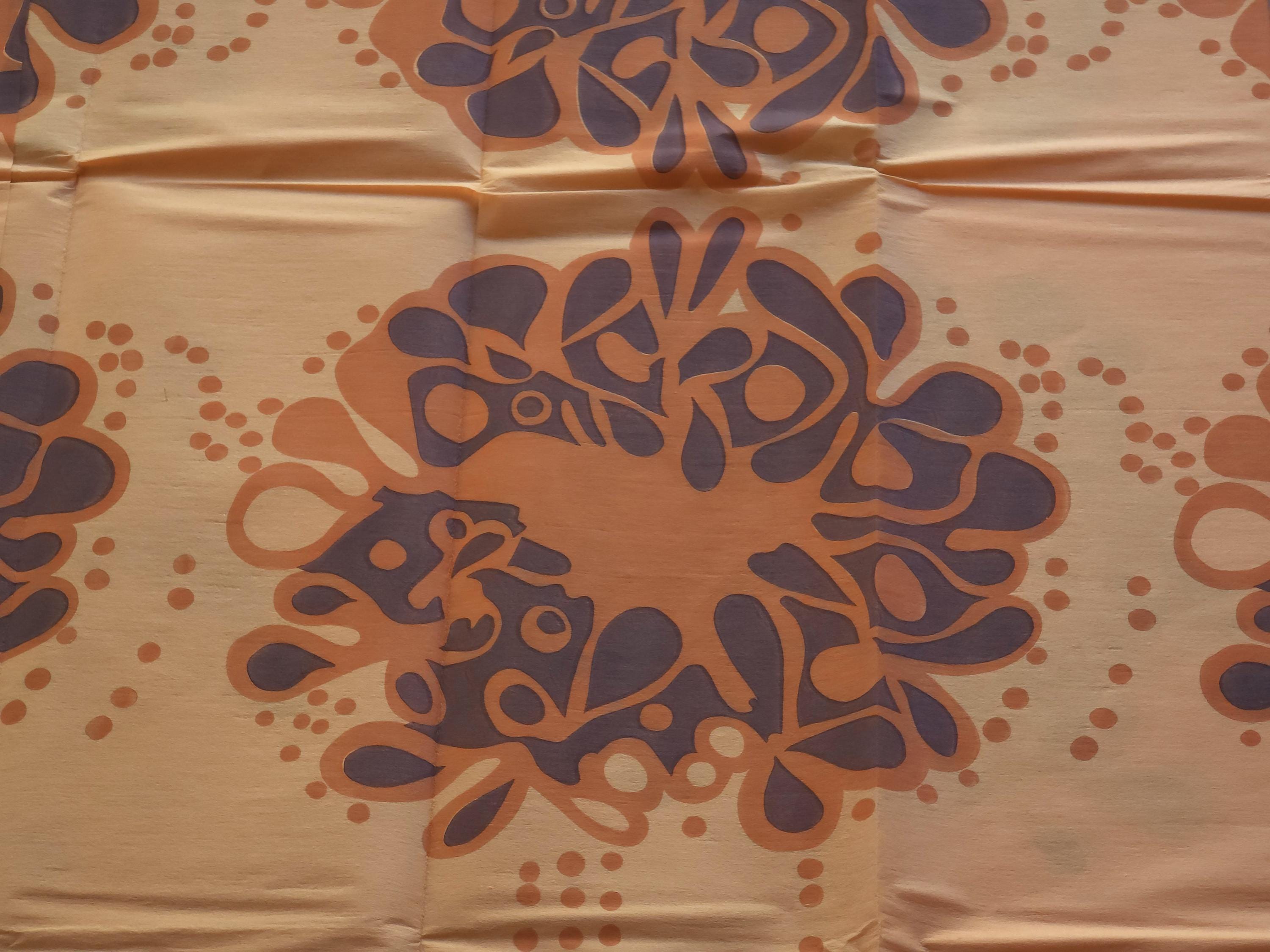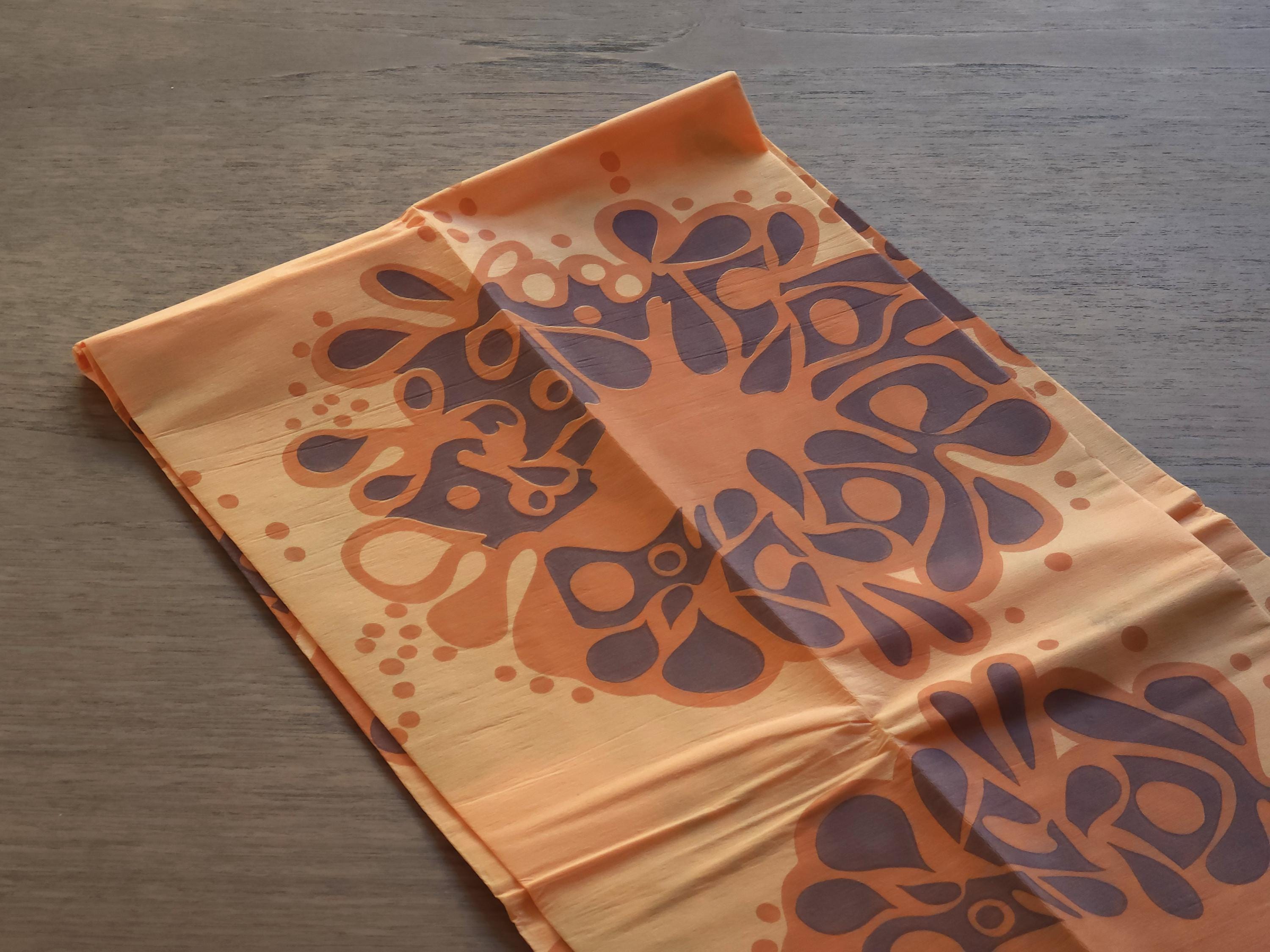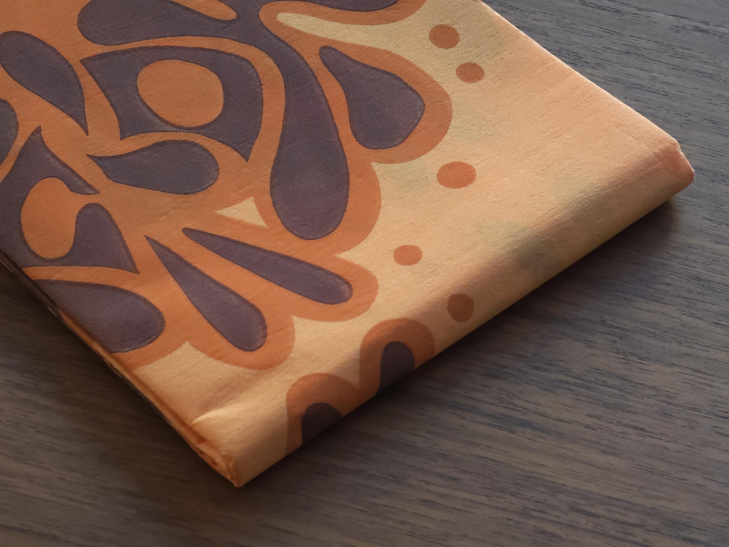 The pattern features a bold, 1970s-era abstract design in warm orange and chocolate brown.