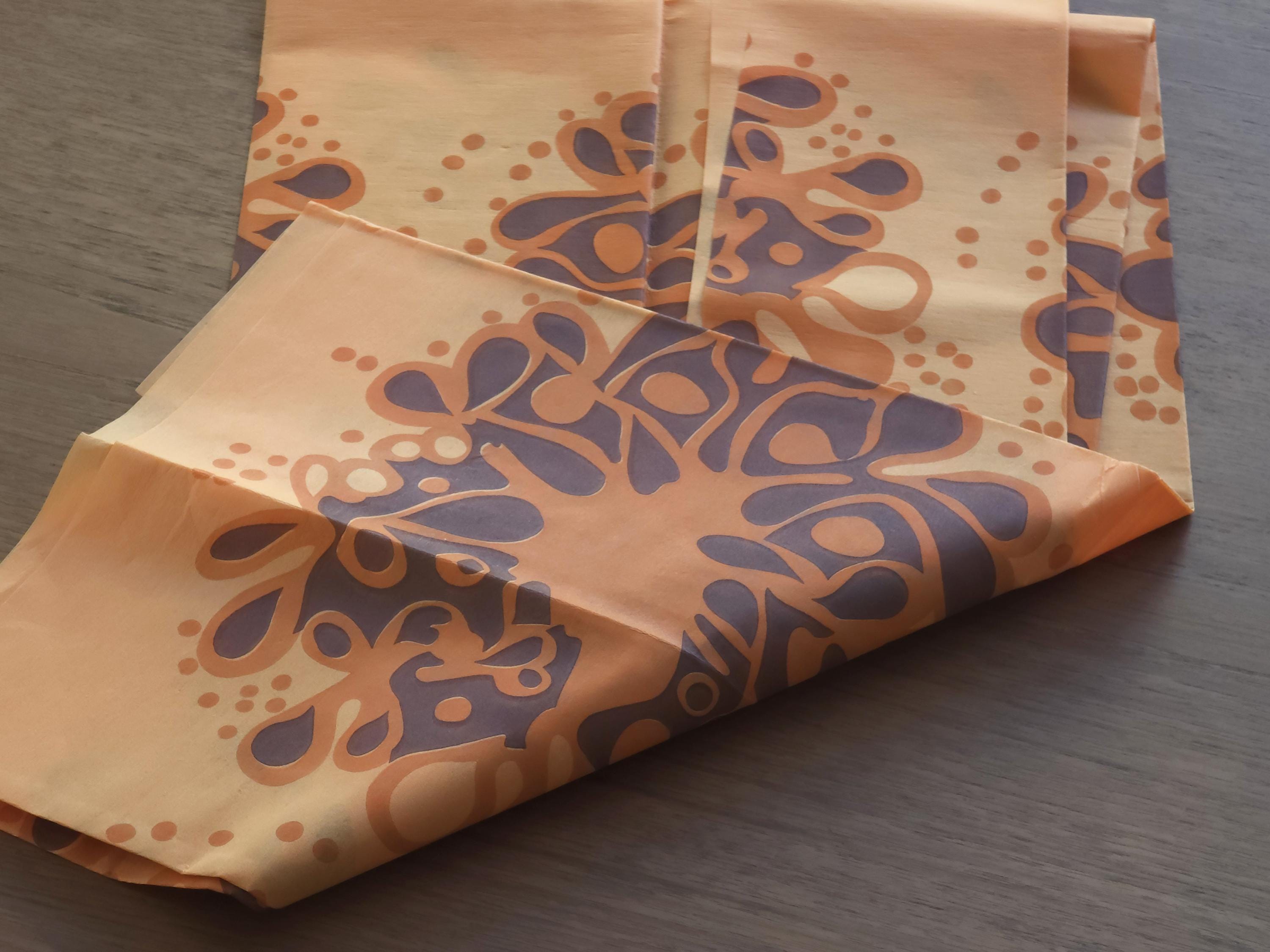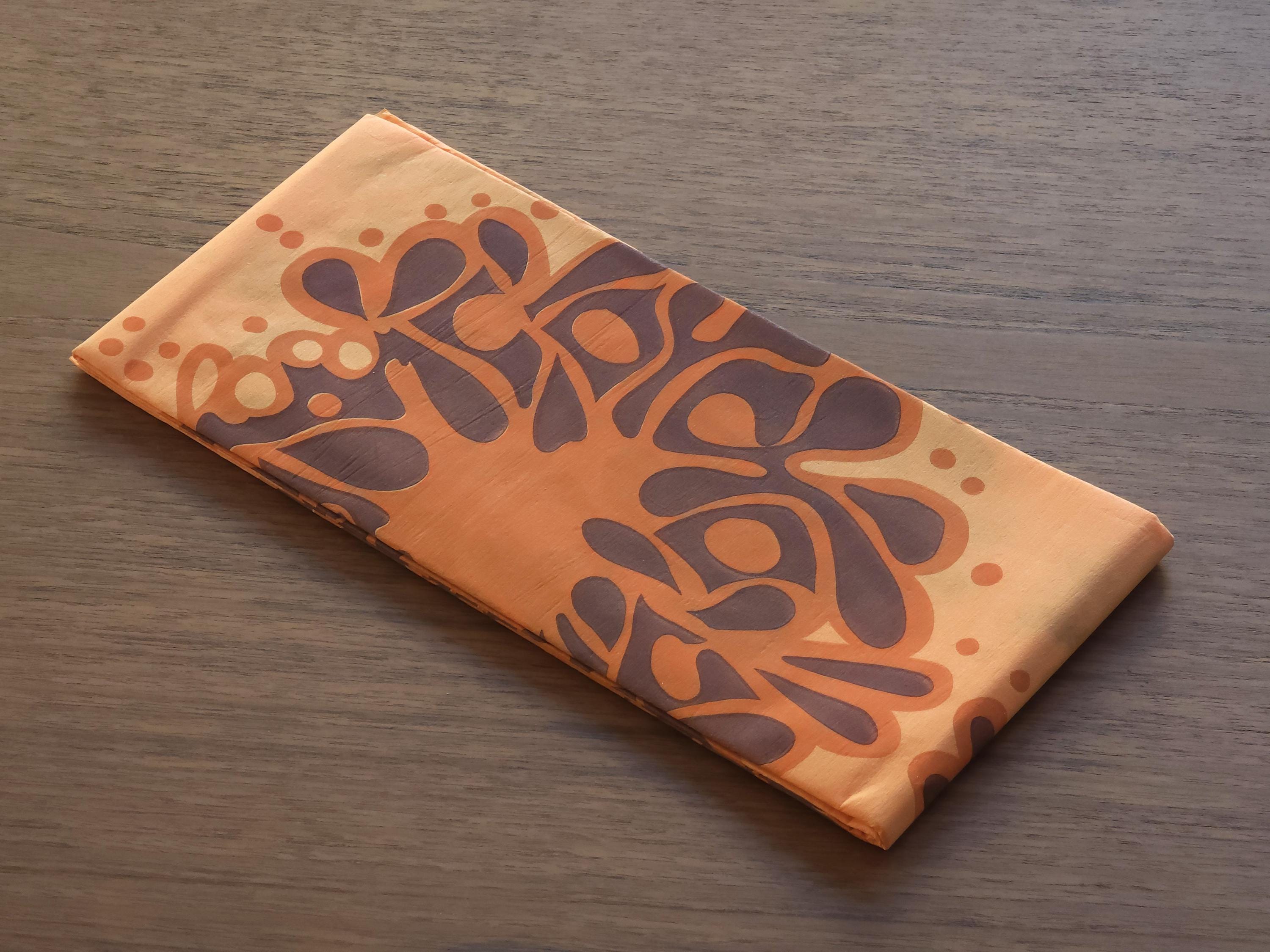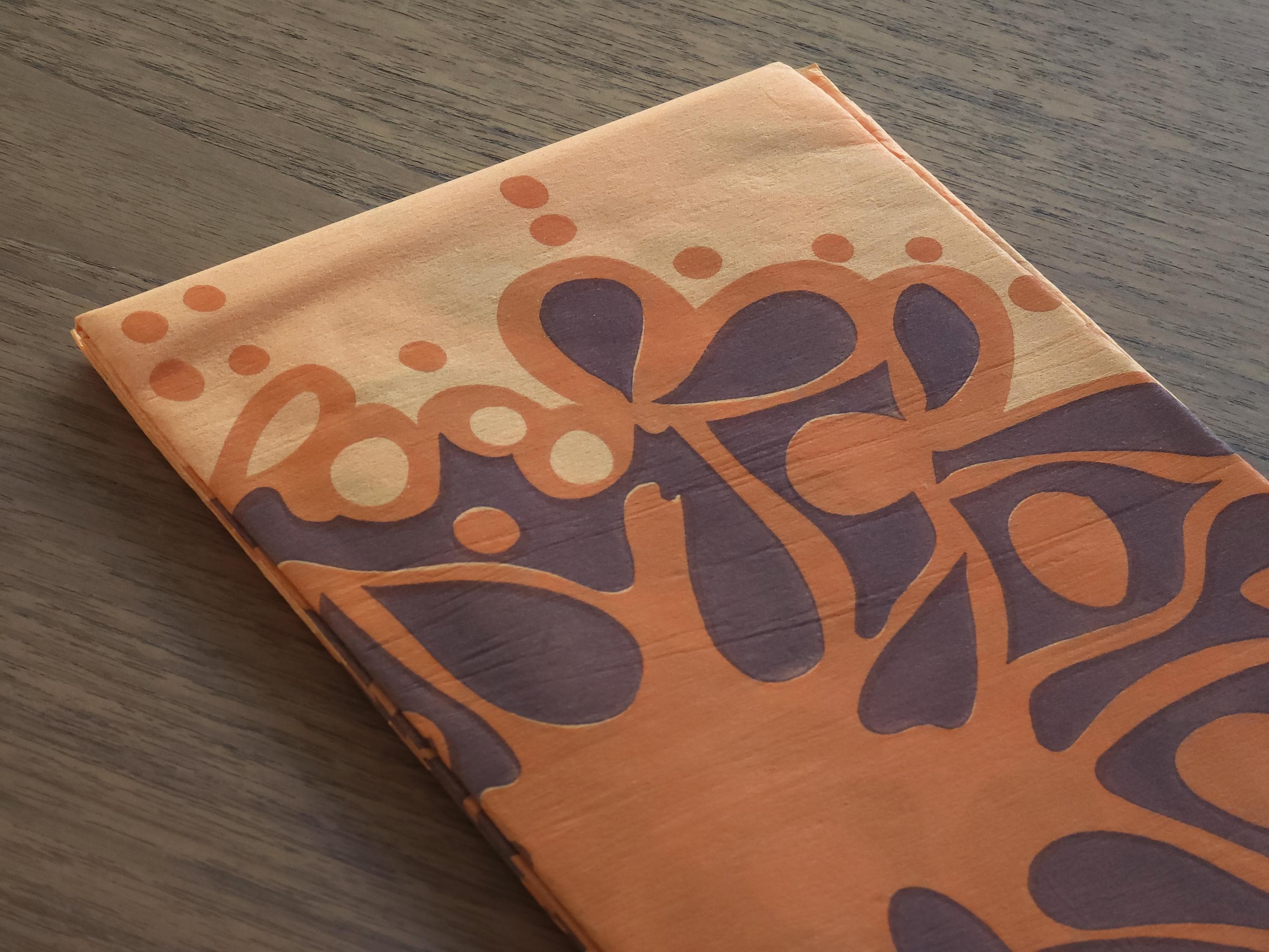 The pattern features a bold, 1970s-era abstract design in warm orange and chocolate brown.