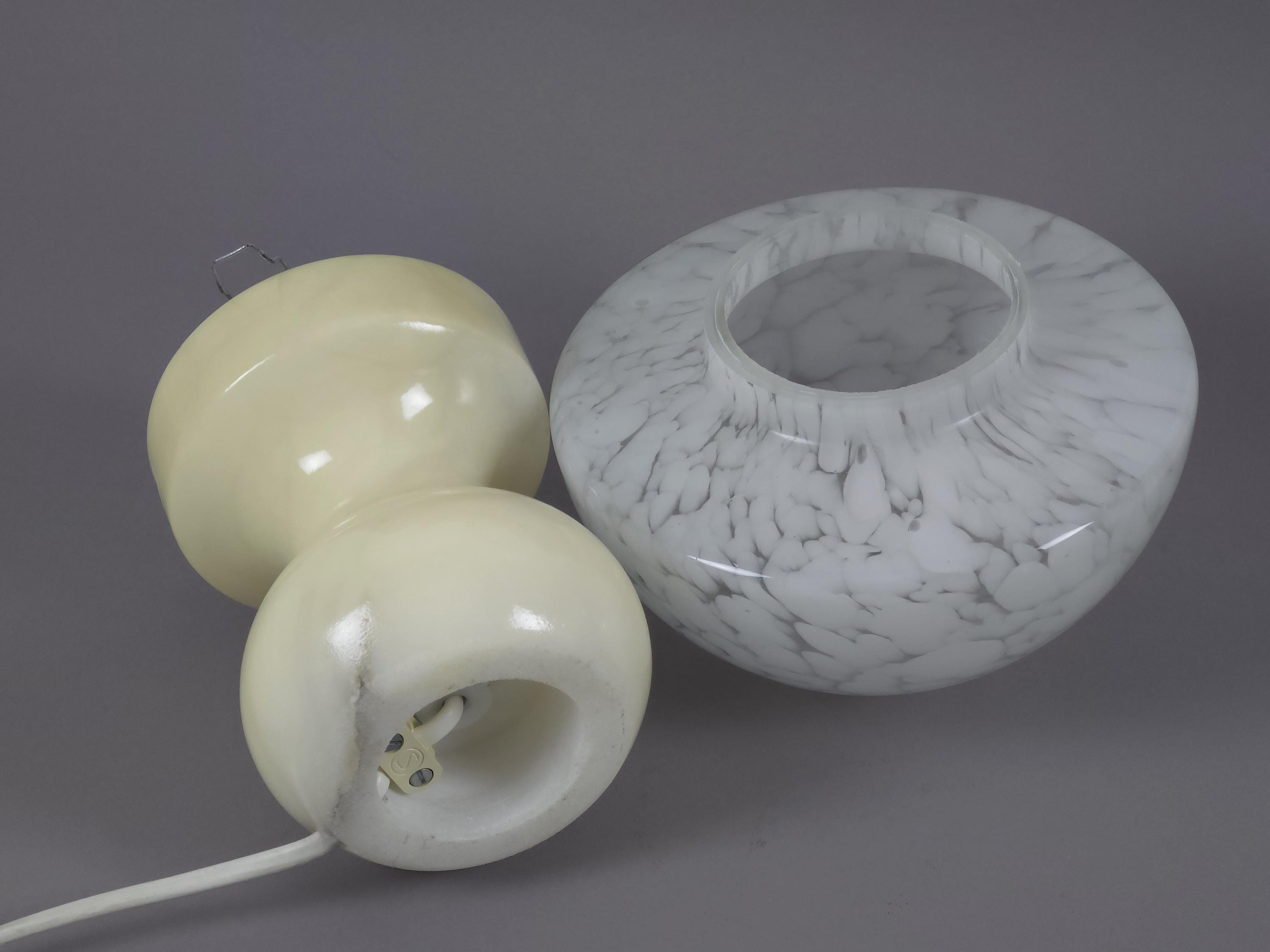 Vintage 1960s mushroom table lamp with mottled snow glass shade and marble base by Swedish manufacturer Reijmyre Armaturfabrik (RAF).