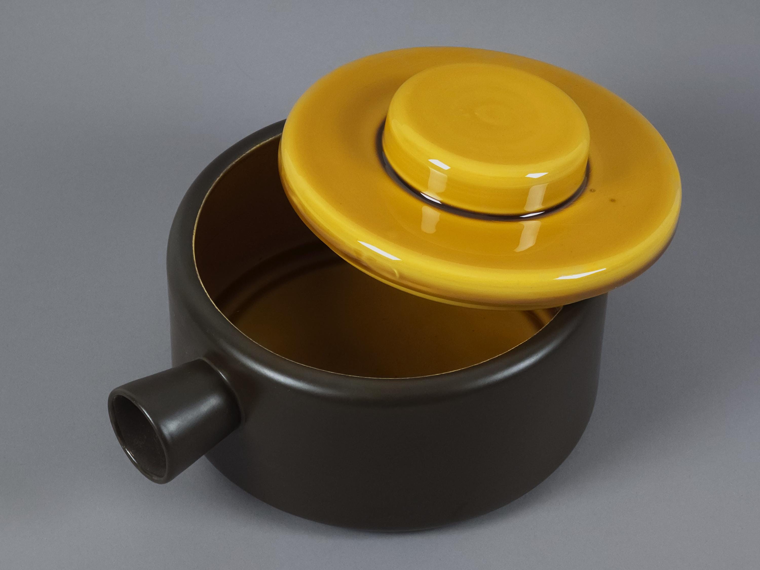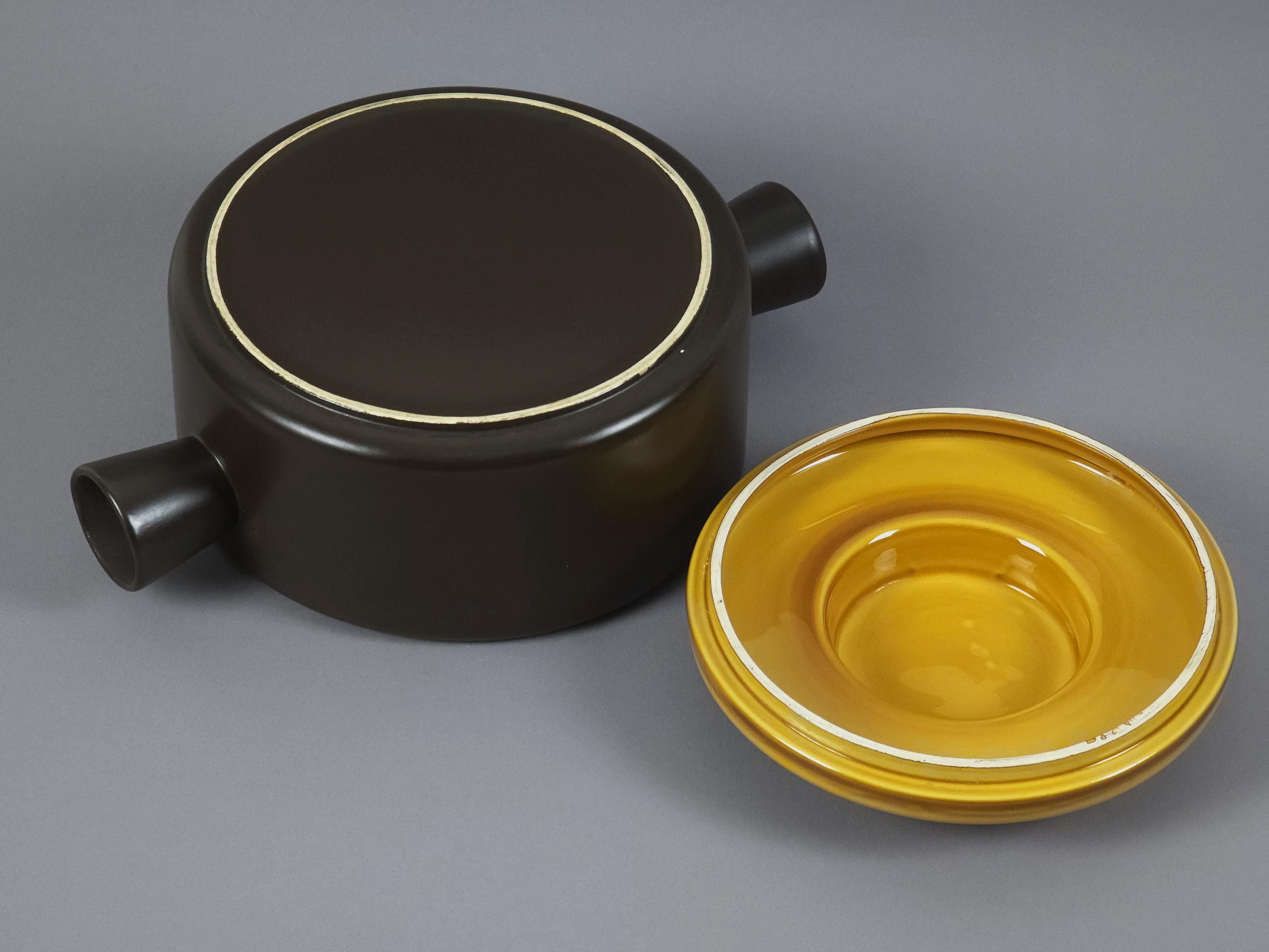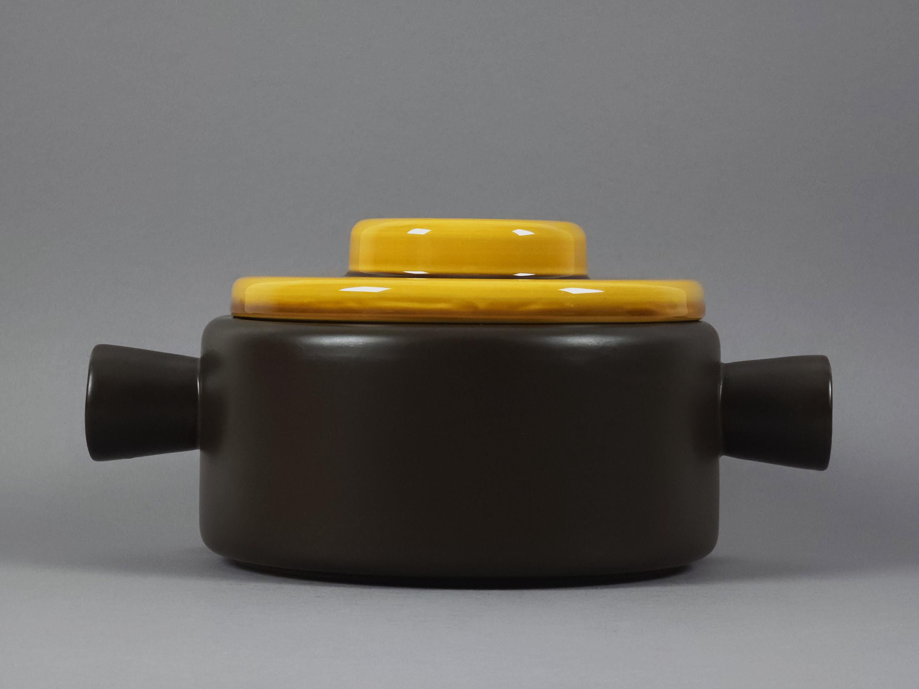 An authentic 1962 "Utrecht" series lidded tureen, soupière (serving dish) from the renowned Dutch pottery De Driehoek Huizen. This piece exemplifies modernist Mid-Century Modern design with its clean lines and contrasting glaze textures.