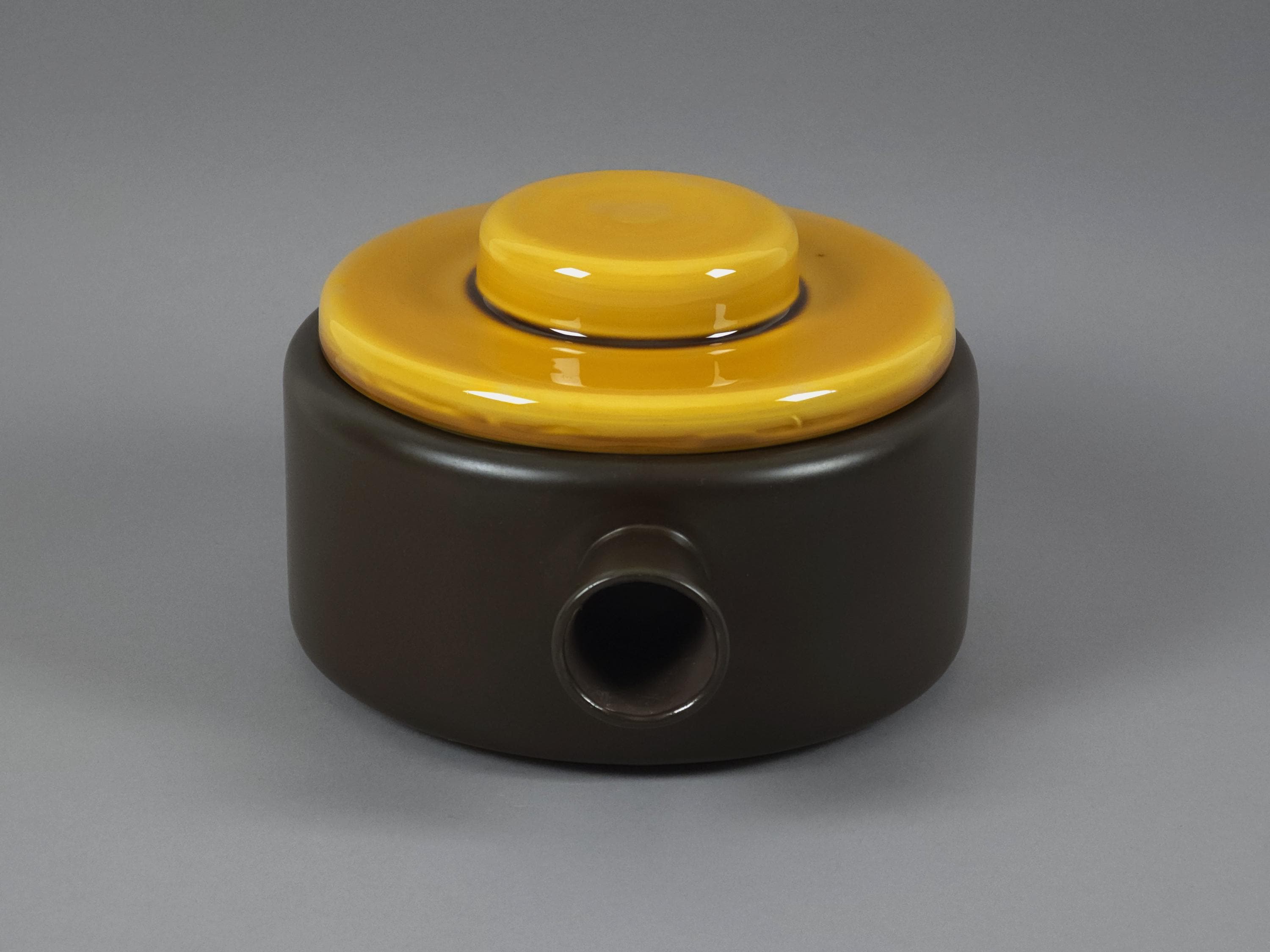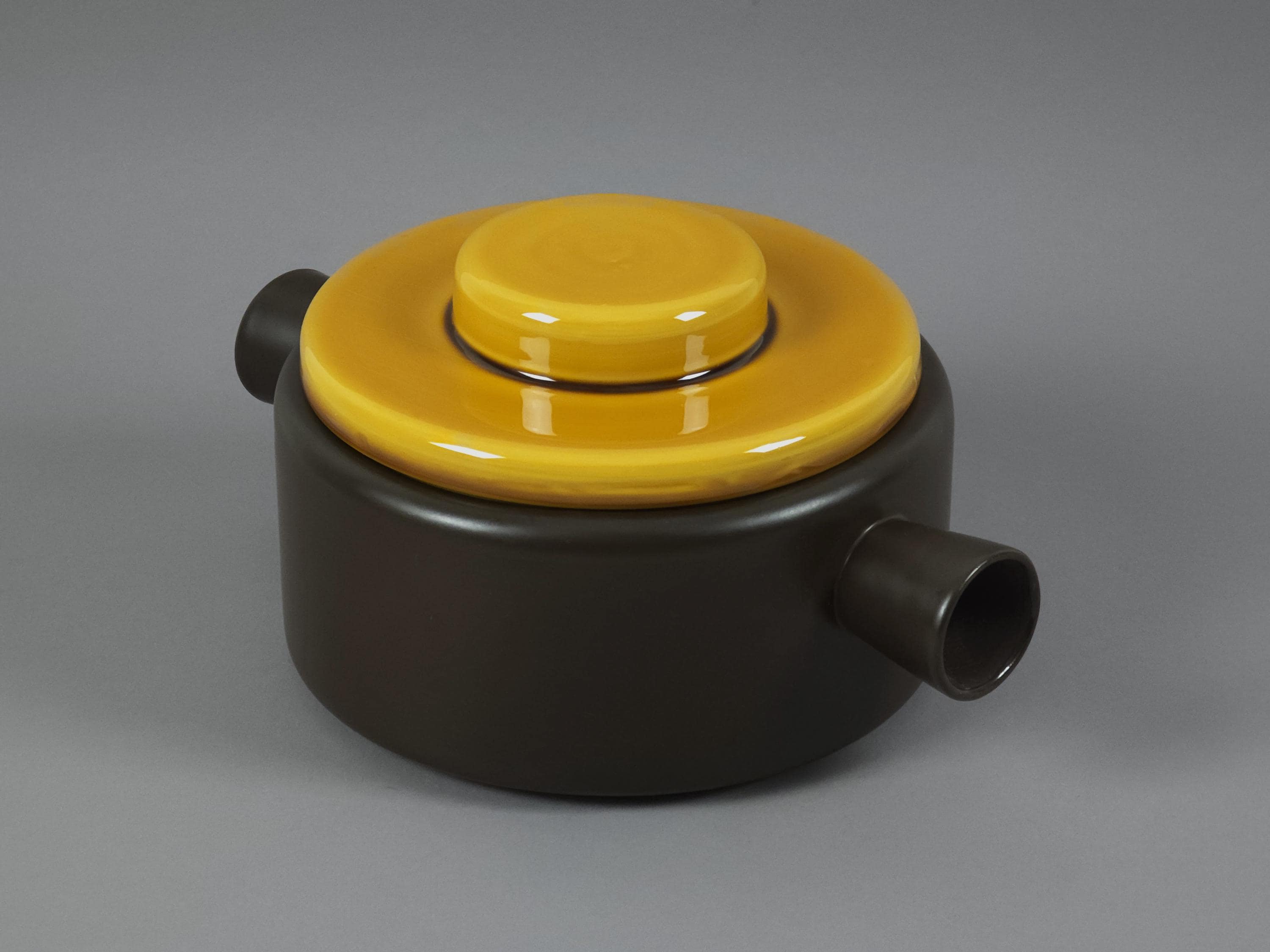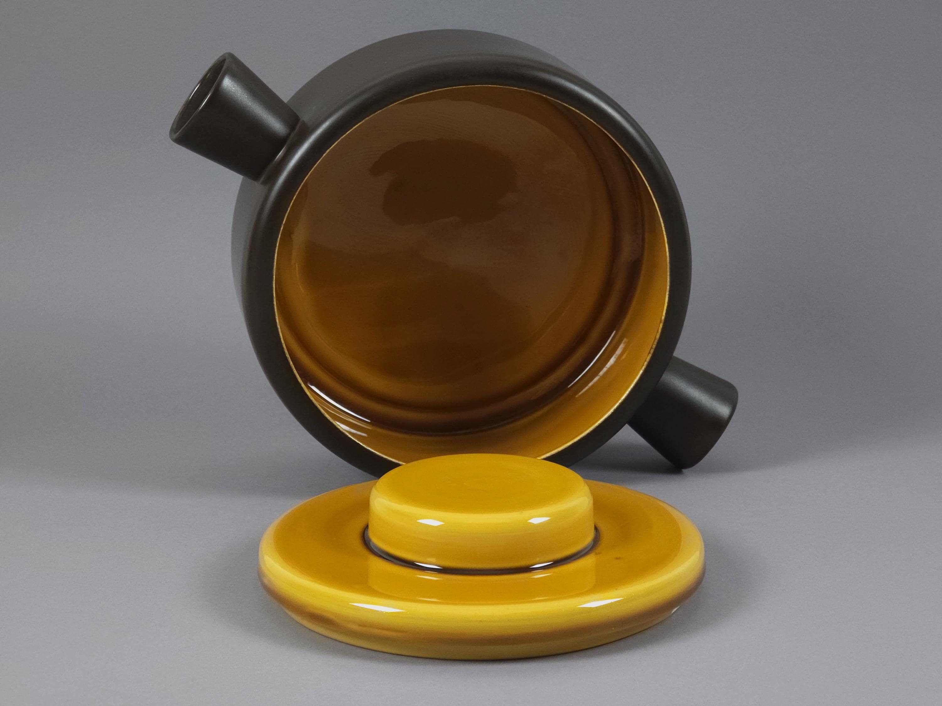 An authentic 1962 "Utrecht" series lidded tureen, soupière (serving dish) from the renowned Dutch pottery De Driehoek Huizen. This piece exemplifies modernist Mid-Century Modern design with its clean lines and contrasting glaze textures.