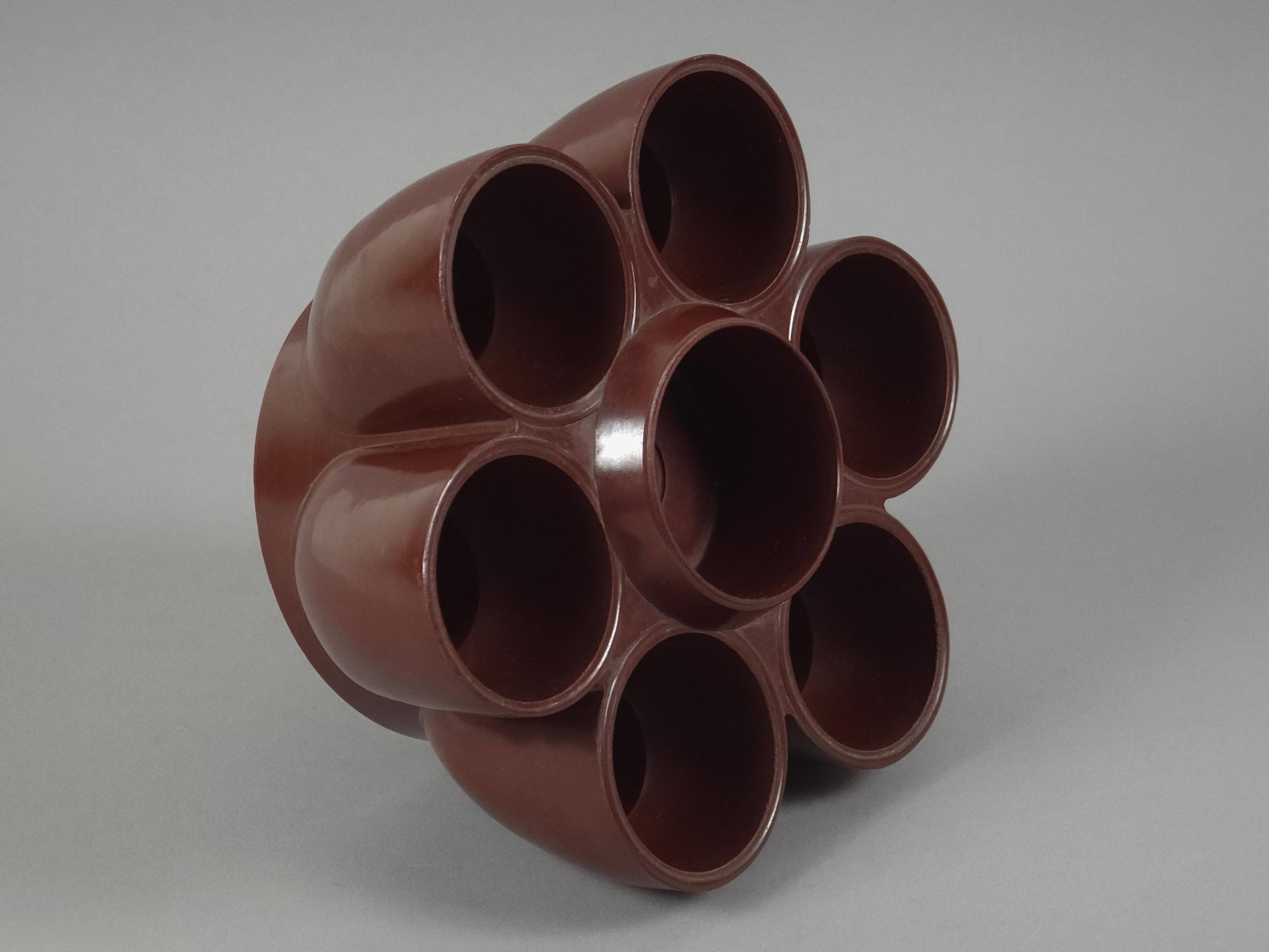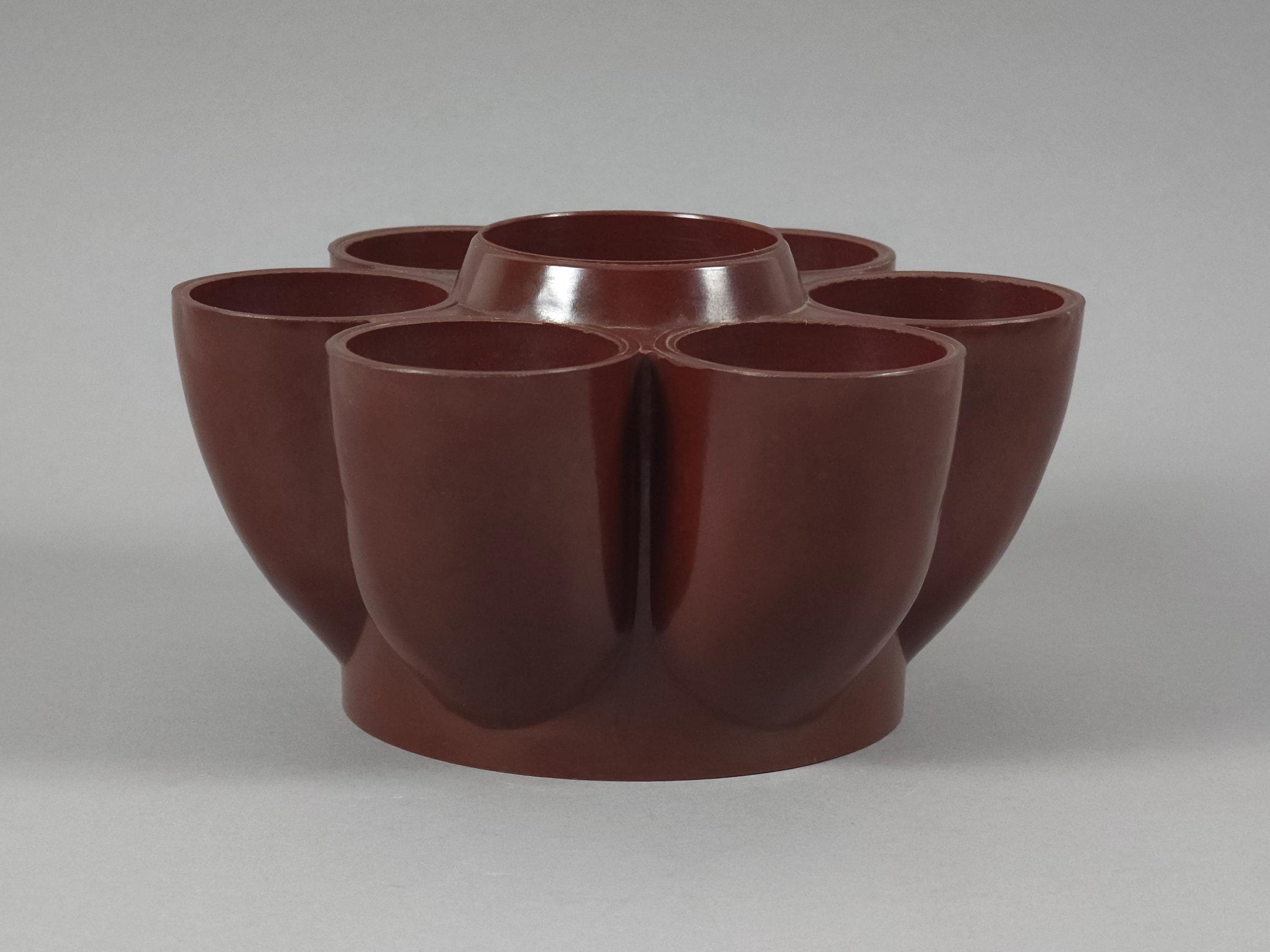 A rare and peculiar piece of French café history, this Art Deco egg display was manufactured by Surex Paris. Originally used on bistro counters to serve hard-boiled eggs, this sculptural holder features six integrated egg cups orbiting a central salt reservoir.