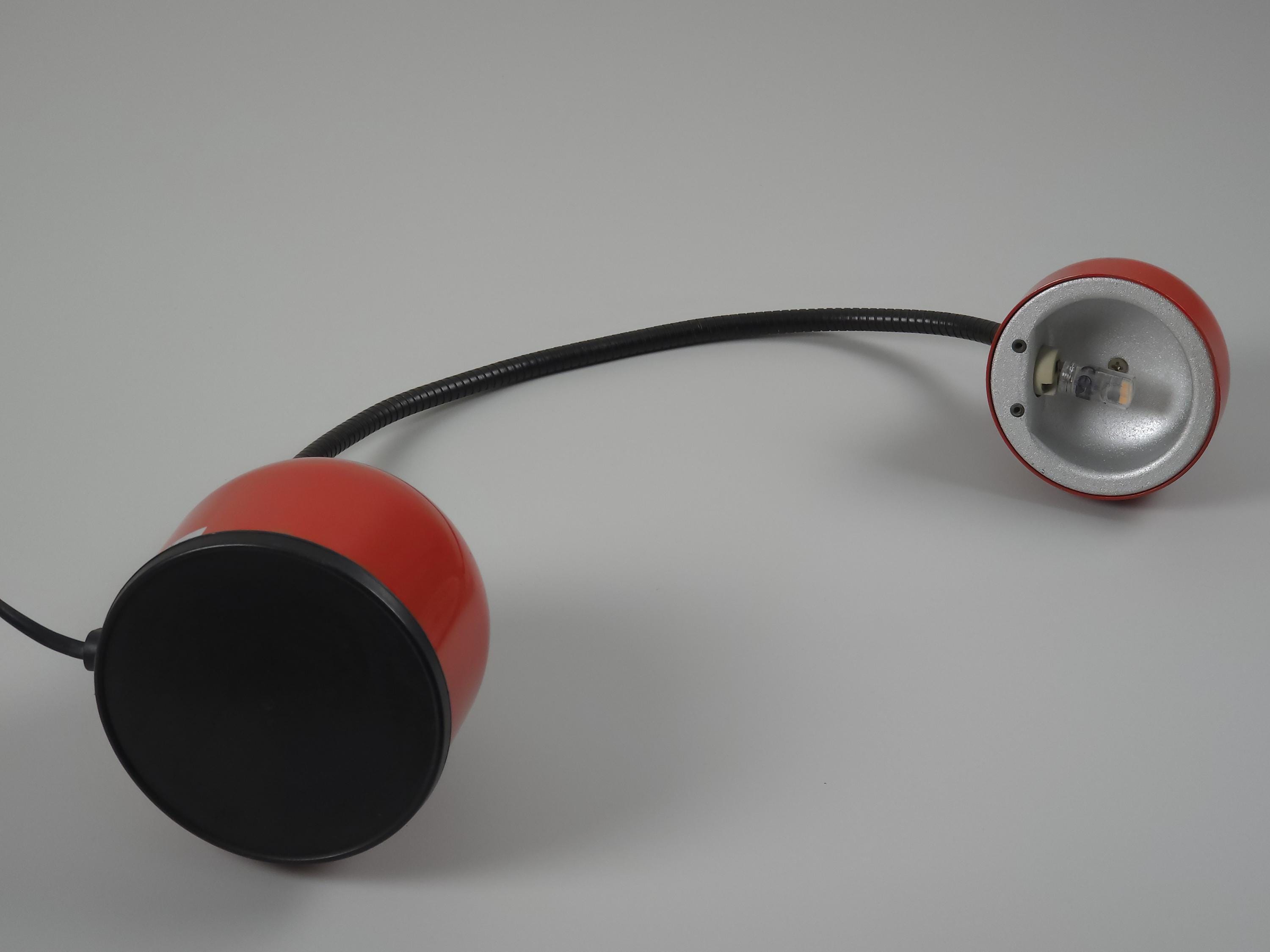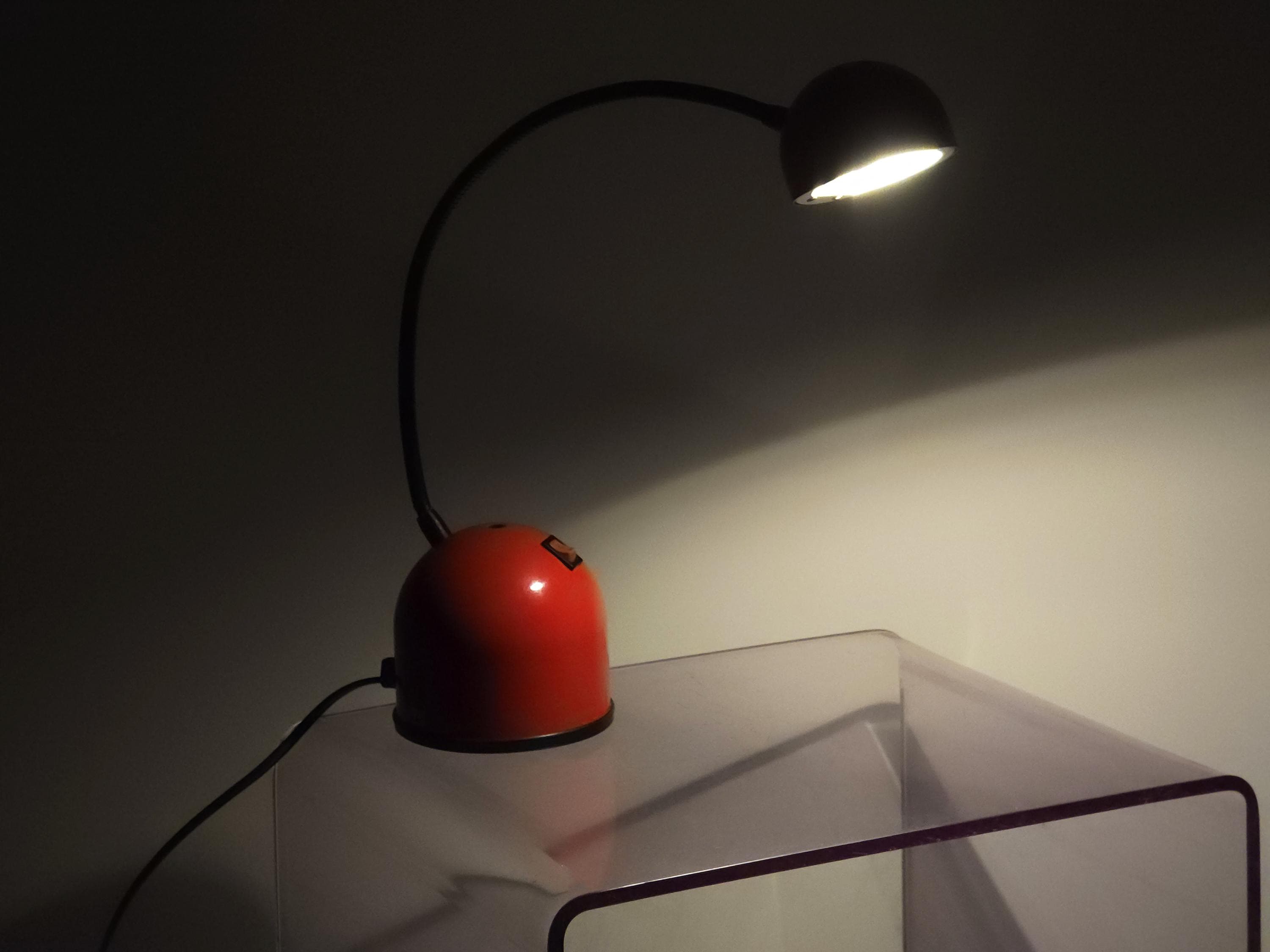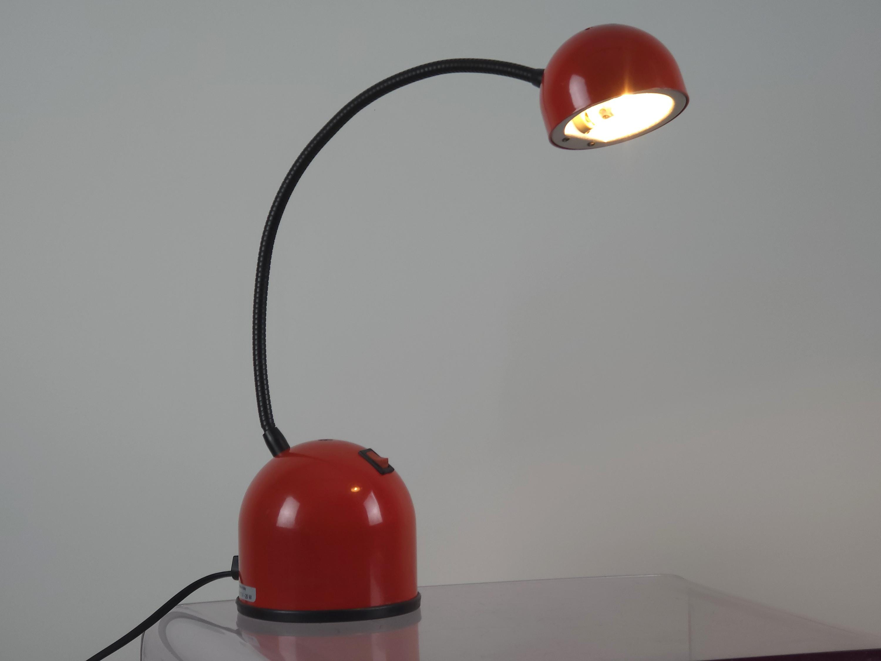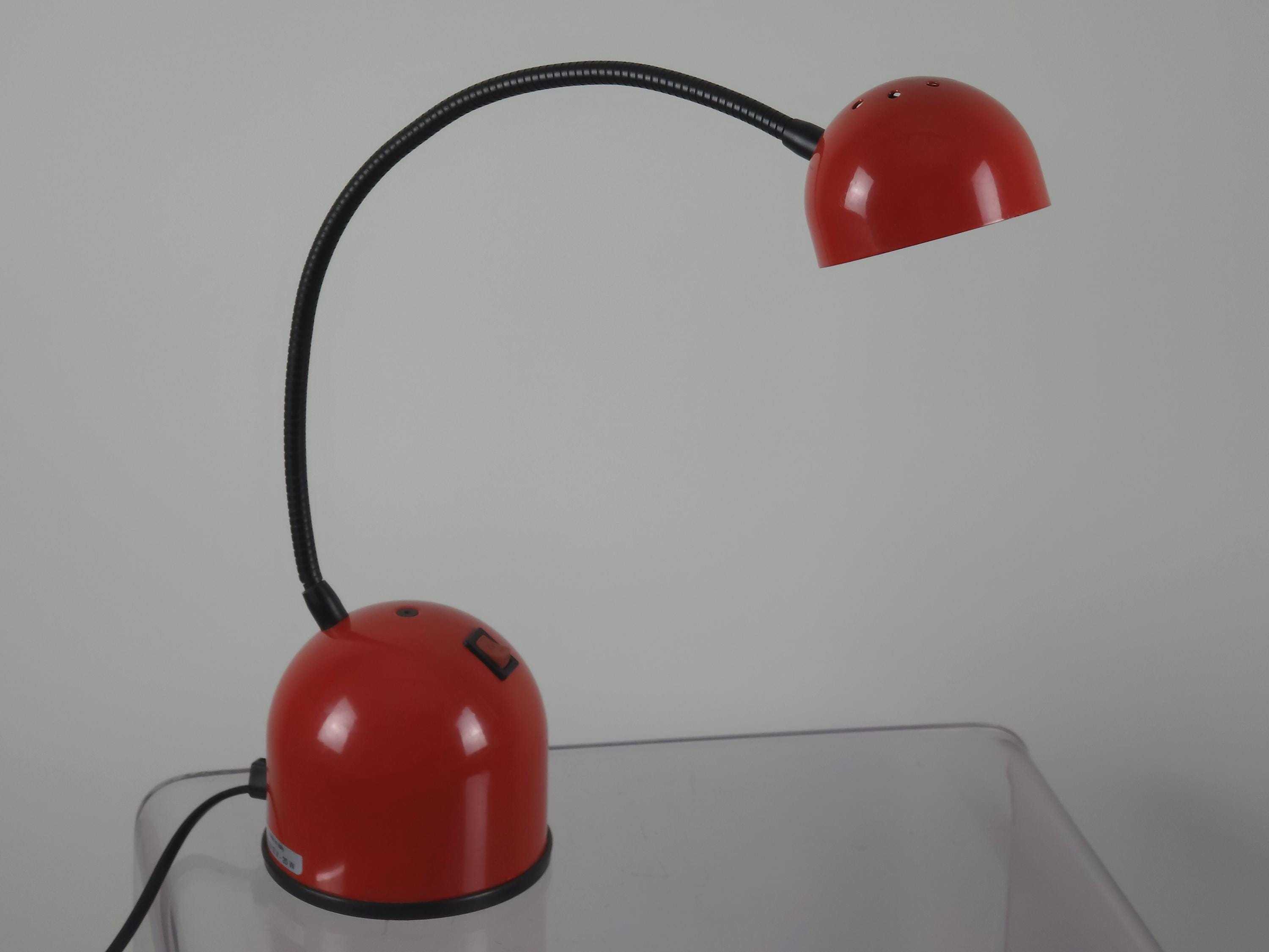 1980s vintage postmodern adjustable desk lamp with a vibrant red plastic dome base and shade by Stilplast Italy.