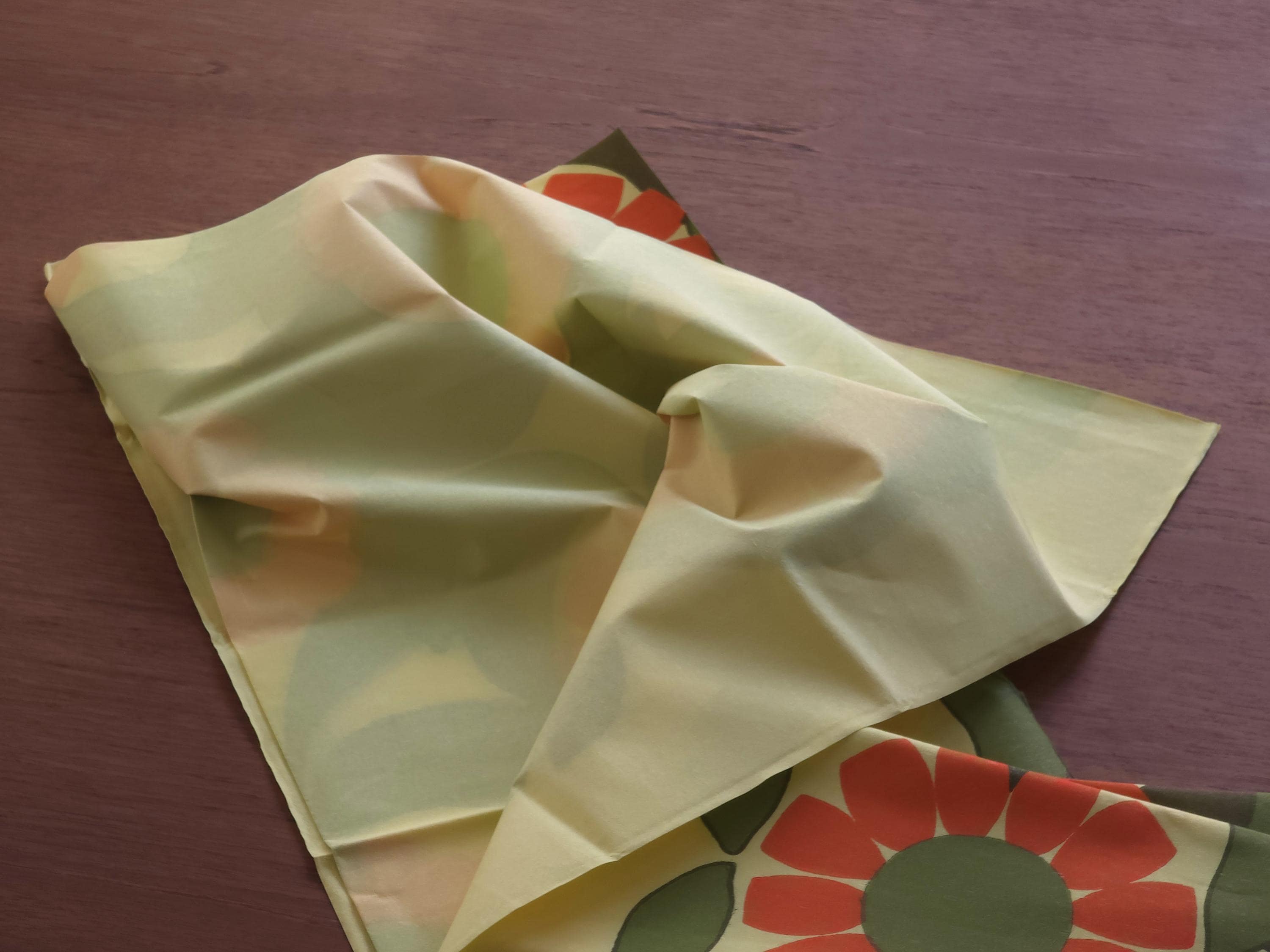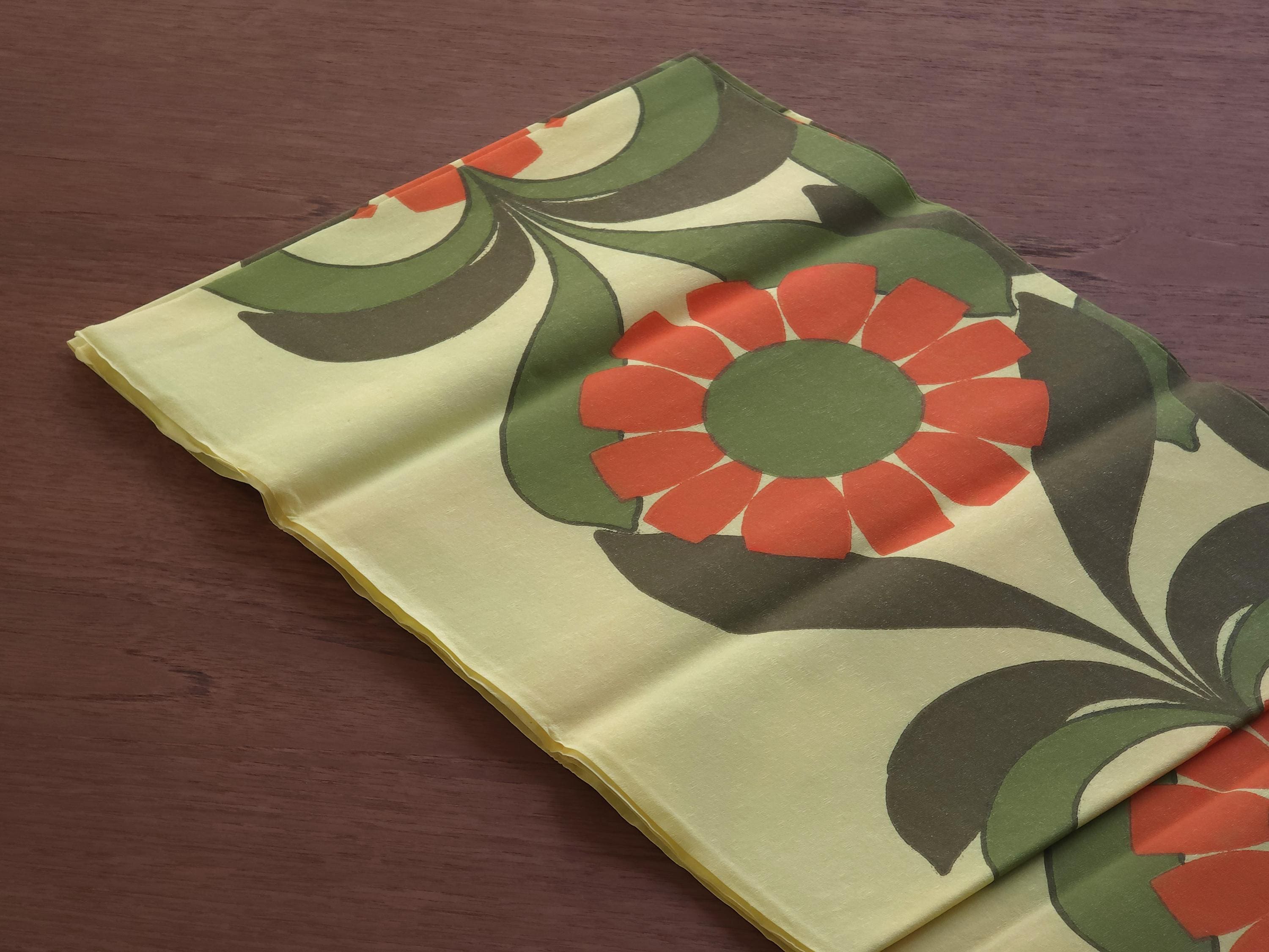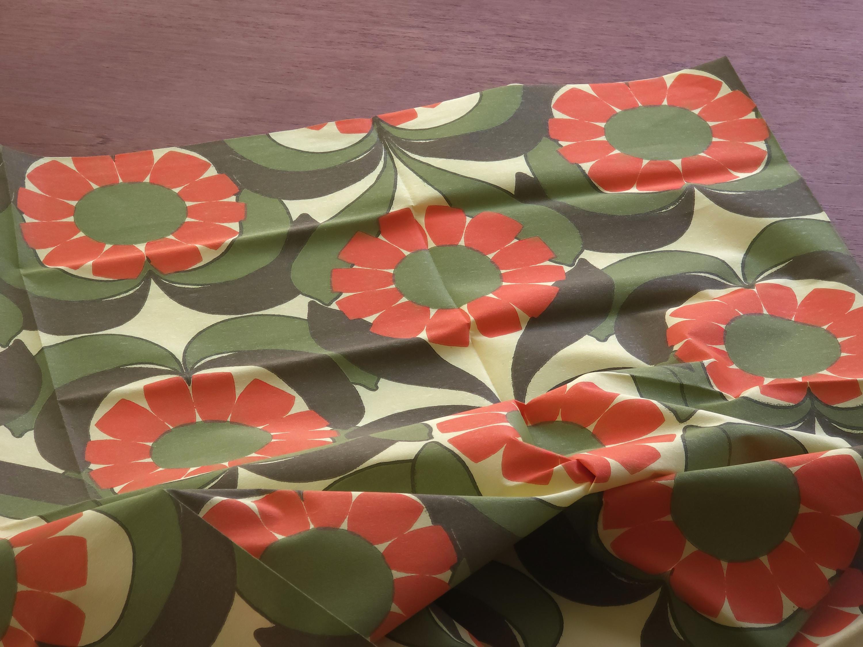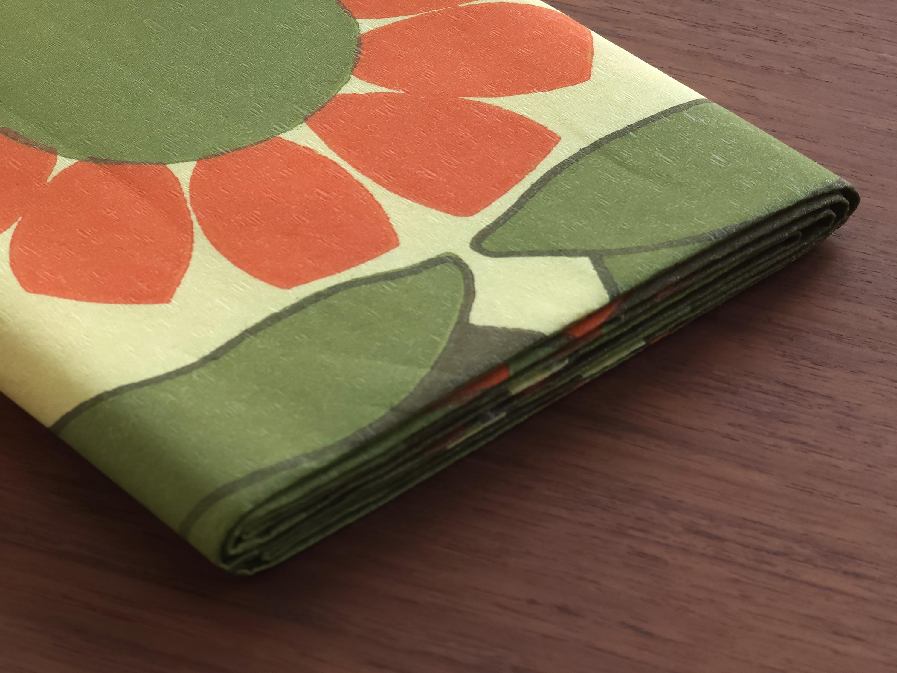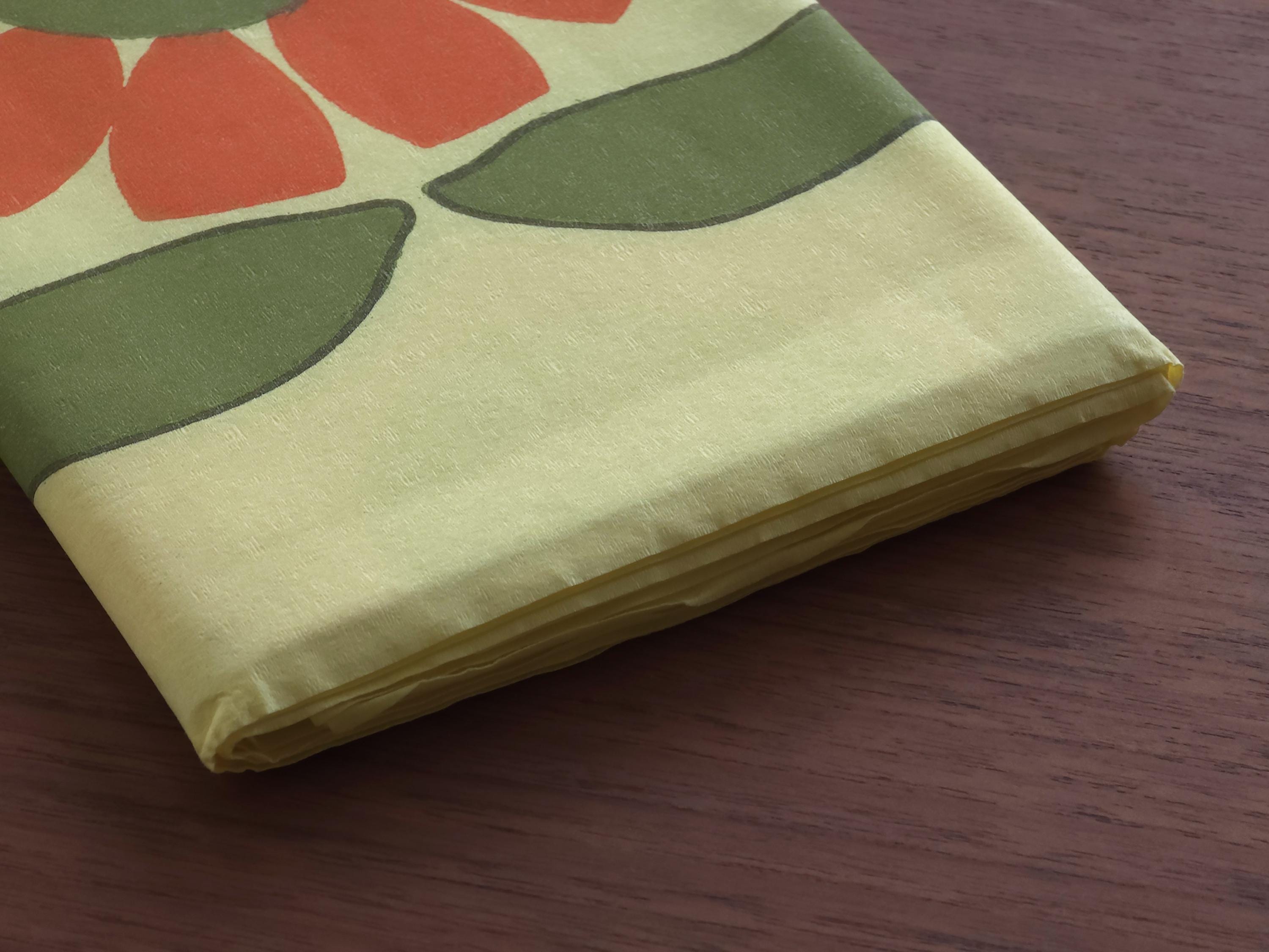 New old stock 1970s vintage paper tablecloth from the Swedish brand Duni. It features a vibrant, large-scale floral illustration of burnt orange, moss green, and a pale yellow background., typical of 1970s Scandinavian textile design.