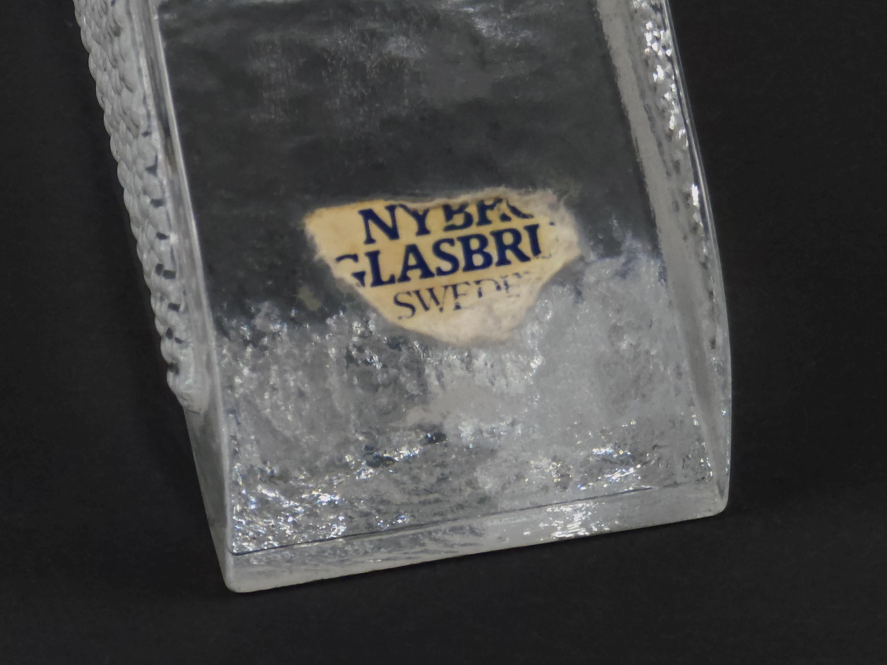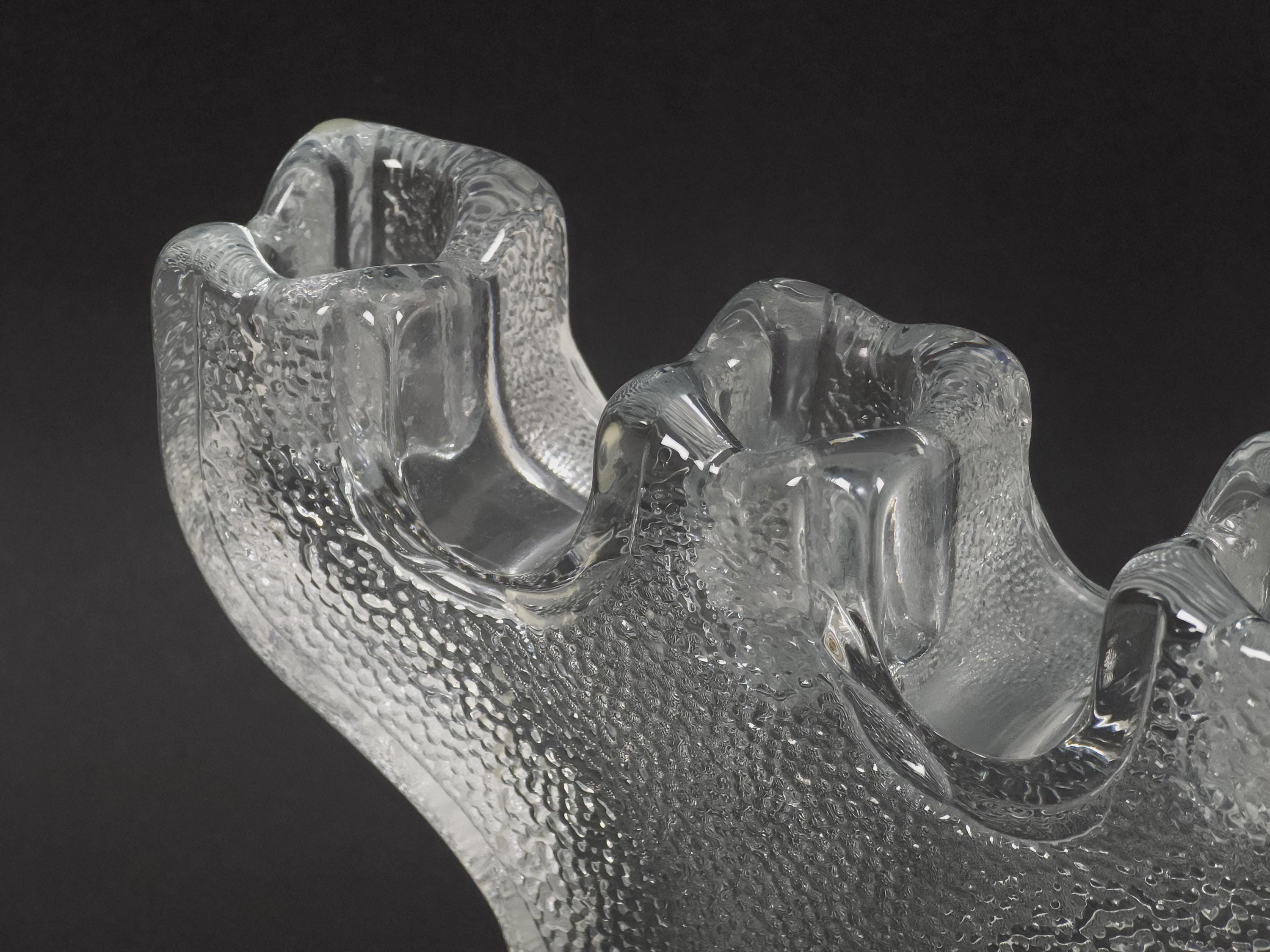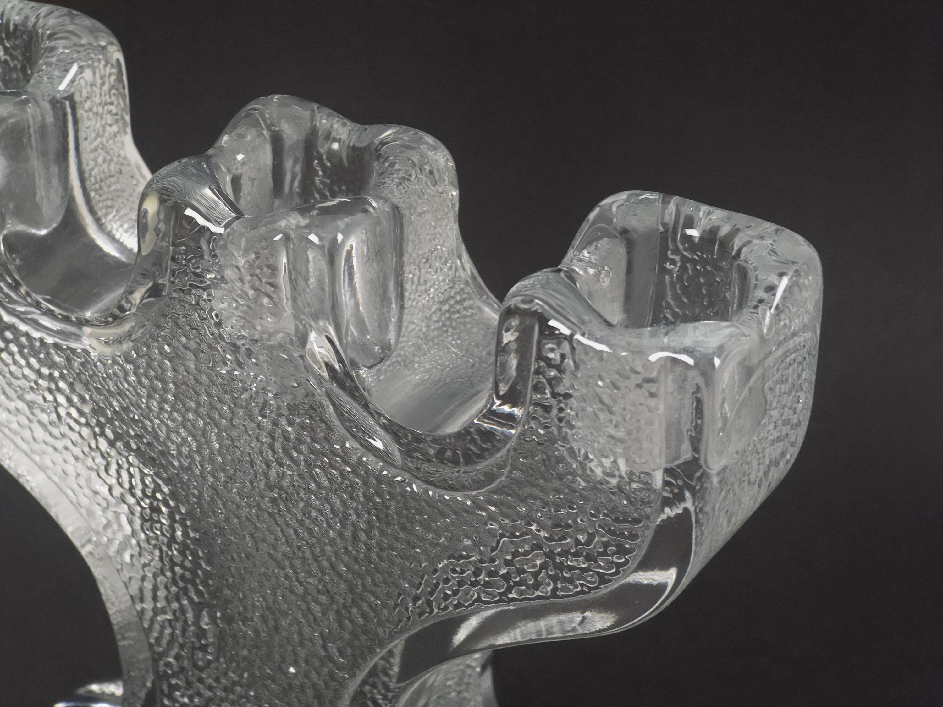 Vintage 1970s ice-glass 3-arm candelabra Paul Isling for Nybro Glasbruk. The heavy, hand-molded glass features a deep, craggy texture on the front and back that mimics natural ice formations, while the edges remain smooth and polished.