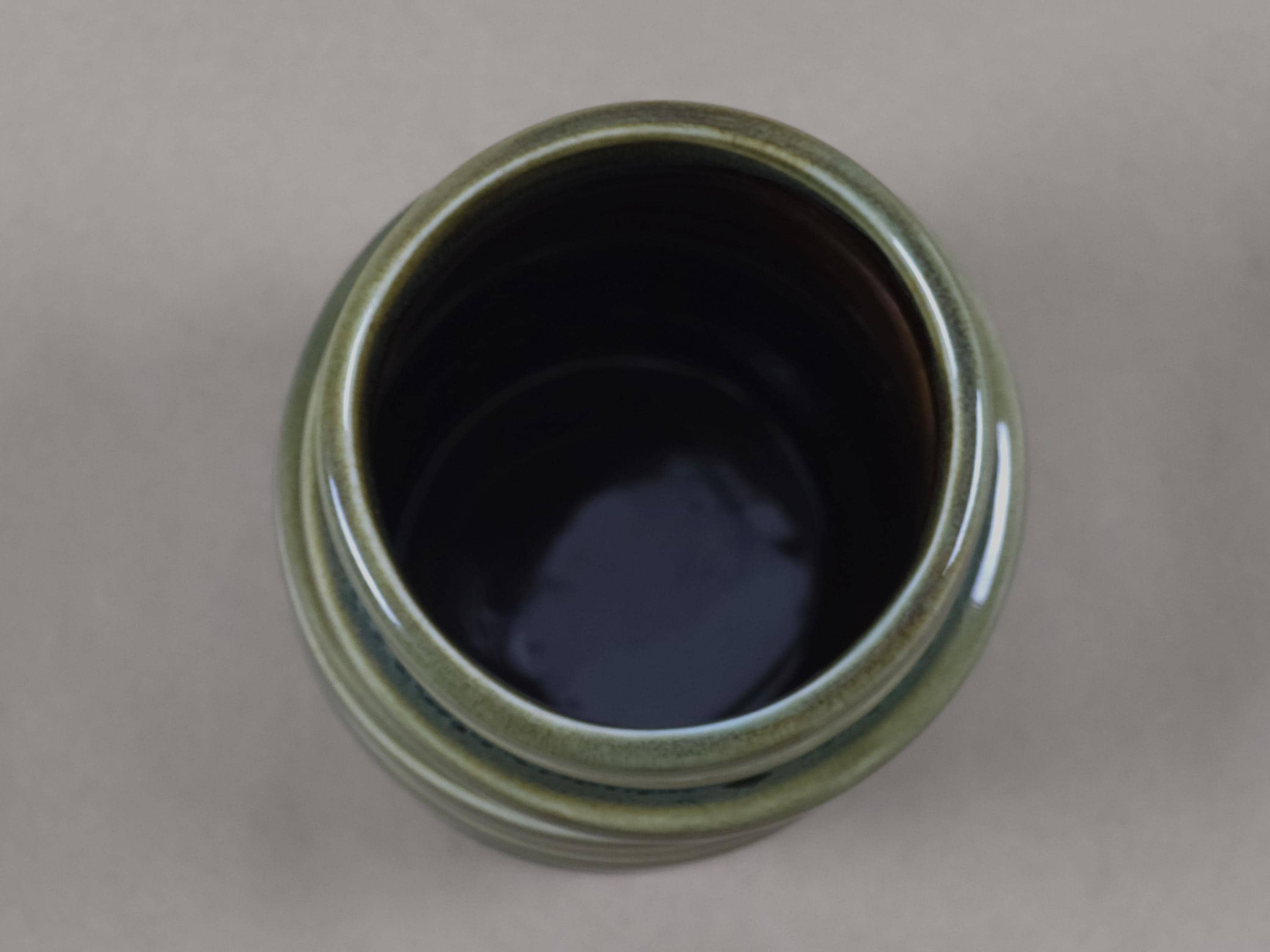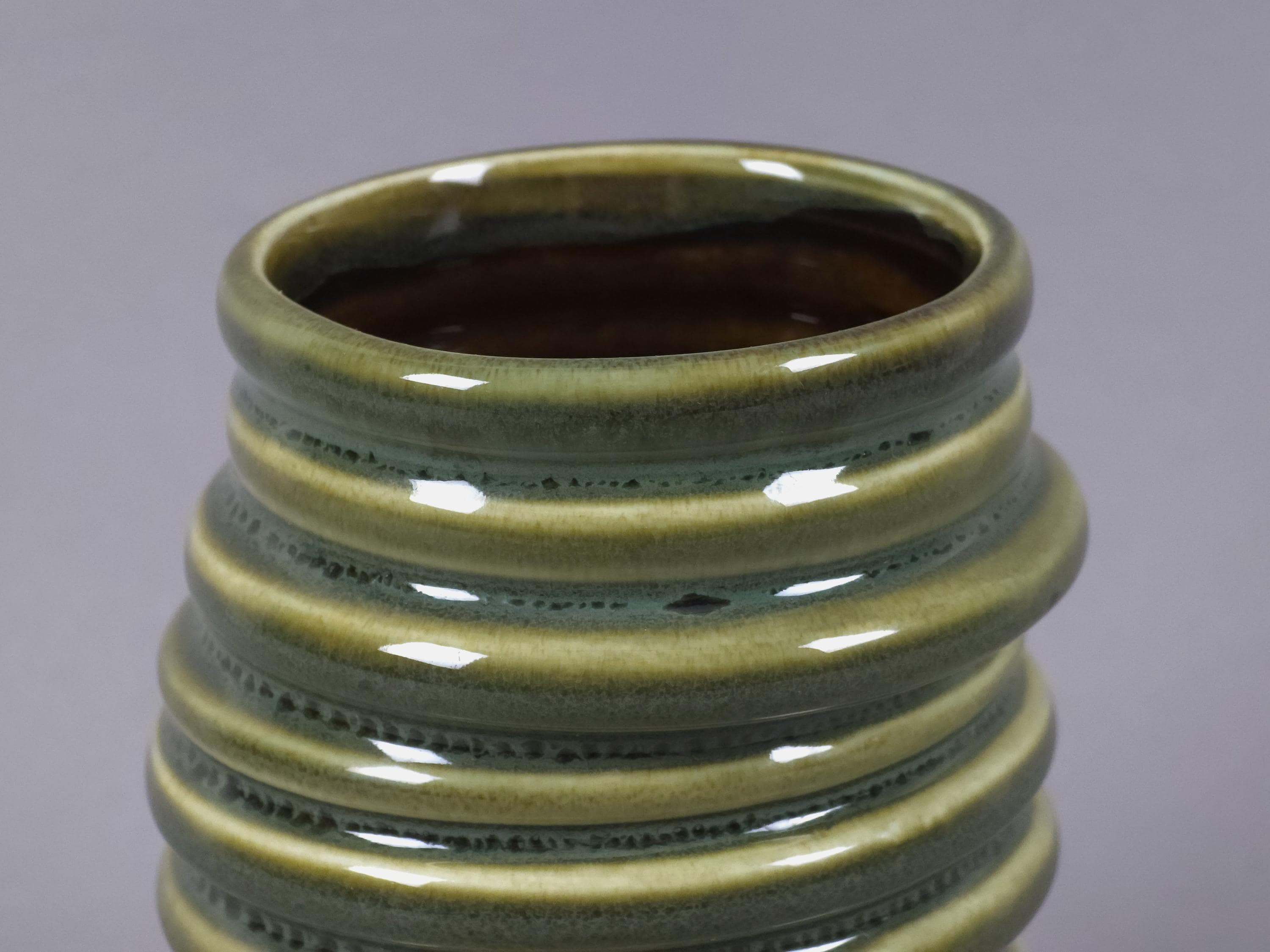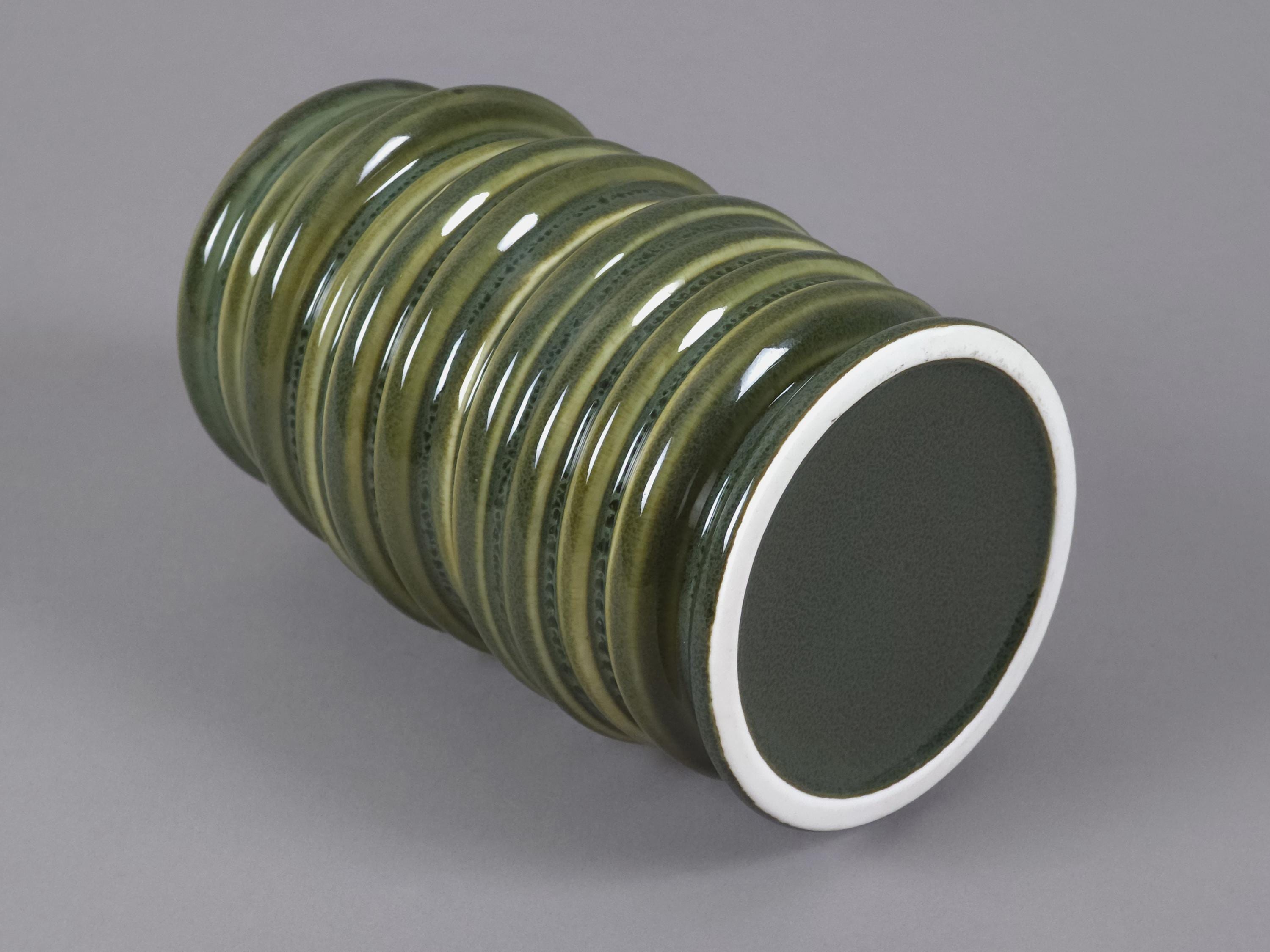 Retro 1990s ceramic vase with a stacked and ribbed design with a glazed finish.