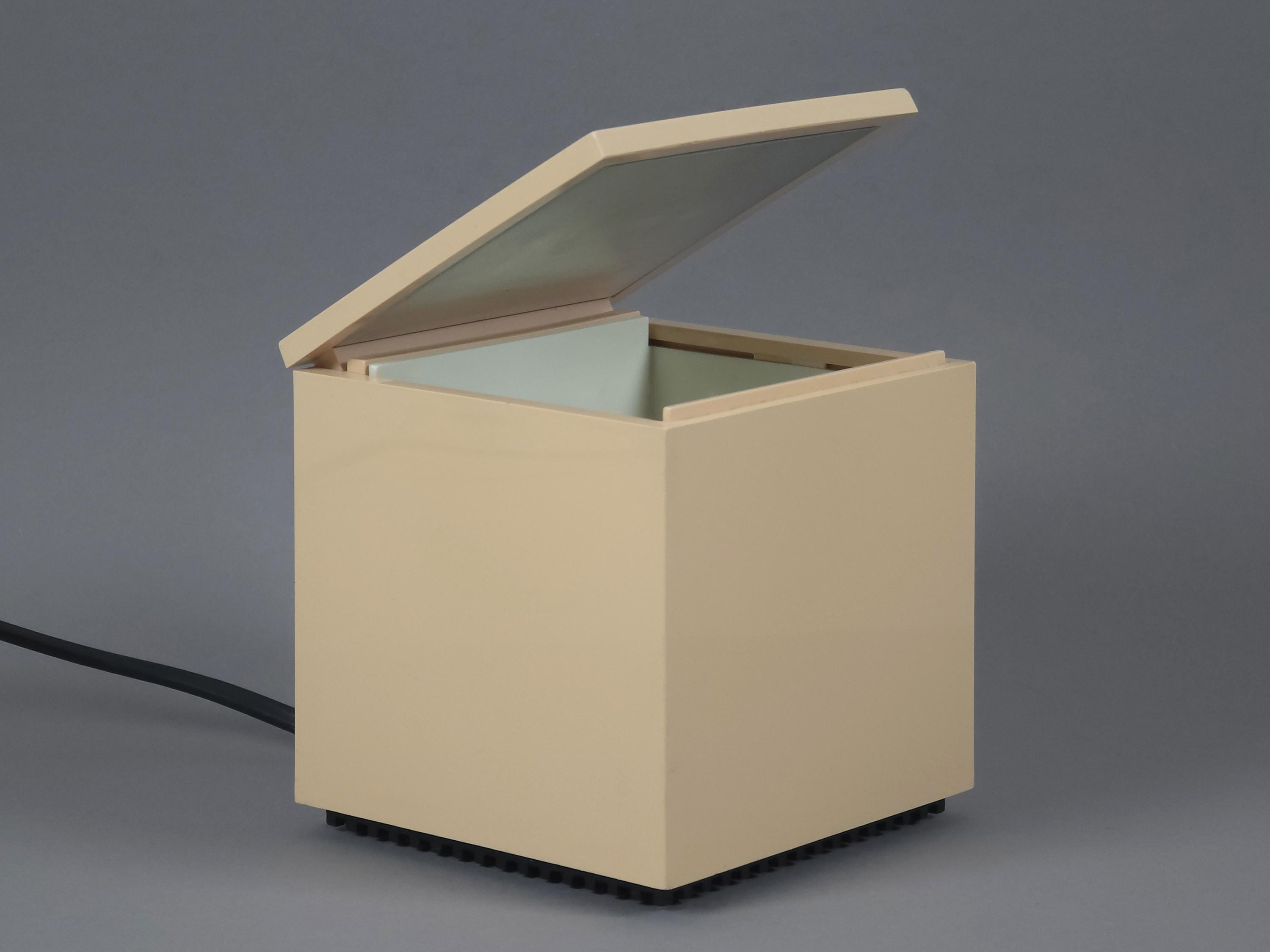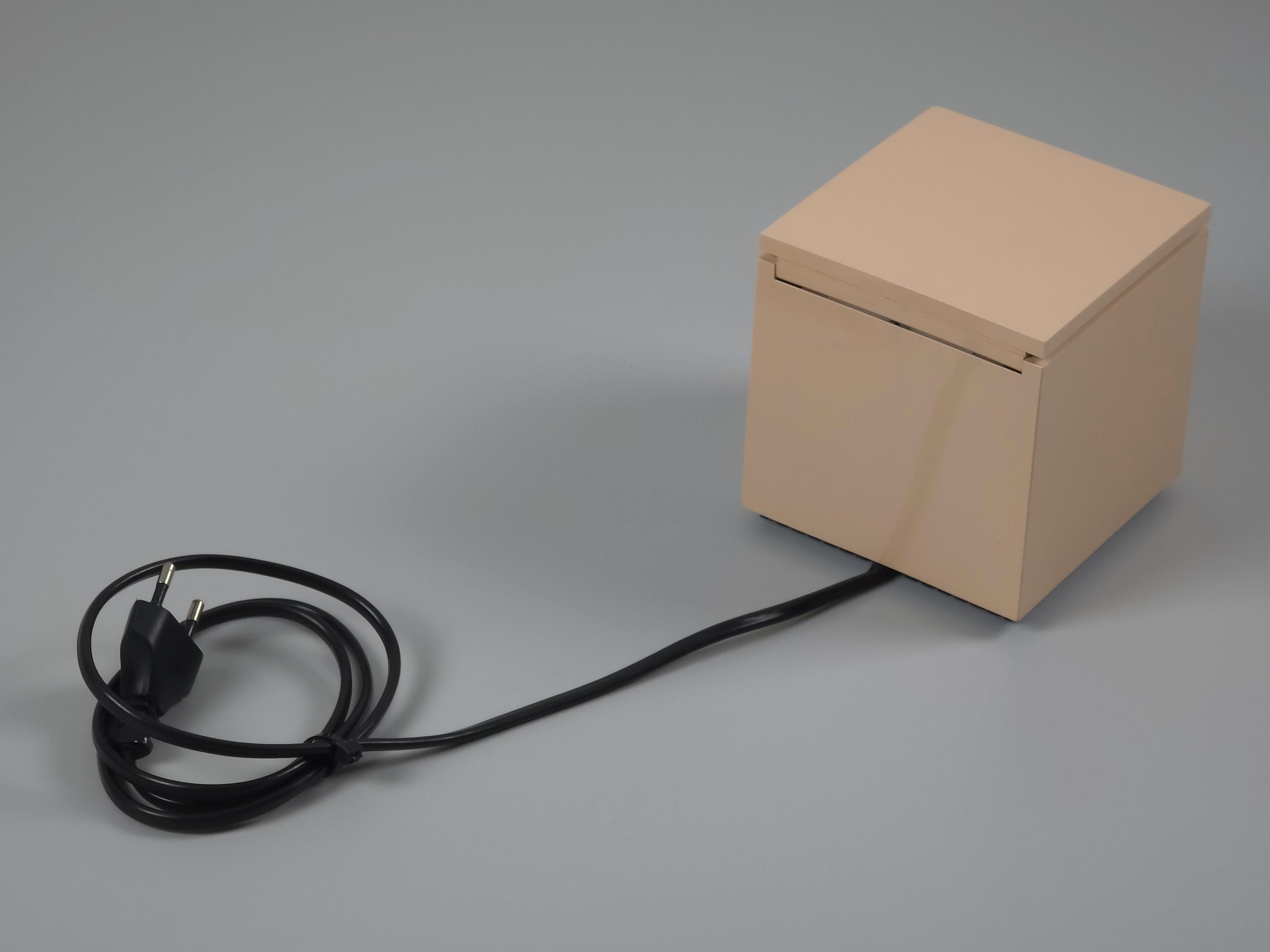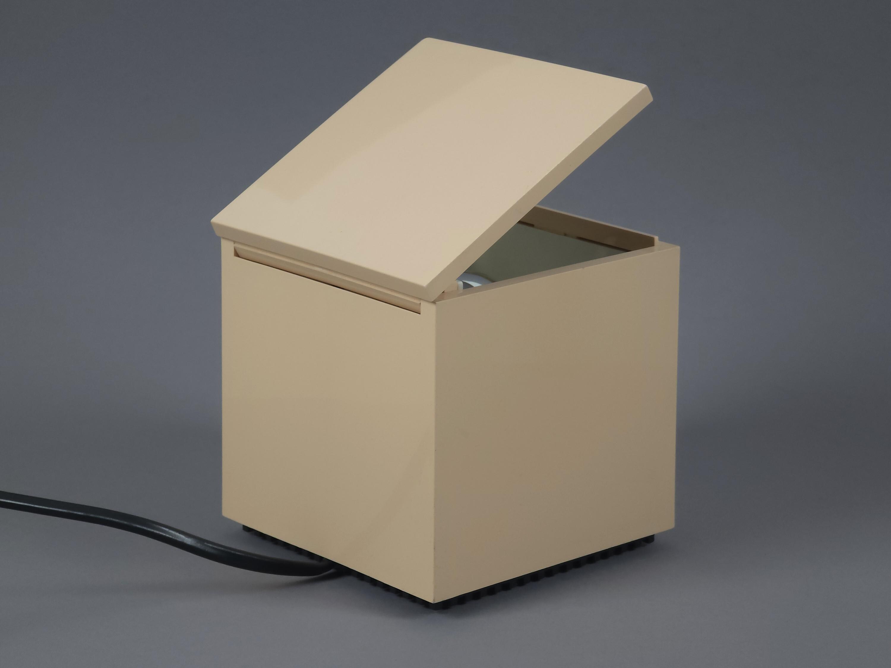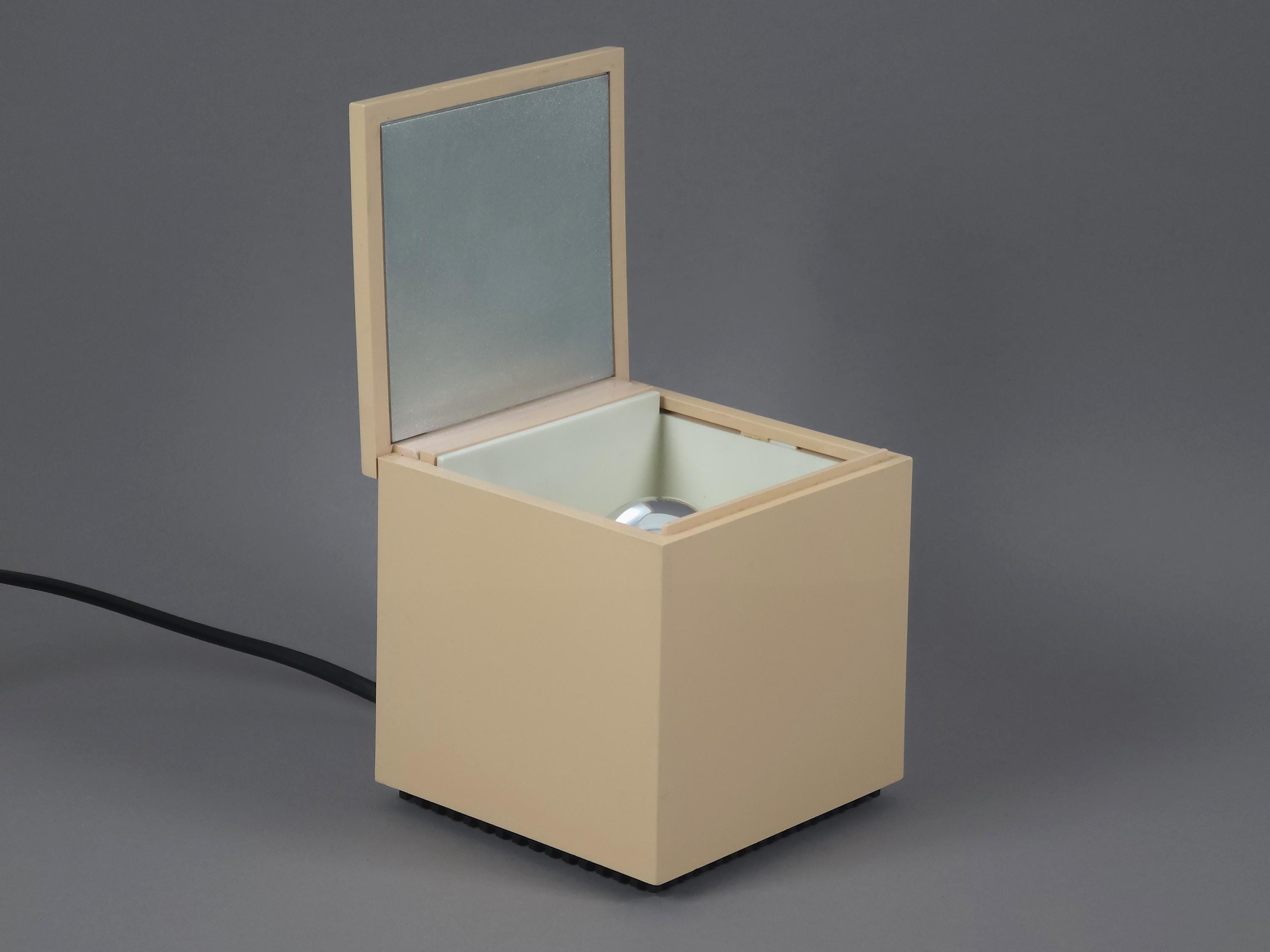 Original 1972 Cini & Nils Cuboluce lamp in rare muted pink. A radical 1970s classic by Franco Bettonica and Mario Melocchi. This "no-switch" lamp is a masterpiece of functionalism, simply open the lid to turn it on and close it to extinguish. A permanent resident of the MoMA Design Collection.