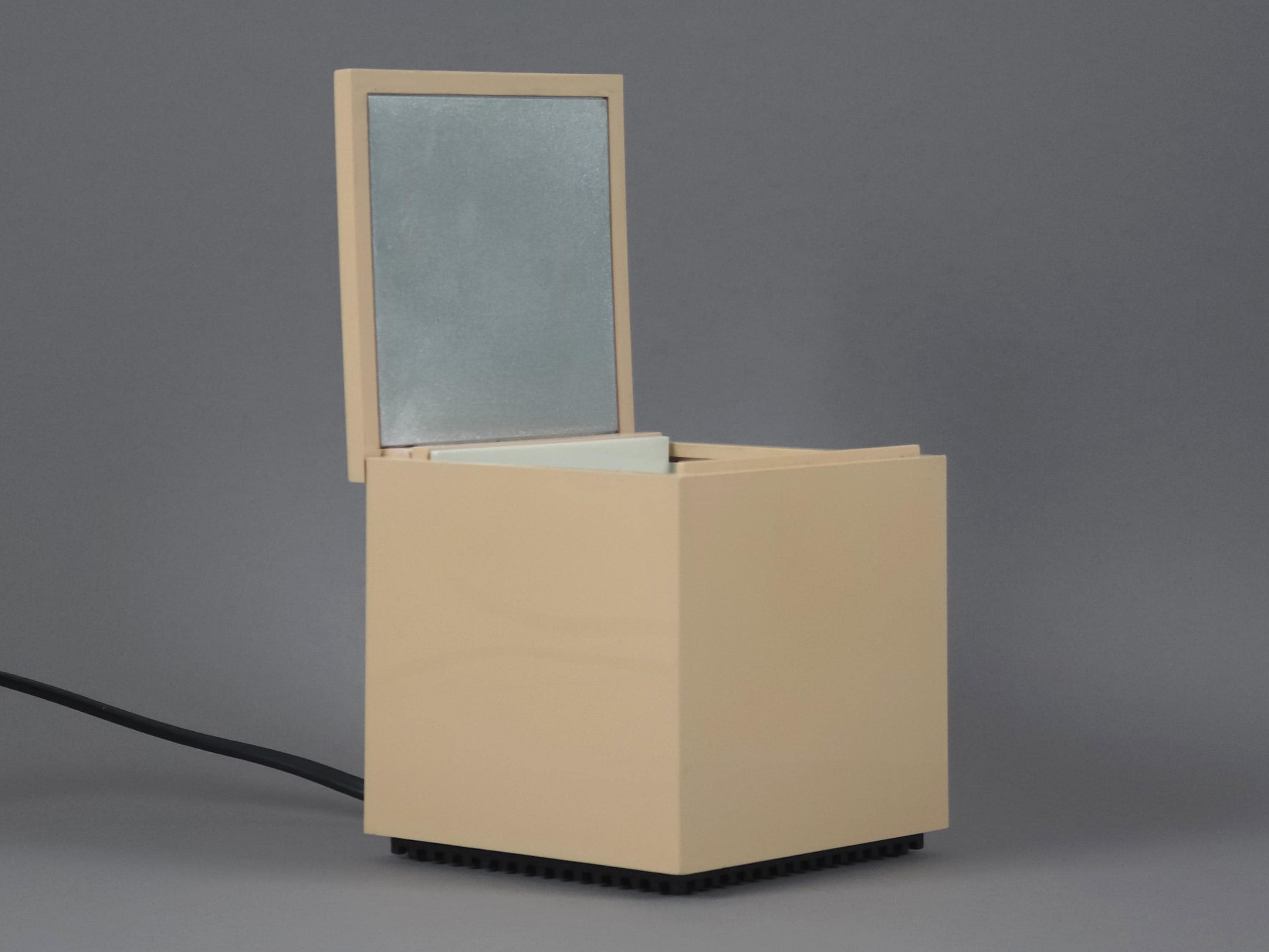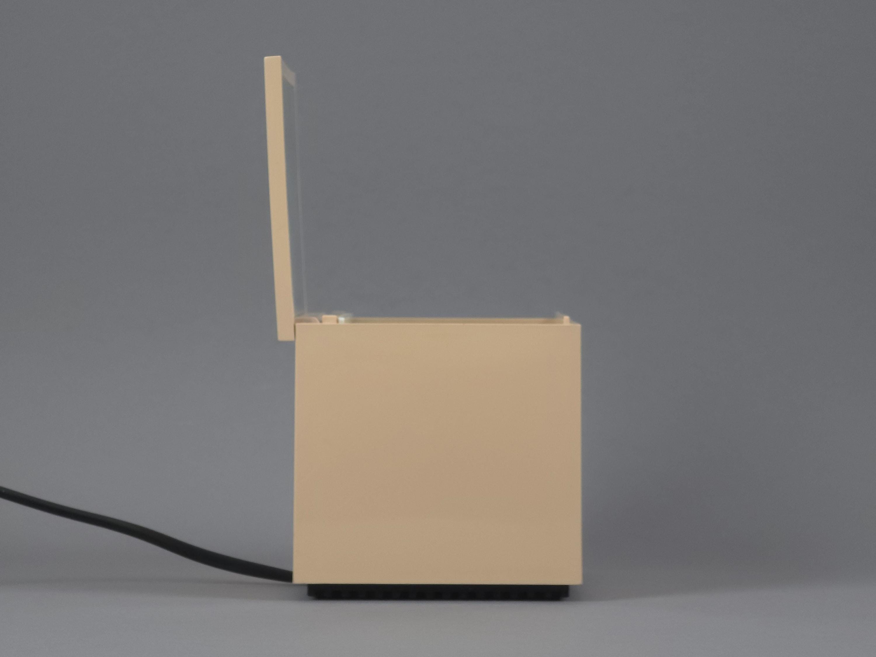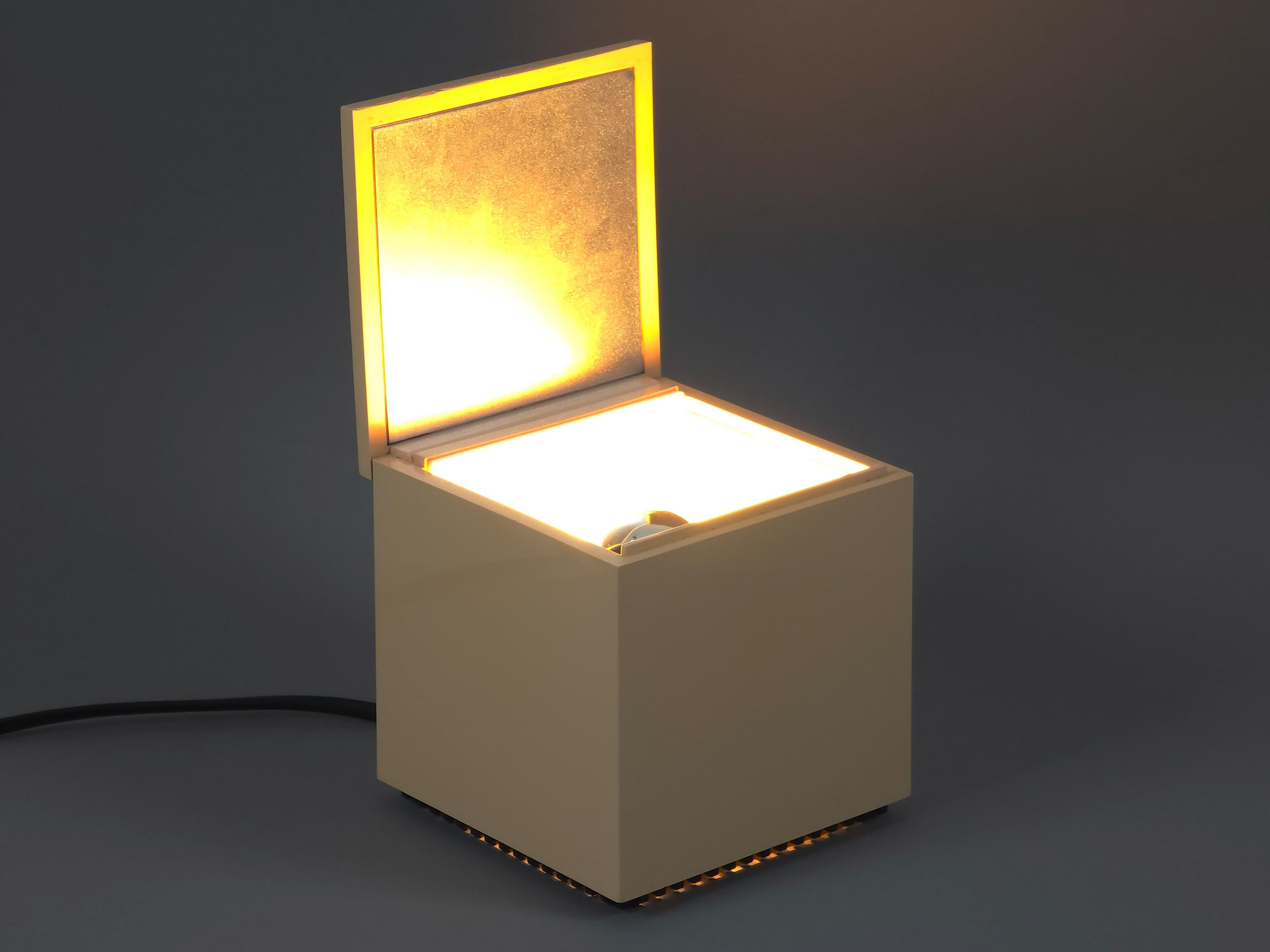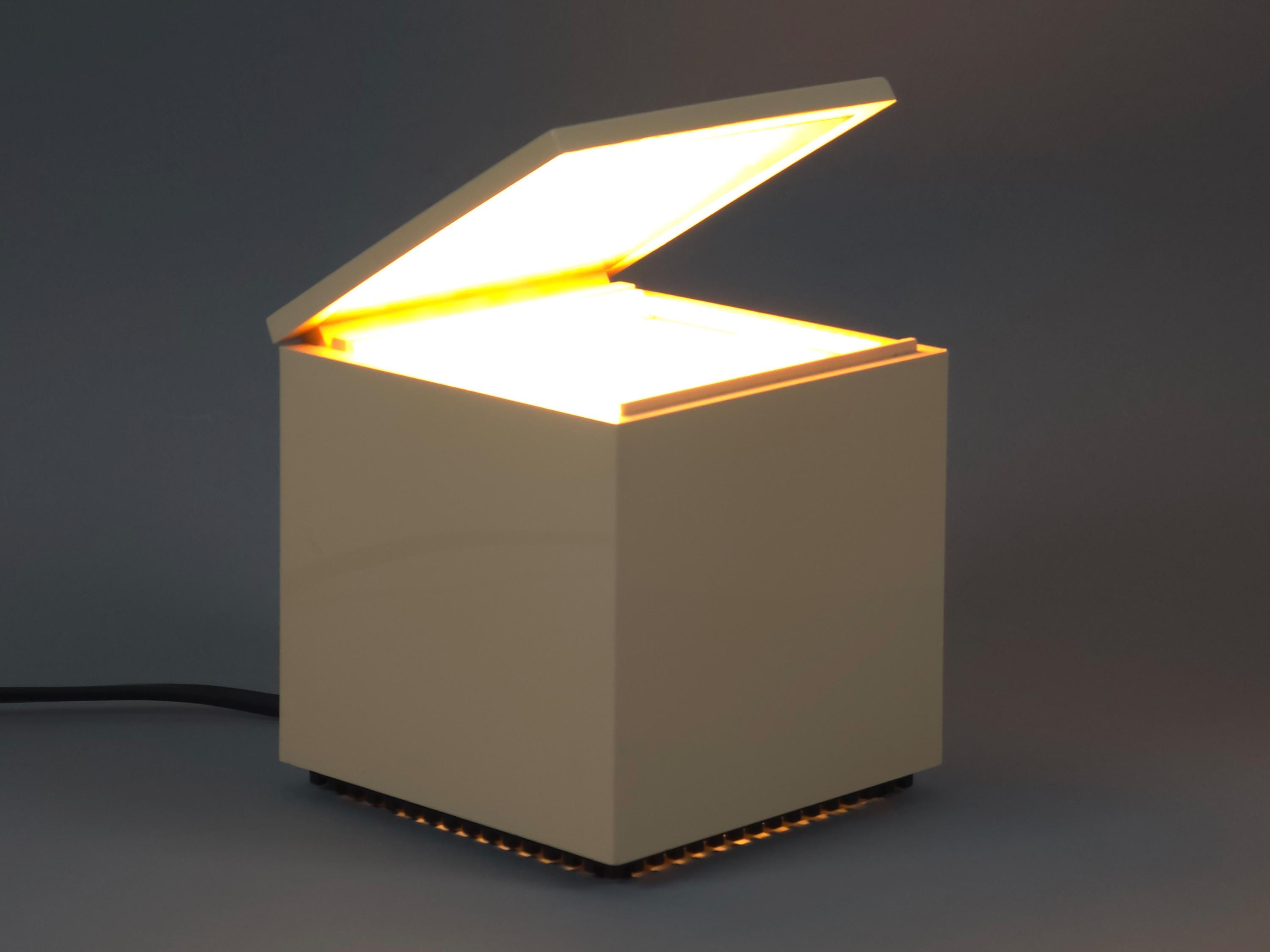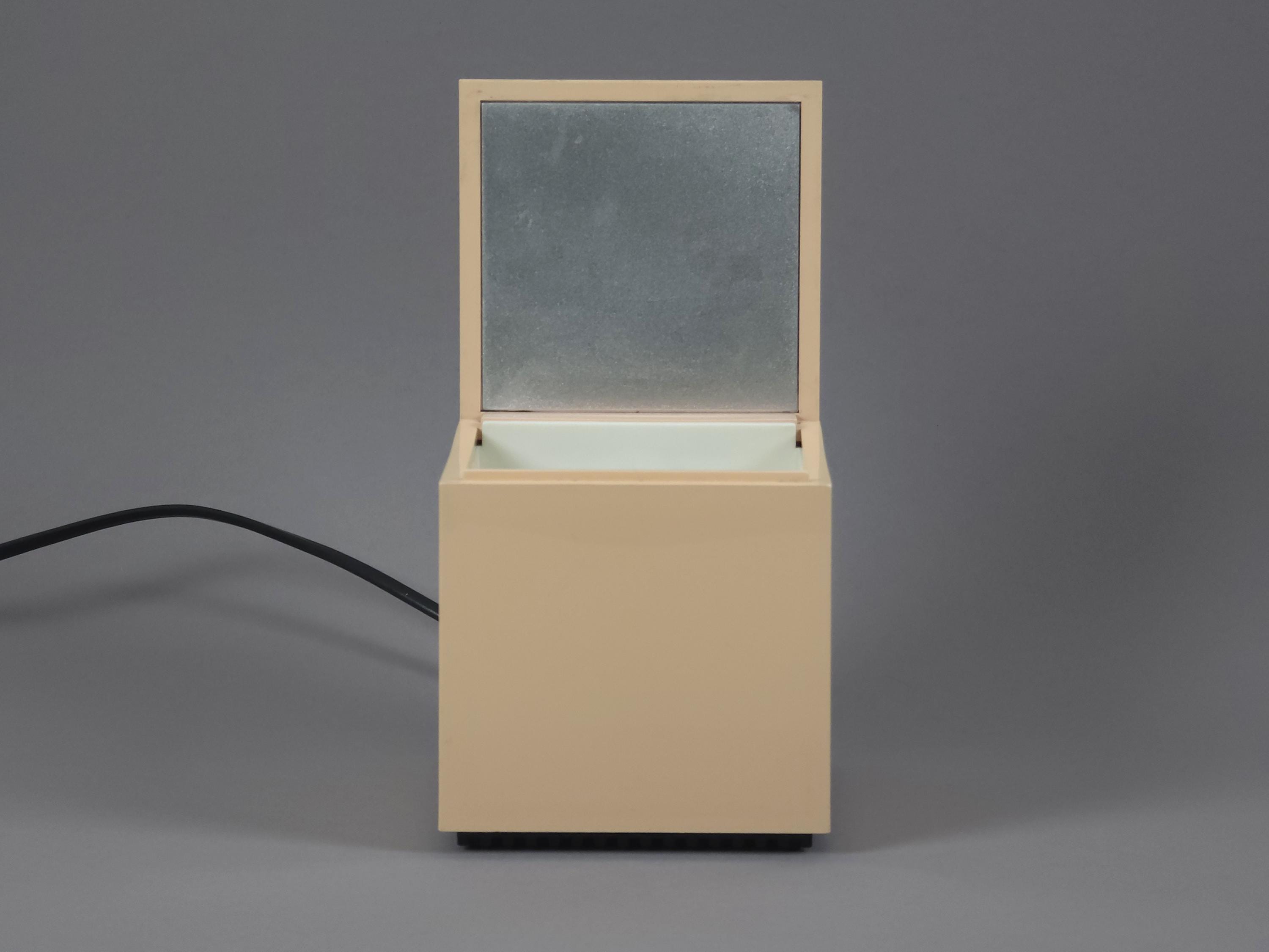 Original 1972 Cini & Nils Cuboluce lamp in rare muted pink. A radical 1970s classic by Franco Bettonica and Mario Melocchi. This "no-switch" lamp is a masterpiece of functionalism, simply open the lid to turn it on and close it to extinguish. A permanent resident of the MoMA Design Collection.