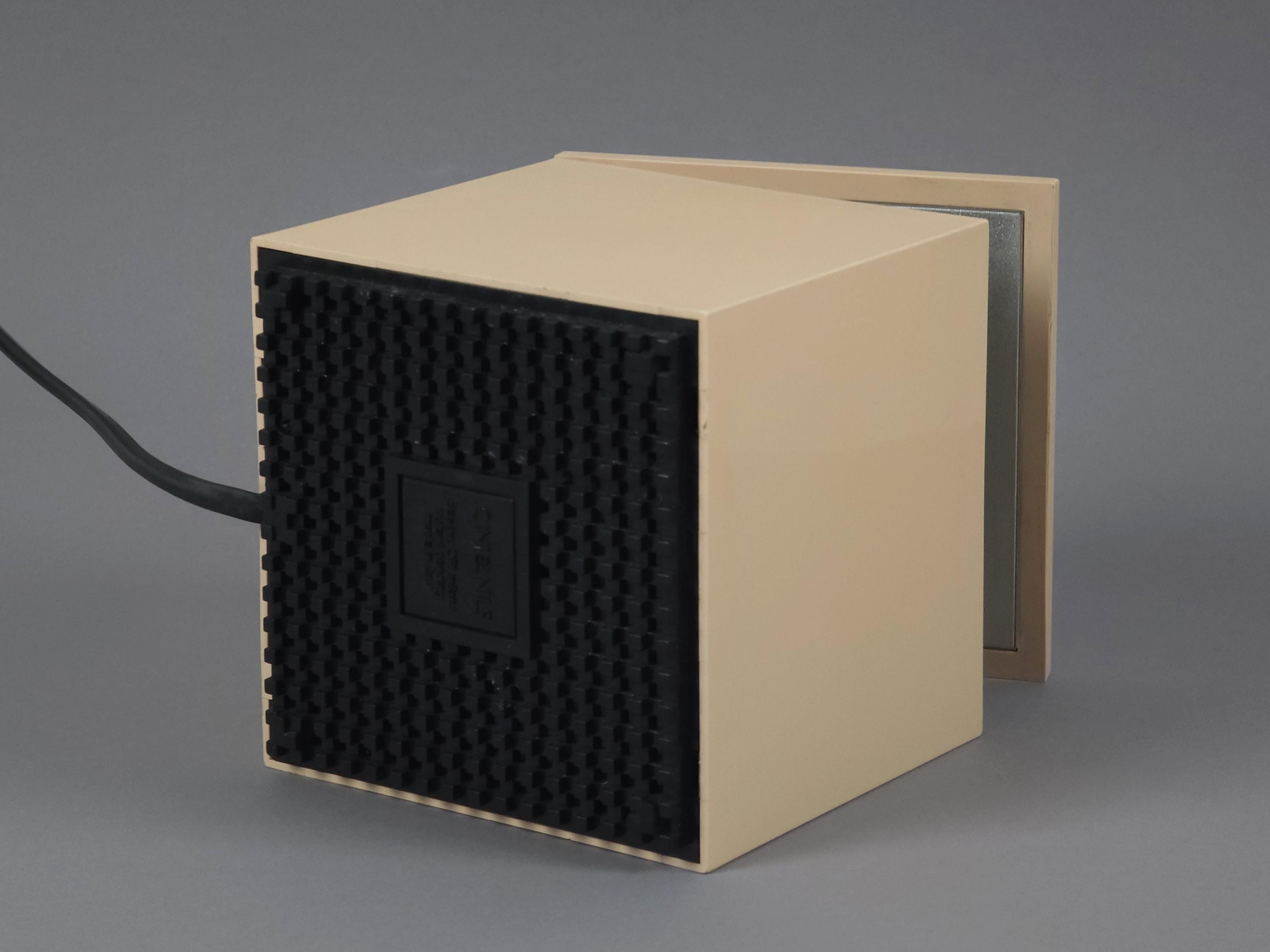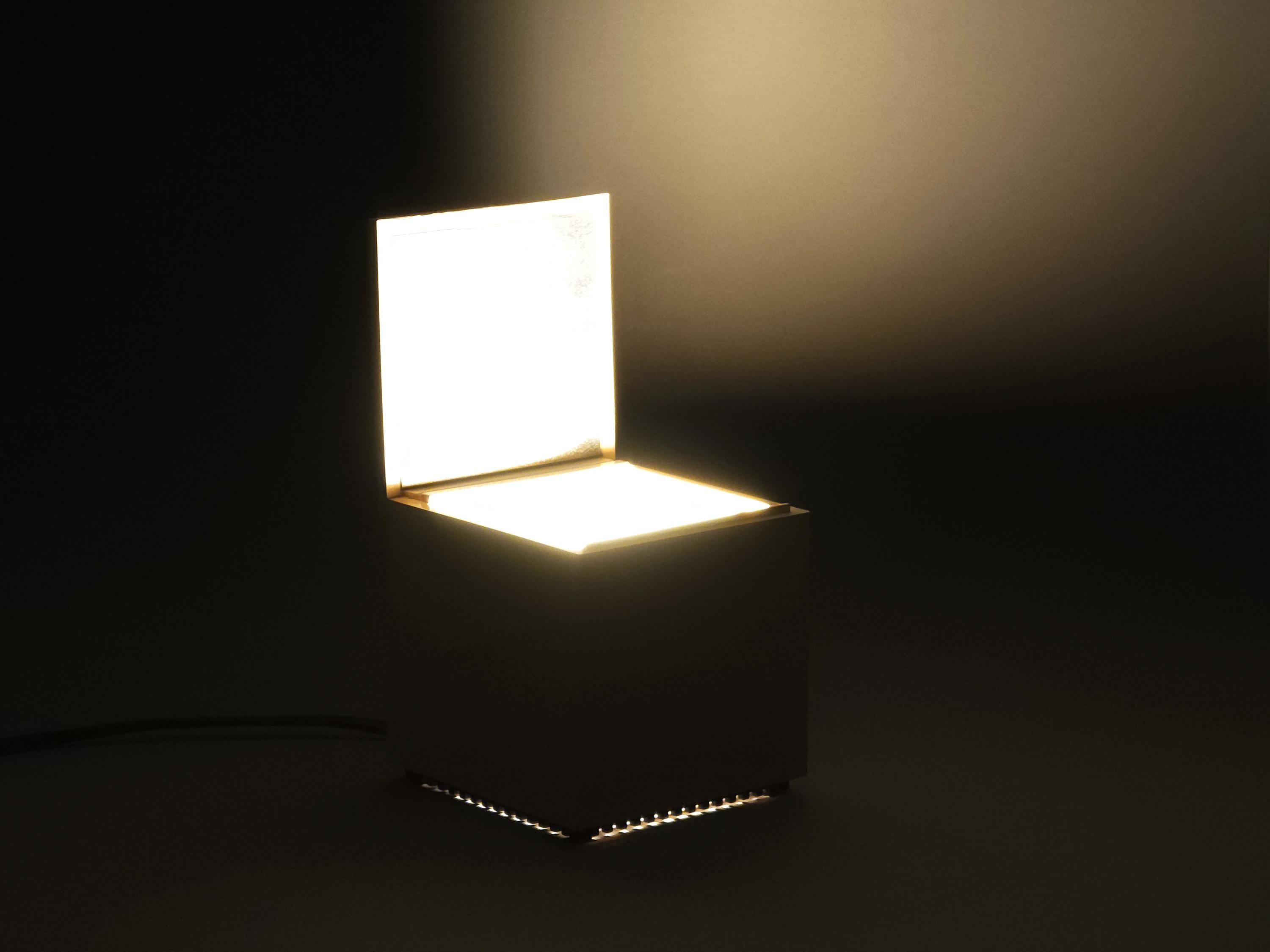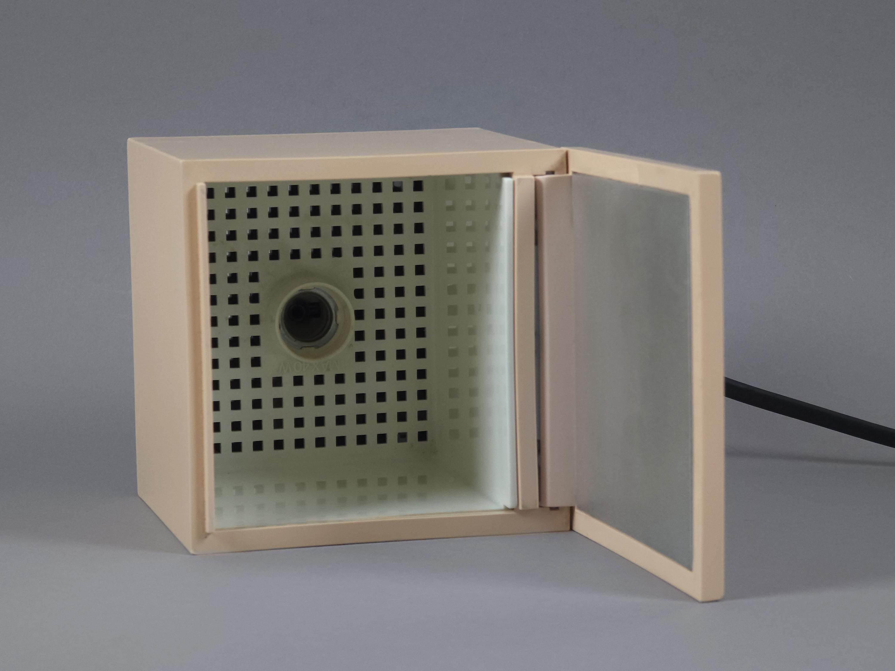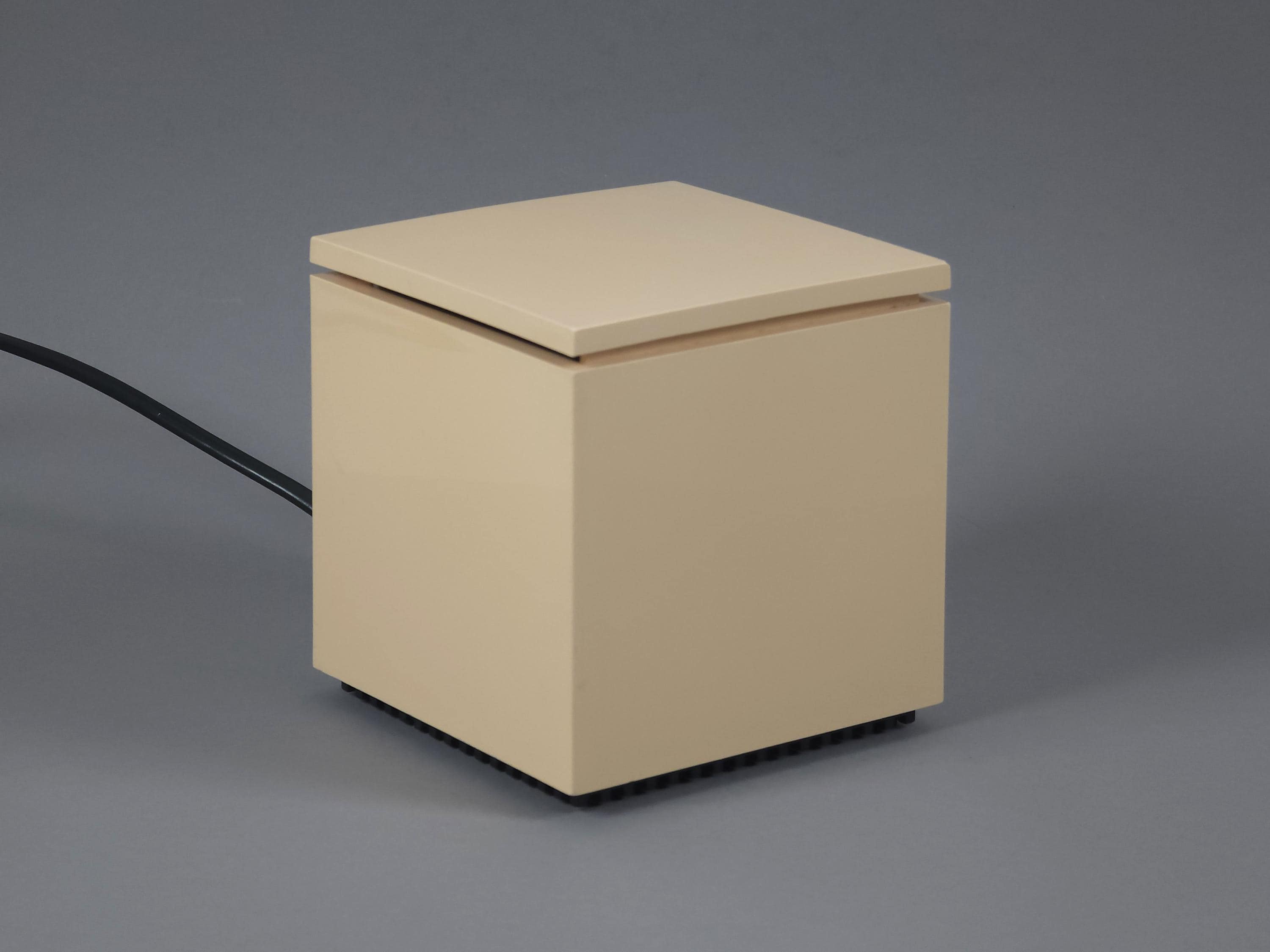 Original 1972 Cini & Nils Cuboluce lamp in rare muted pink. A radical 1970s classic by Franco Bettonica and Mario Melocchi. This "no-switch" lamp is a masterpiece of functionalism, simply open the lid to turn it on and close it to extinguish. A permanent resident of the MoMA Design Collection.
