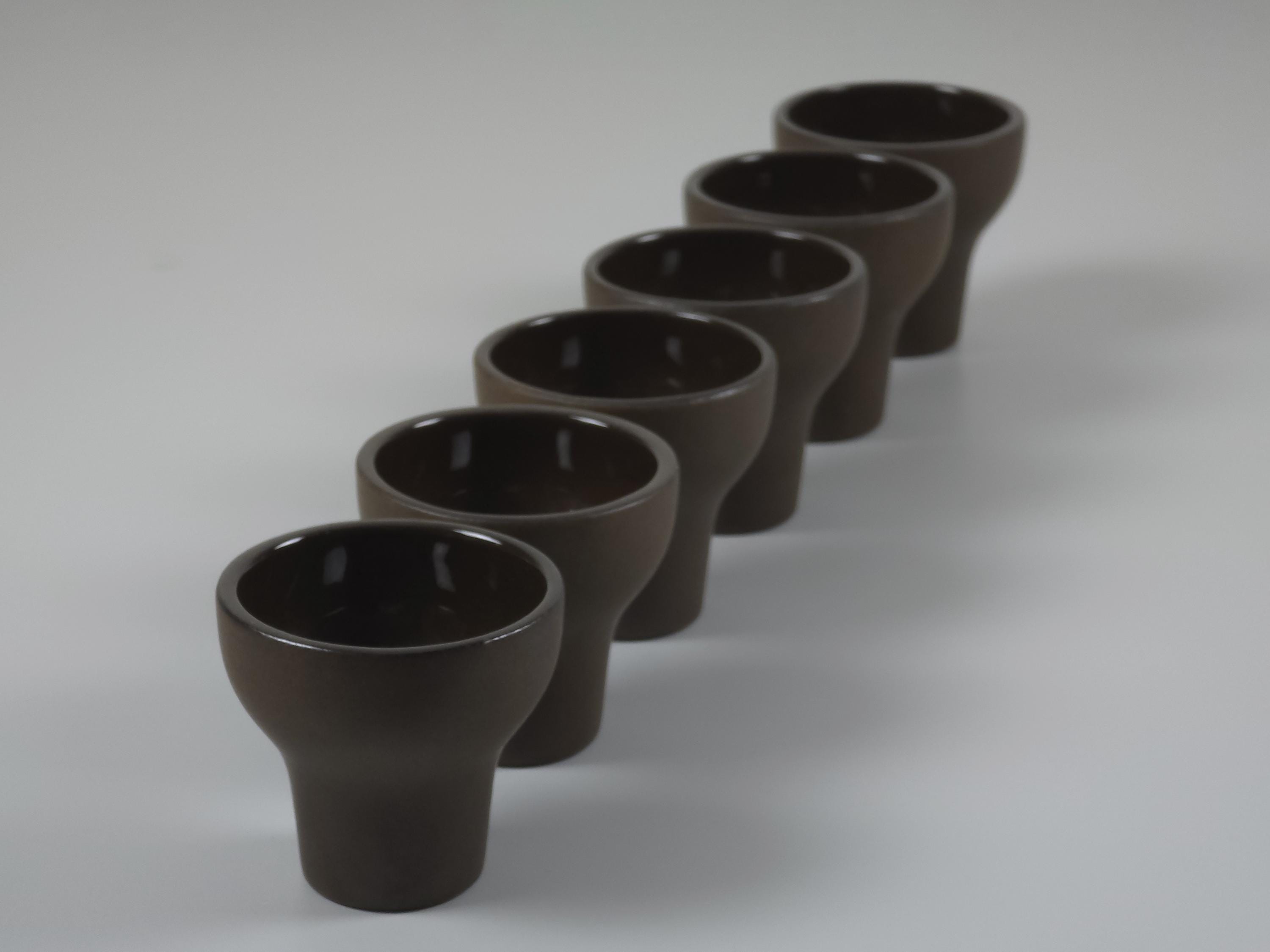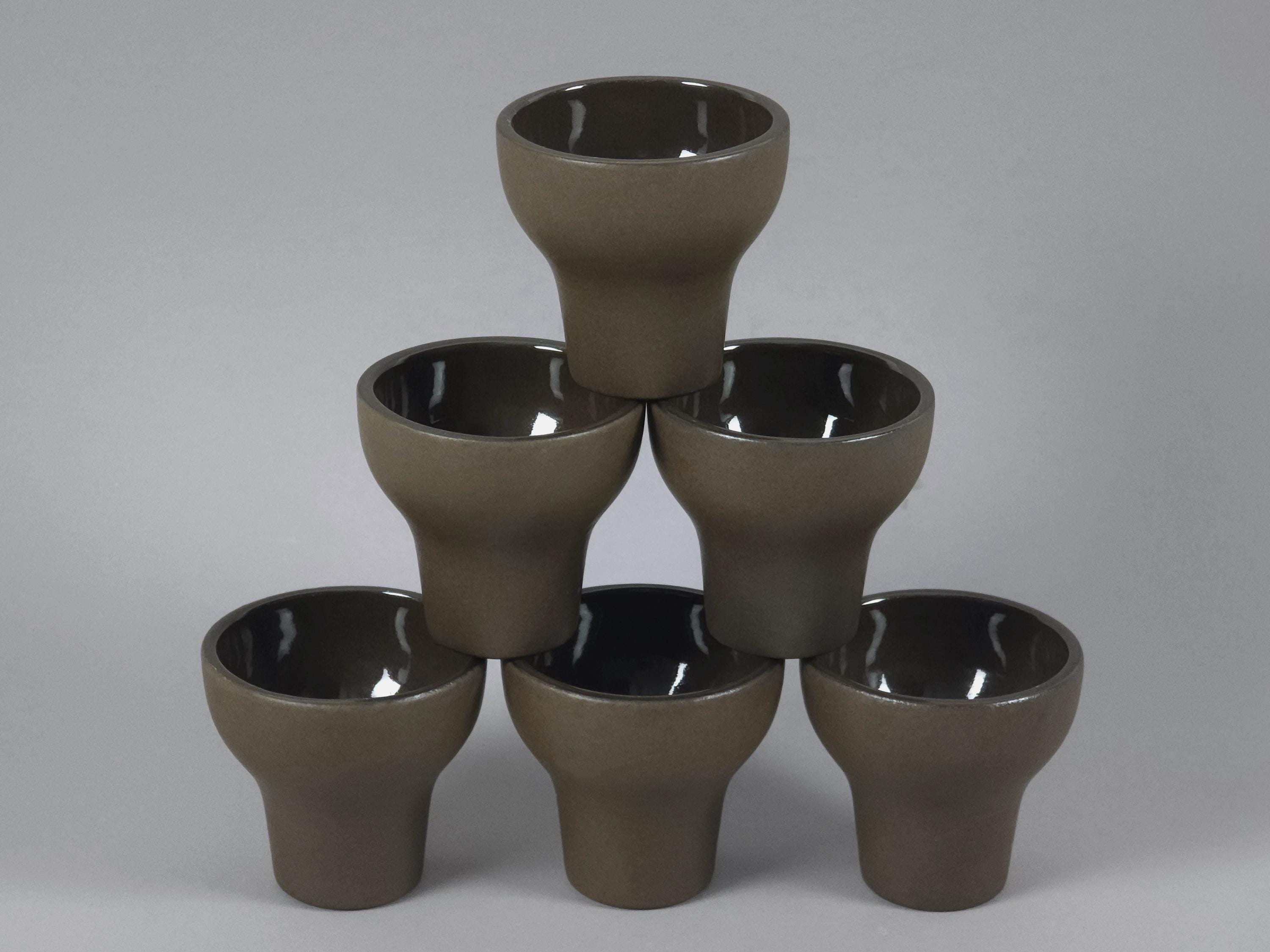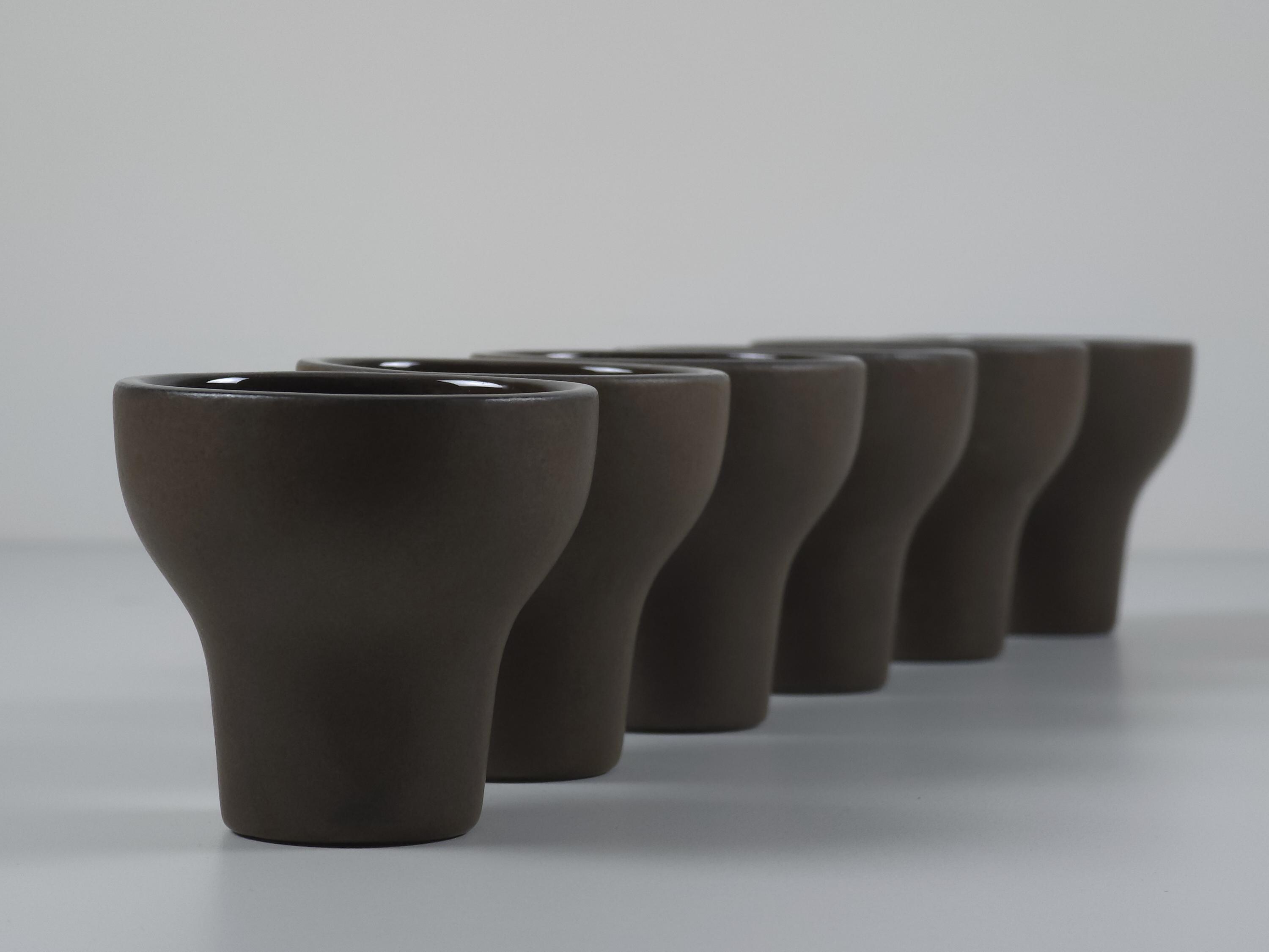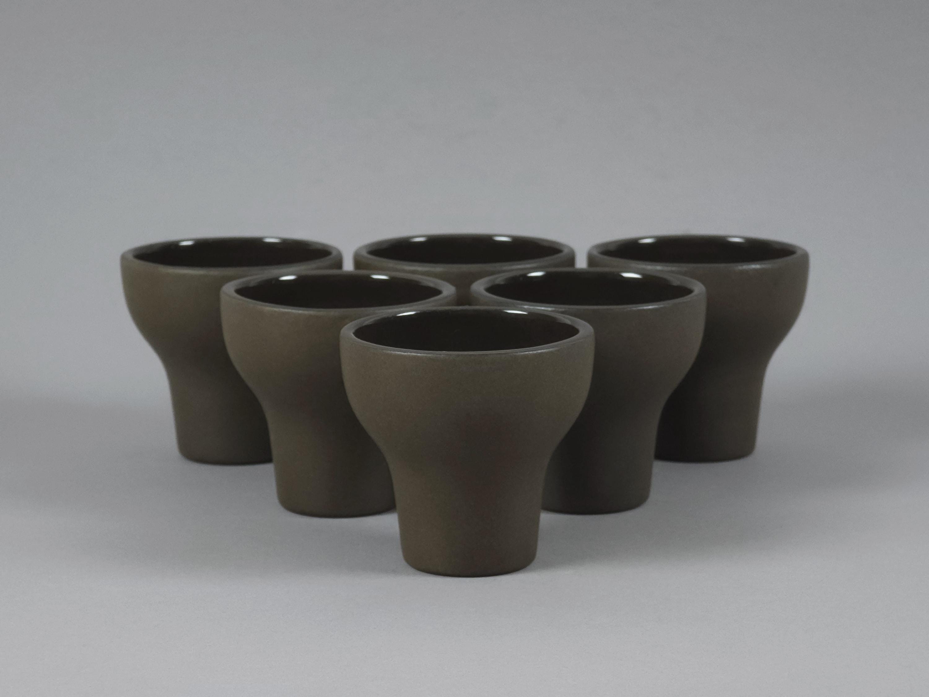 Vintage 1970s set of 6 Scandinavian MCM stoneware cups. The ergonomic, tapered shape feels substantial in the hand, making them ideal for a morning double espresso, traditional Japanese sake, or even small individual desserts and amuse-bouche. Their architectural silhouette allows them to be stacked beautifully, as shown in the photos.