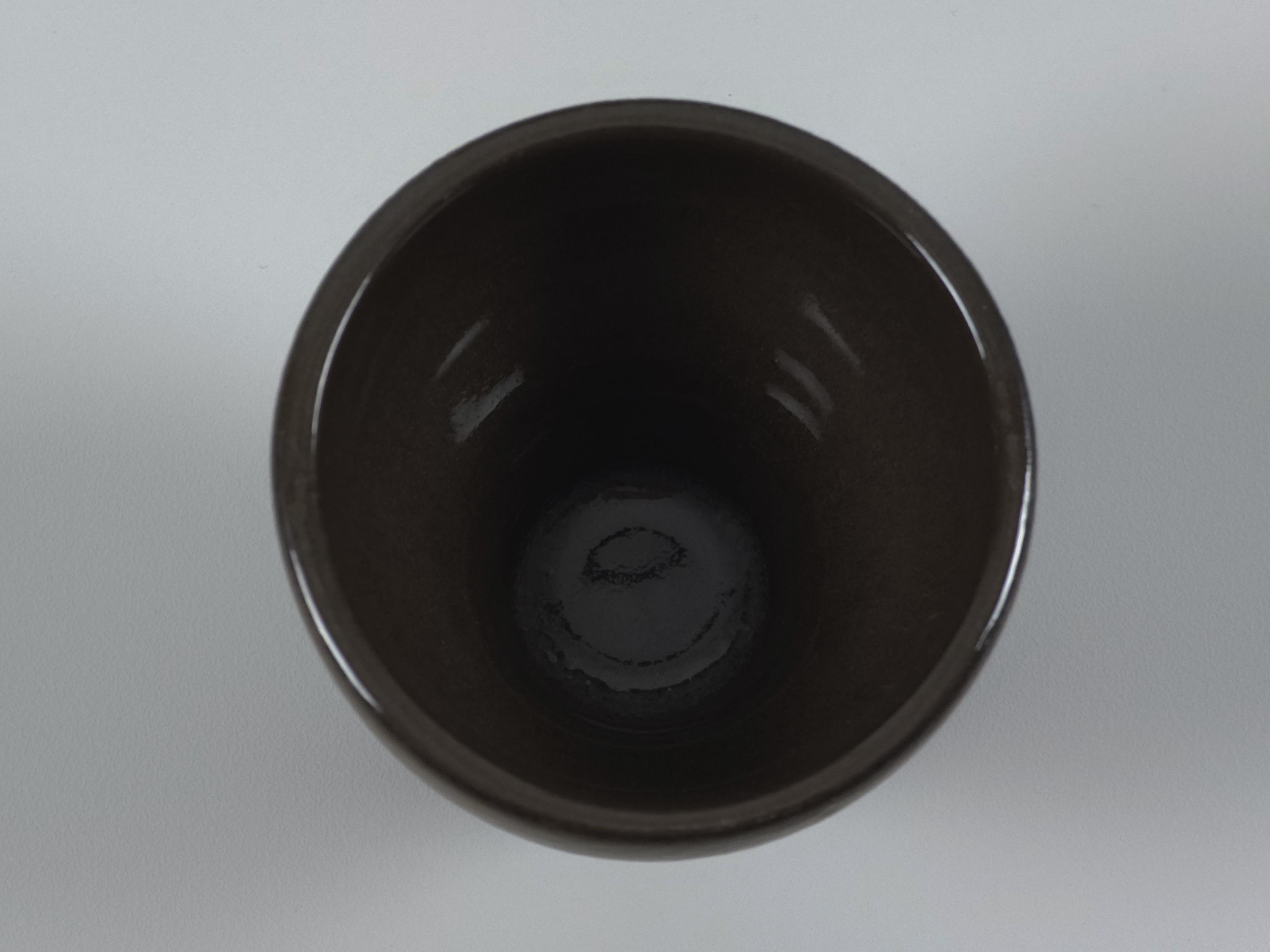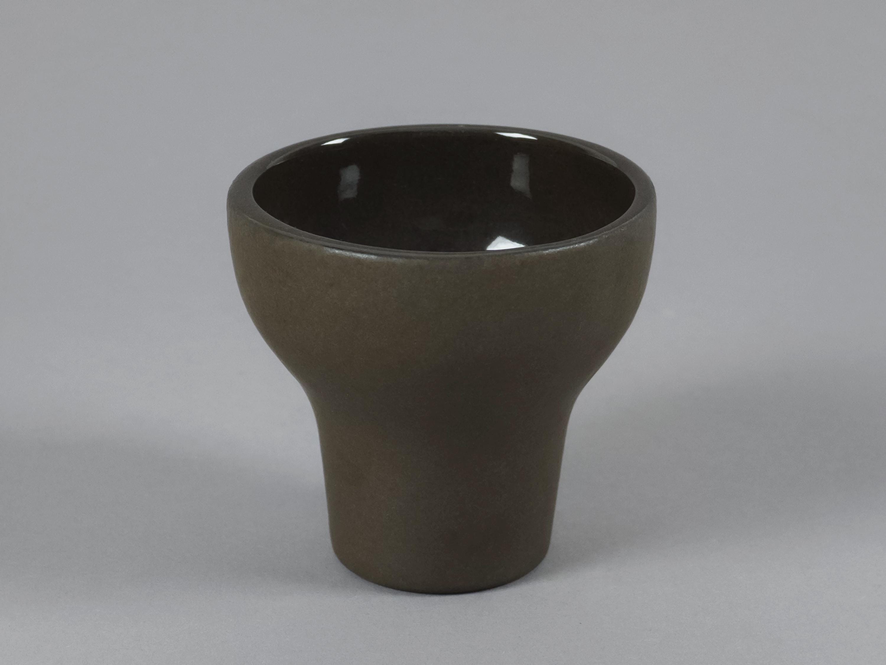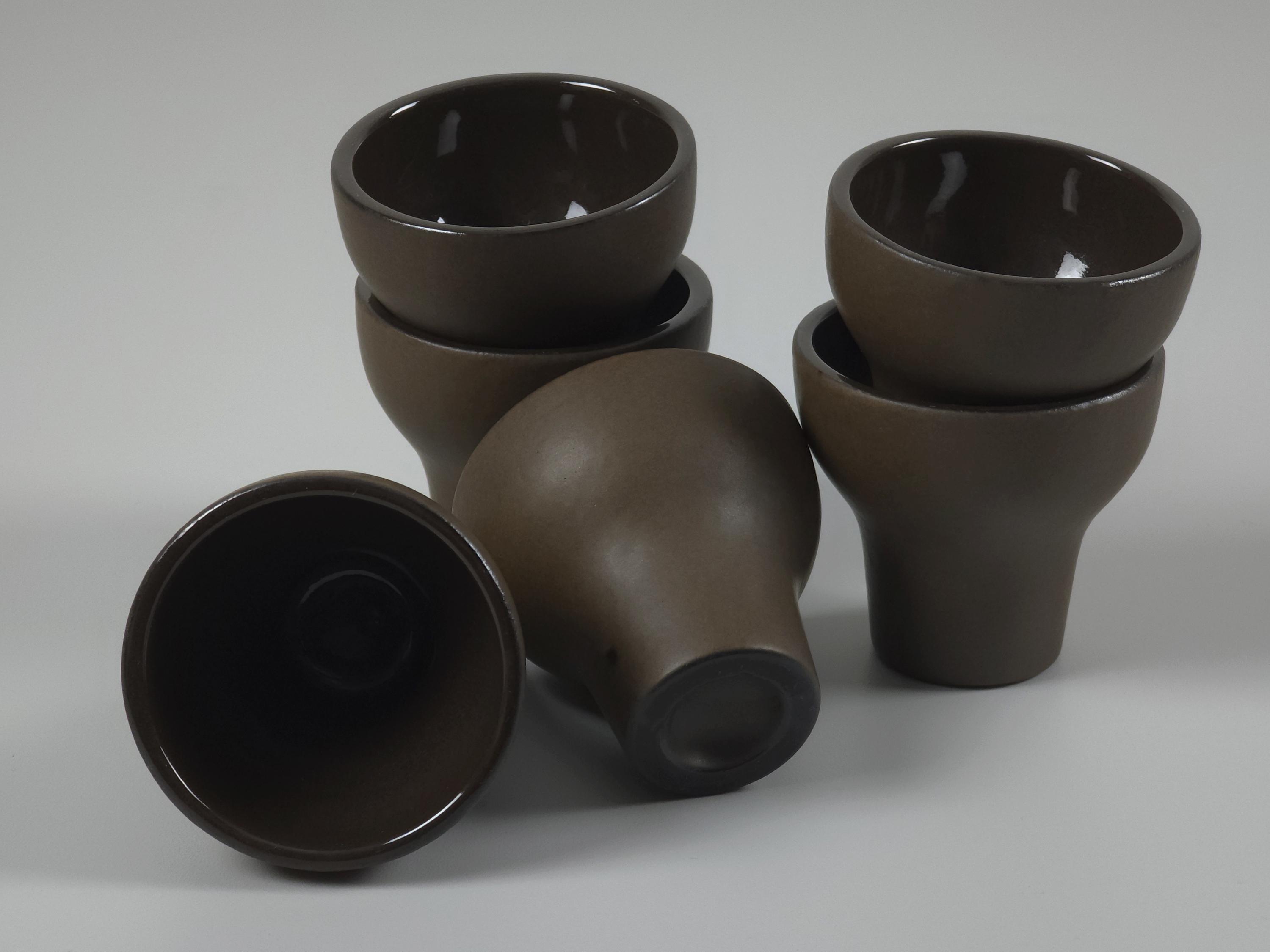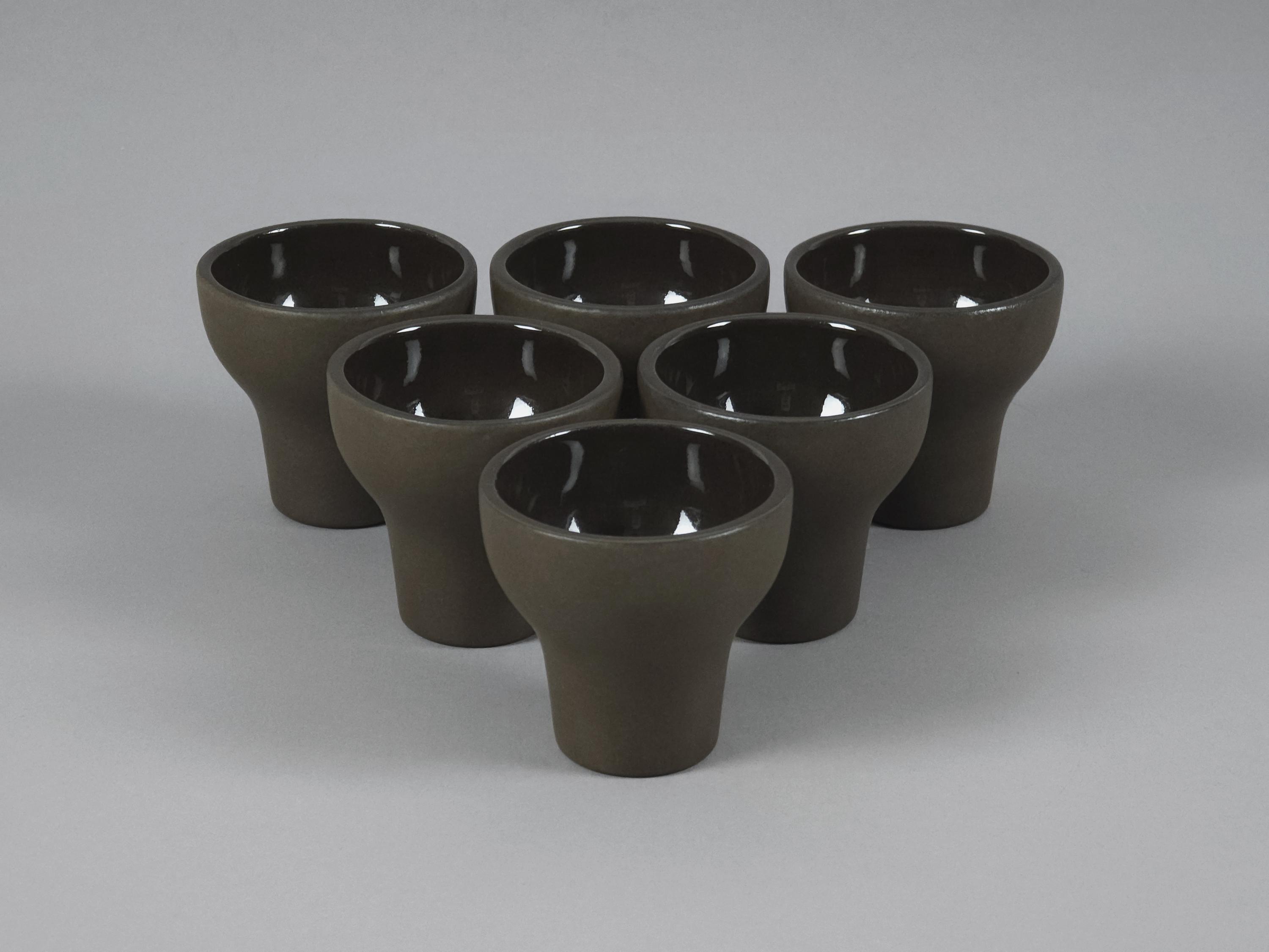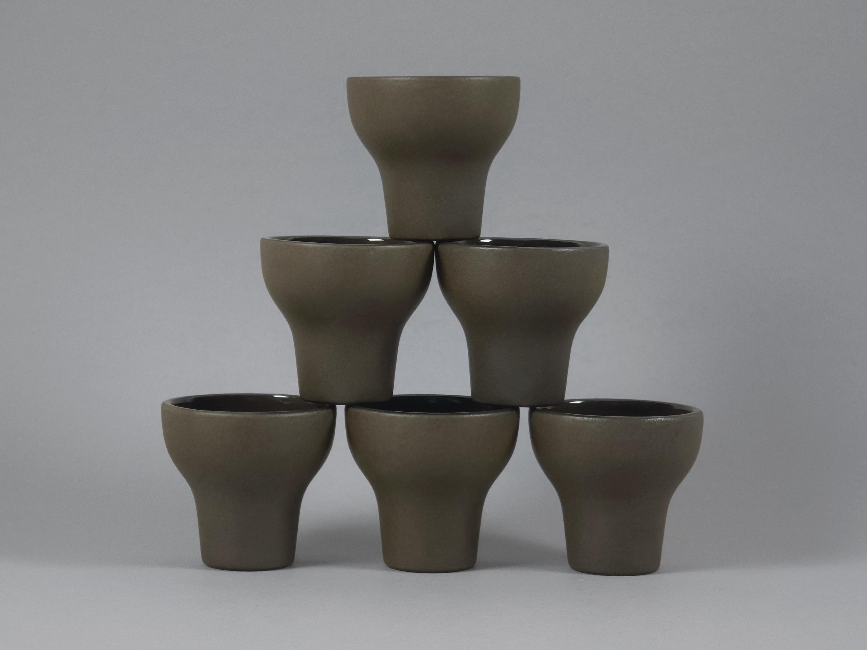 Vintage 1970s set of 6 Scandinavian MCM stoneware cups. The ergonomic, tapered shape feels substantial in the hand, making them ideal for a morning double espresso, traditional Japanese sake, or even small individual desserts and amuse-bouche. Their architectural silhouette allows them to be stacked beautifully, as shown in the photos.