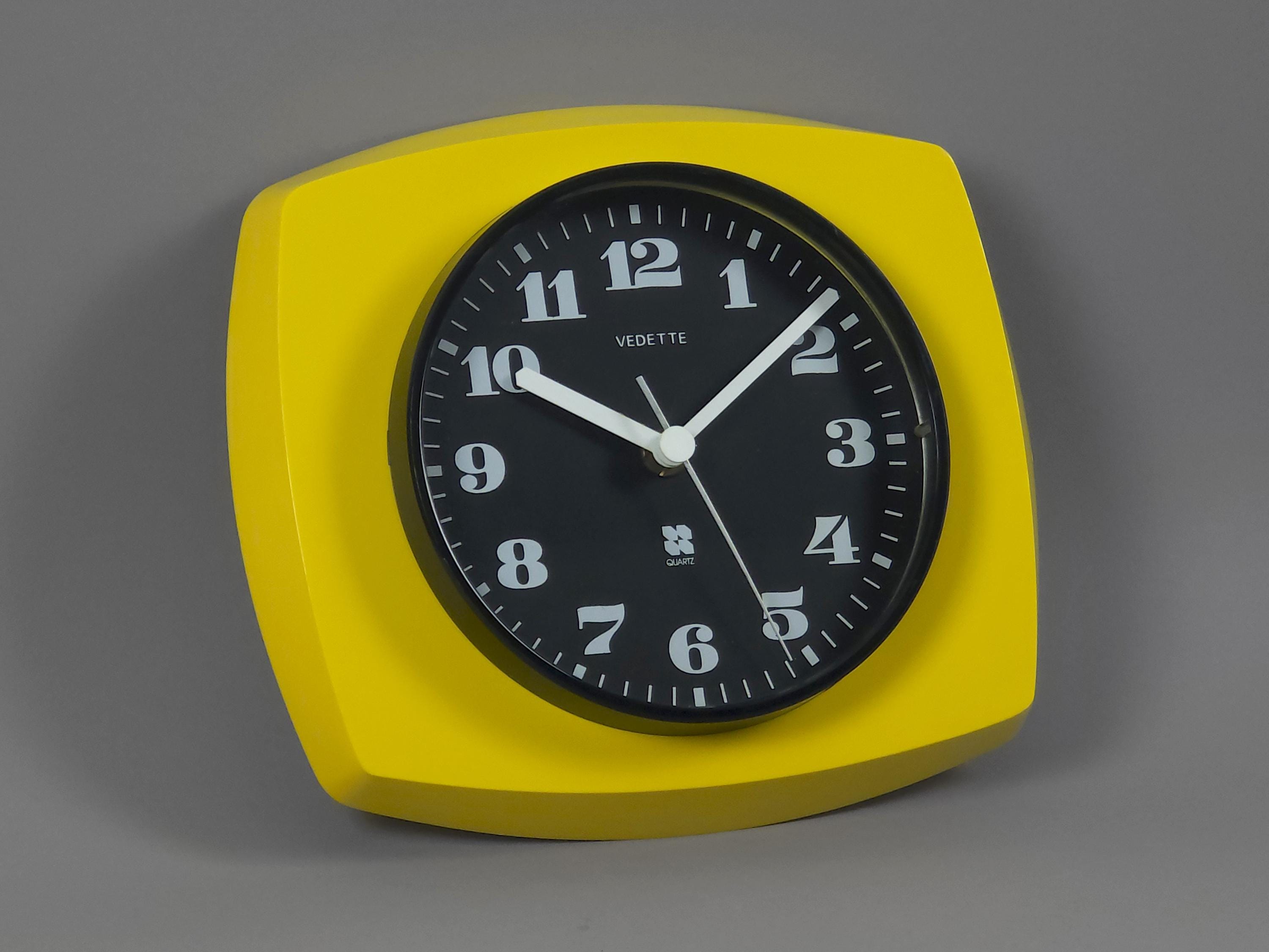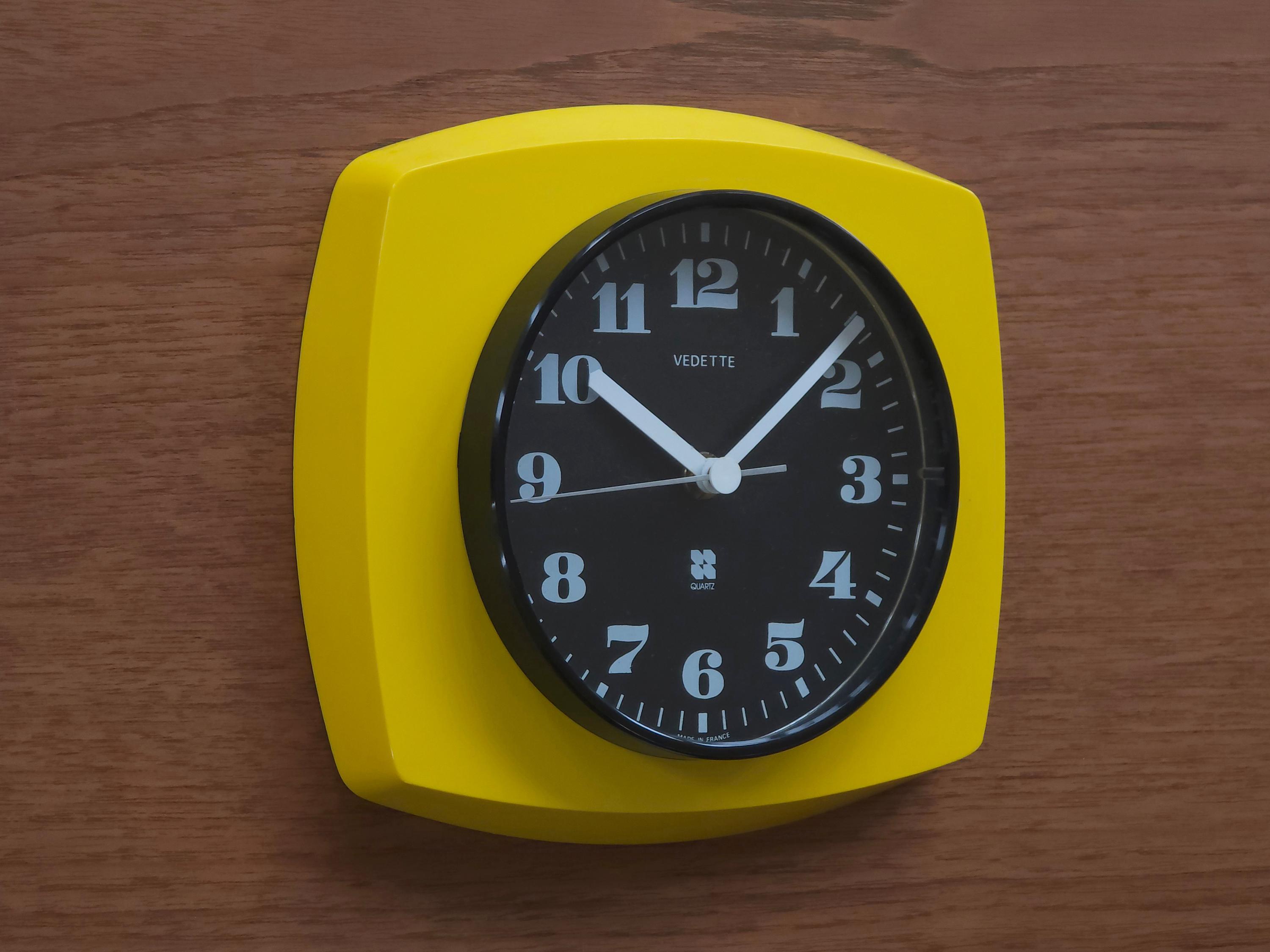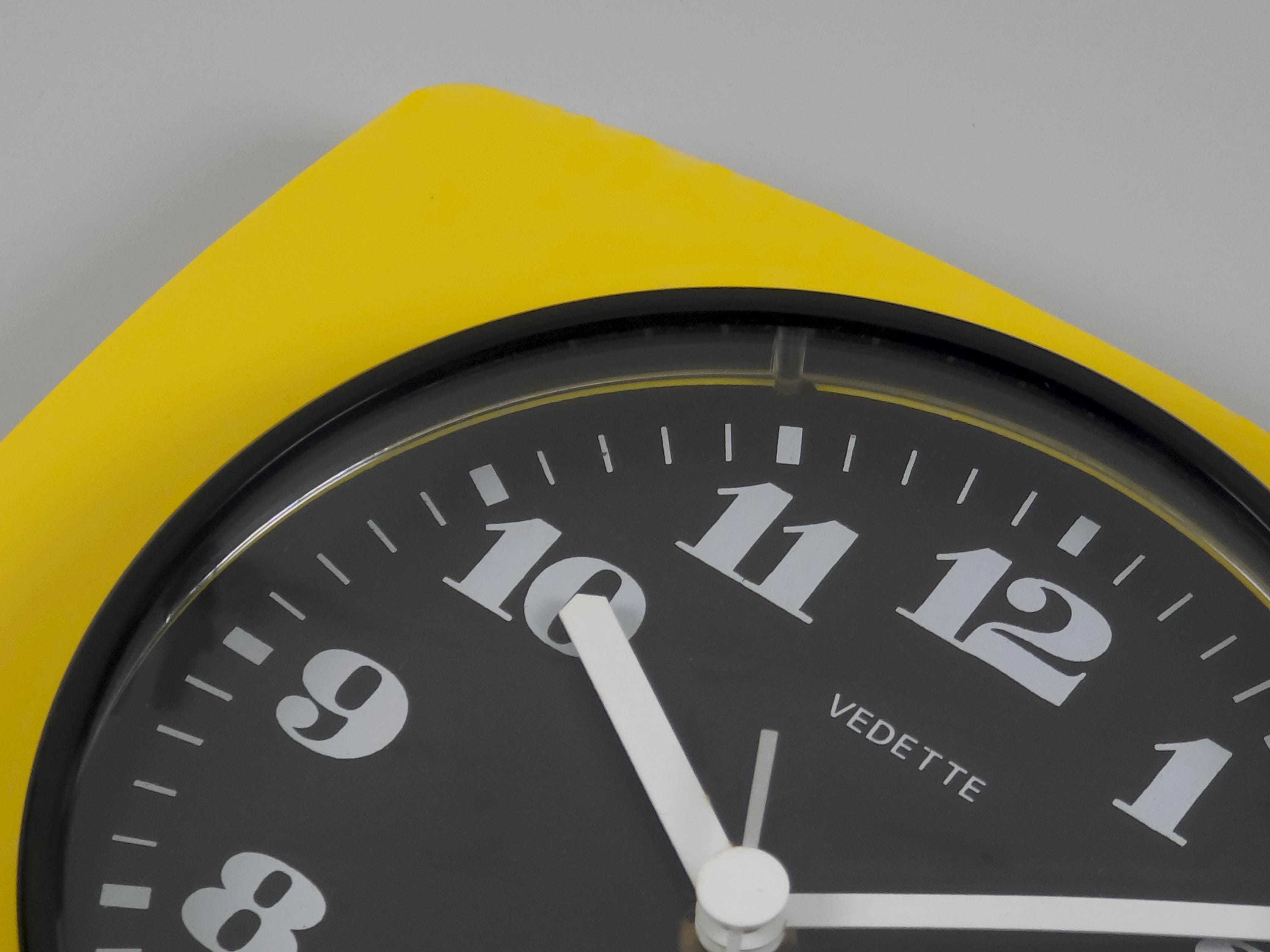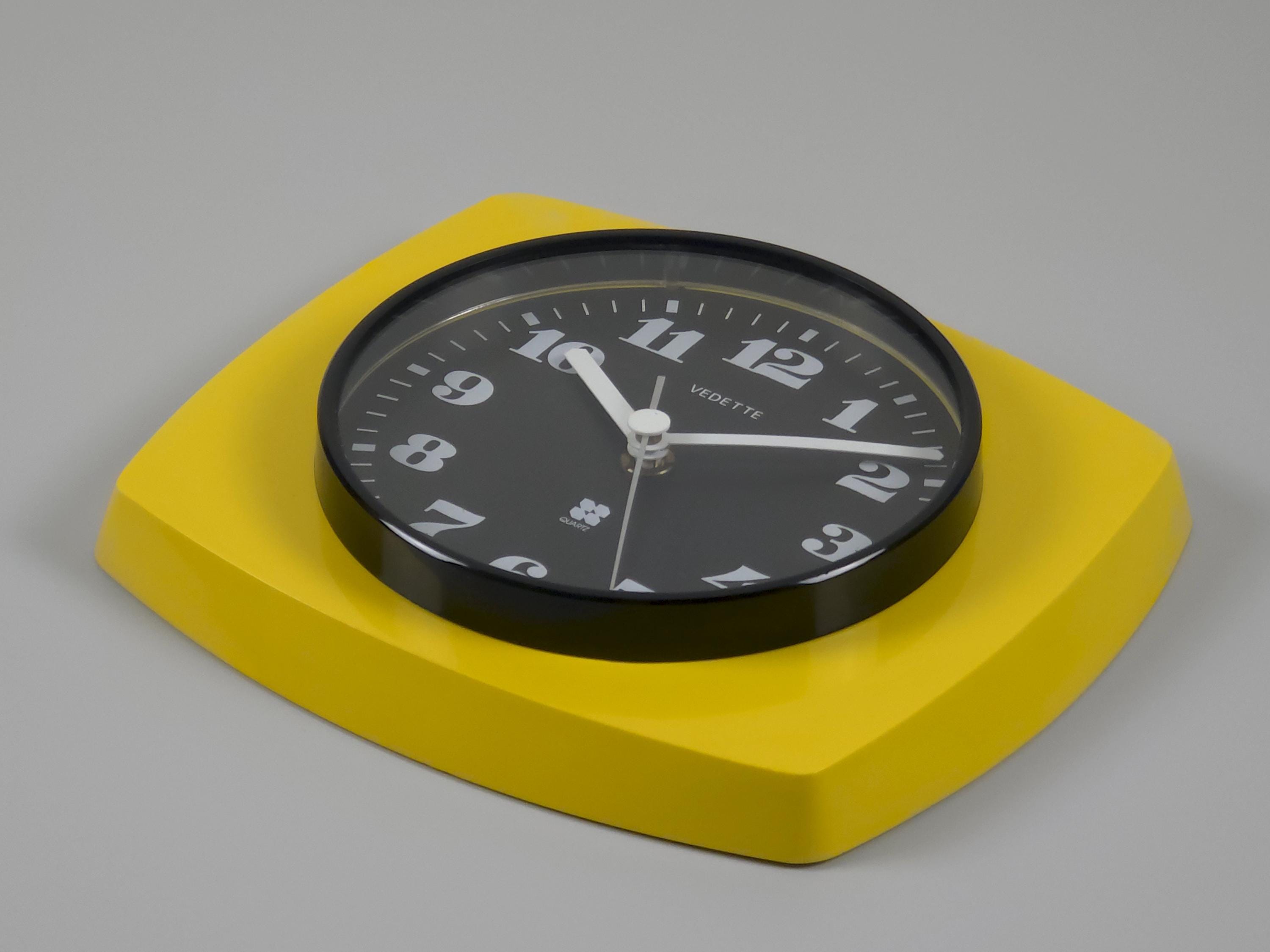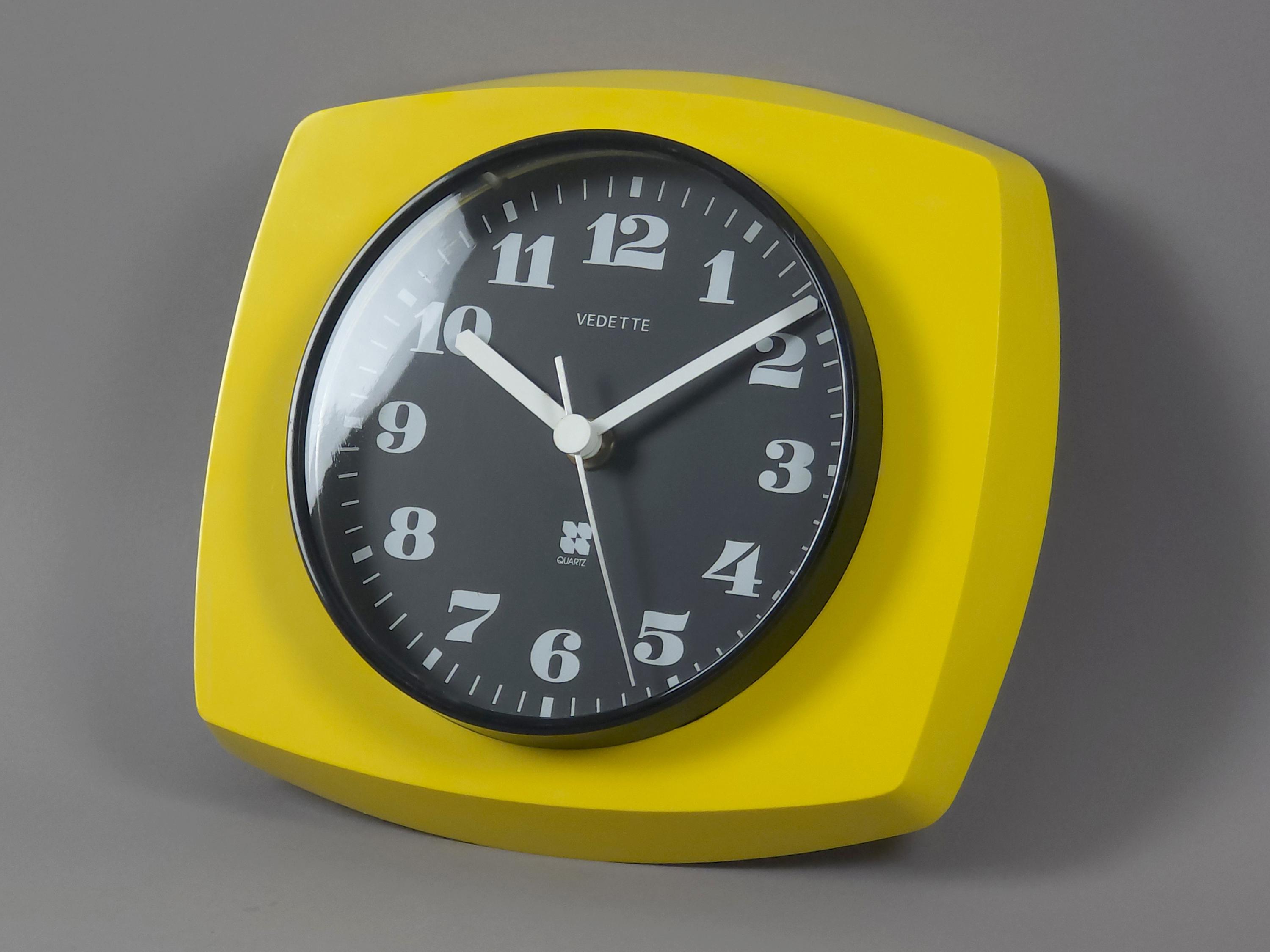 Vintage 1970s plastic wall clock with a vibrant yellow 'TV-style' frame by Vedette France. The clock features a crisp black face with bold, stylized white numerals and a sleek white handset for perfect legibility. Inside, it has been fitted with a reliable Hermle Quartz movement (Made in Germany), ensuring it keeps perfect modern time while maintaining its vintage soul.