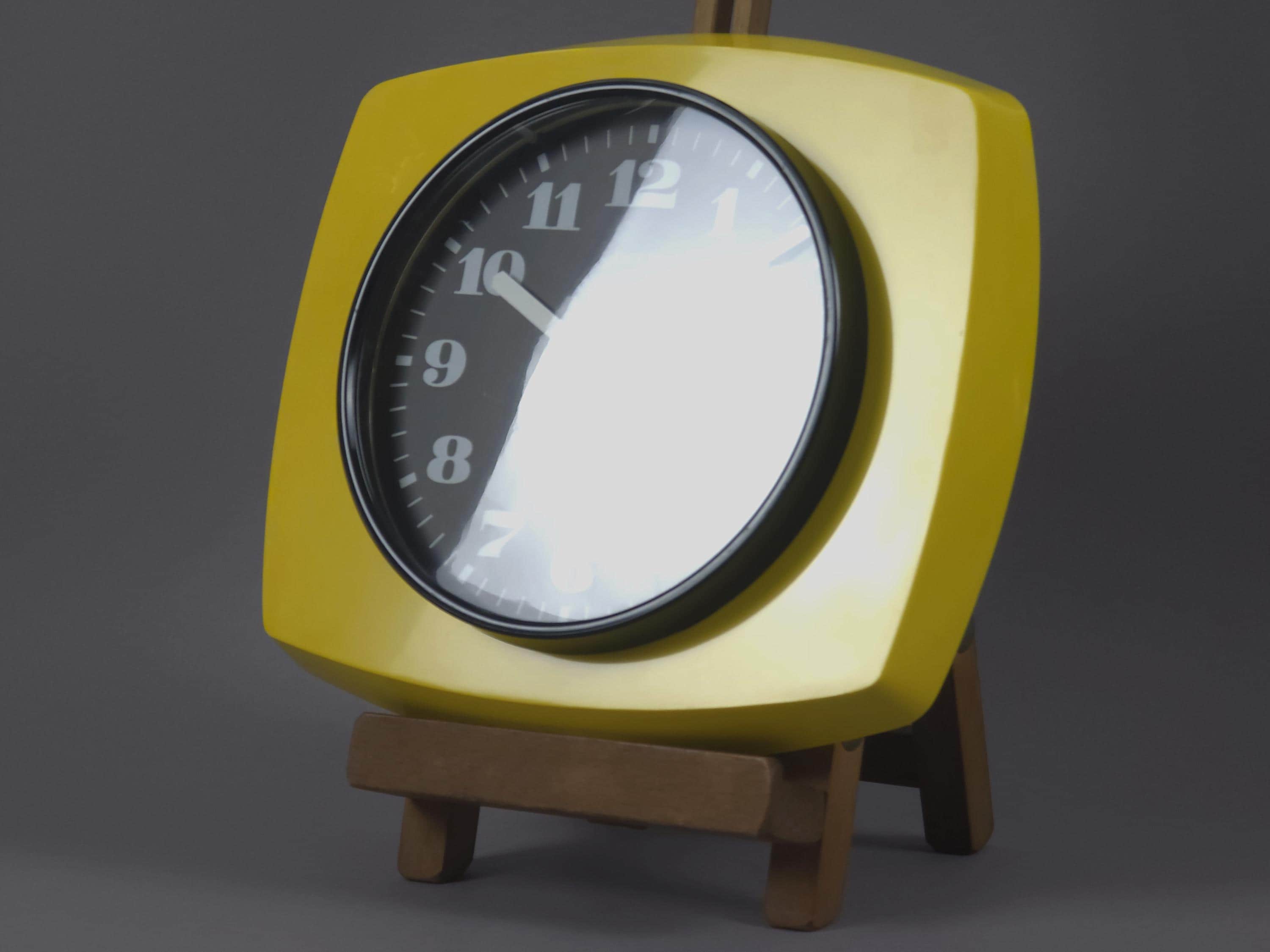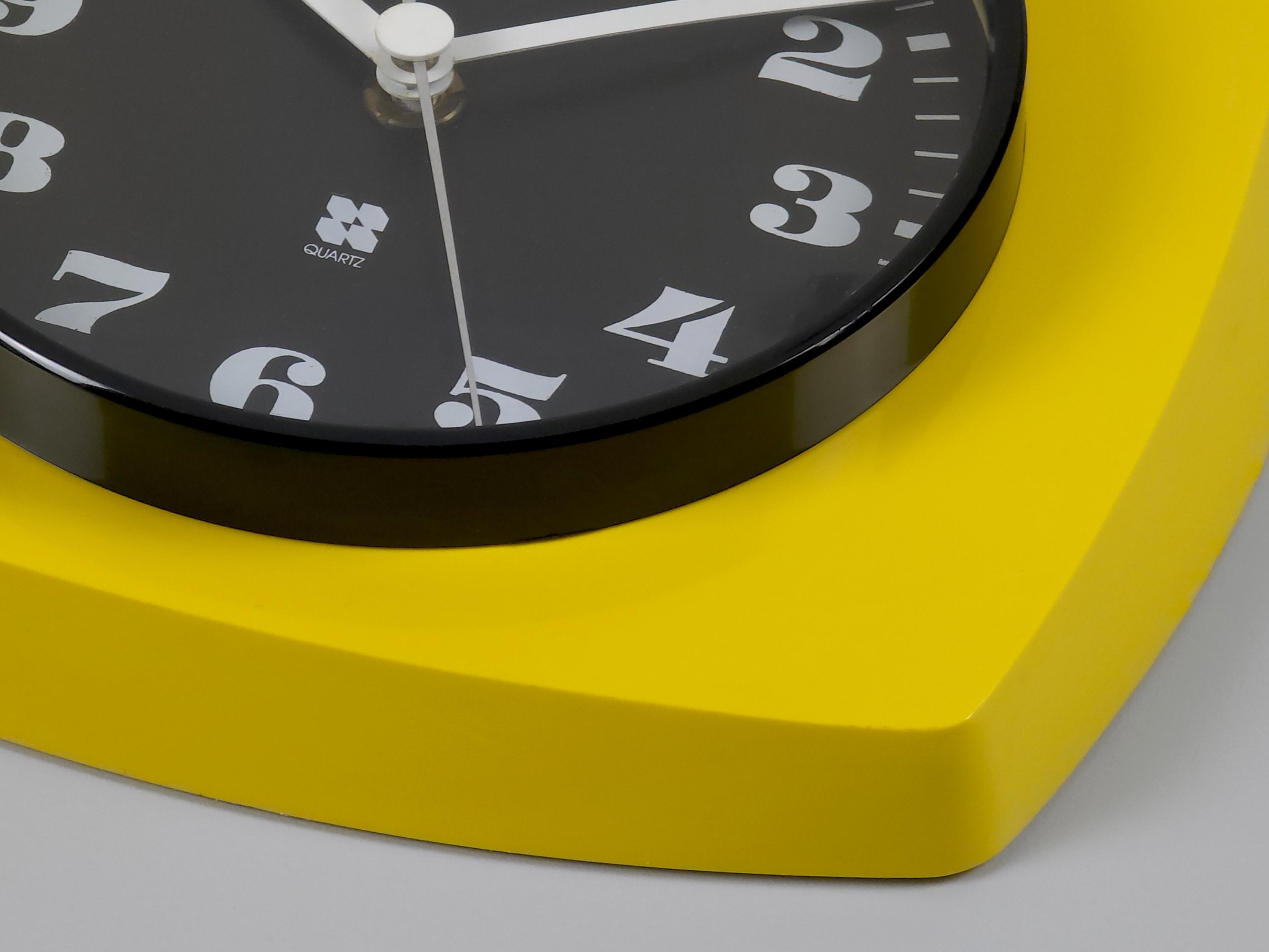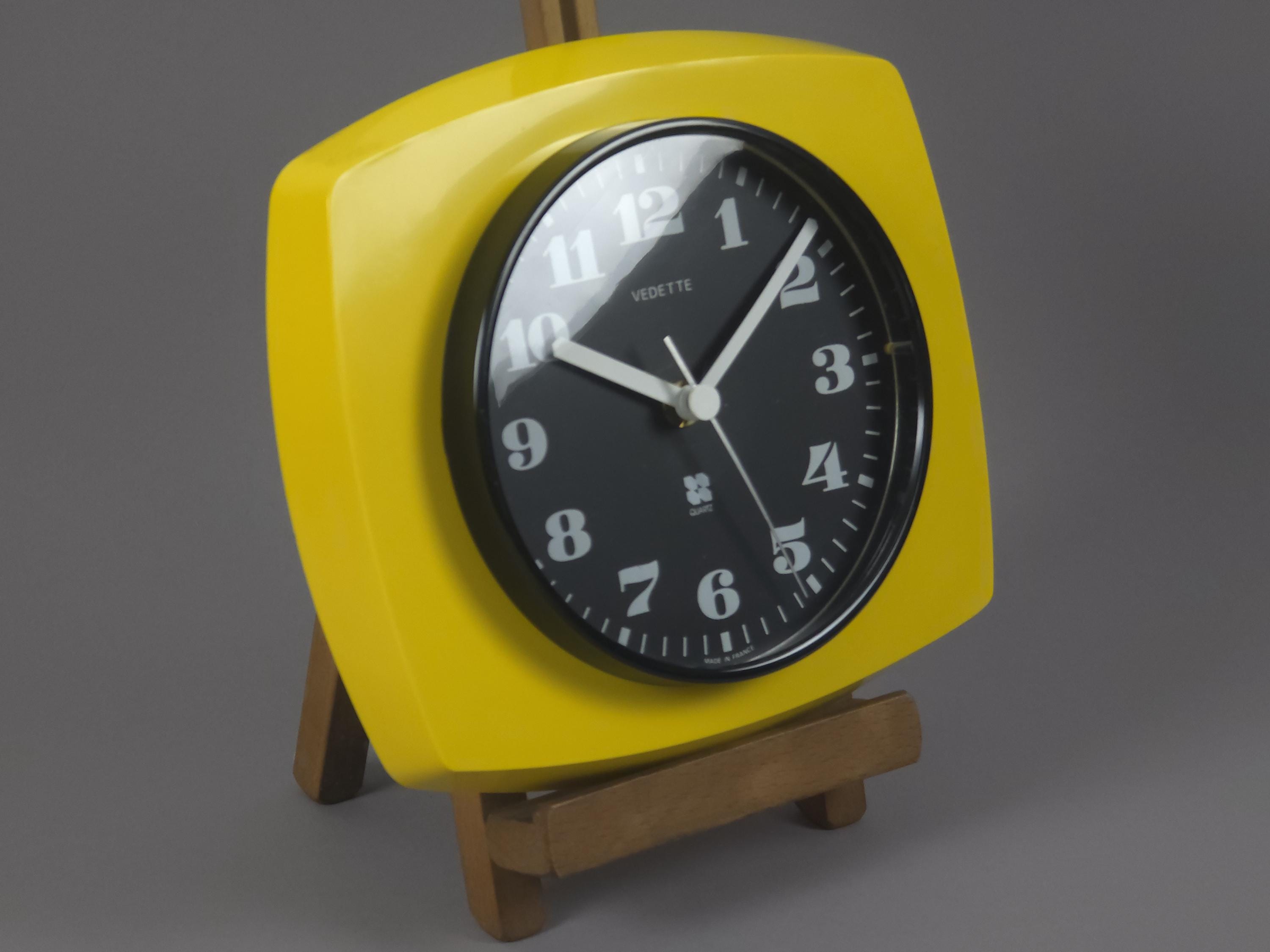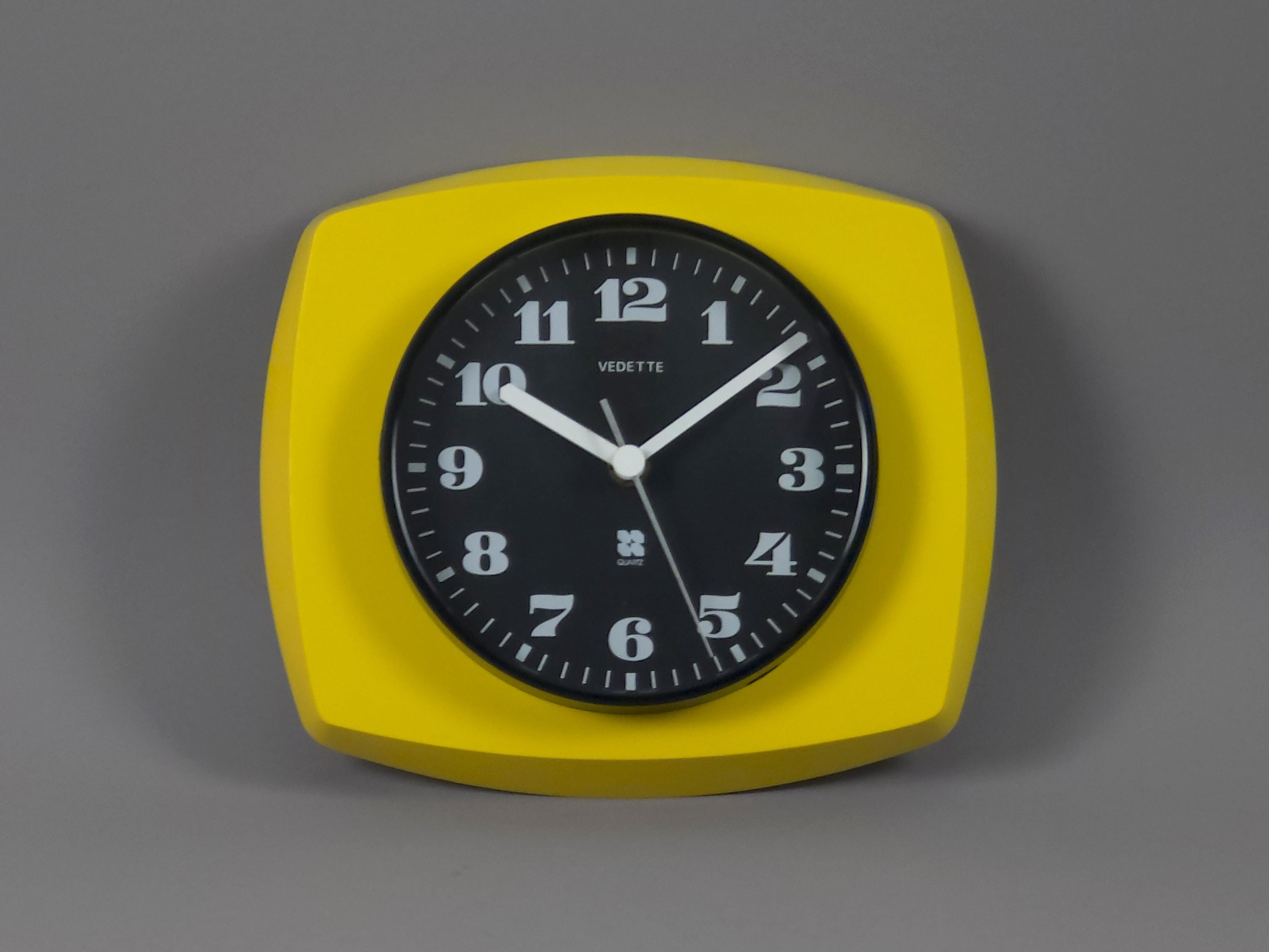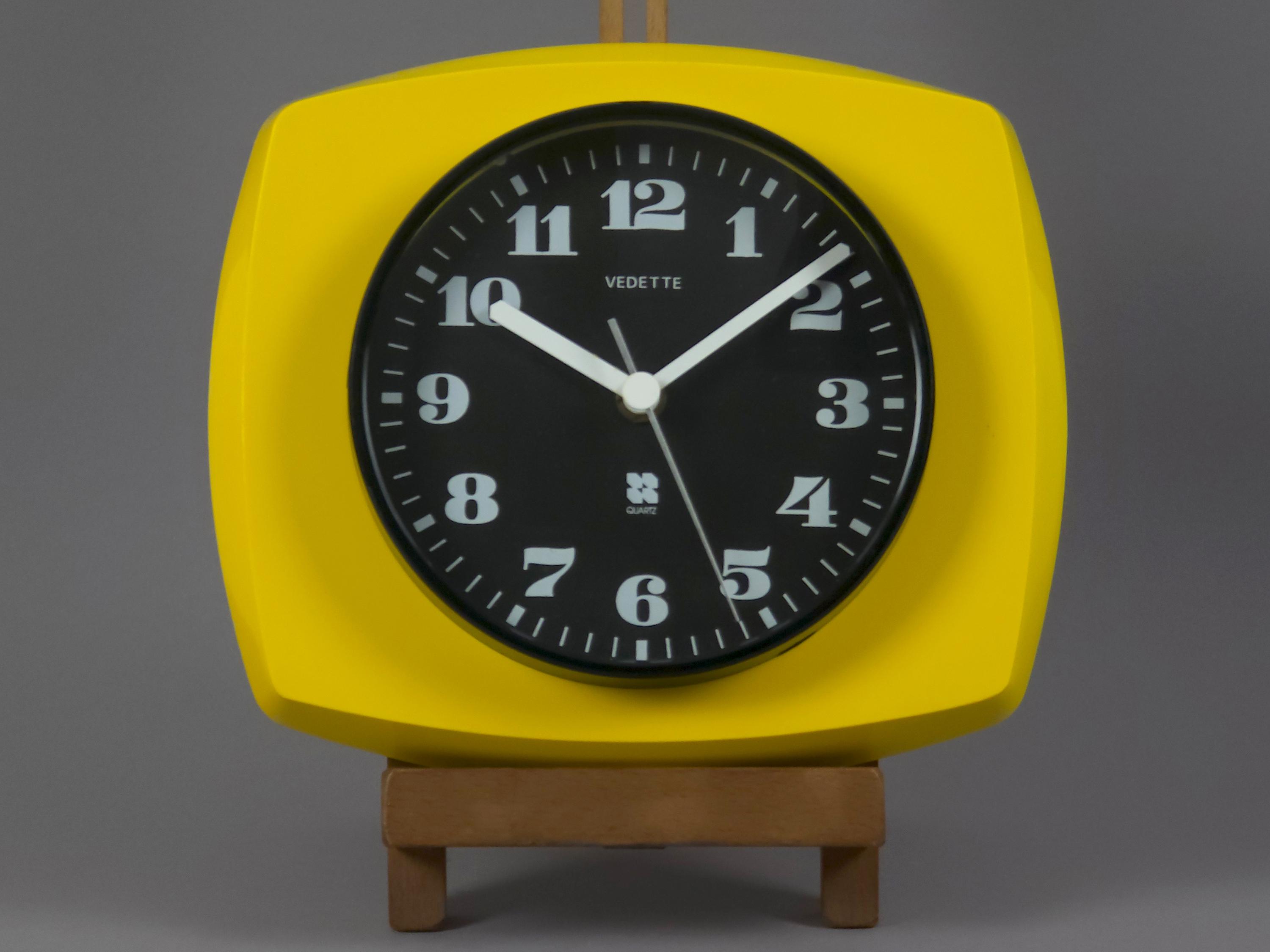 Vintage 1970s plastic wall clock with a vibrant yellow 'TV-style' frame by Vedette France. The clock features a crisp black face with bold, stylized white numerals and a sleek white handset for perfect legibility. Inside, it has been fitted with a reliable Hermle Quartz movement (Made in Germany), ensuring it keeps perfect modern time while maintaining its vintage soul.