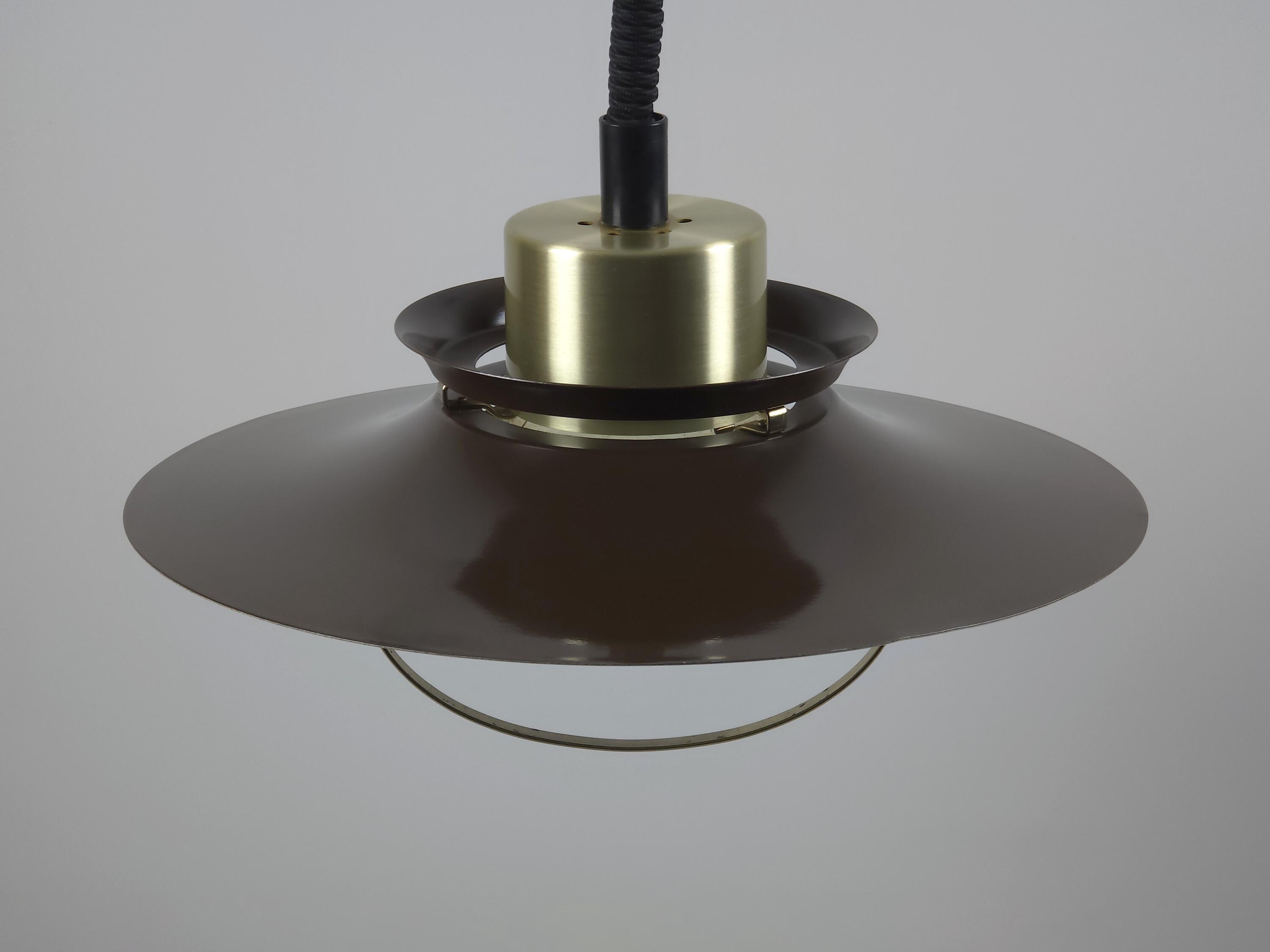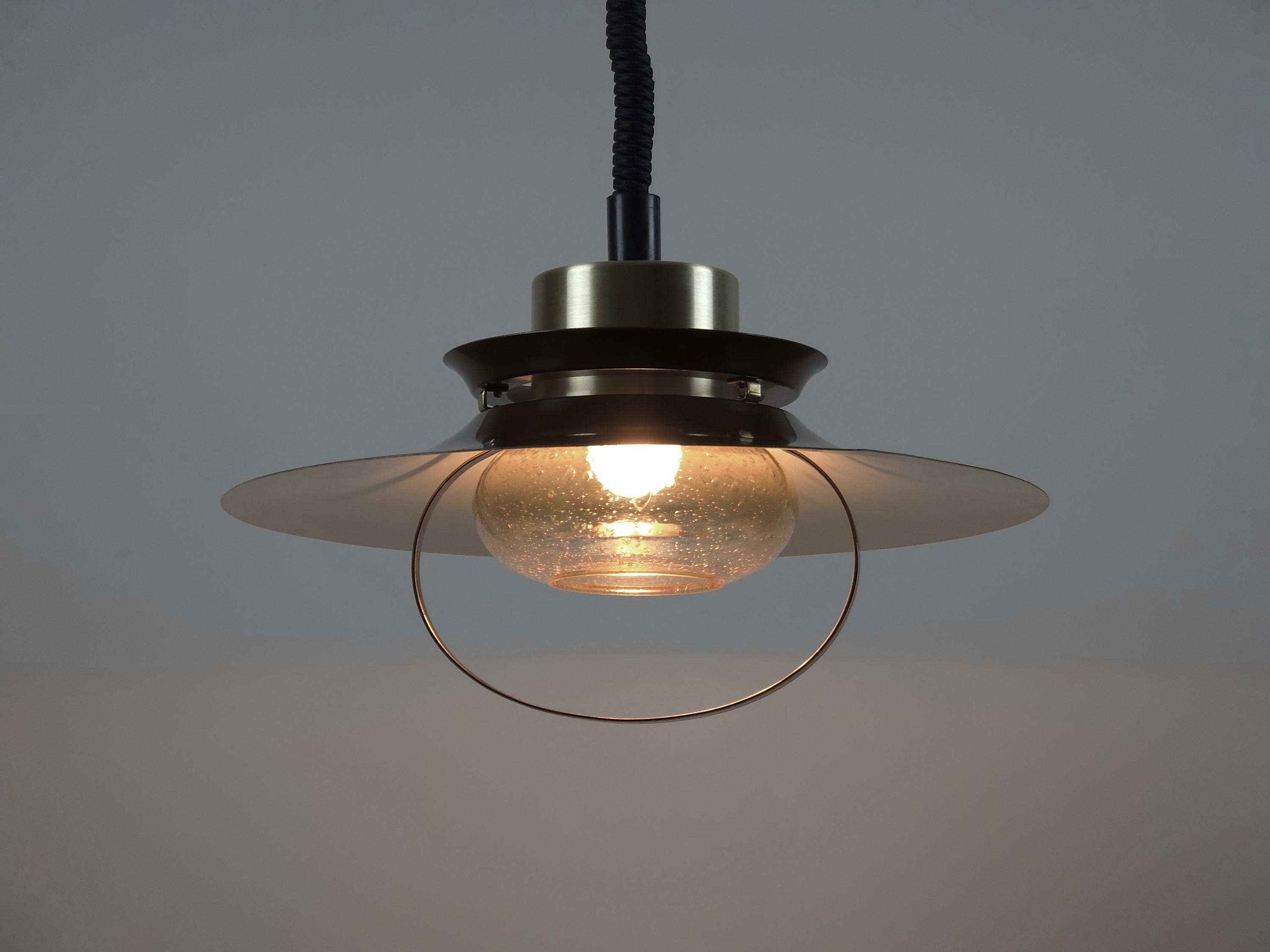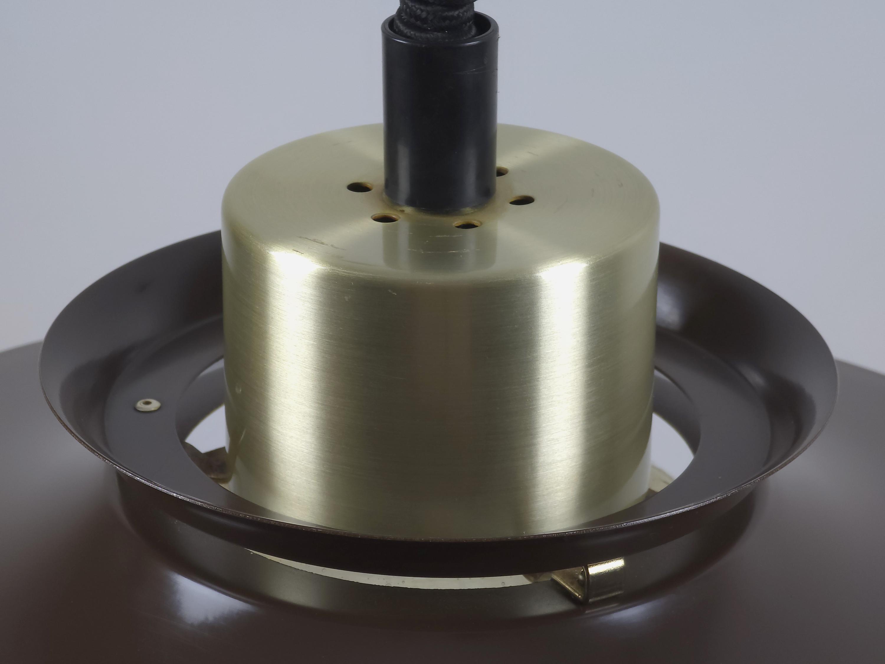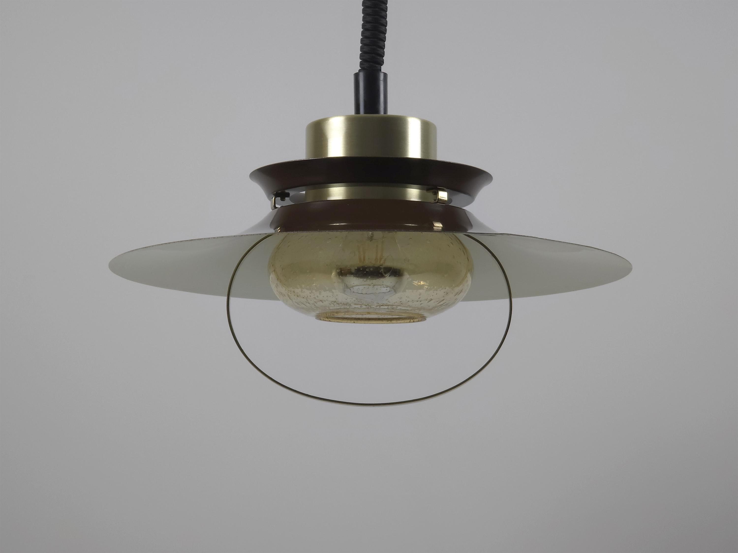 Rare 1970s Danish mid-century modern 'Rise & Fall' pendant lamp by Vitrika Denmark. This piece features a tiered, dark chocolate brown enamel shade accented with brushed brass hardware. At its core sits a stunning, hand-blown amber glass globe with a seeded "bubble" texture that diffuses light with a warm, vintage glow.