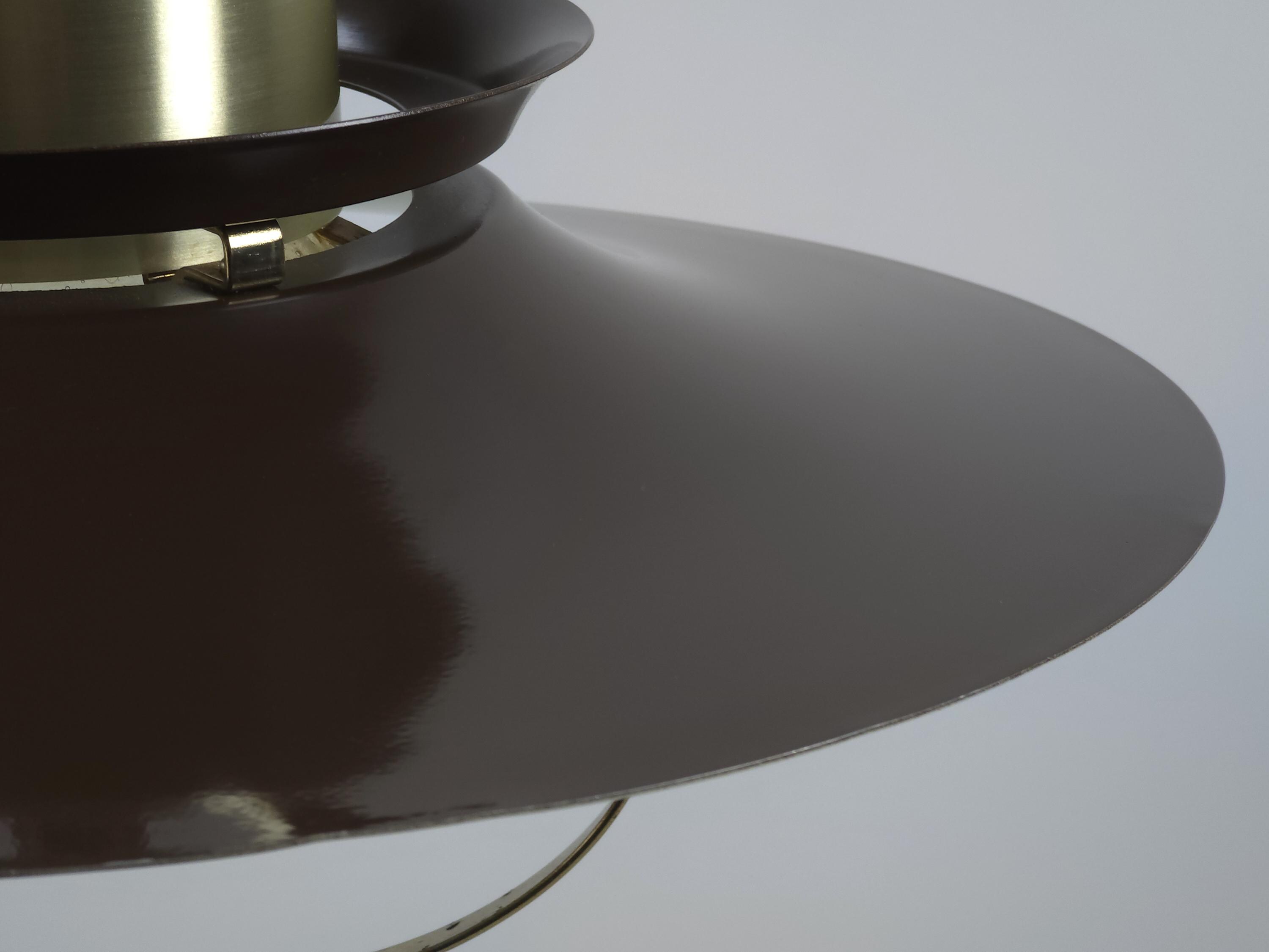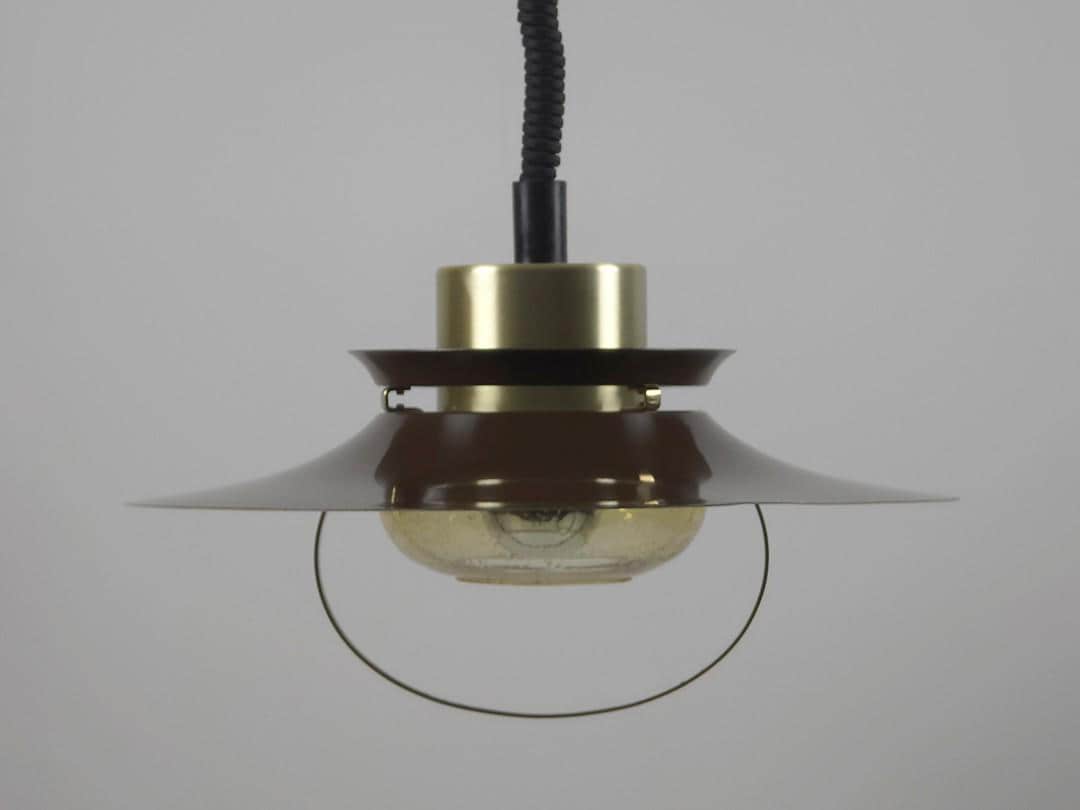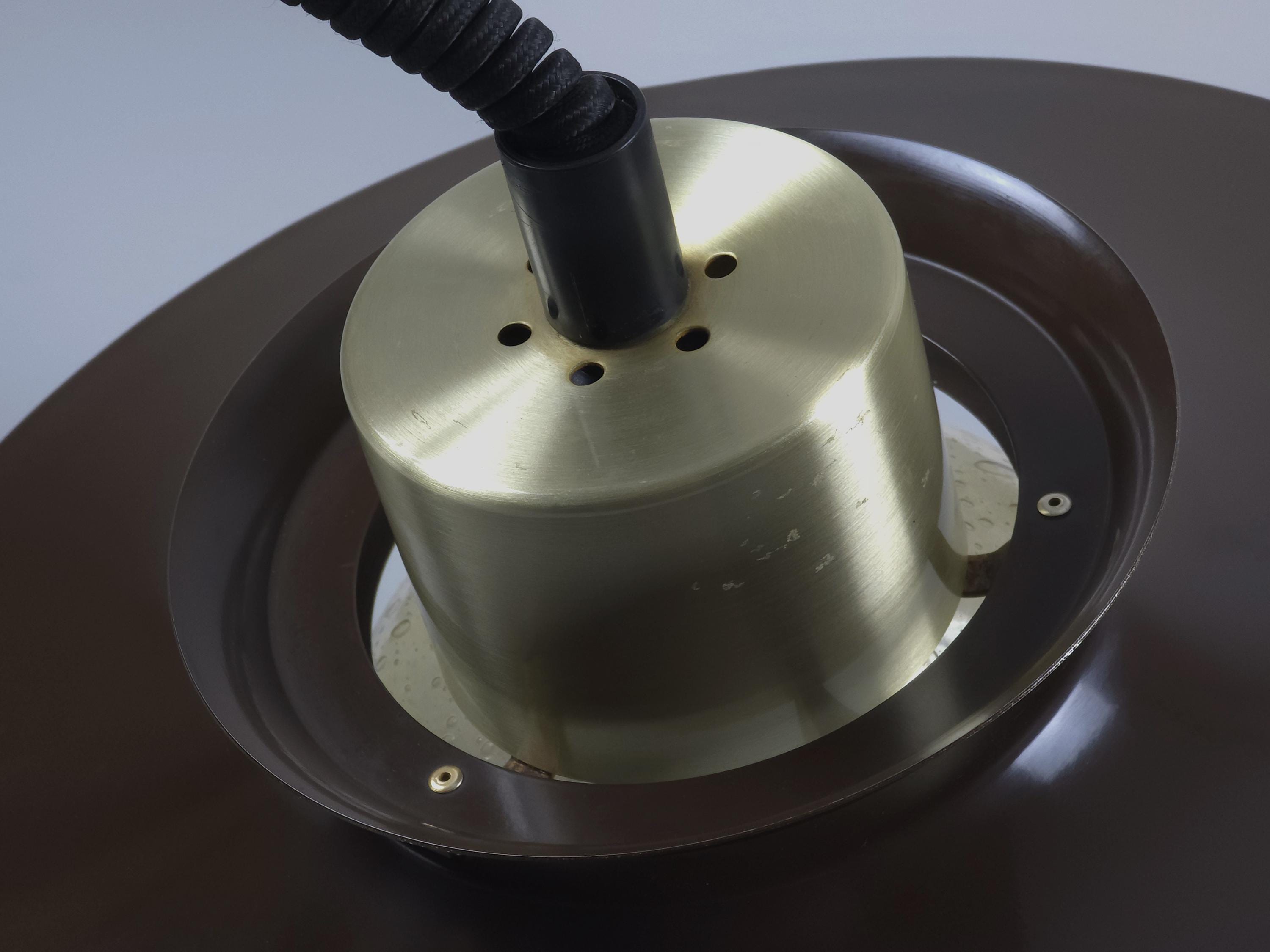 Rare 1970s Danish mid-century modern 'Rise & Fall' pendant lamp by Vitrika Denmark. This piece features a tiered, dark chocolate brown enamel shade accented with brushed brass hardware. At its core sits a stunning, hand-blown amber glass globe with a seeded "bubble" texture that diffuses light with a warm, vintage glow.
