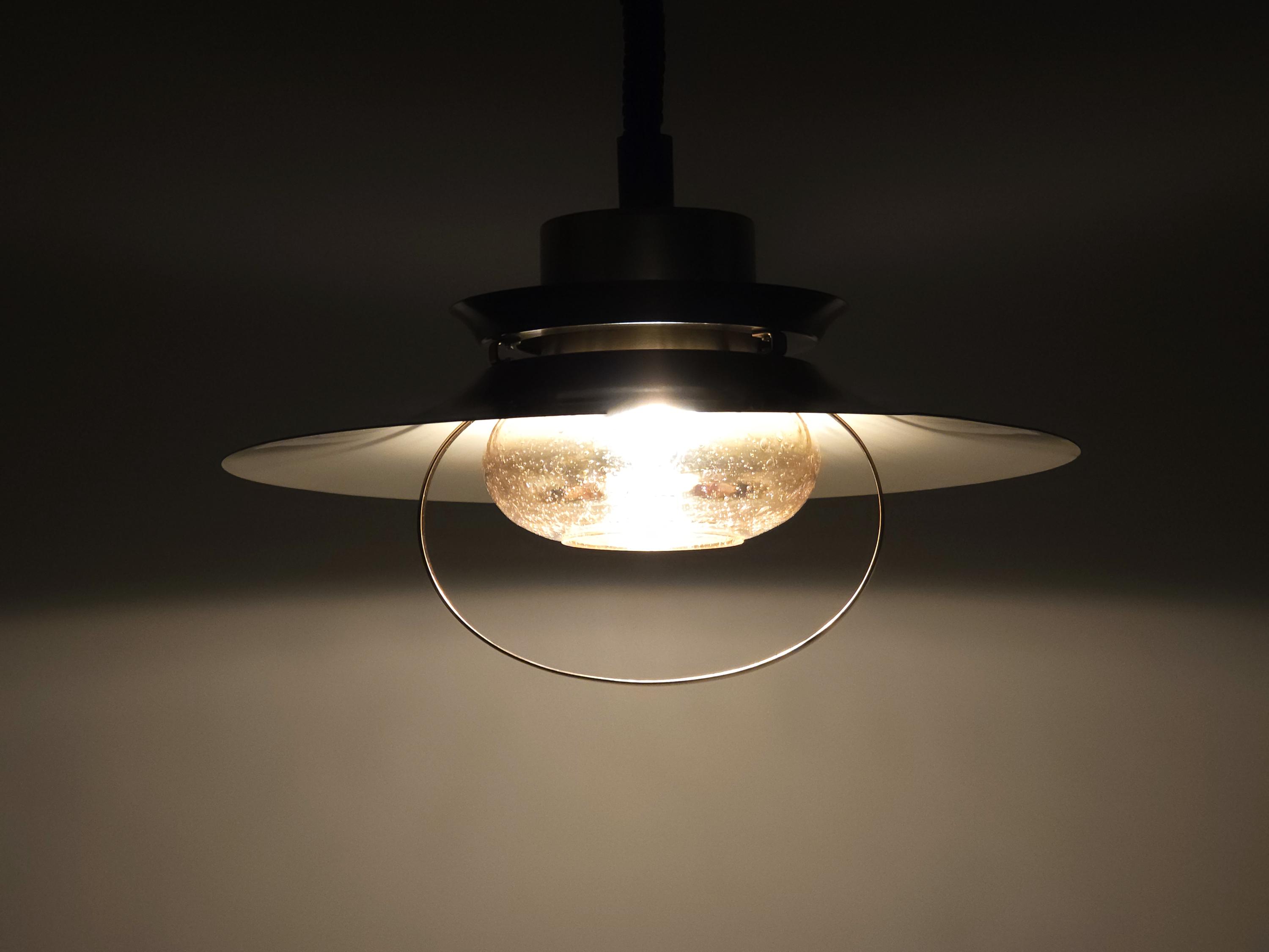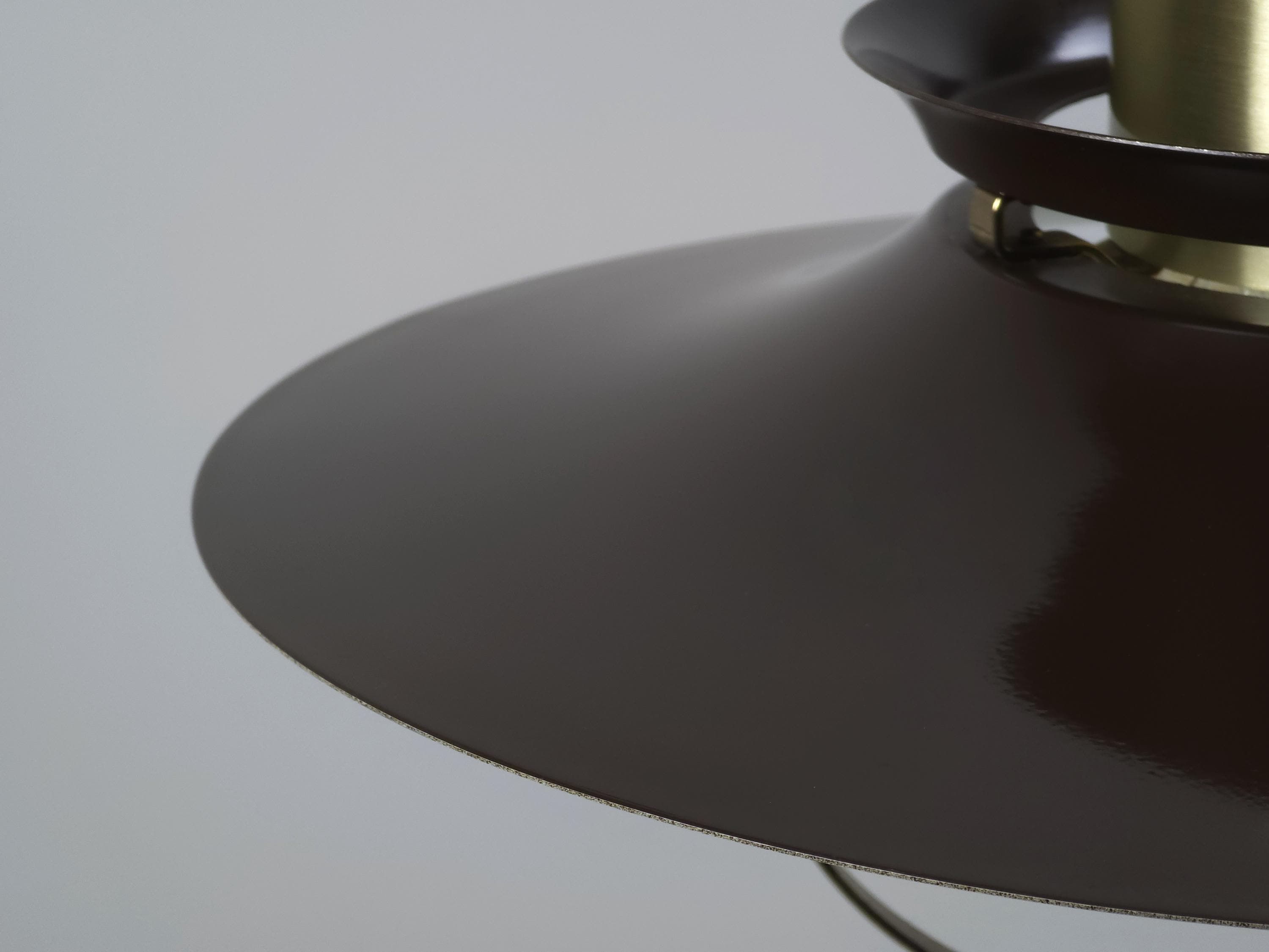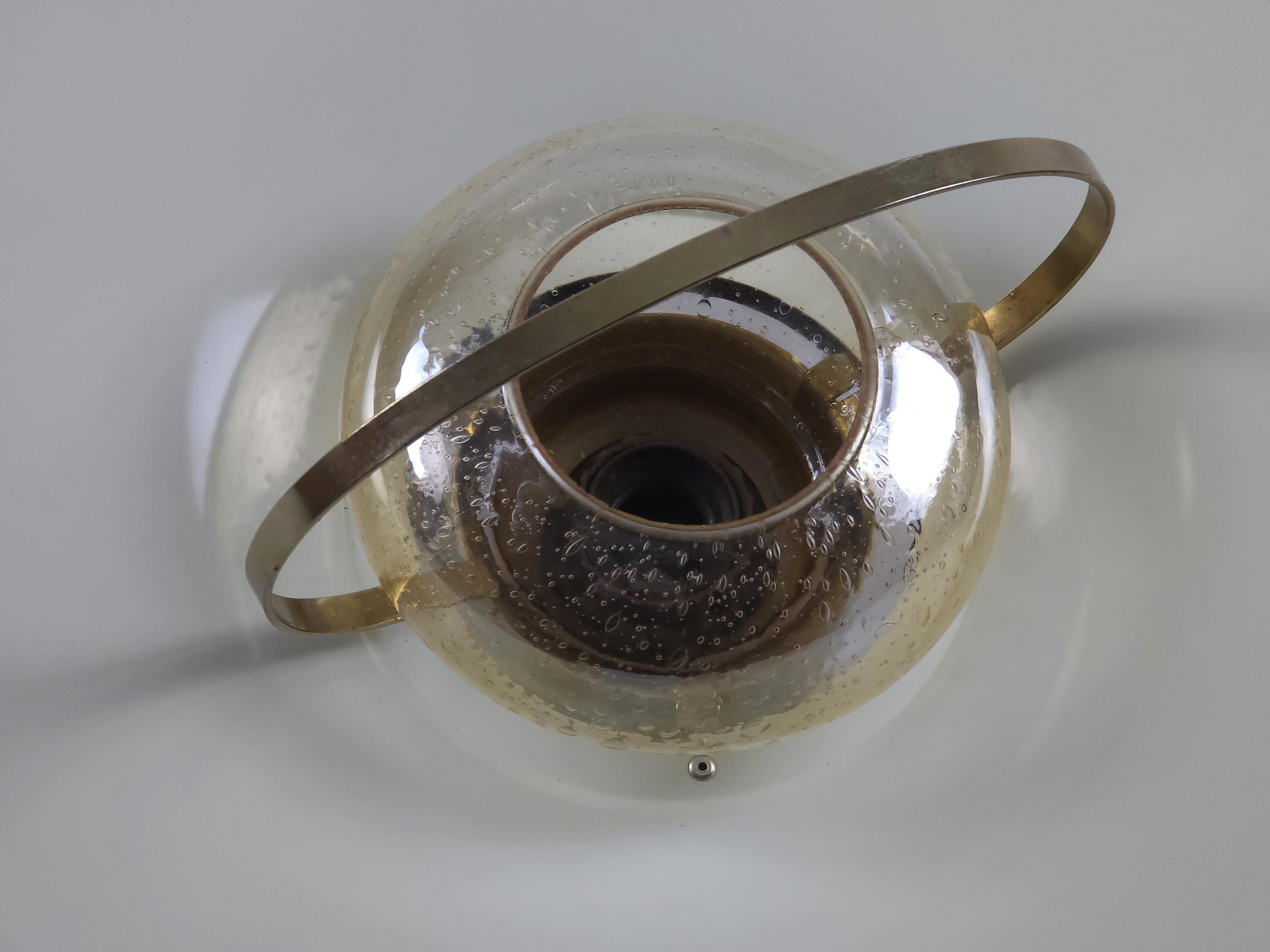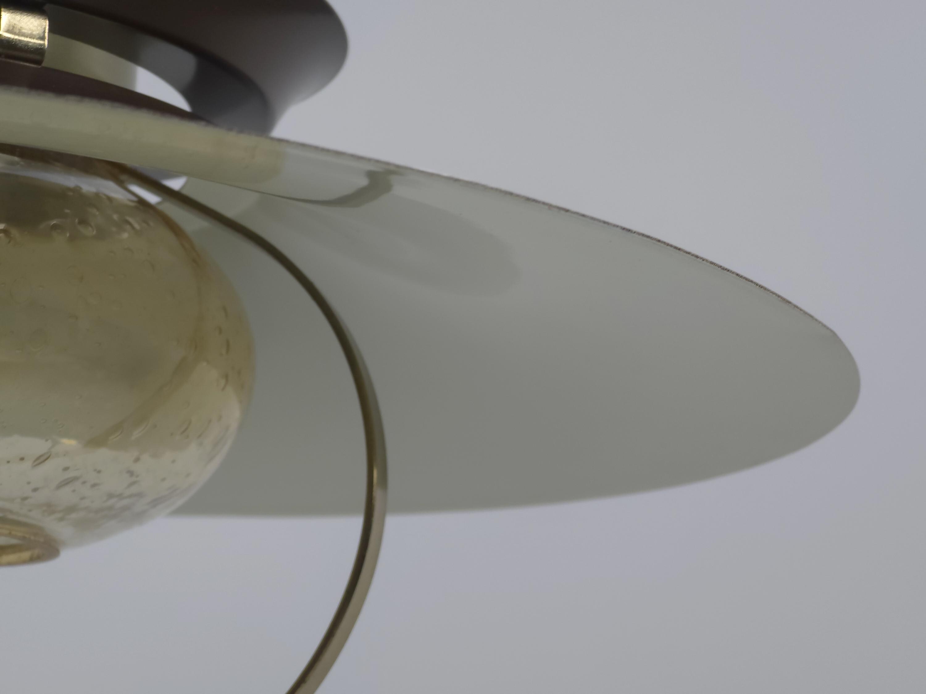 Rare 1970s Danish mid-century modern 'Rise & Fall' pendant lamp by Vitrika Denmark. This piece features a tiered, dark chocolate brown enamel shade accented with brushed brass hardware. At its core sits a stunning, hand-blown amber glass globe with a seeded "bubble" texture that diffuses light with a warm, vintage glow.