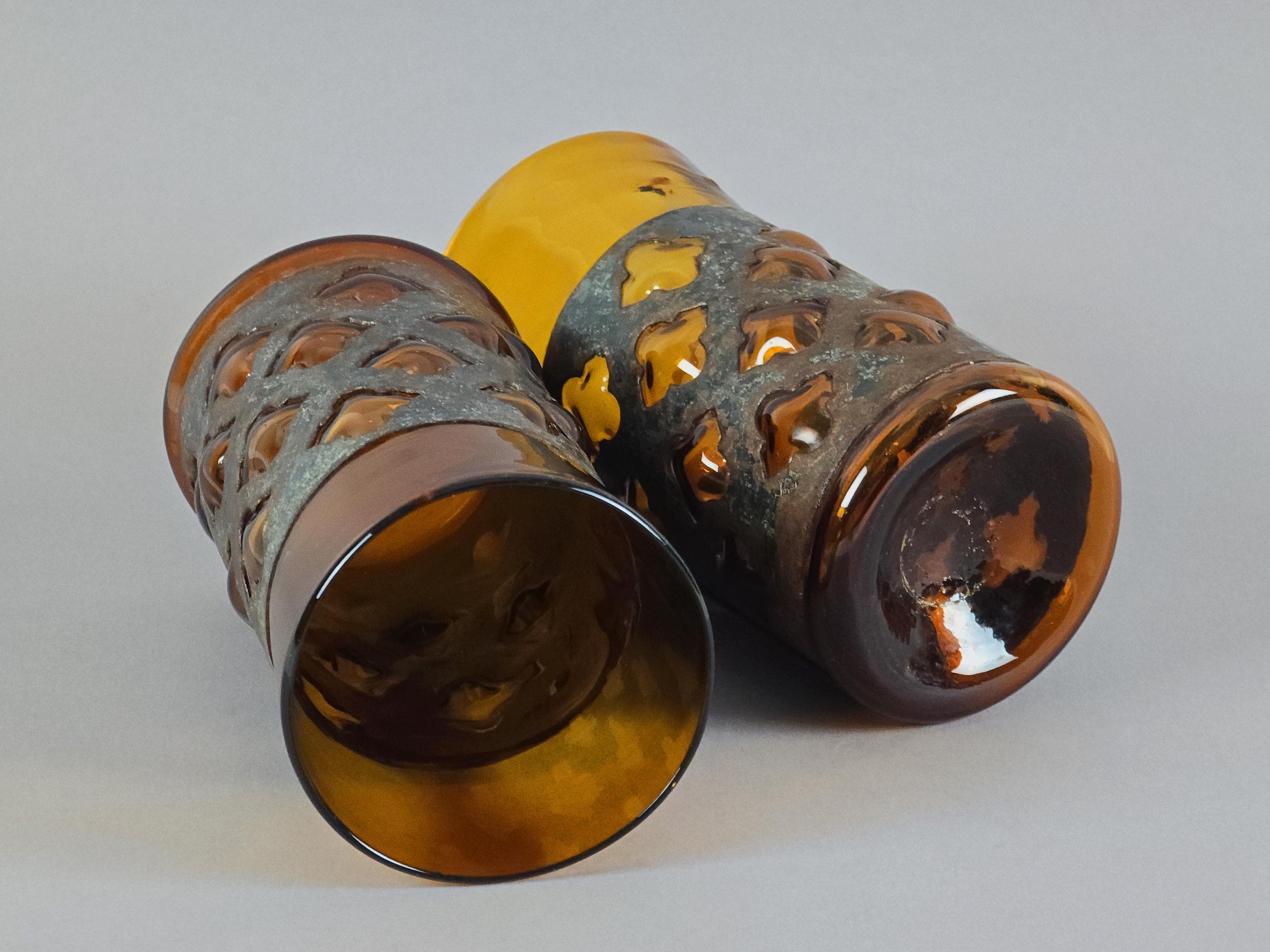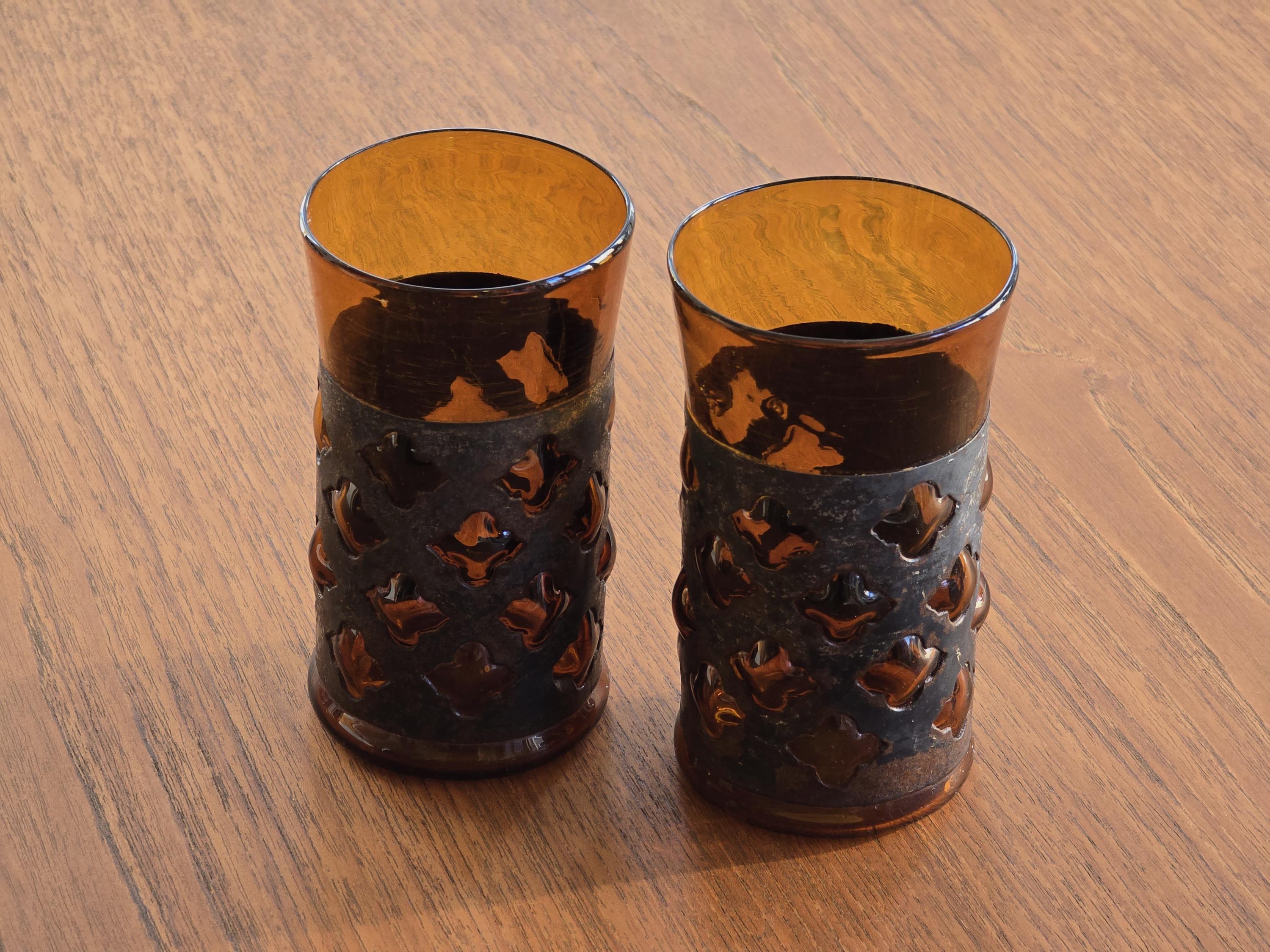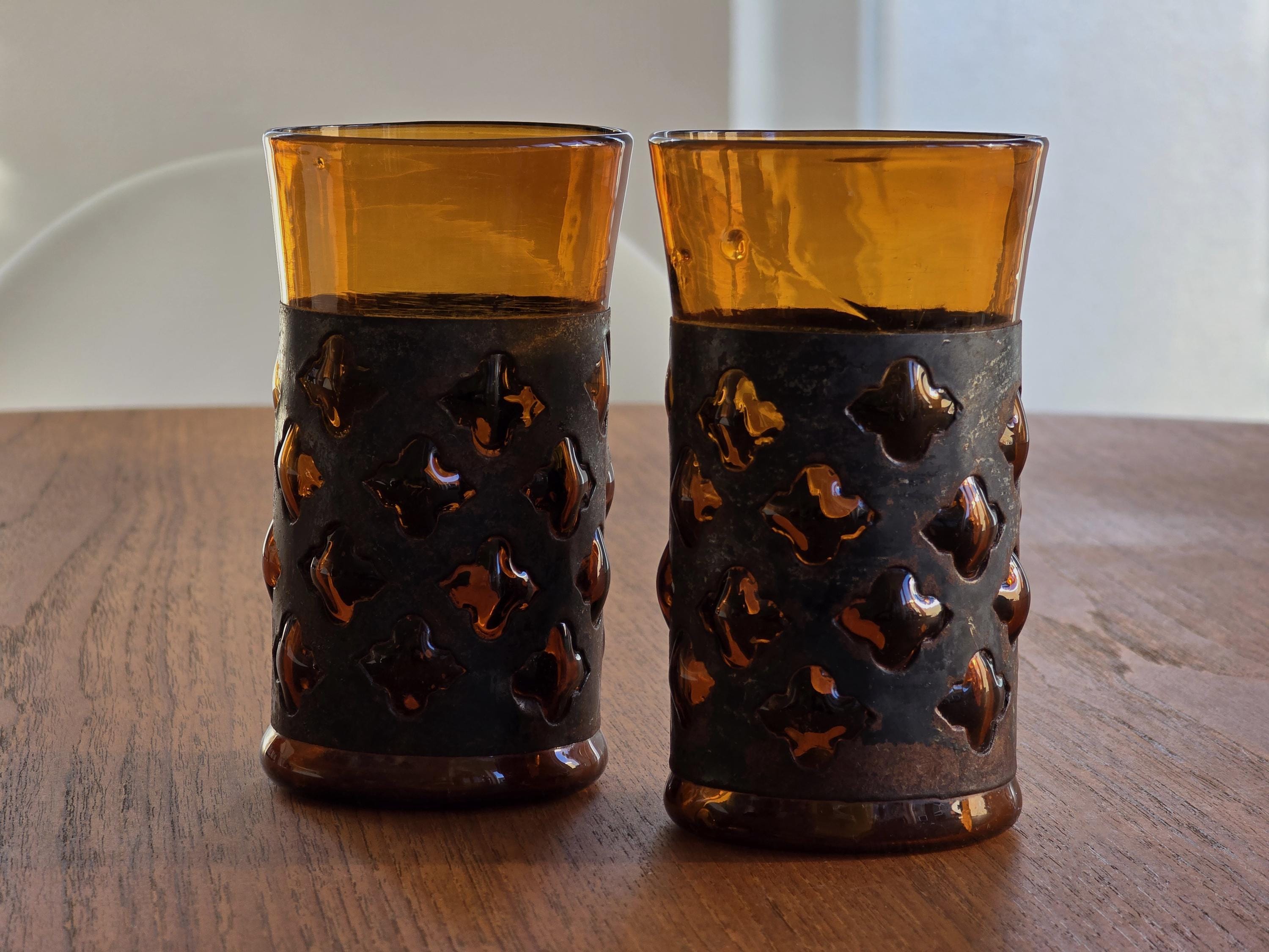 Original pair of “Imprisoned” amber glass tumblers by Felipe Derflingher, produced in Mexico during the late 1960s–1970s. Each piece is hand-blown directly into a pre-formed metal cage, allowing the molten glass to expand through the geometric cut-outs. The result is a dramatic interplay between solid metal structure and organic glass form.