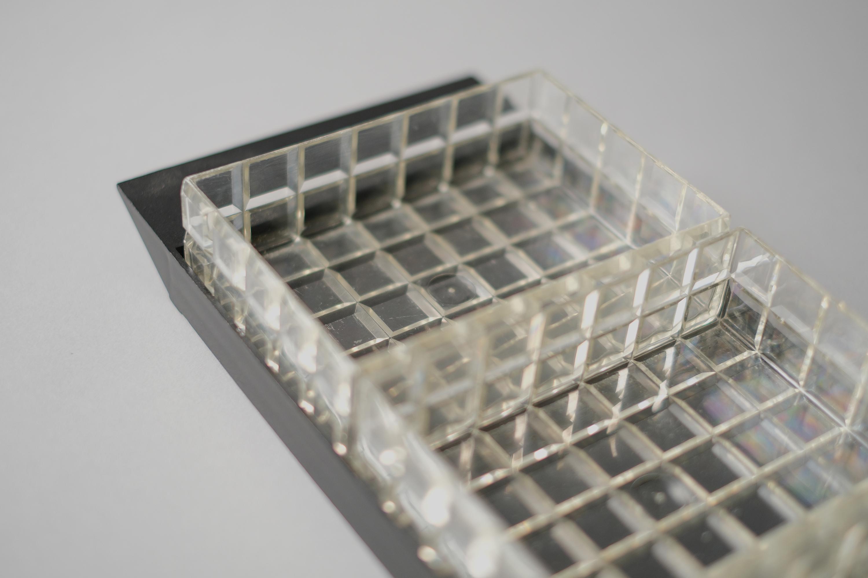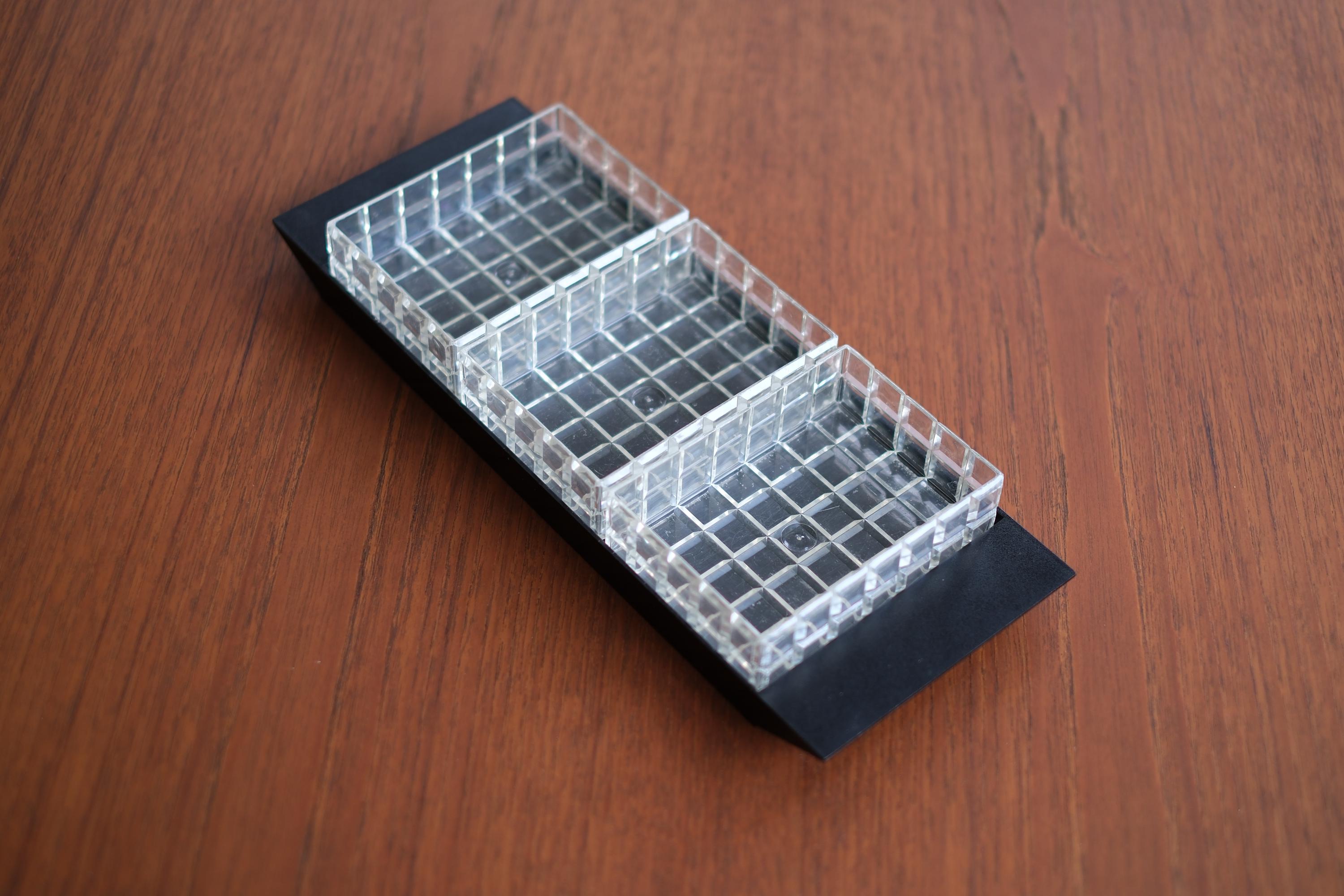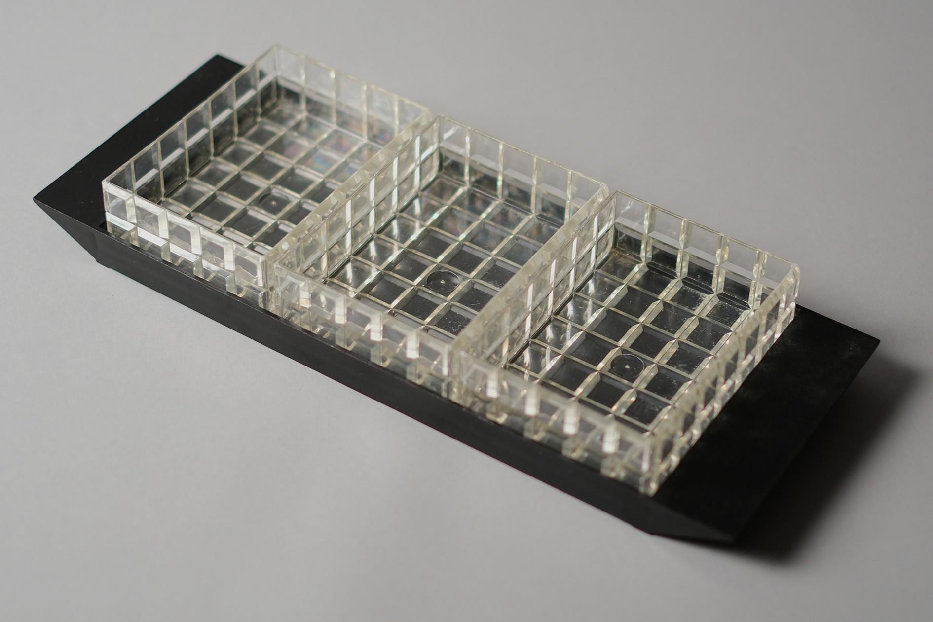 Vintage 1970s acrylic multipurpose snack serving tray with three inserts. The set has a matte black rectangular base with three removable clear acrylic inserts with a distinct "waffle" grid texture.