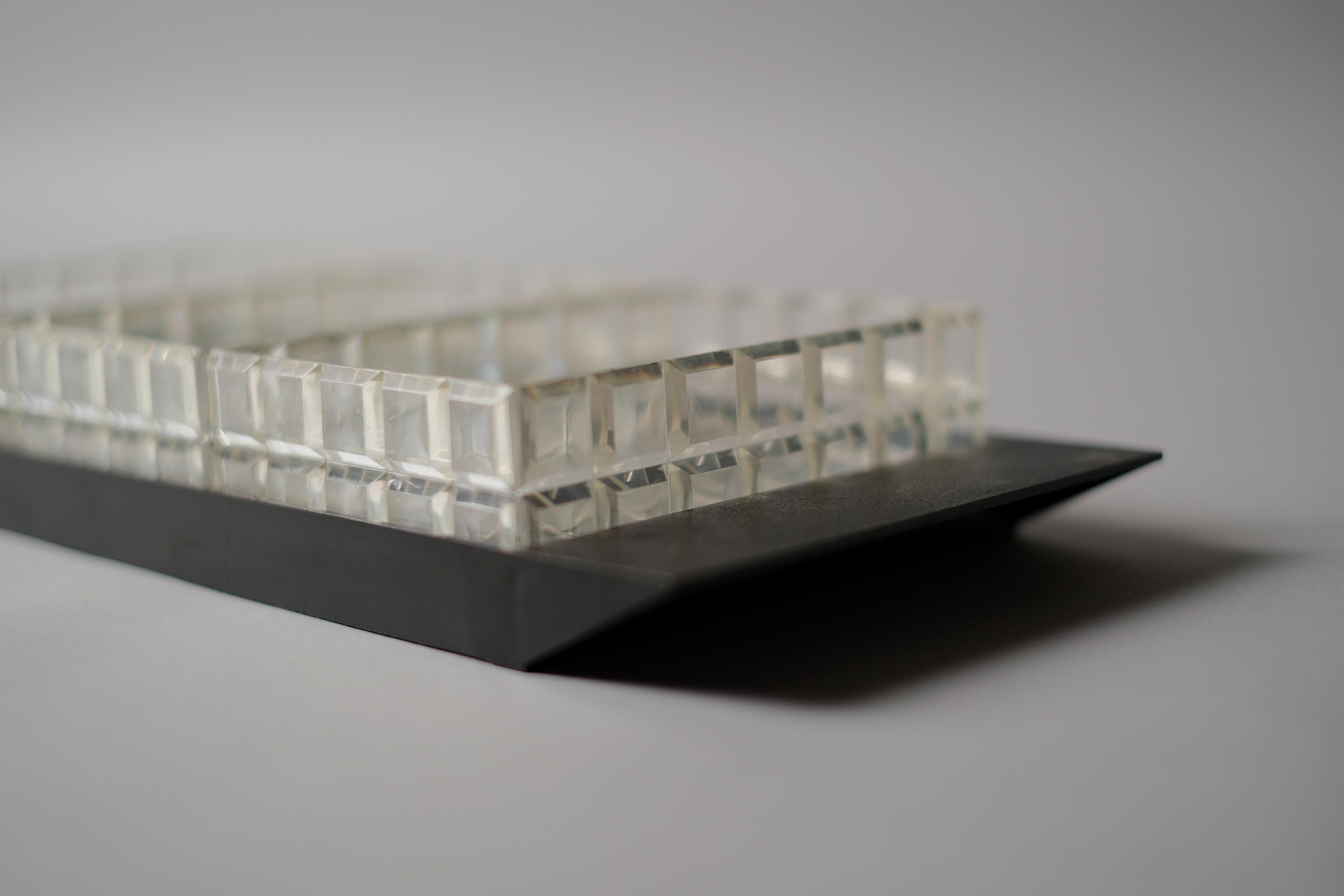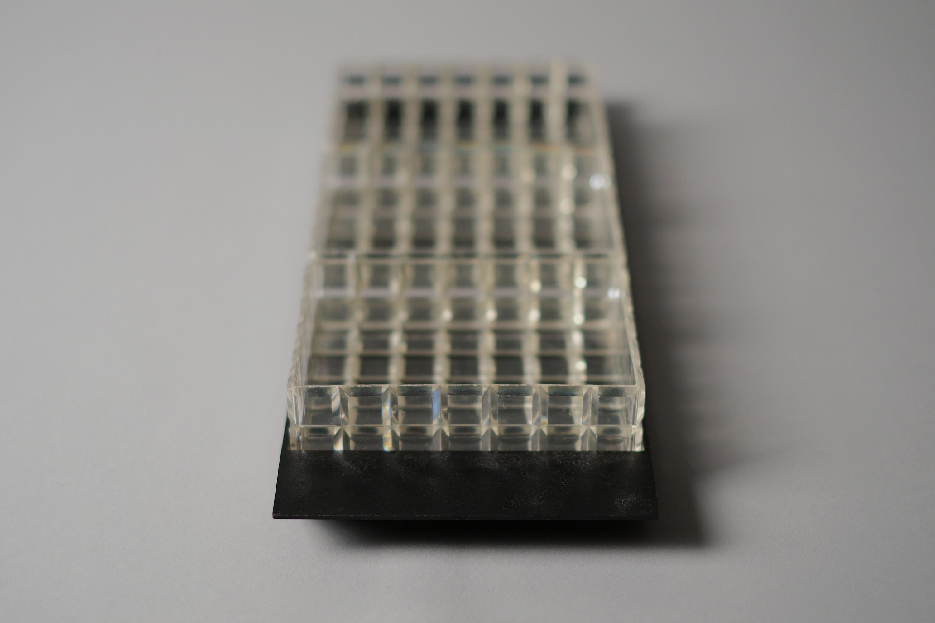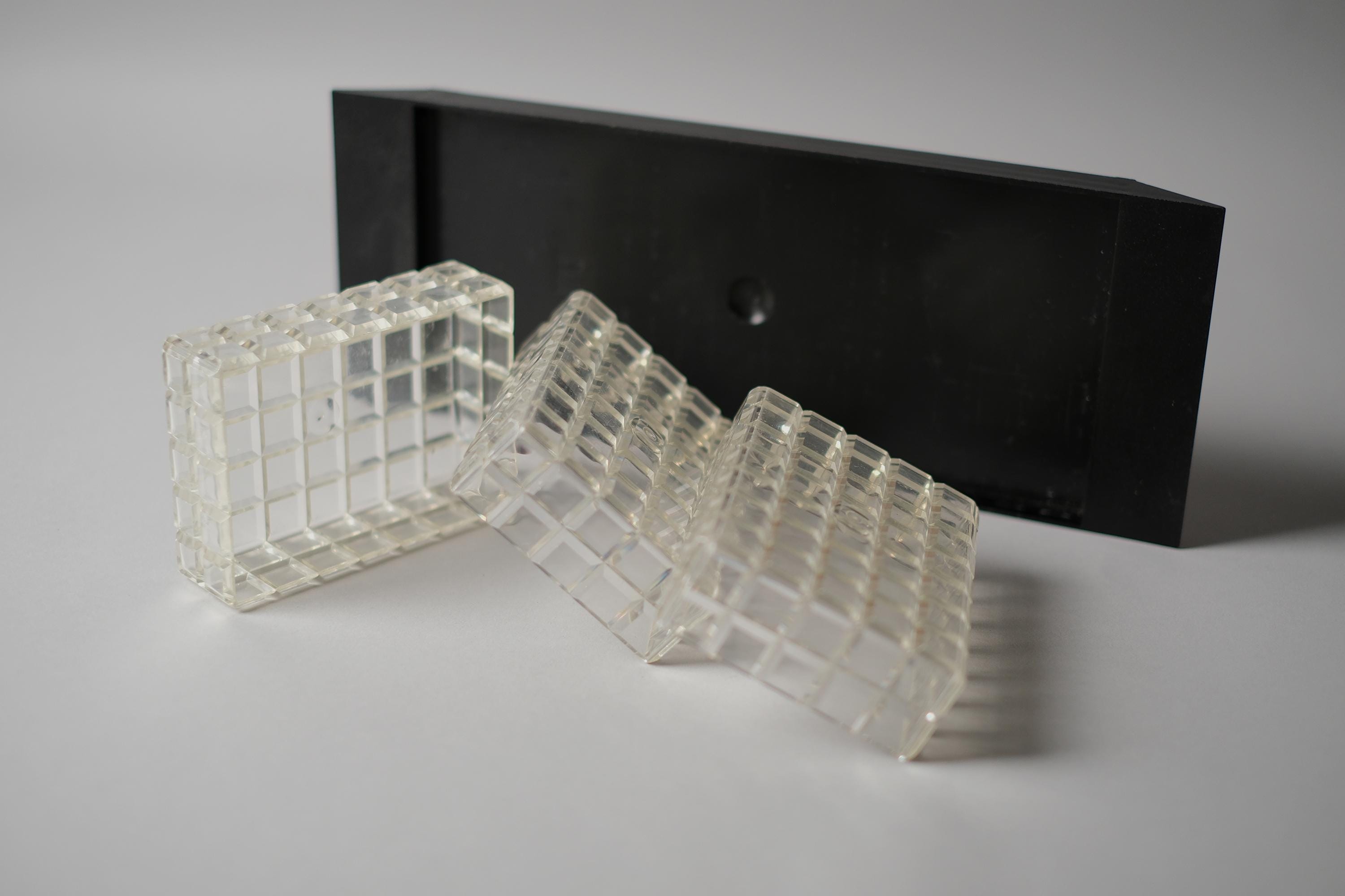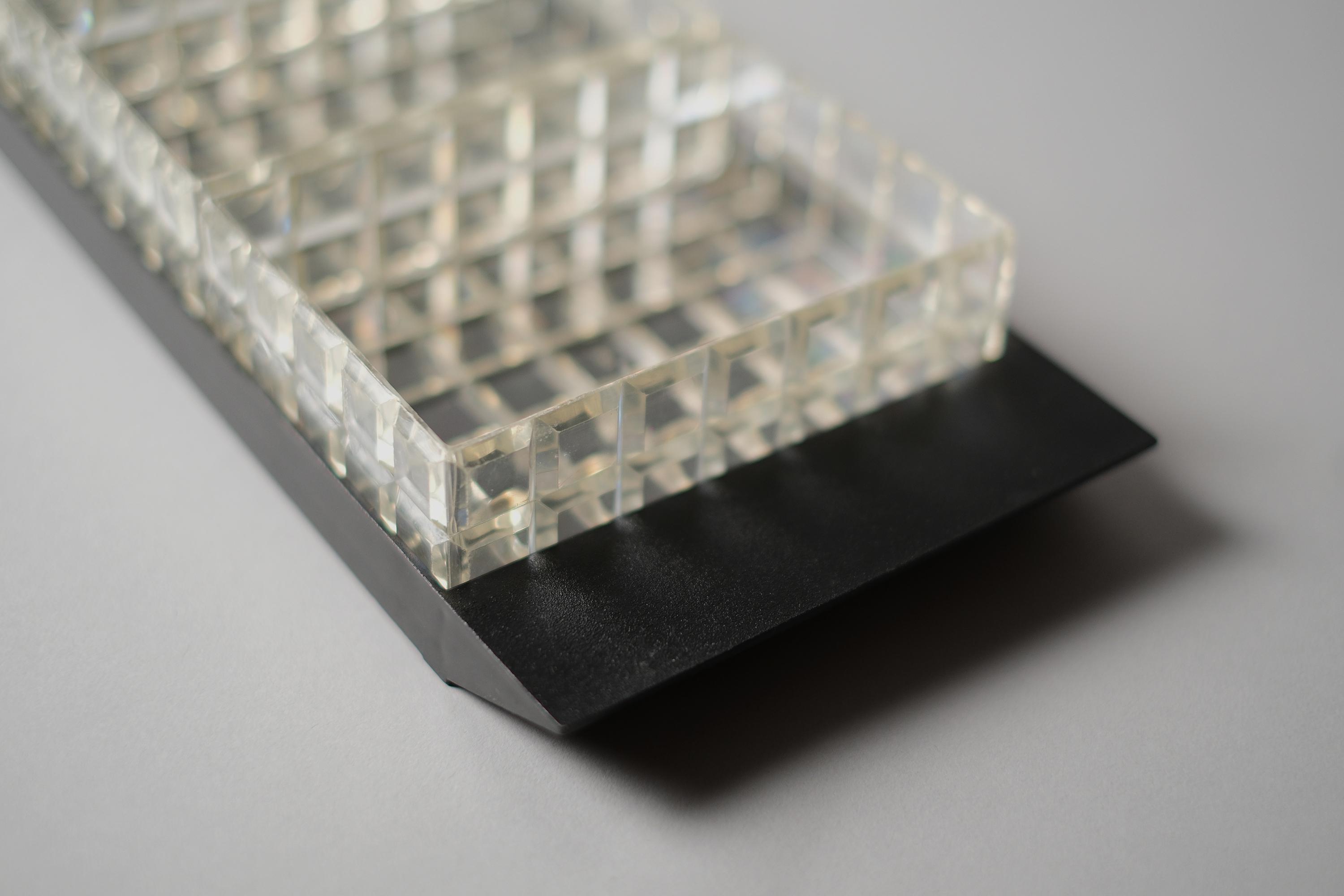 Vintage 1970s acrylic multipurpose snack serving tray with three inserts. The set has a matte black rectangular base with three removable clear acrylic inserts with a distinct "waffle" grid texture.