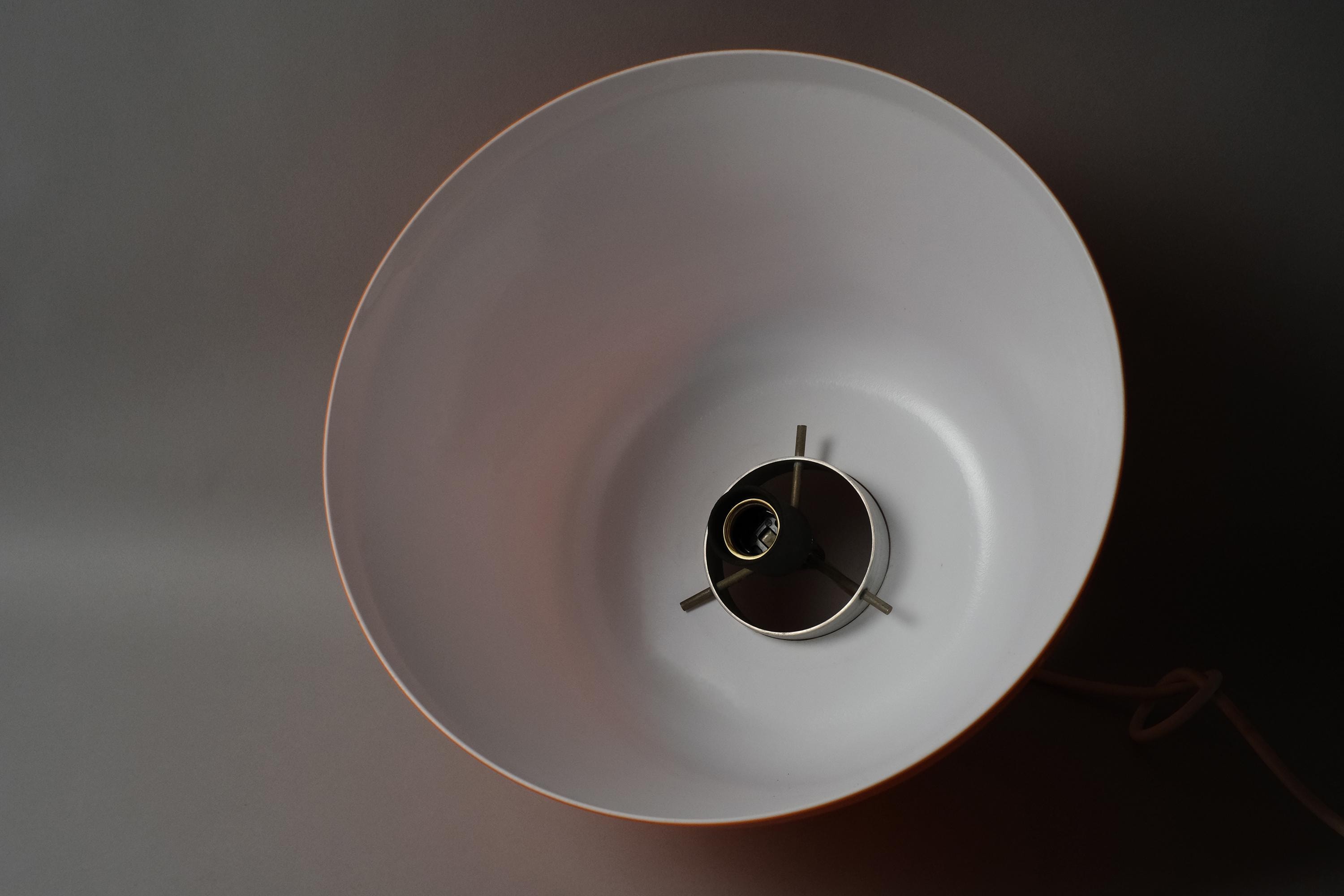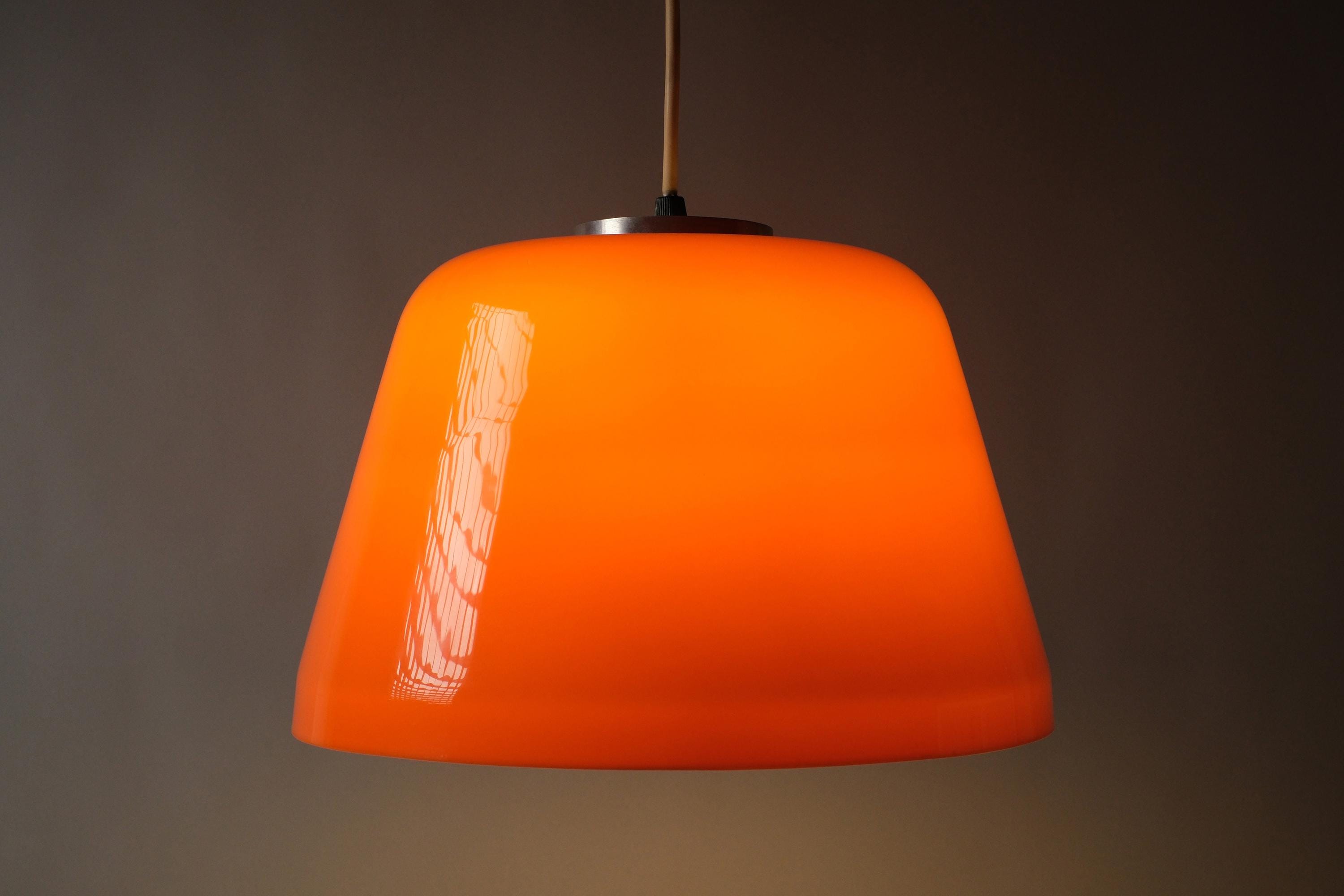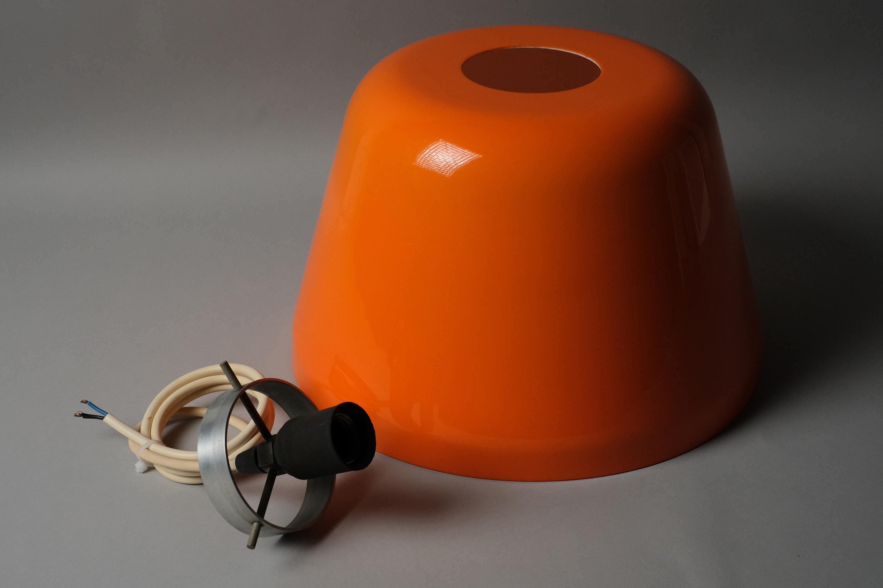 Vintage 1970s space-age design acrylic pendant lamp with a deep orange dome cast in dual-layer acrylic, white bonded to the interior, that pools warm diffused light downward while holding its saturated color from every other angle.