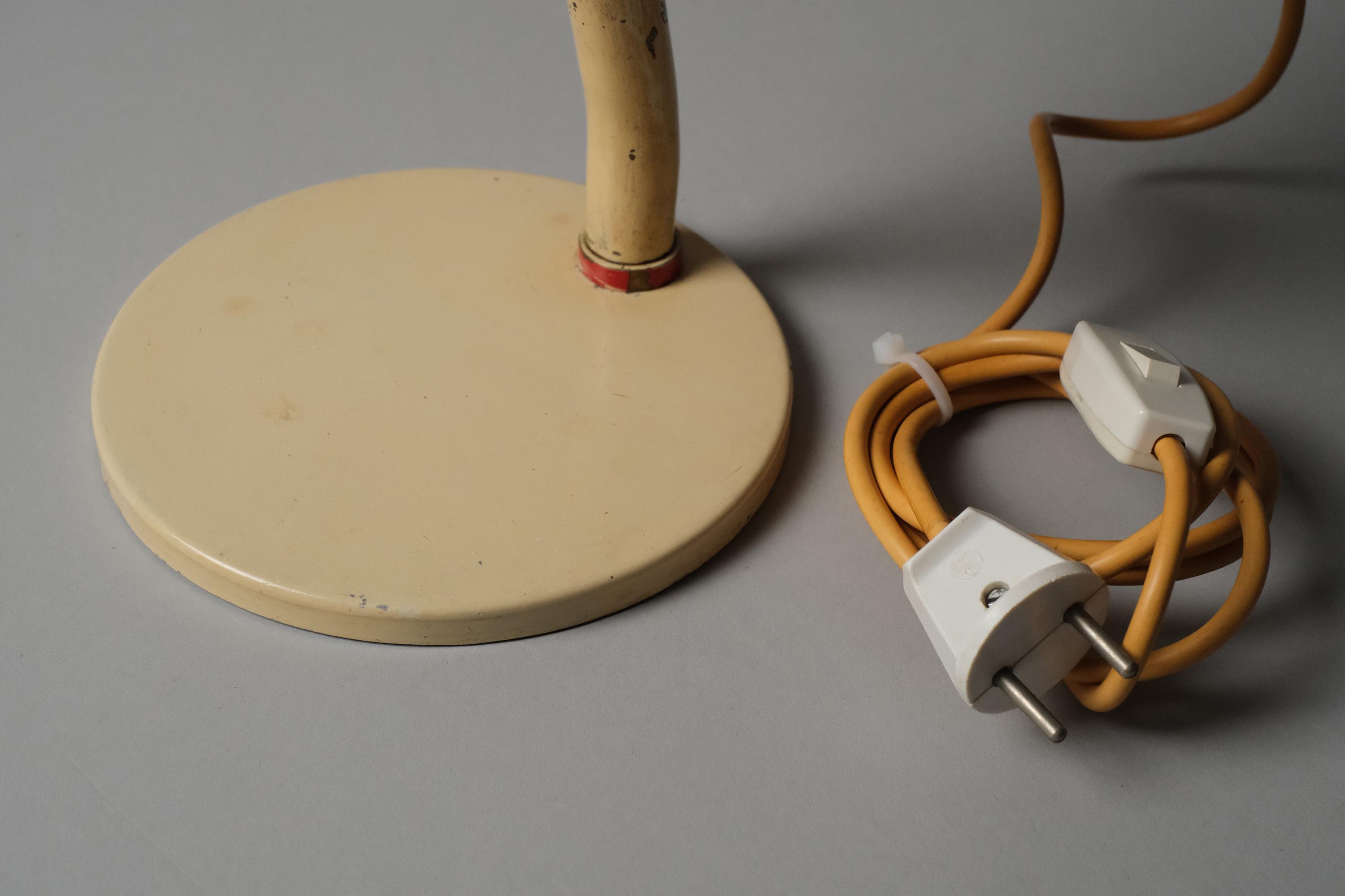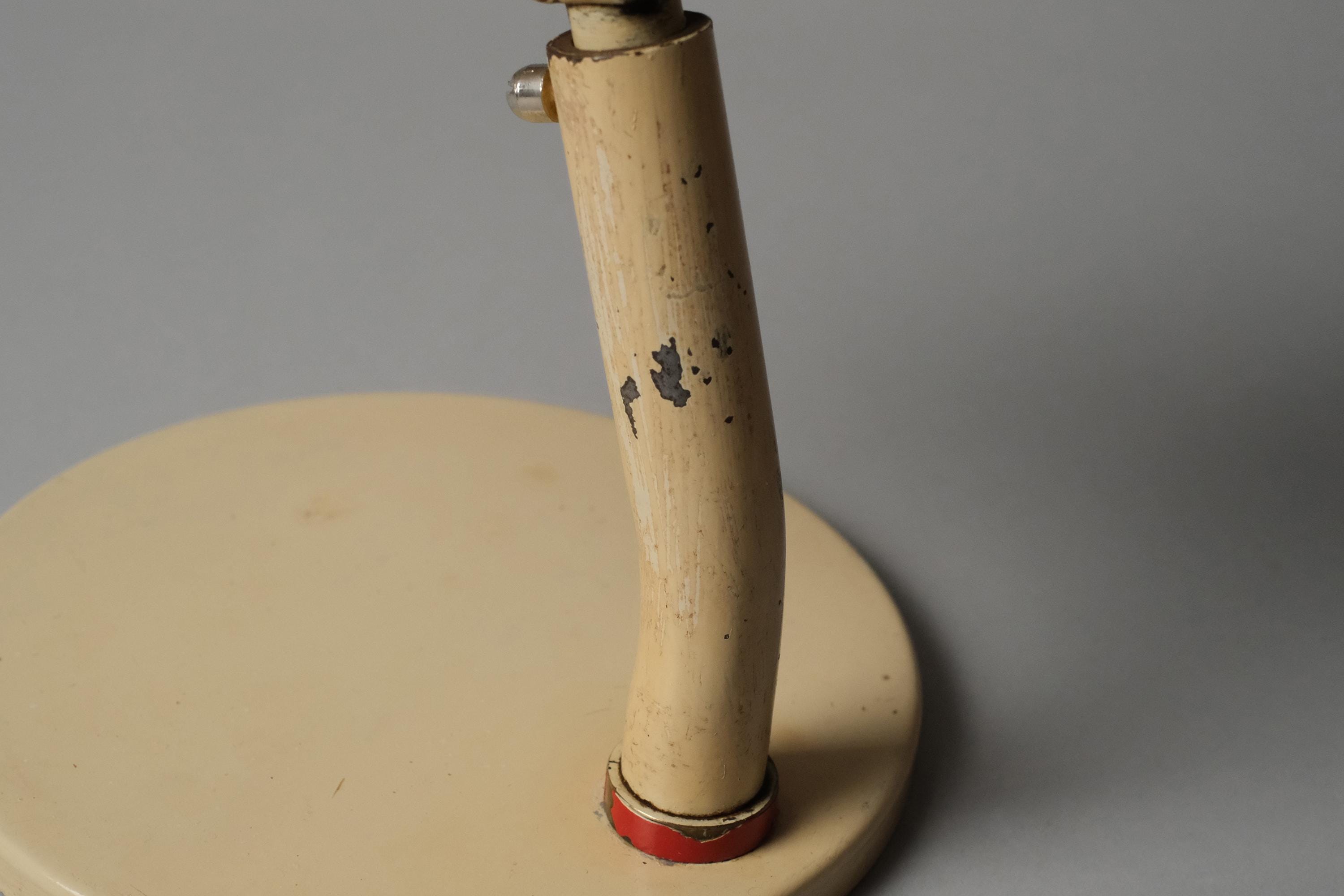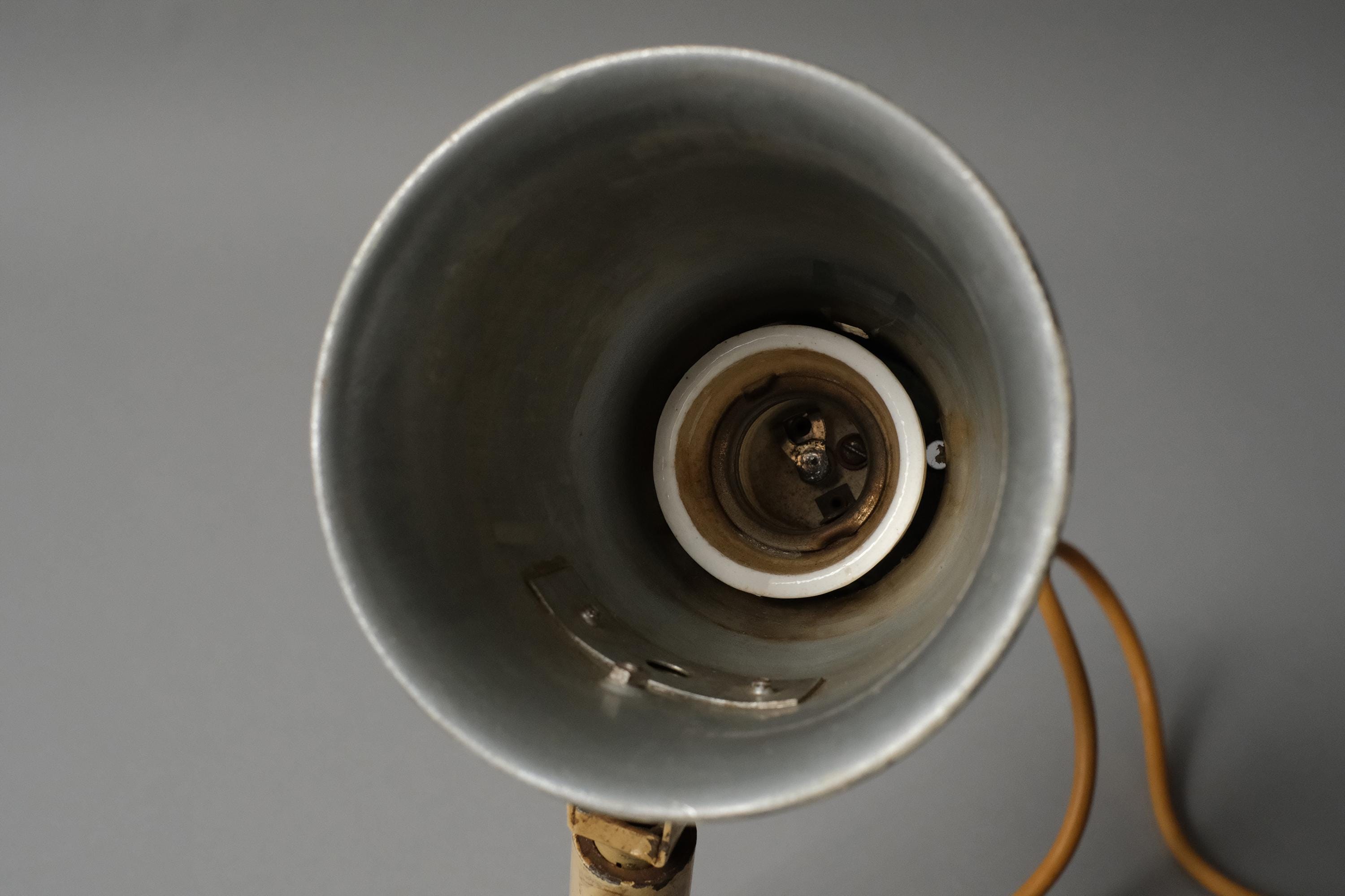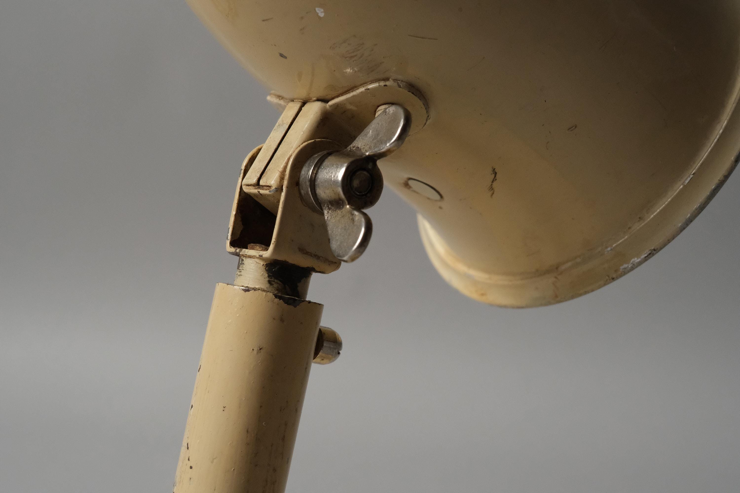 This lamp carries no manufacturer mark, which was standard practice among the German industrial lighting workshops of the Bauhaus period. Its form is consistent with Kandem production from the late 1920s and early 1930s, the pivot joint allowing independent adjustment at both the shade, the cream enamel over steel construction, and the ceramic E27 socket are all characteristic German industrial output of the period.