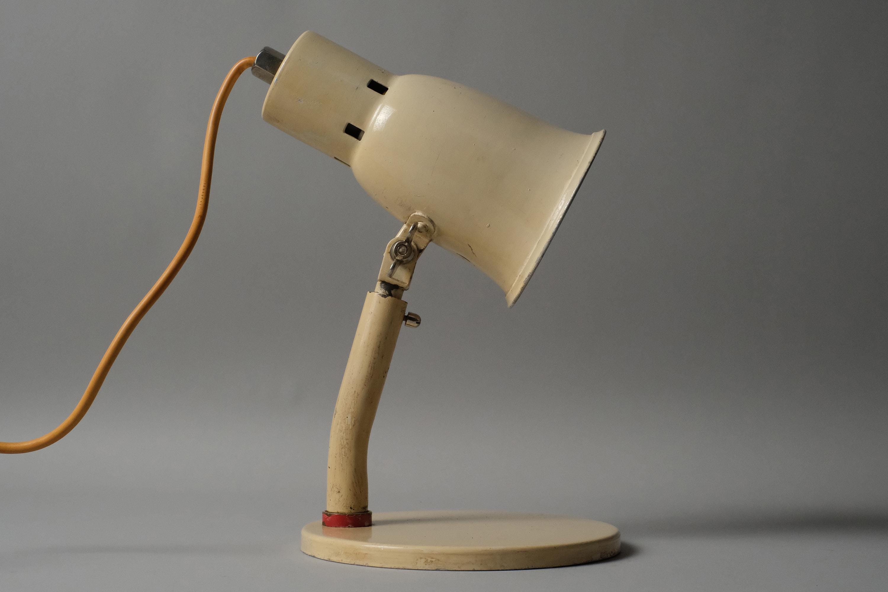Bauhaus industrial articulated desk lamp in cream enamelled steel, ceramic socket, and a cast iron base worn to honest patina through decades of use.