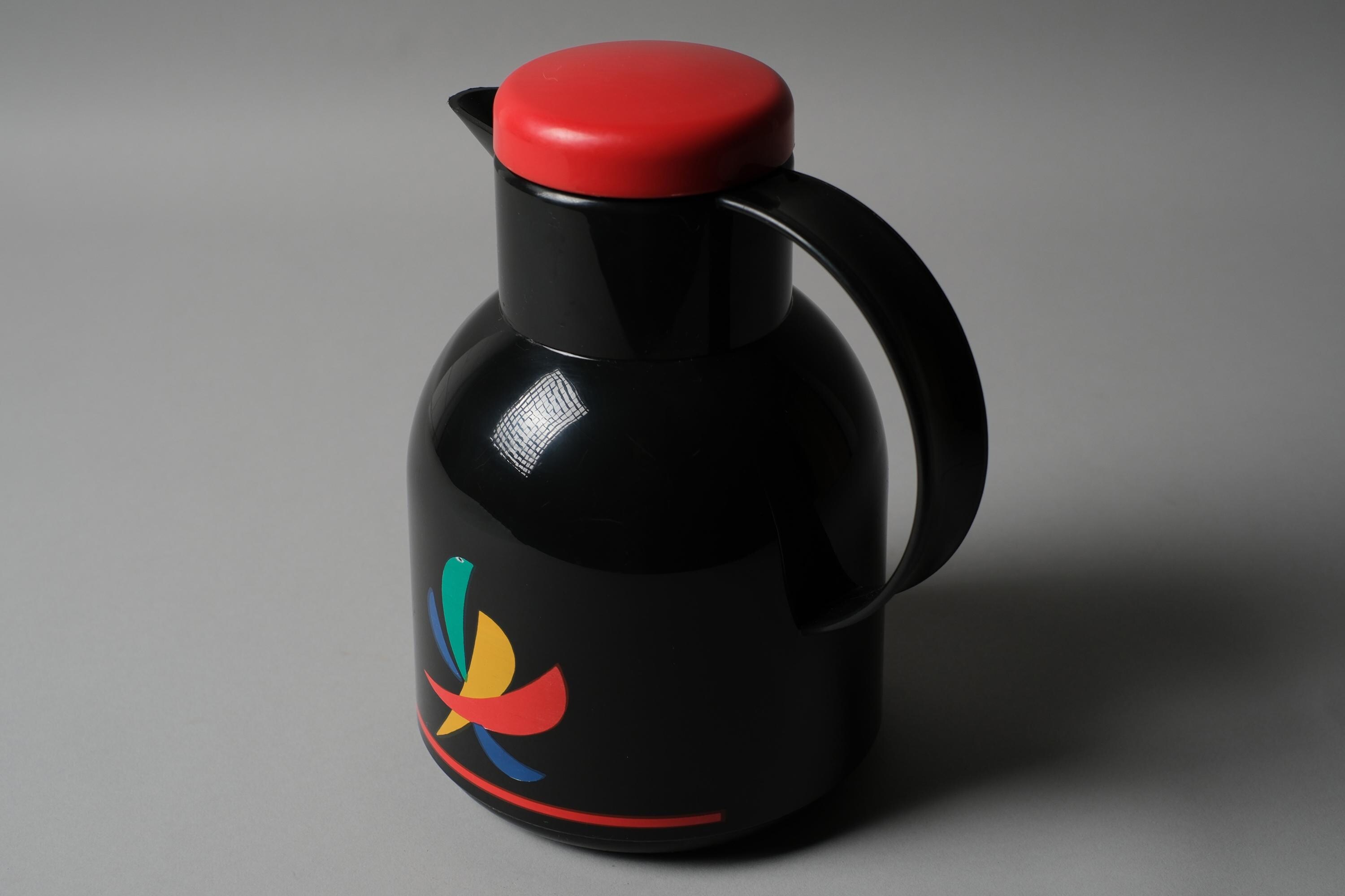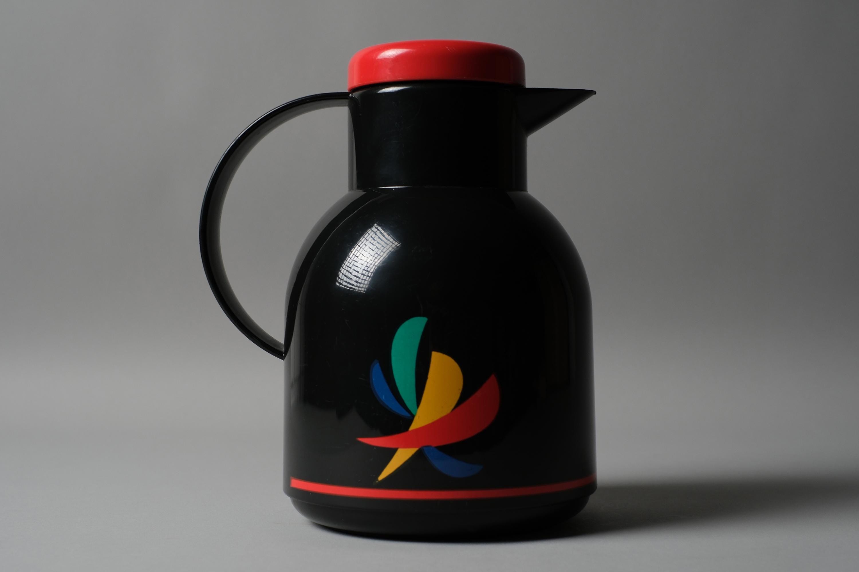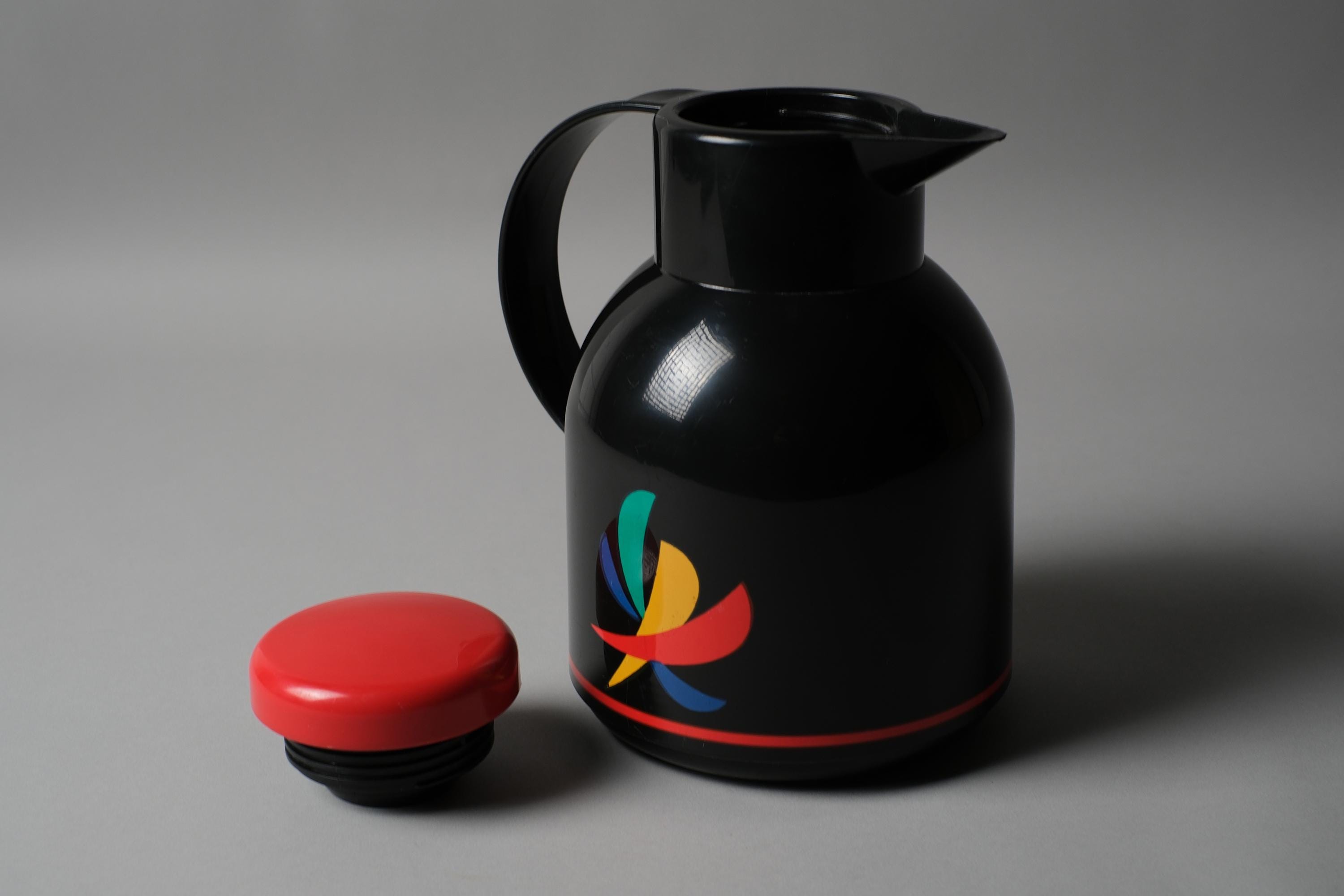 The EMSA Samba is one of the more distinctive vacuum flask designs of its decade in black ABS body and a bold multicolor fan graphic. EMSA produced this model in West Germany during the period when everyday domestic objects were being treated with the same graphic ambition as designed collectibles. The red lid and red accent stripe anchor the palette and make this piece read as intentional, not incidental.