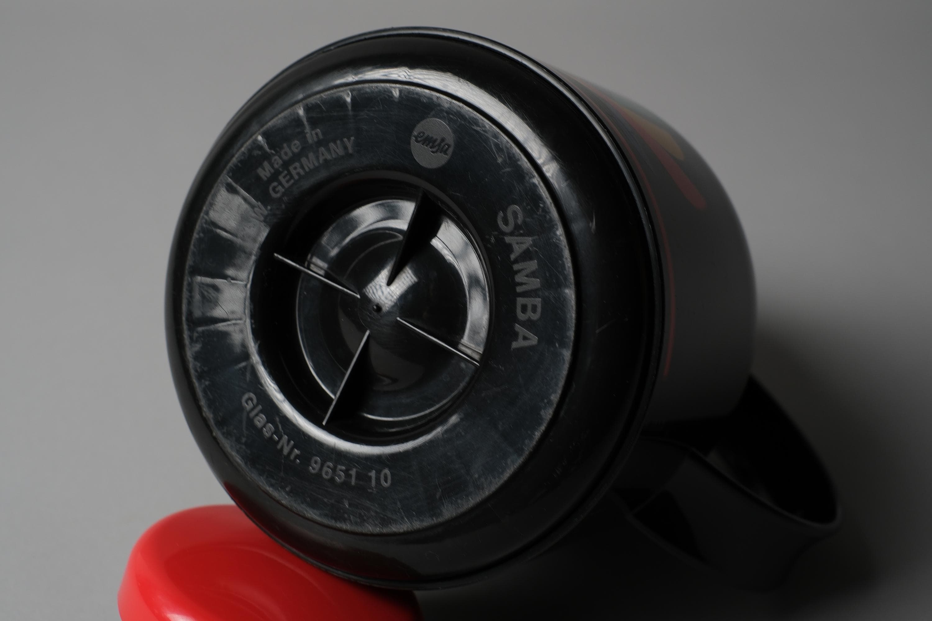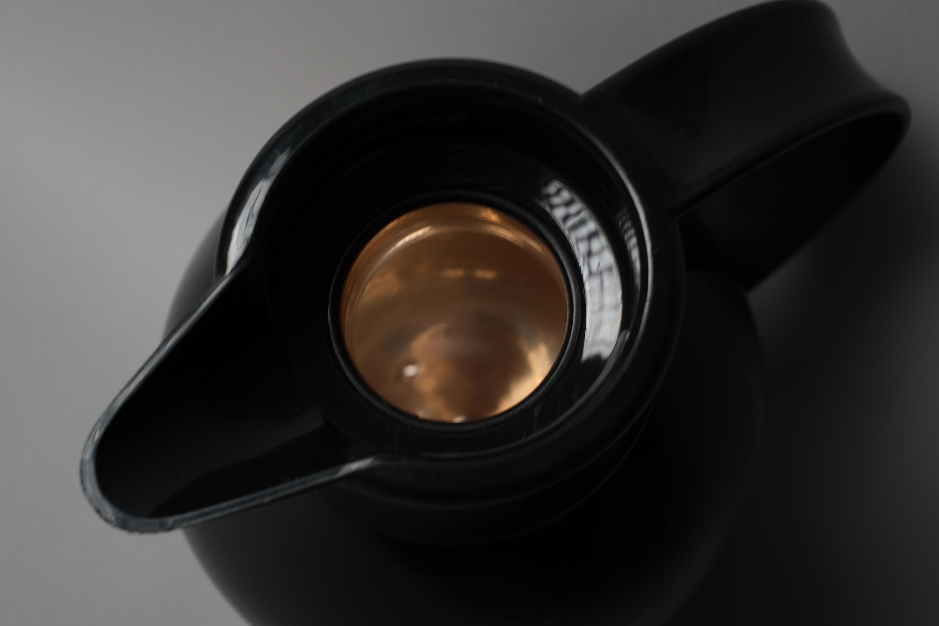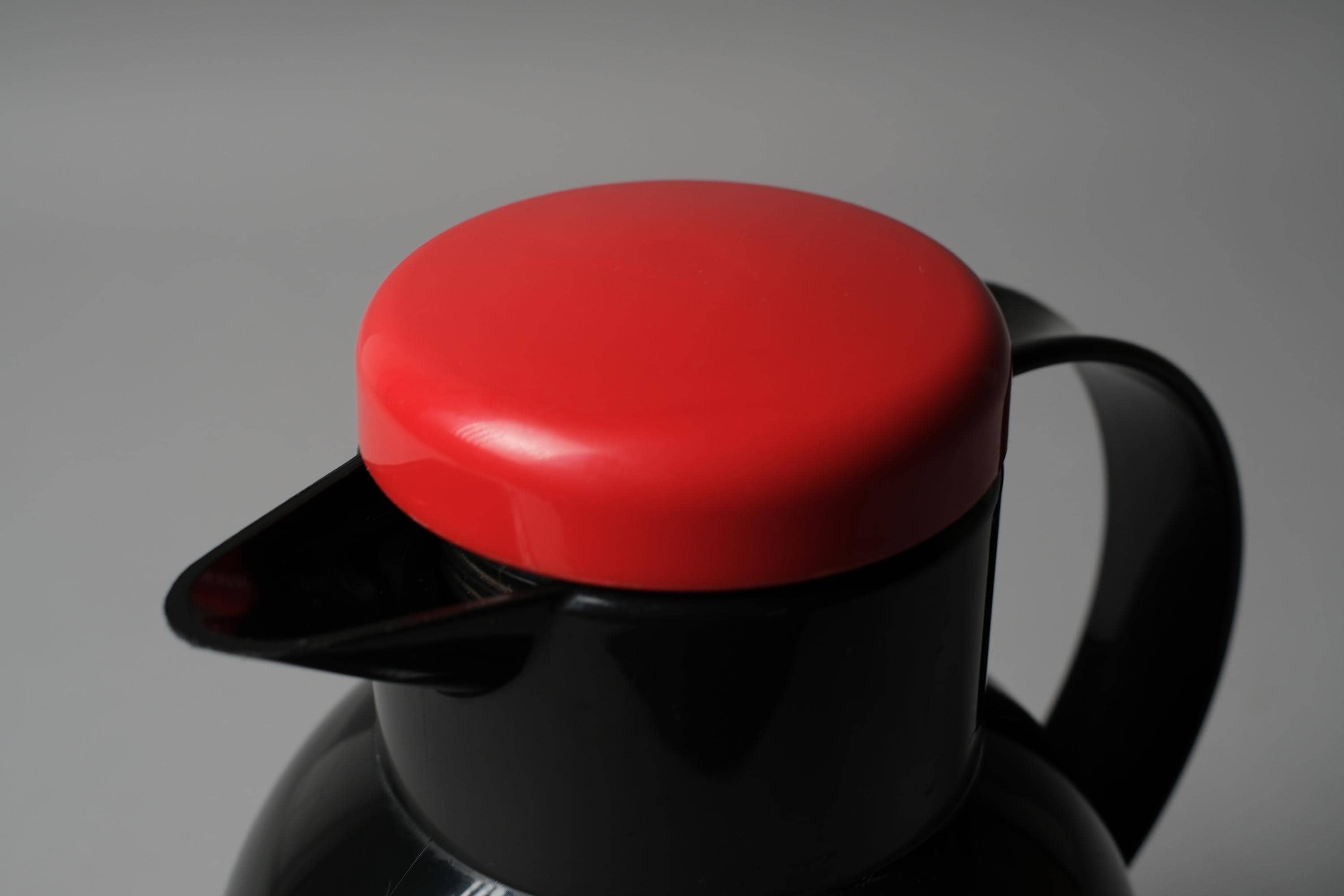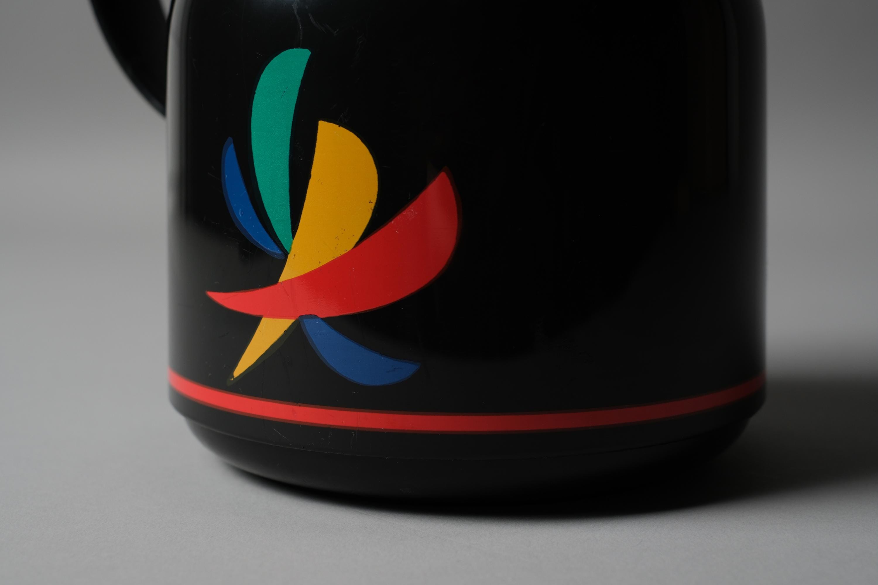 The EMSA Samba is one of the more distinctive vacuum flask designs of its decade in black ABS body and a bold multicolor fan graphic. EMSA produced this model in West Germany during the period when everyday domestic objects were being treated with the same graphic ambition as designed collectibles. The red lid and red accent stripe anchor the palette and make this piece read as intentional, not incidental.