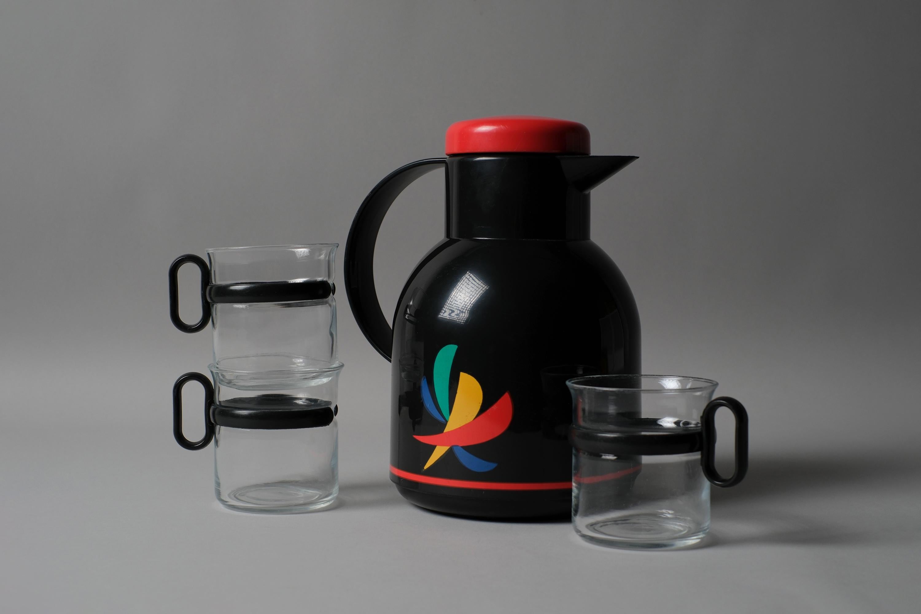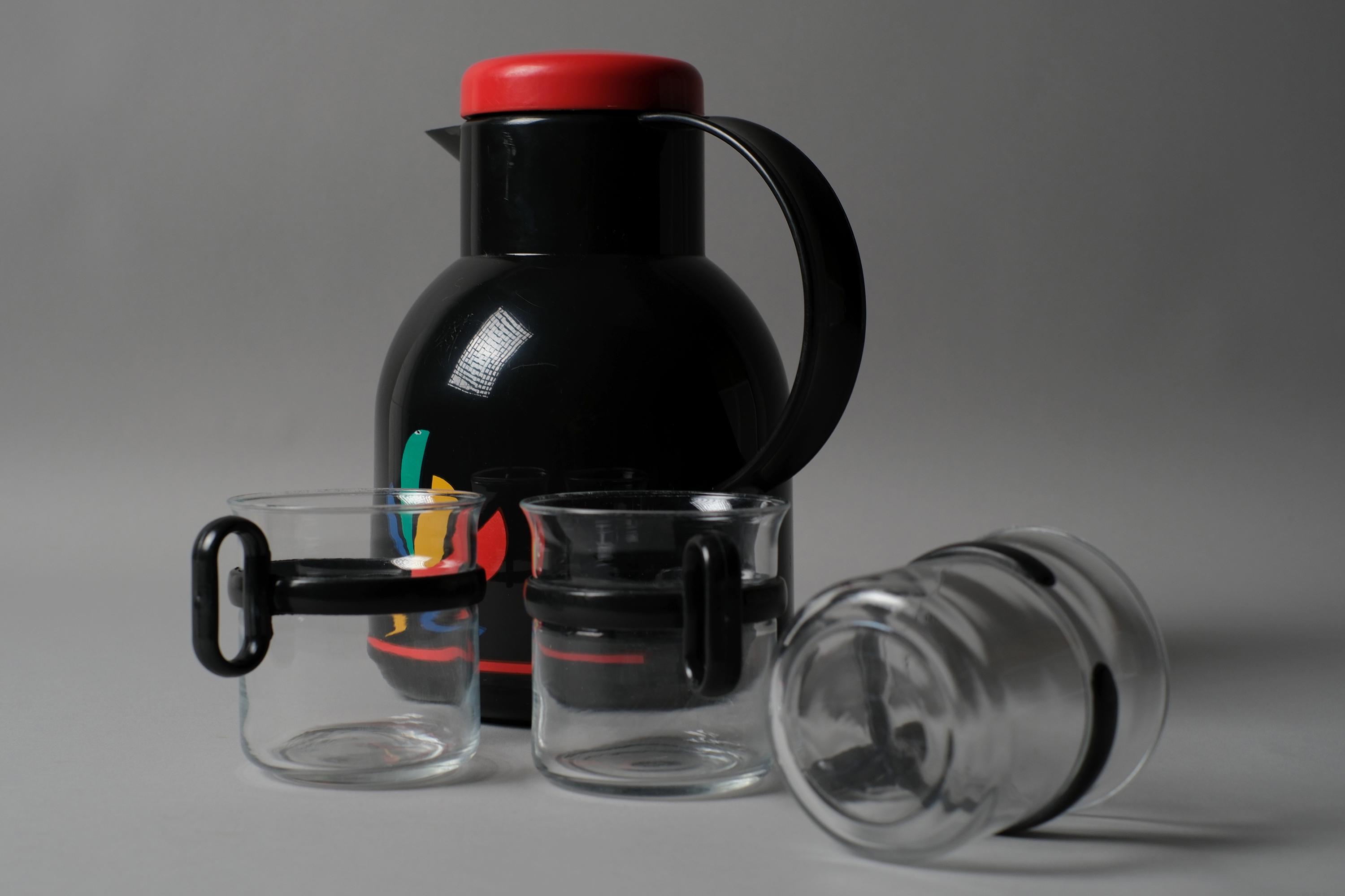 Vintage EMSA Samba vacuum flask bundled with three Randwyck Holland glass mugs which form a functionally complete and visually coherent set from the graphic postmodern design moment of the 1980s.