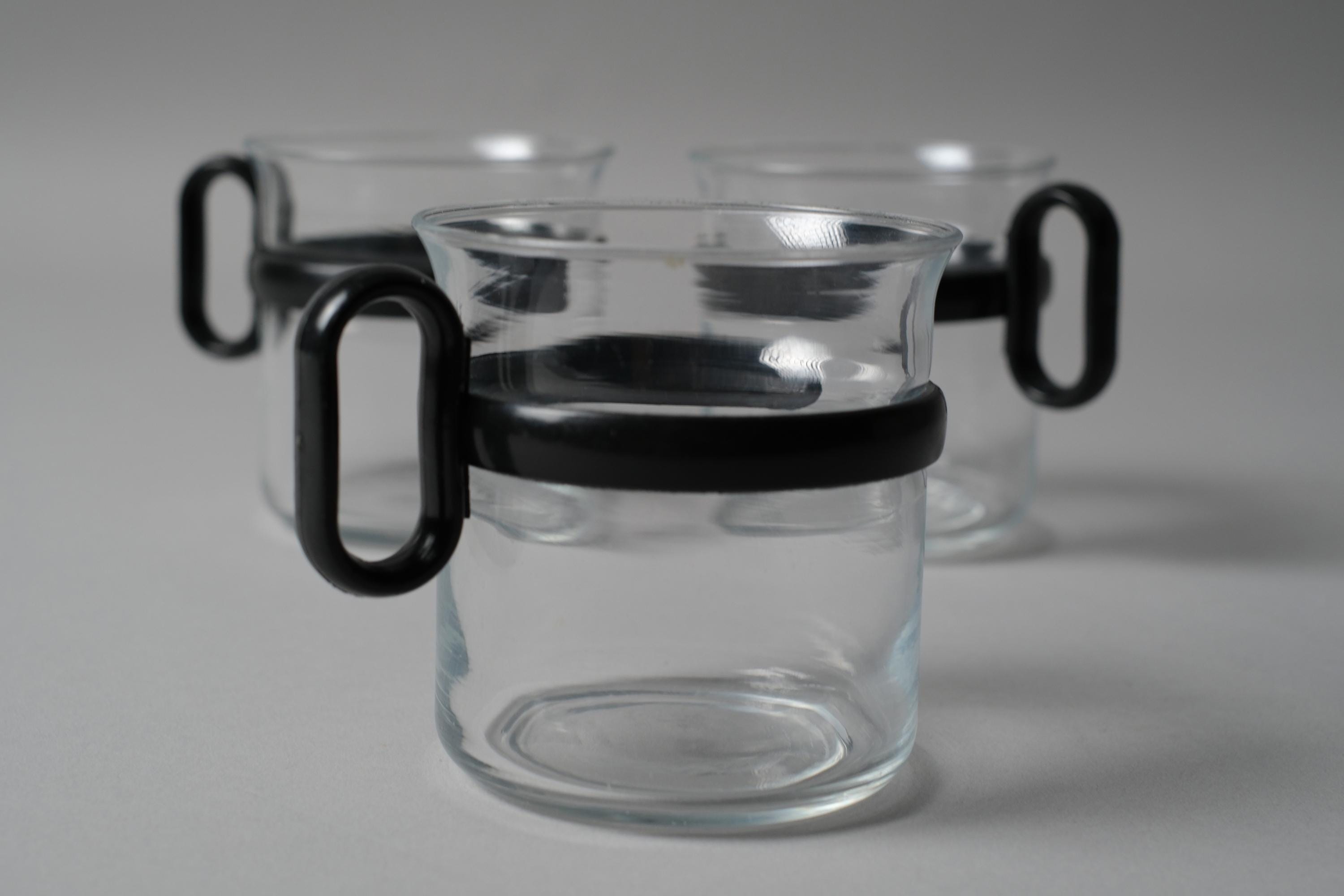 The three Randwyck Holland glass mugs complete the set with characteristic Dutch restraint. Clear borosilicate glass with black ABS handles and bases, the transparency providing a deliberate visual counterpoint to the opaque flask.