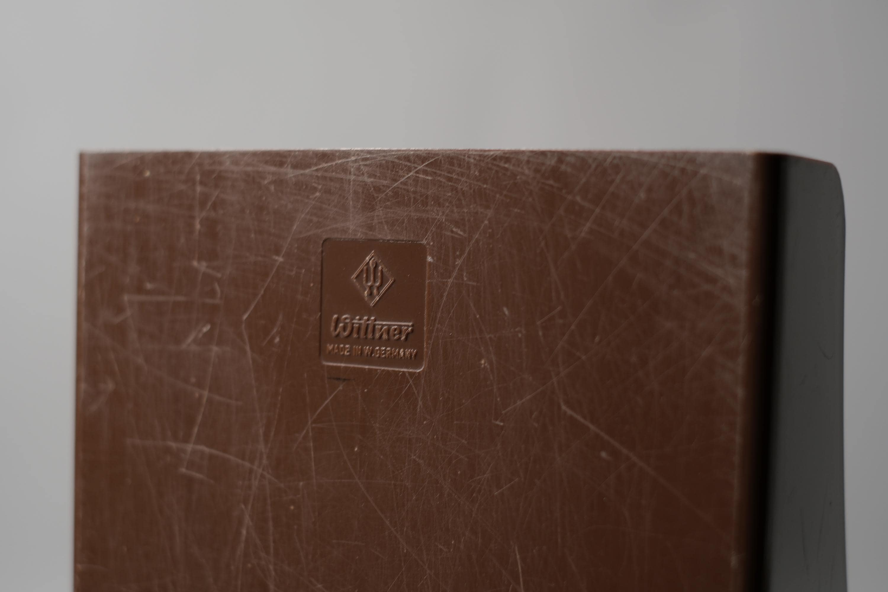 The rack is stamped on the base with the Wittner mark. Brown ABS plastic in good vintage condition with minor surface scratches and scuffs consistent with age and use, no chips or cracks.
