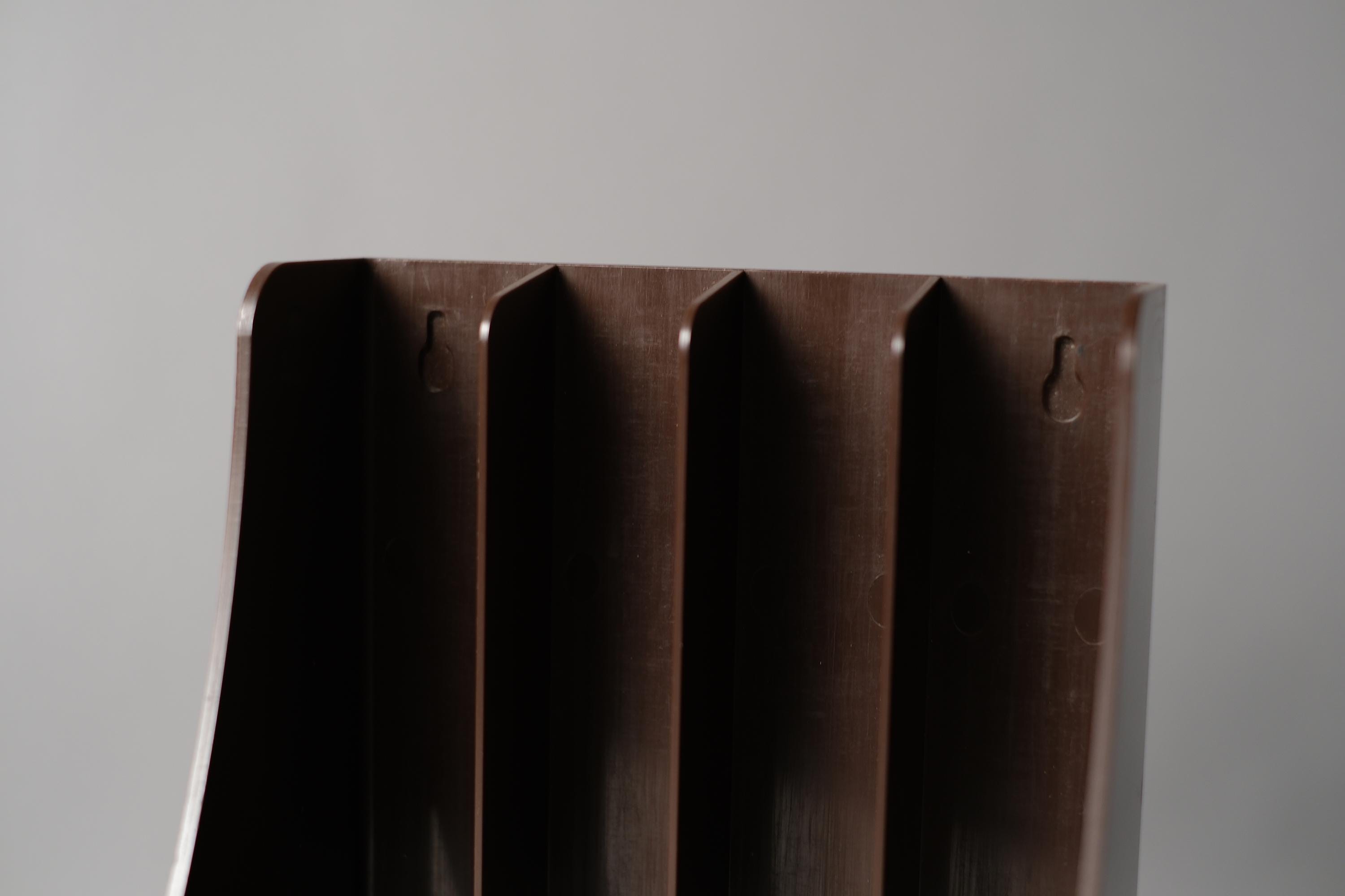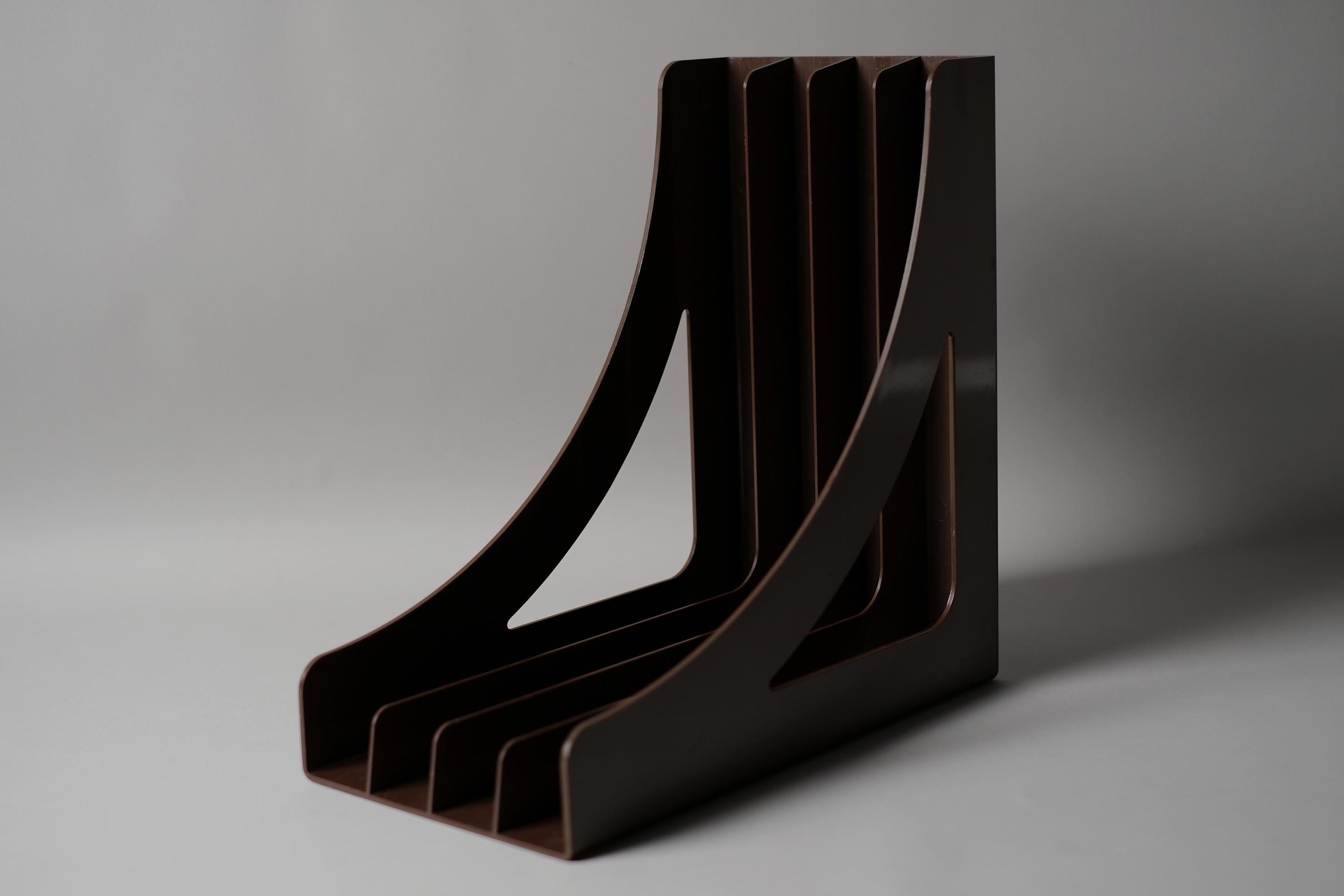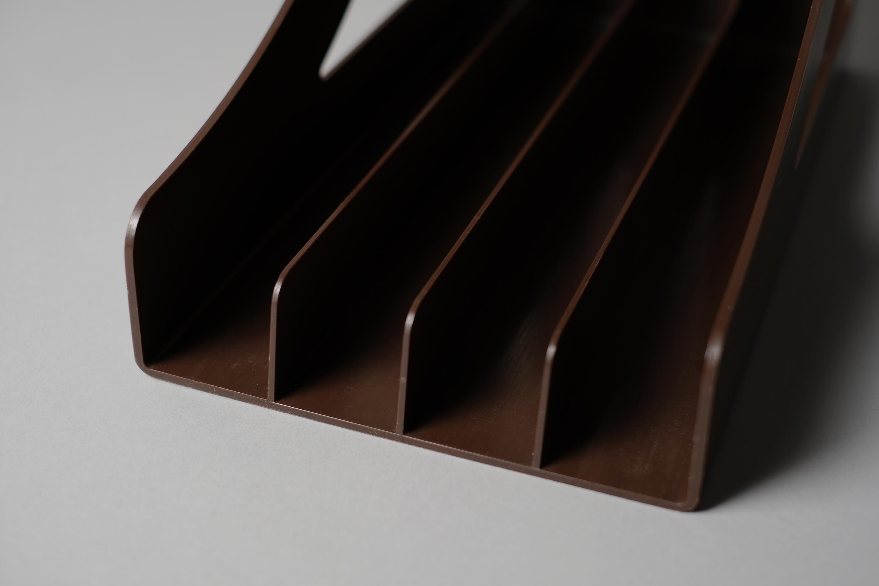 Vintage Wittner LP record rack, West Germany 1970s, in brown ABS plastic, six-slot vertical dividers, the curved bracket profile giving this functional object an unmistakably sculptural presence on a shelf or desk. Can also be wall mounted.