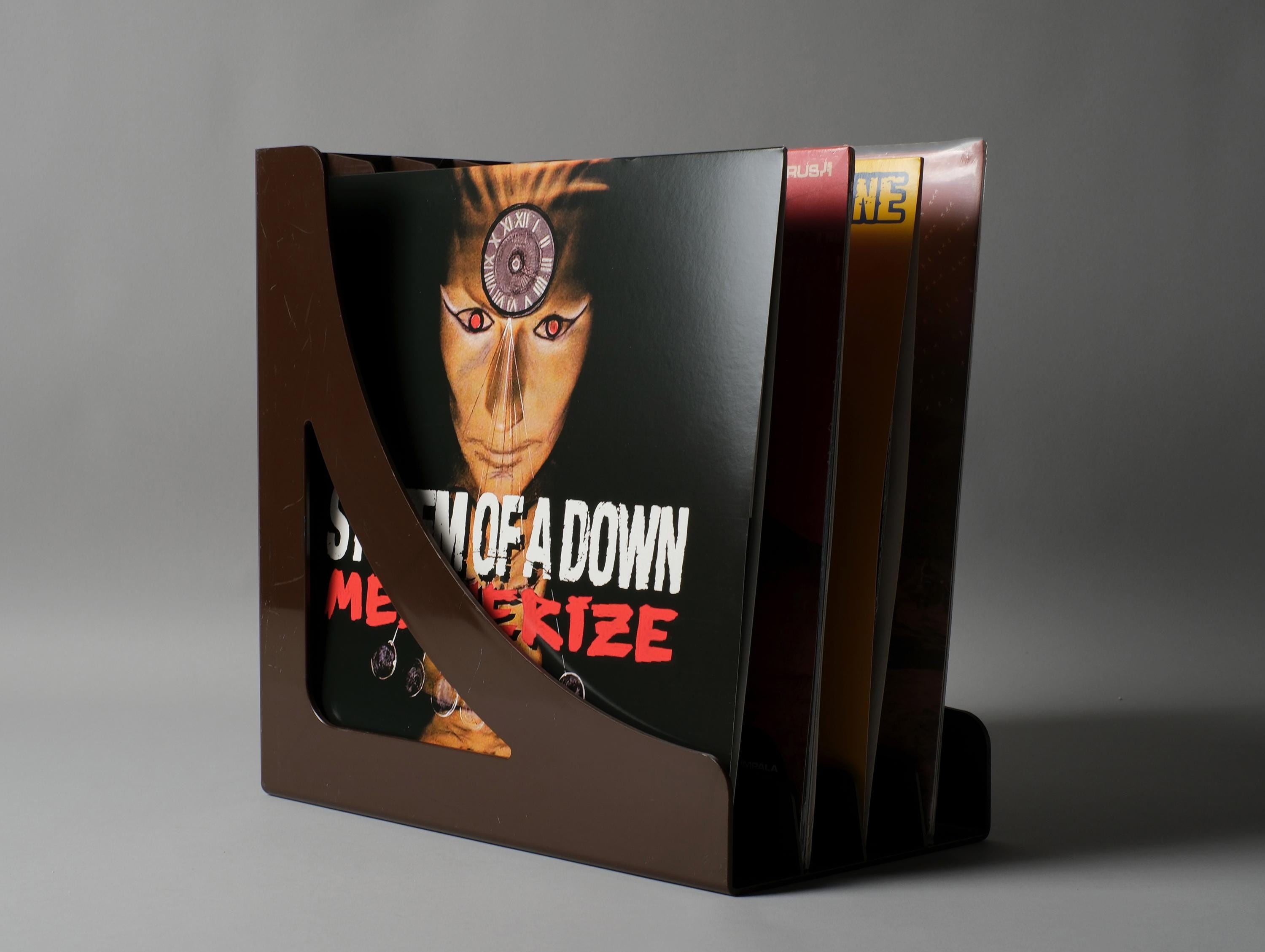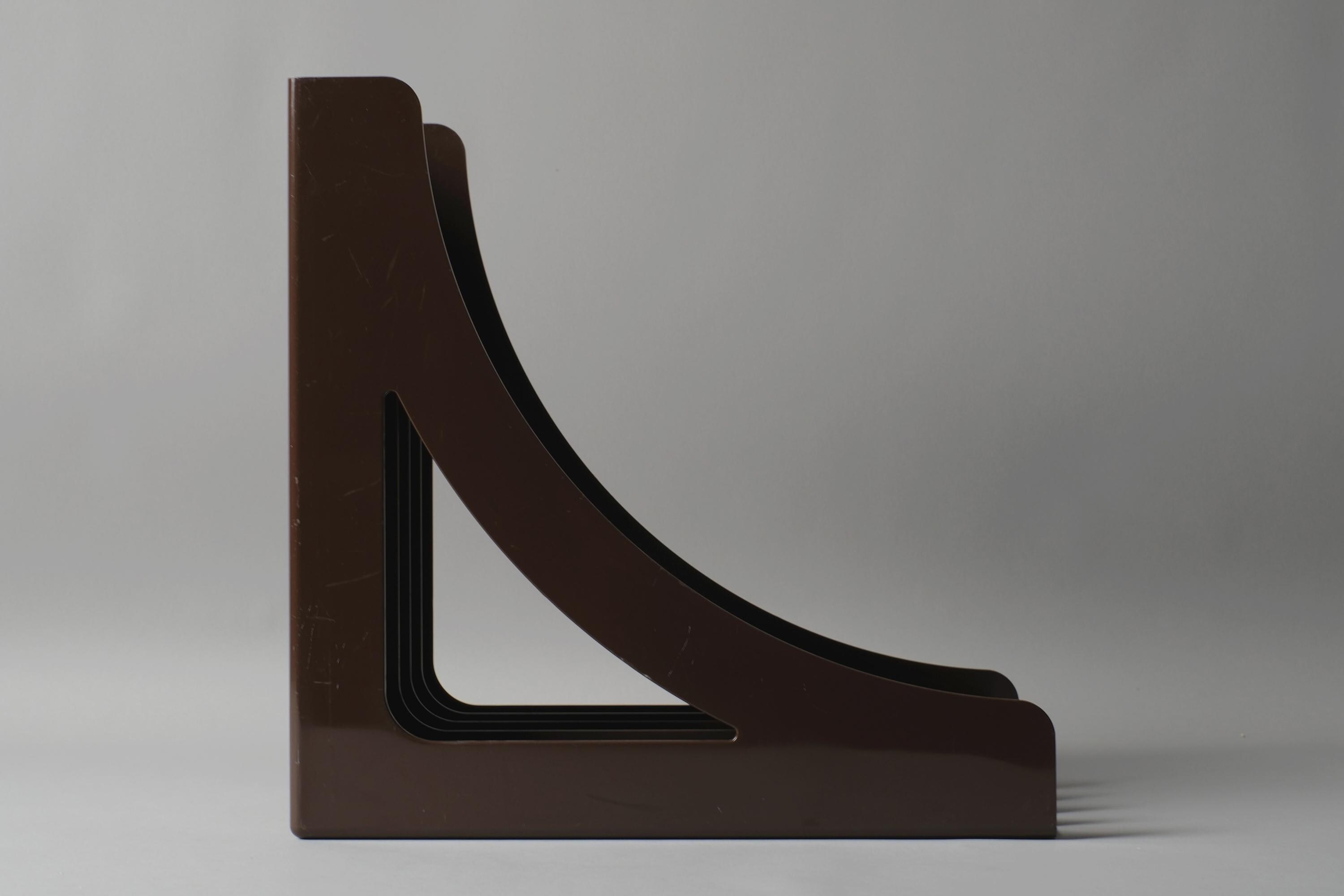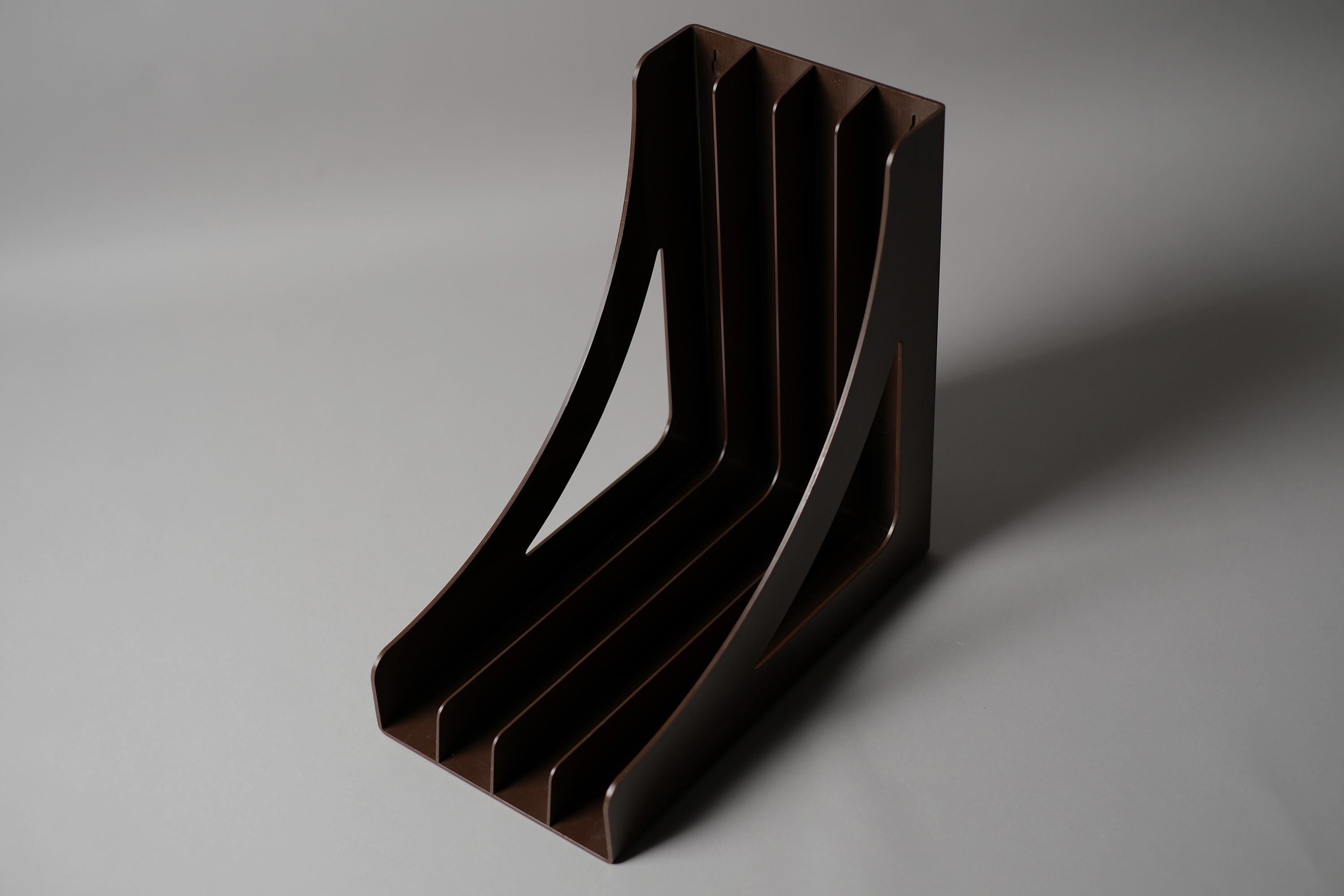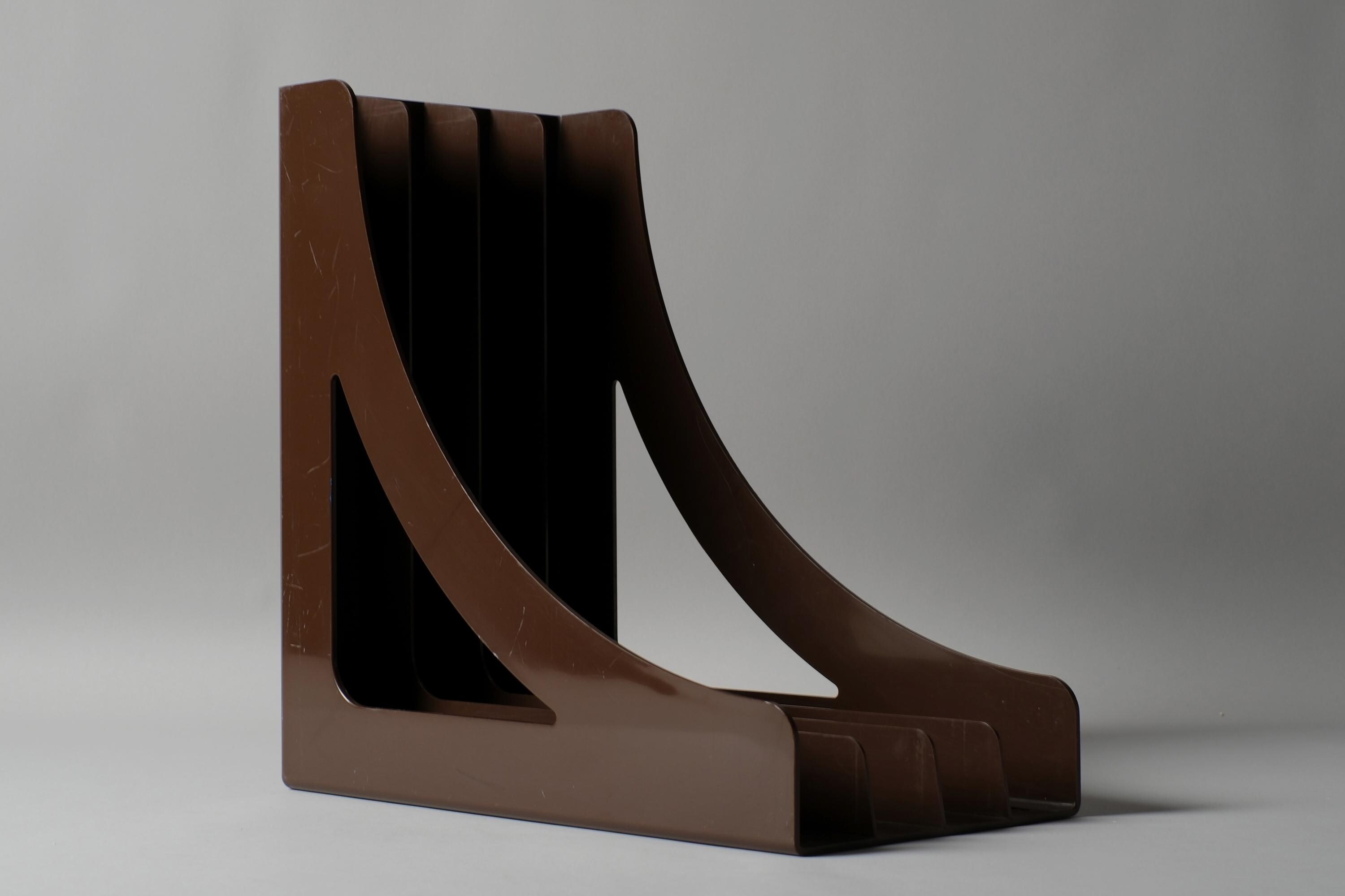 Vintage Wittner LP record rack, West Germany 1970s, in brown ABS plastic, six-slot vertical dividers, the curved bracket profile giving this functional object an unmistakably sculptural presence on a shelf or desk. Can also be wall mounted.