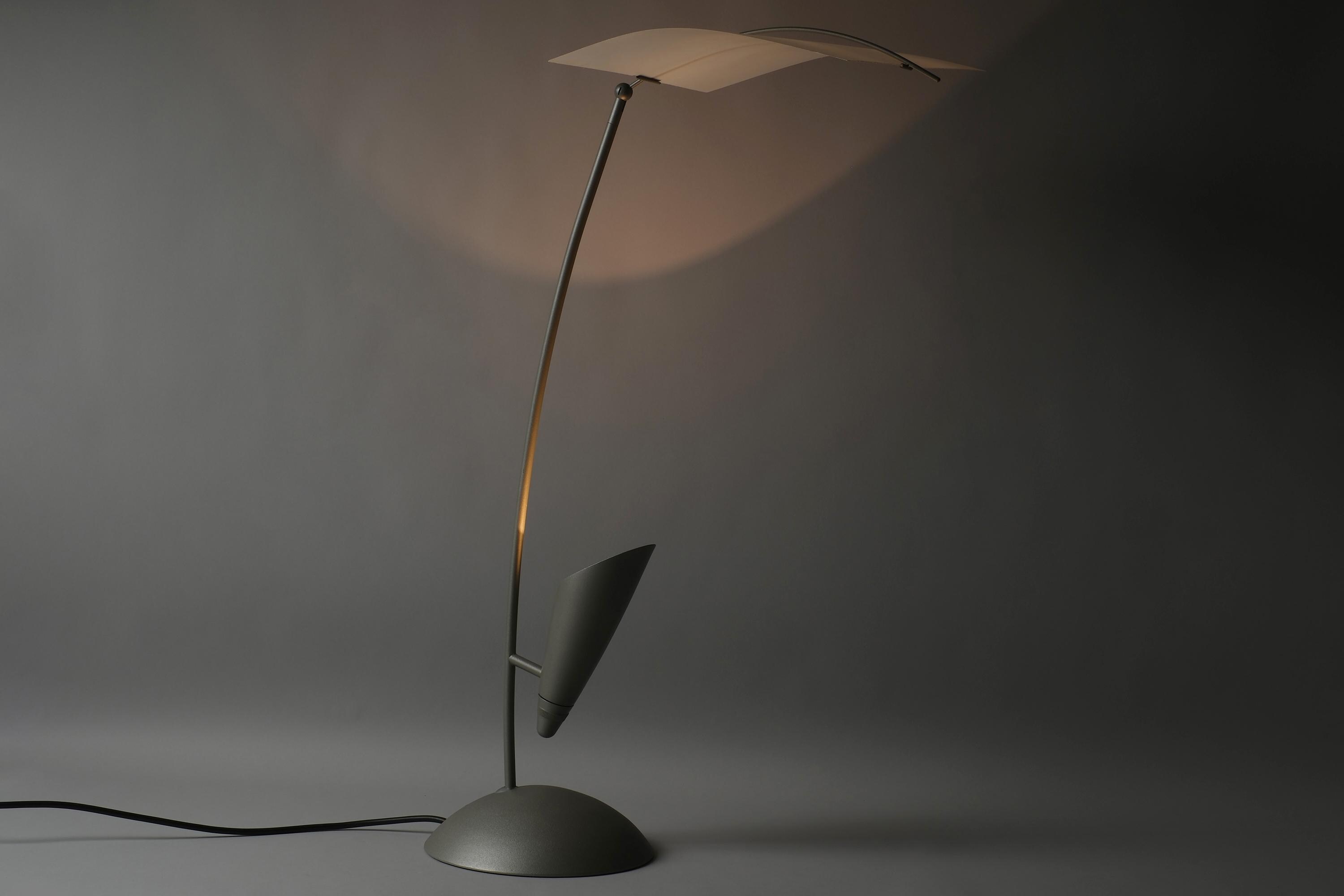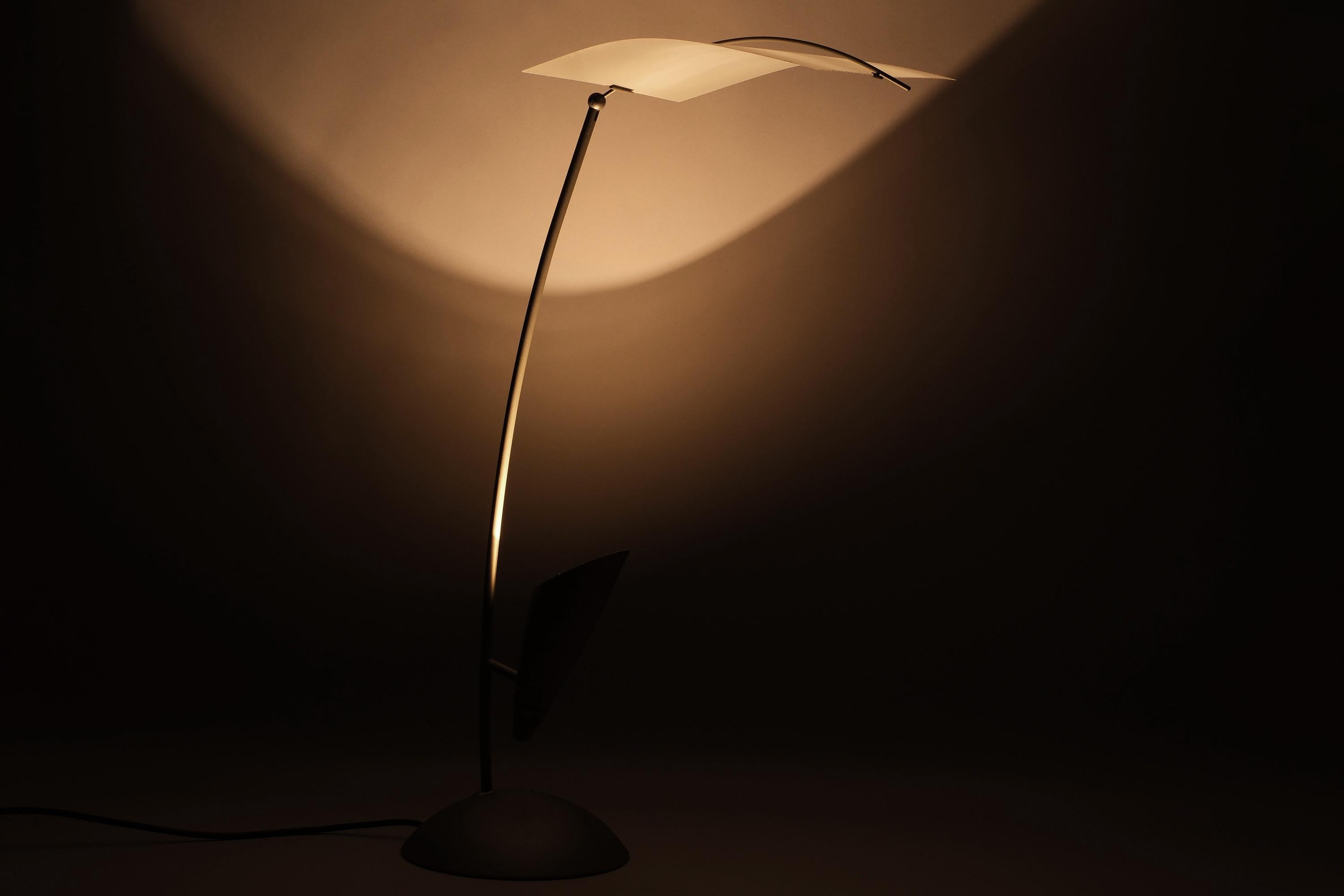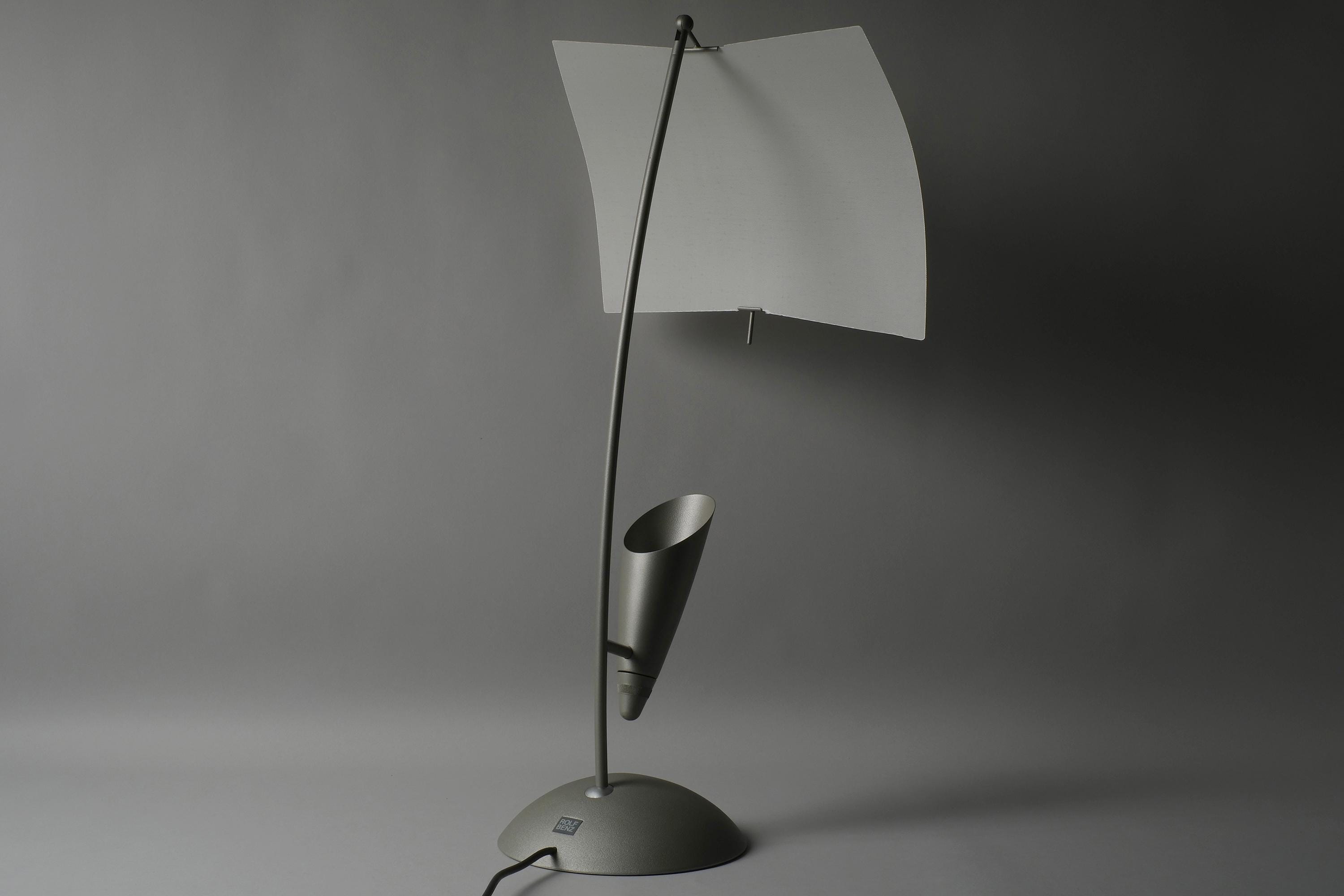 The Rolf Benz Nuvola table lamp is a sculptural design masterpiece, a translucent curved leaf diffuser suspended above an arched stem, the halogen source concealed within the fin housing below, projecting light upward into the diffuser and outward into the room.