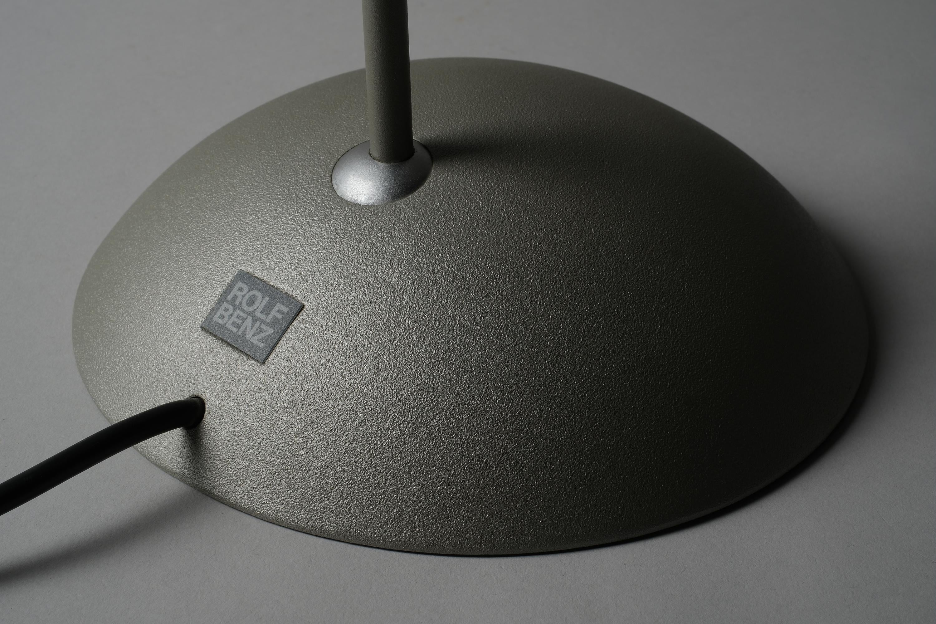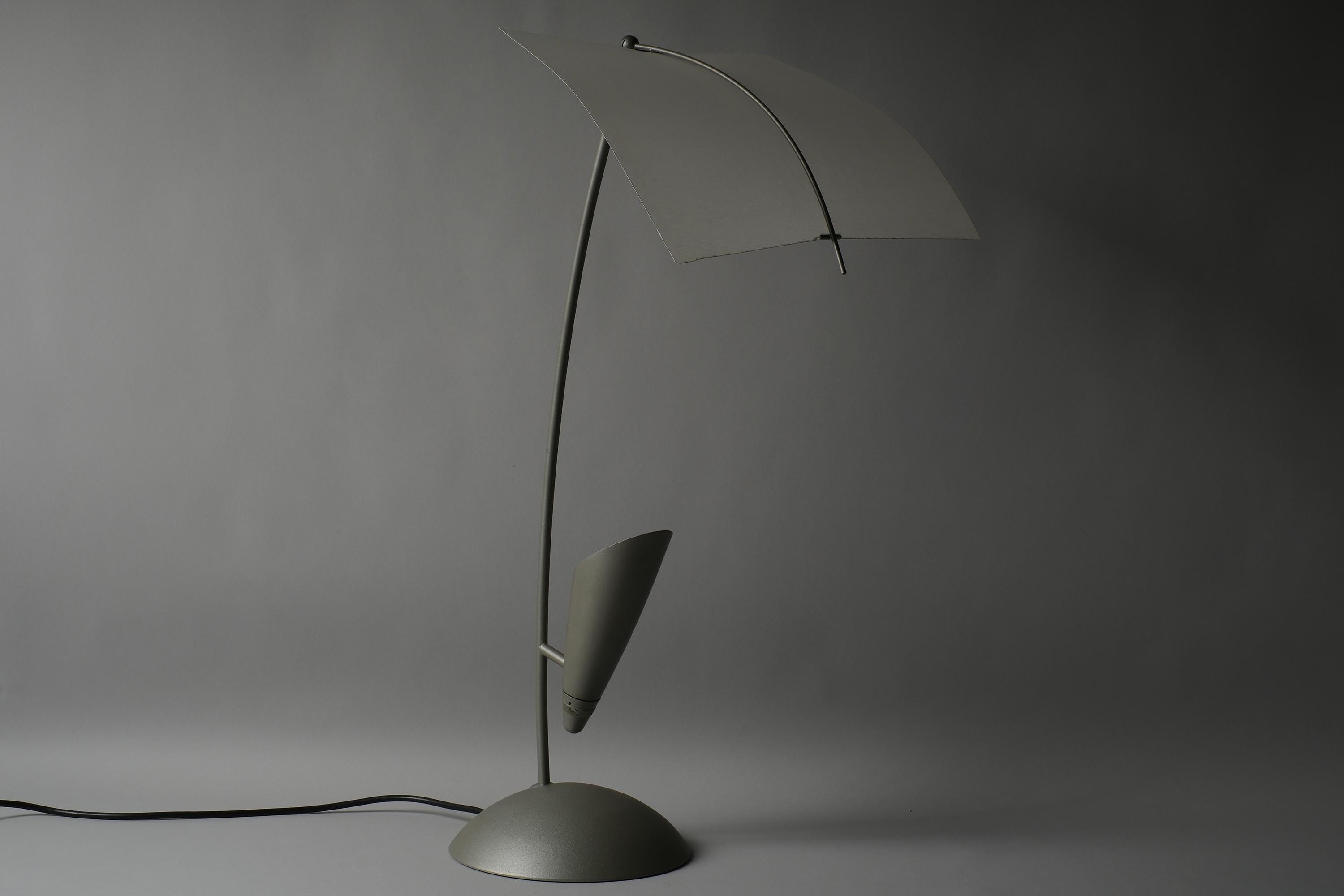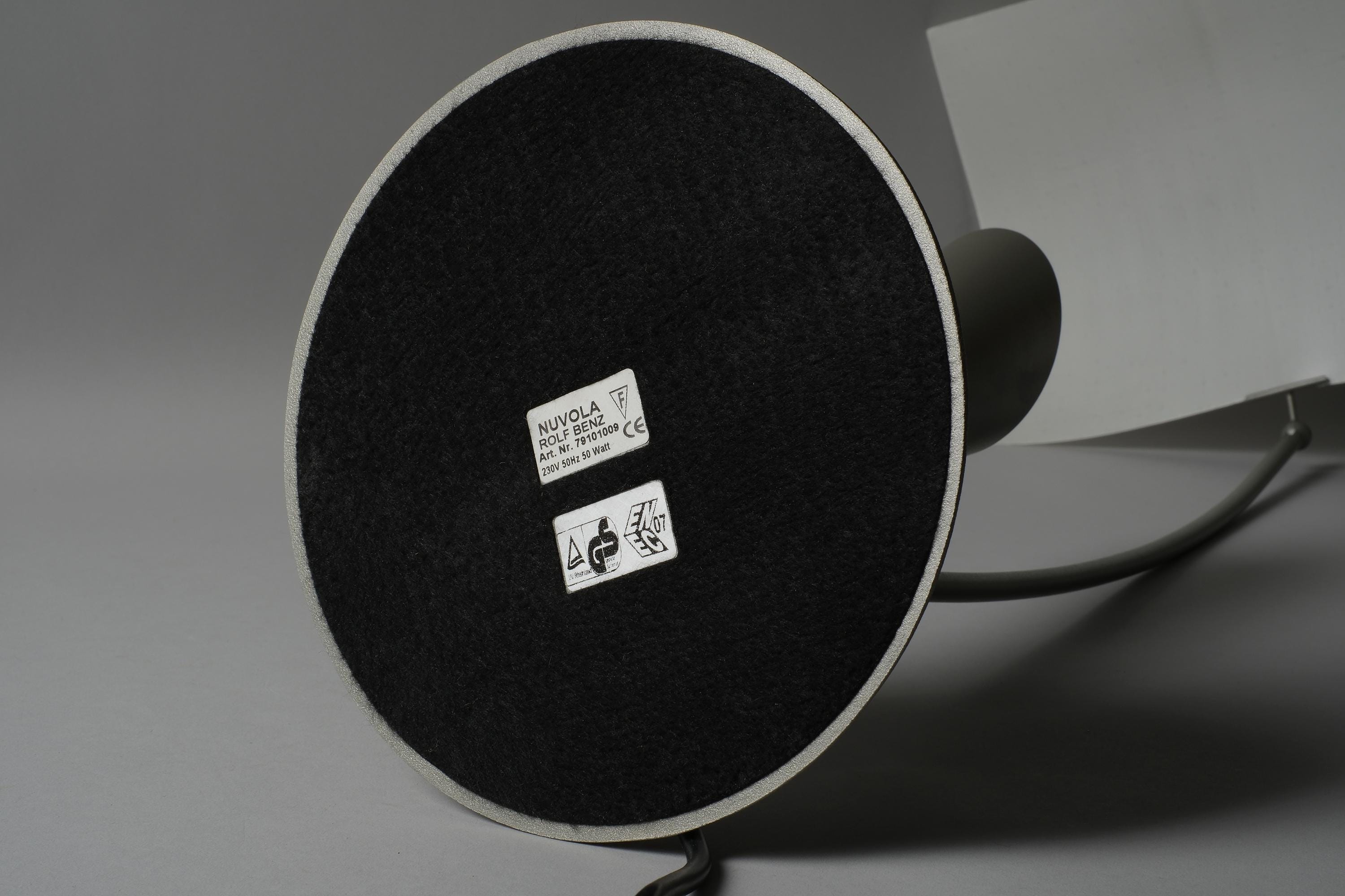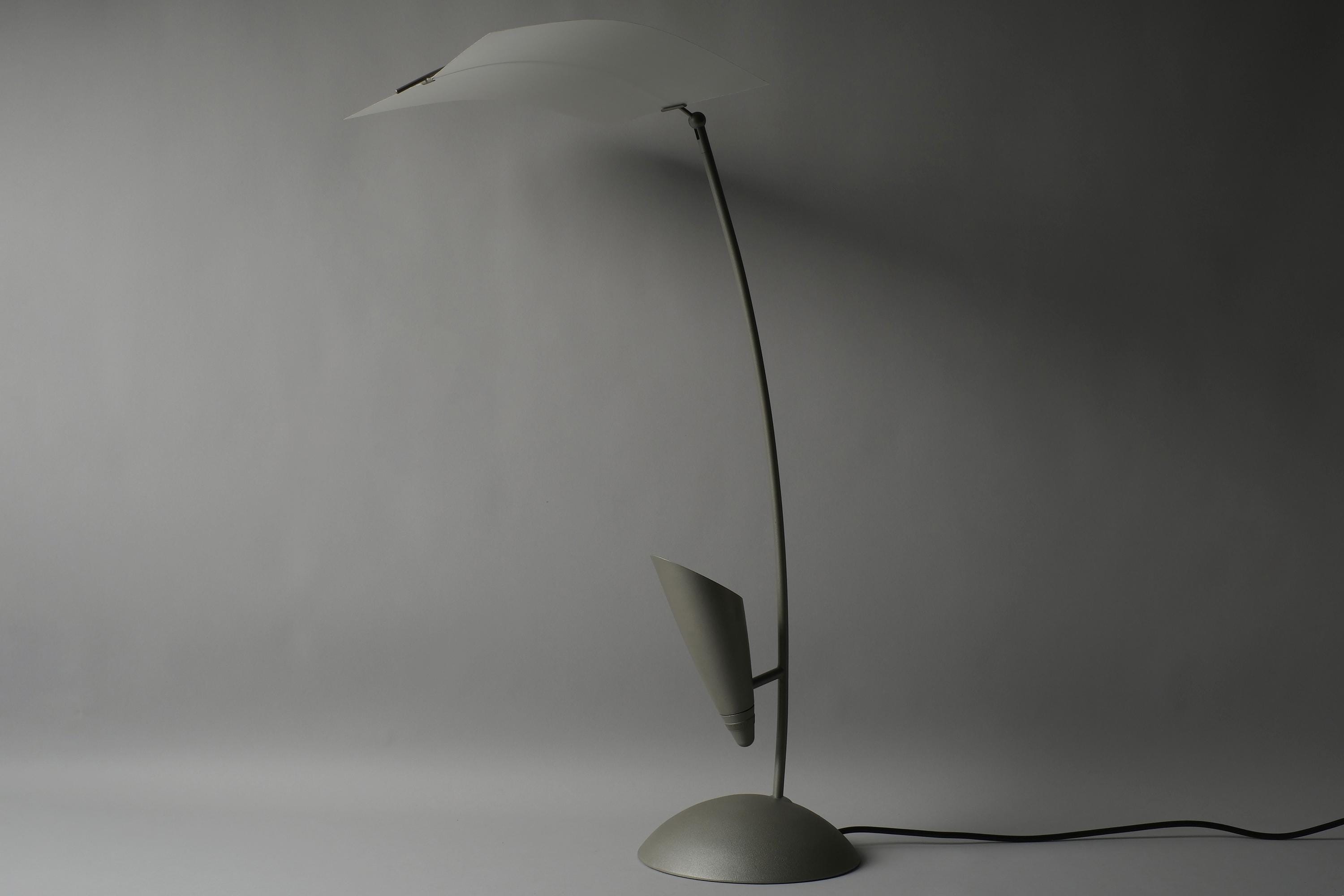 The Rolf Benz Nuvola table lamp is a sculptural design masterpiece, a translucent curved leaf diffuser suspended above an arched stem, the halogen source concealed within the fin housing below, projecting light upward into the diffuser and outward into the room.
