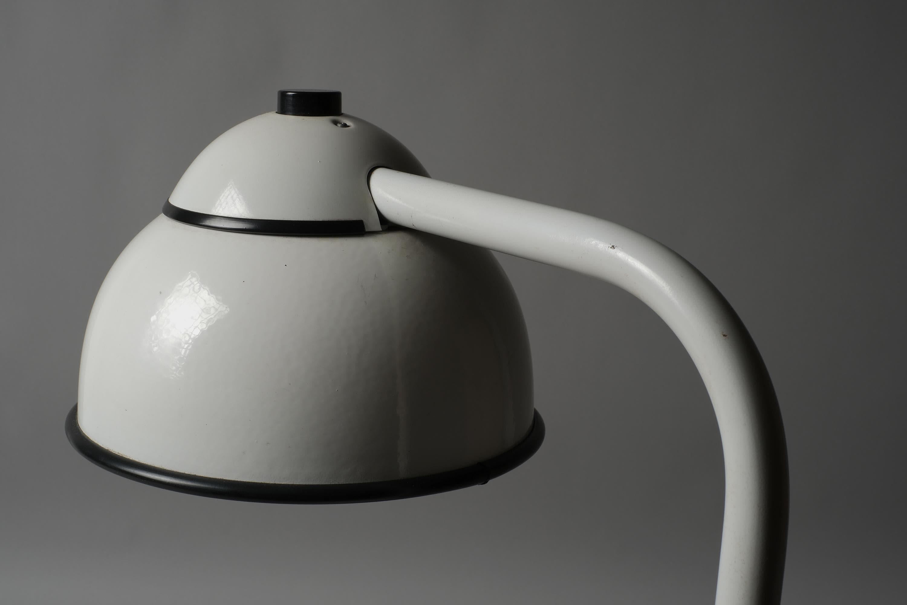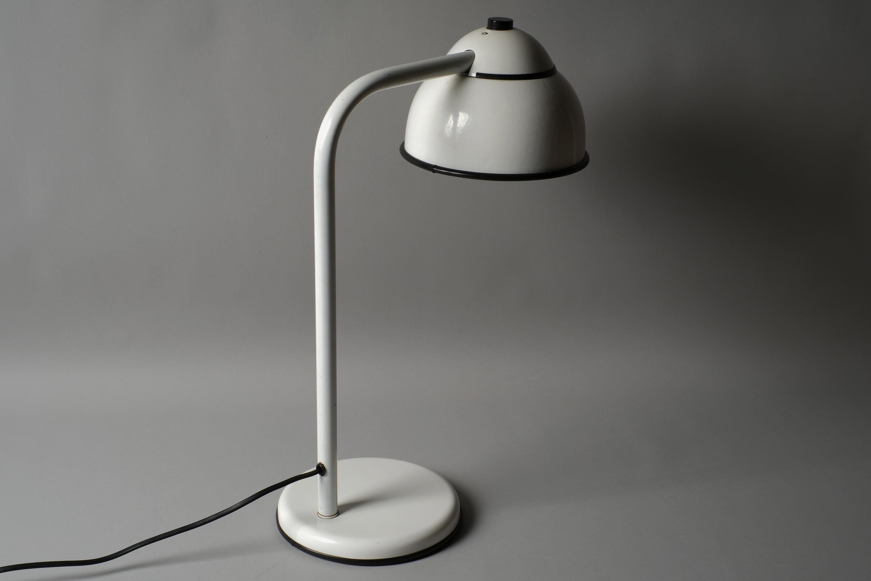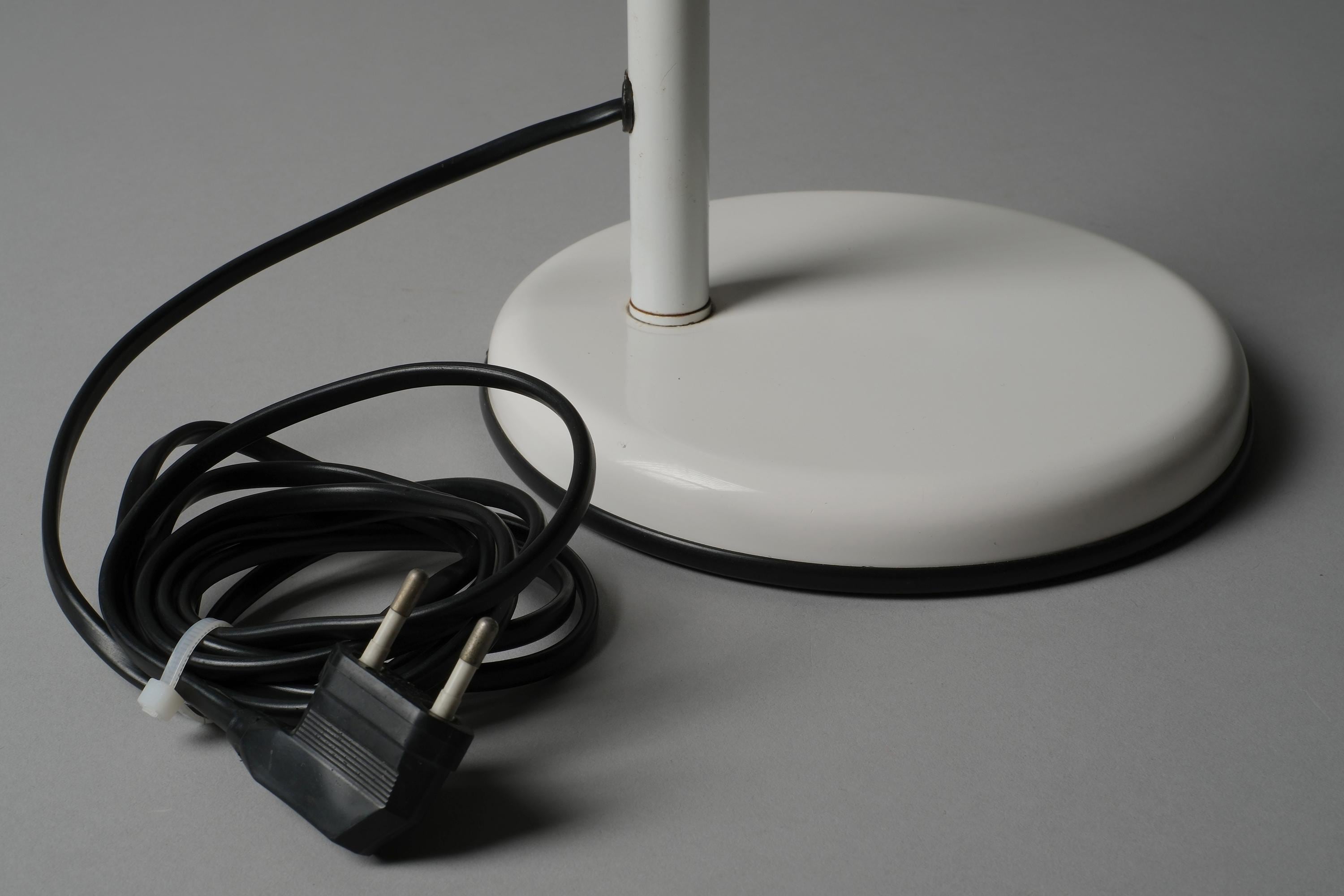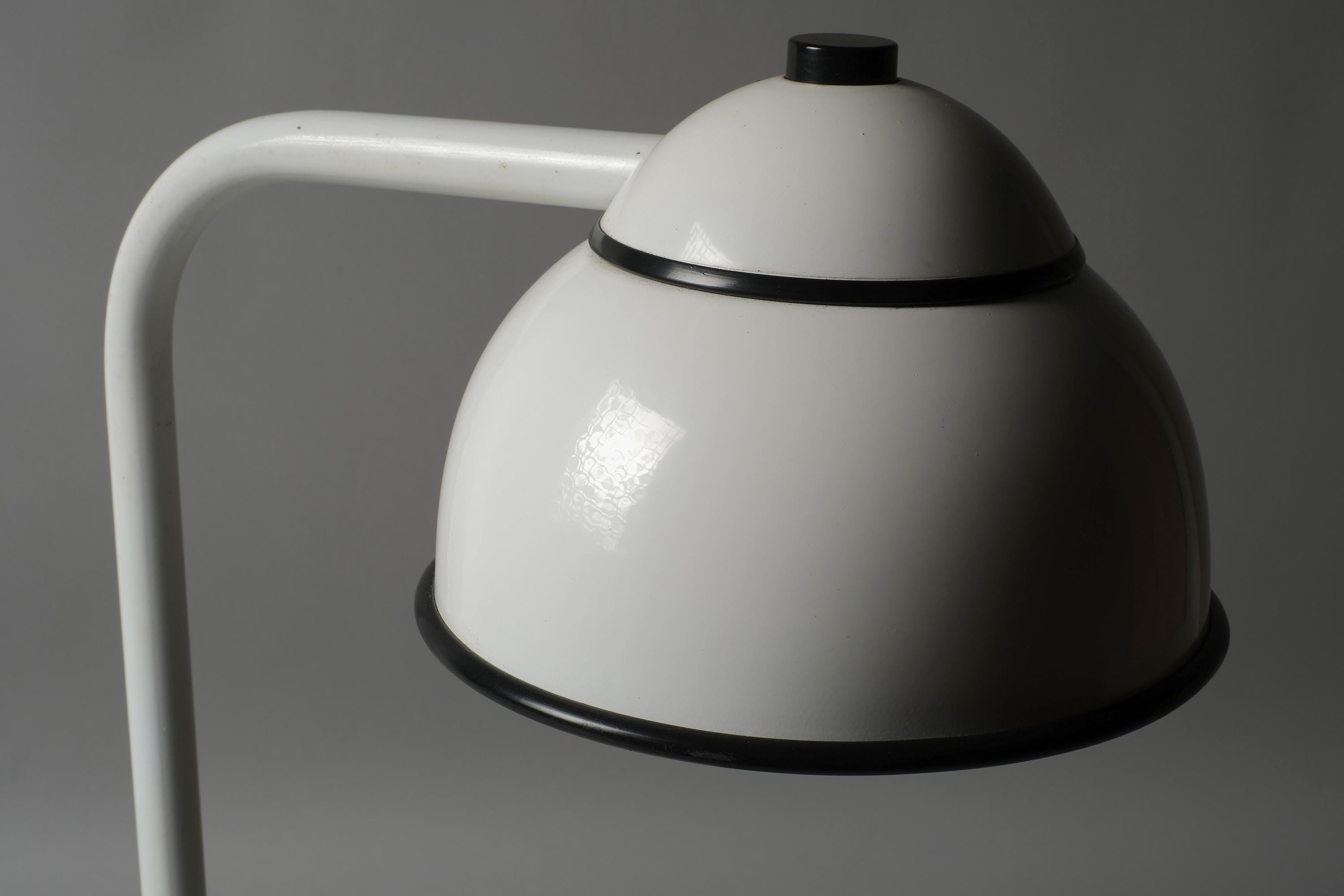 White lacquered steel in very good overall condition. A very small dent on the shade and age-related patina on the underside of the base. Fully functional.