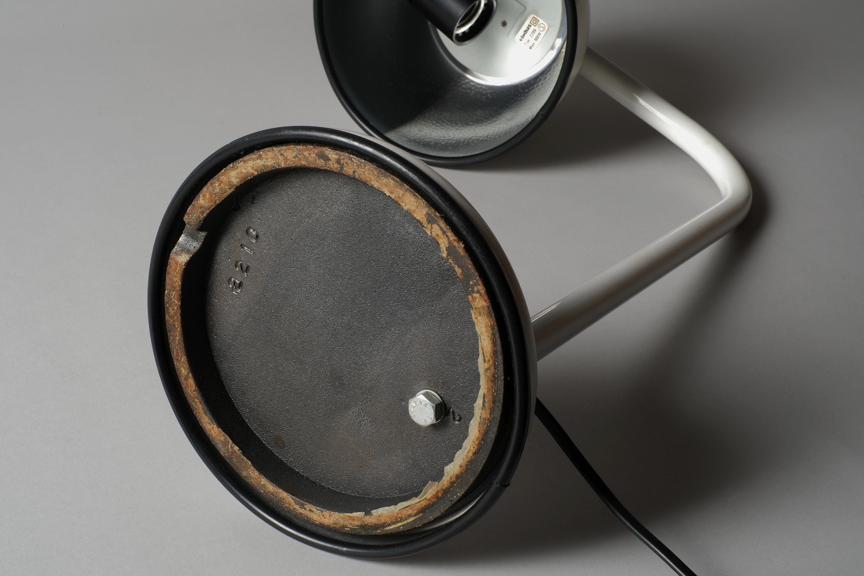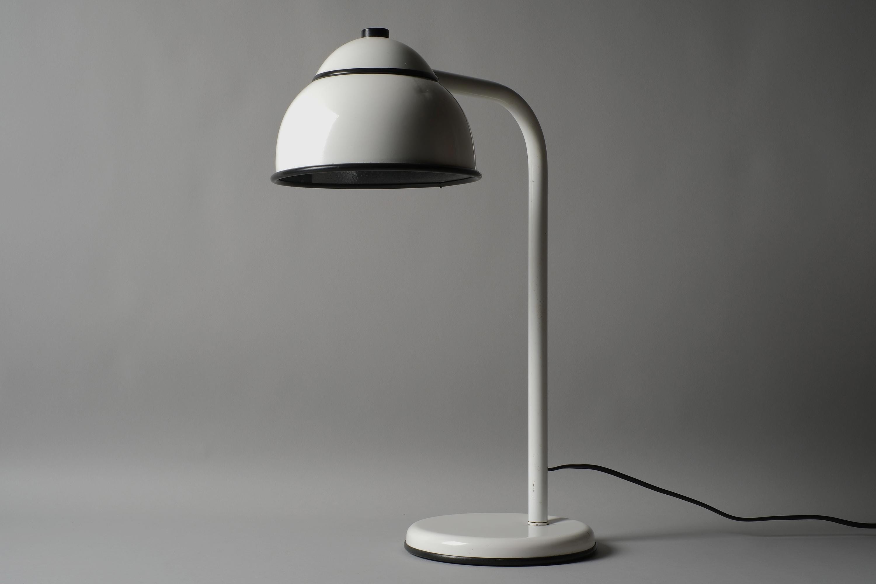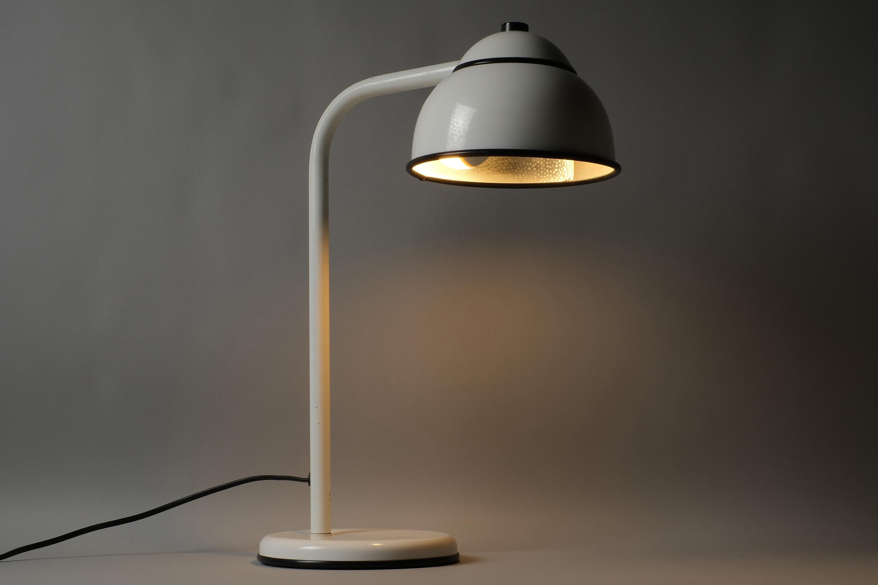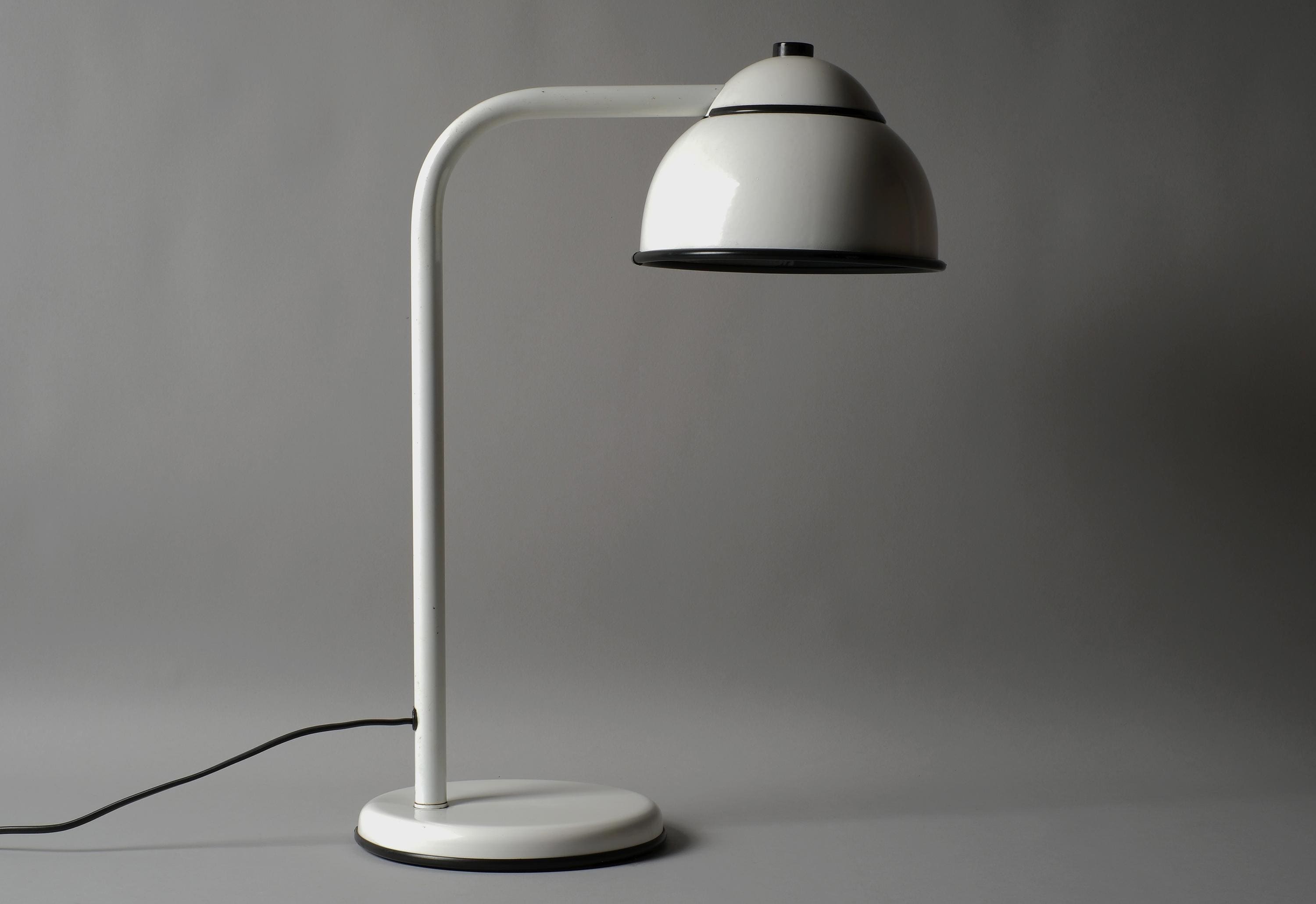 White lacquered steel in very good overall condition. A very small dent on the shade and age-related patina on the underside of the base. Fully functional.