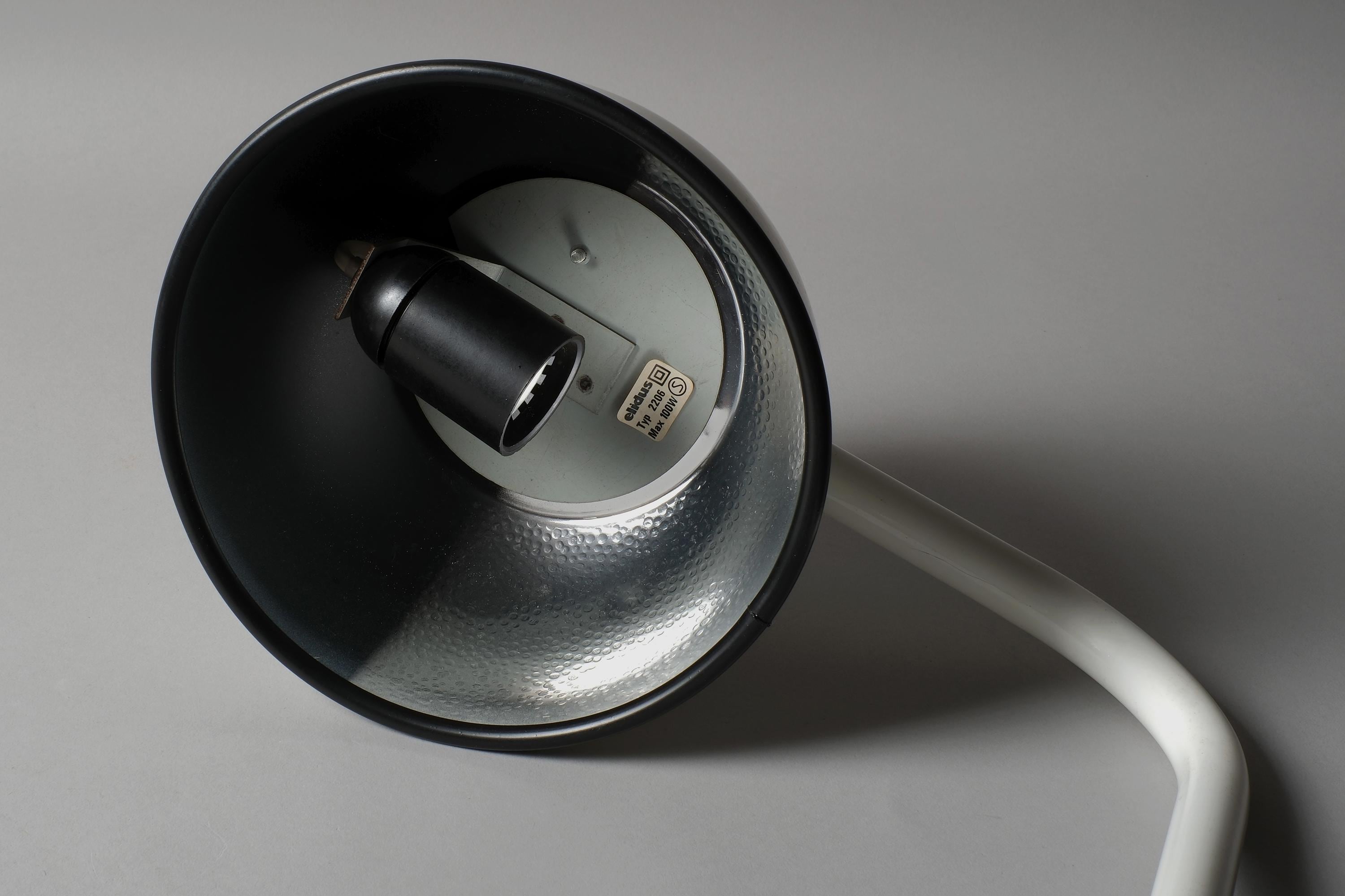 Elidus was founded by Hans-Agne Jakobsson, the Swedish designer whose lighting output across three decades remains among the most collected in Scandinavian modernism. The Type 2206 is a less documented model within the Elidus range, the dome shade on a long curved arm gives it a presence and scale that the more compact Kuben variants don't have. At 48 cm high, it fills a desk or bedside properly. The on/off switch integrated into the top of the dome is a functional detail that feels entirely resolved rather than added as an afterthought.