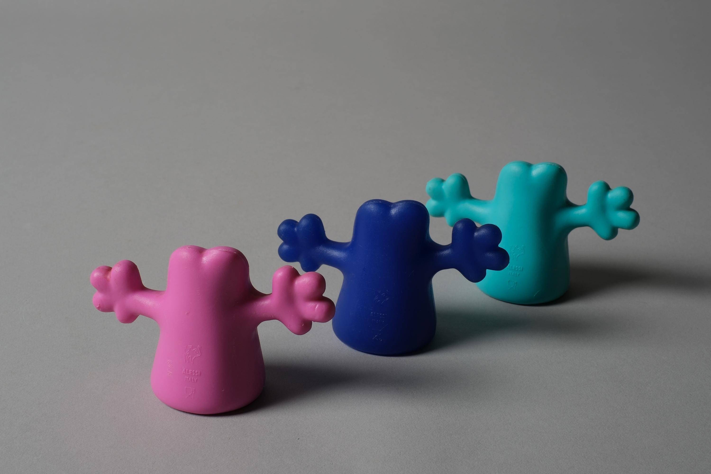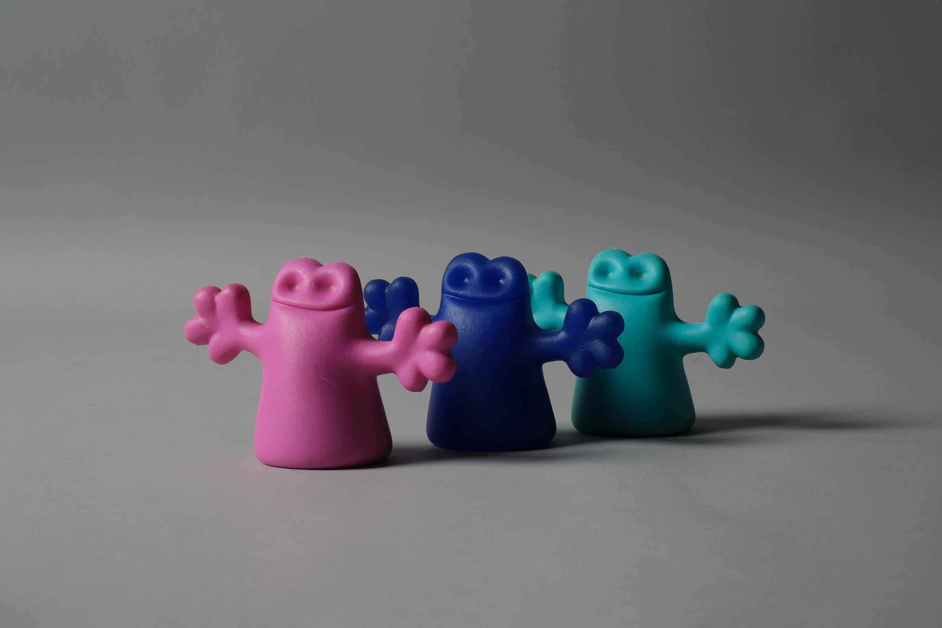 Three Alessi 'Carlo' ghost bottle caps by Mattia Di Rosa in aqua blue, cobalt blue and magenta pink, from the Family Follows Fiction metaproject that redefined what a designed domestic object could be.