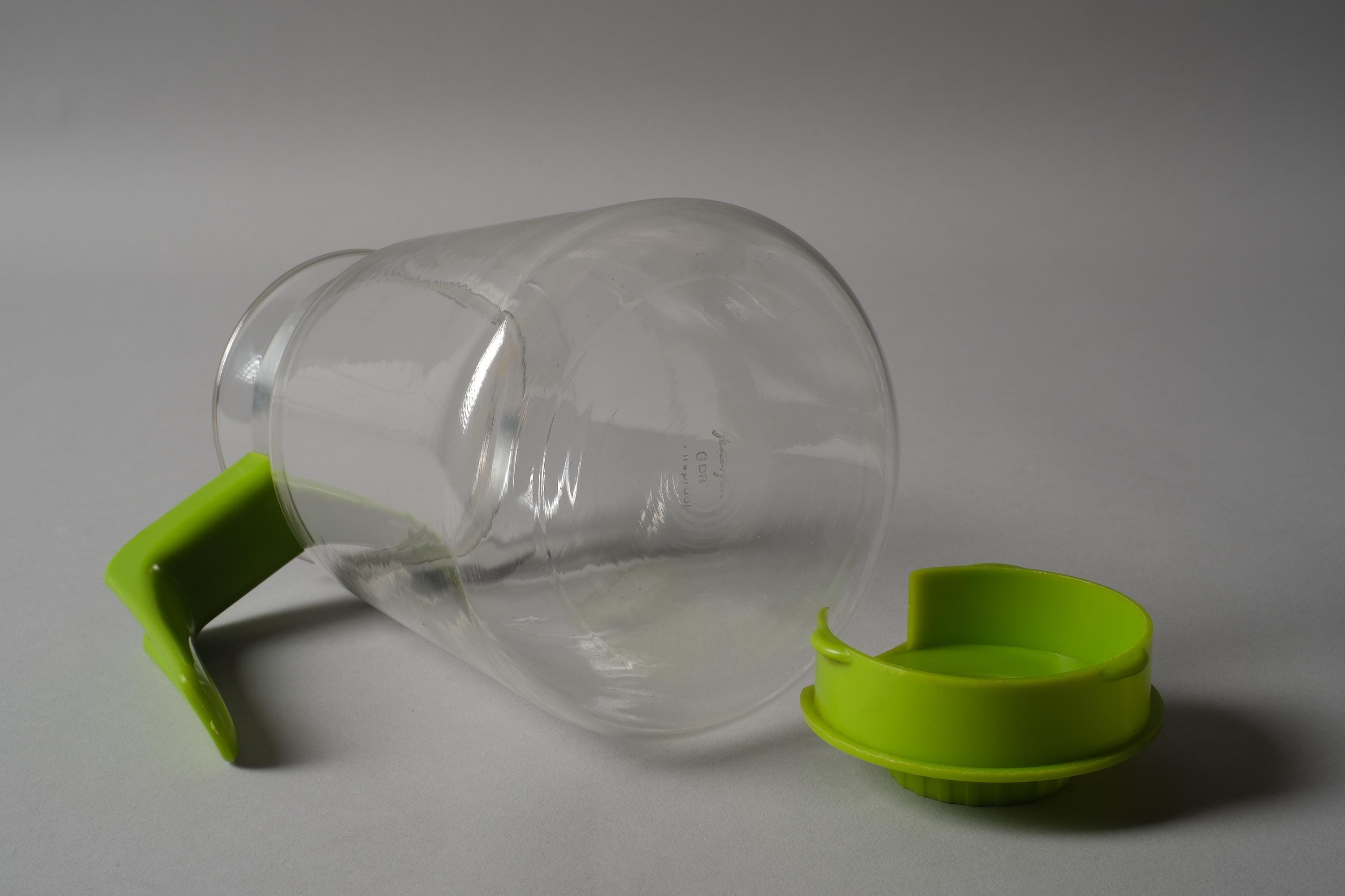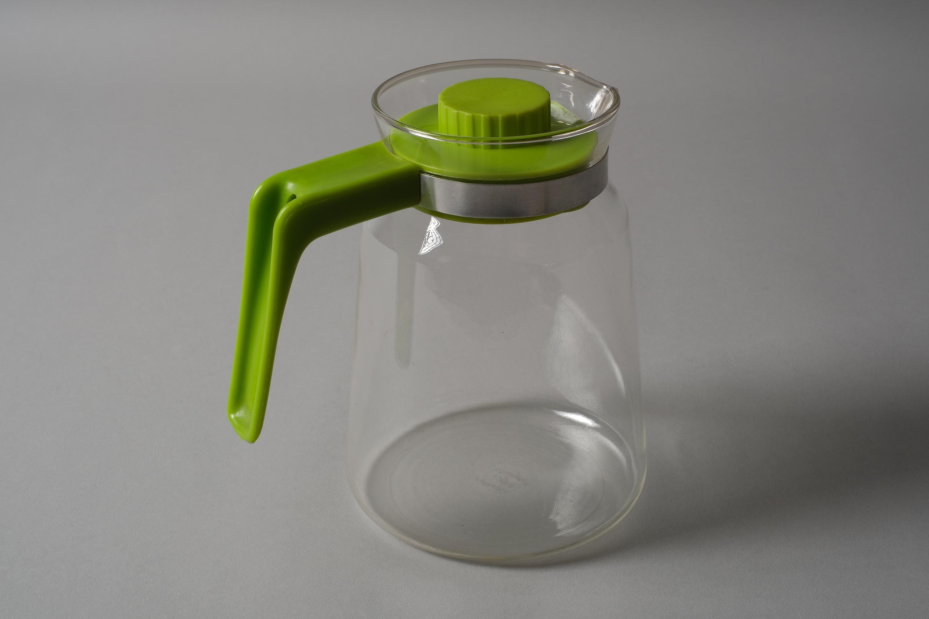 Jenaer Glas has been producing heat-resistant borosilicate glass in Jena, Germany since 1884. The GDR mark on the base places production in the East German period, when the Jena factory continued operating under state ownership with the same quality of glass and the same functional design language. The green plastic handle and lid are original and intact.