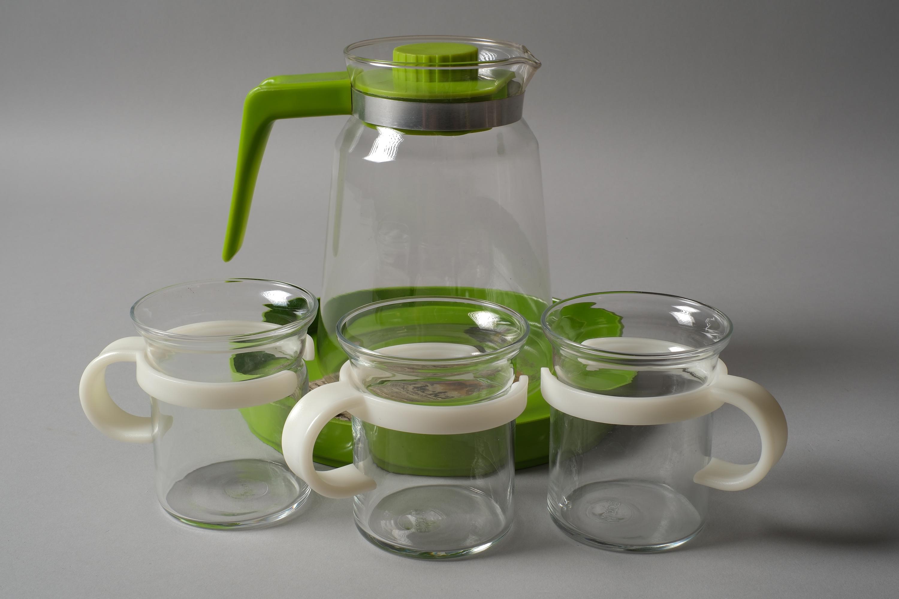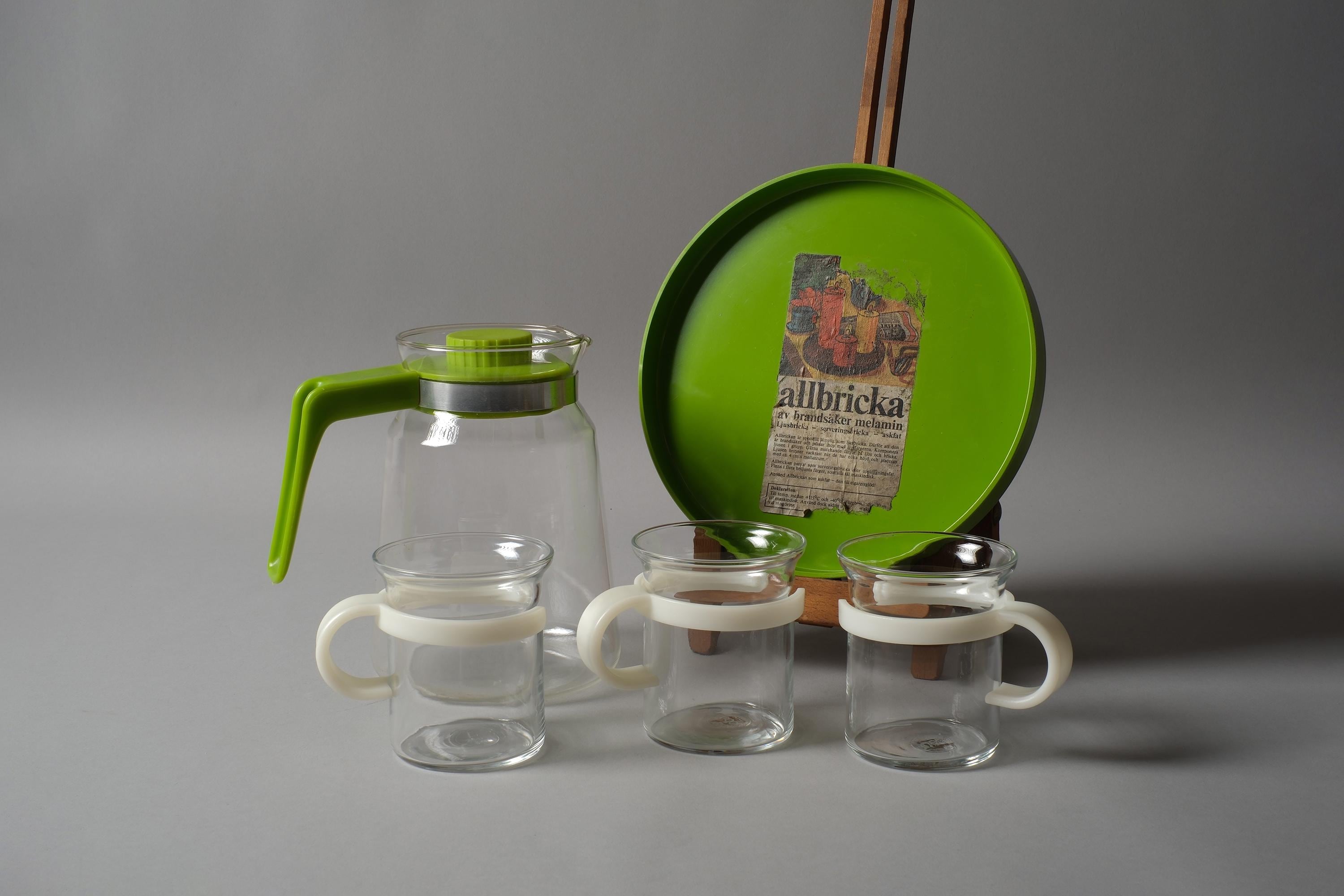 A cohesive green and clear glass serving bundle including a Jenaer Glas GDR carafe with green plastic handle, three Bodum Classic glass mugs with white plastic casings, and a NOS green melamine tray from Sweden, assembled around a shared material palette.
