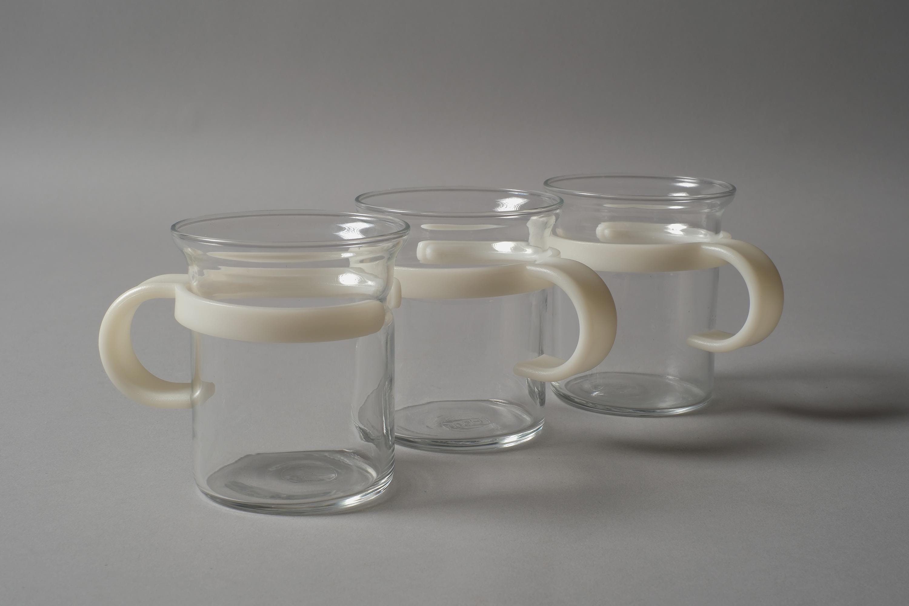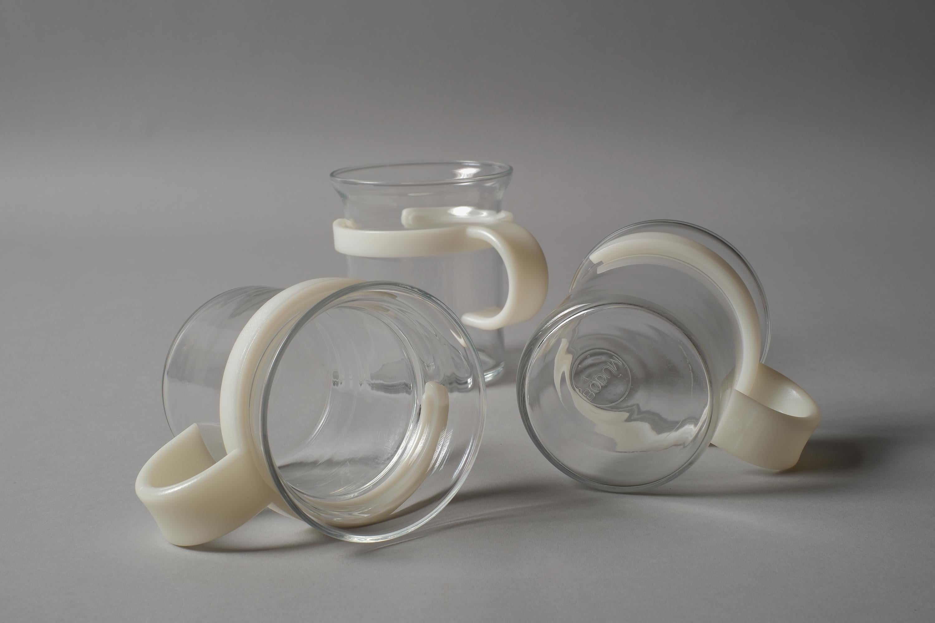 The three Bodum Classic glass mugs carry the early engraved Bodum logo, a pre-1990s mark that confirms these are from the original production run of one of the most enduring glass mug designs in Scandinavian kitchenware history. All three mugs are present with their white plastic casings.