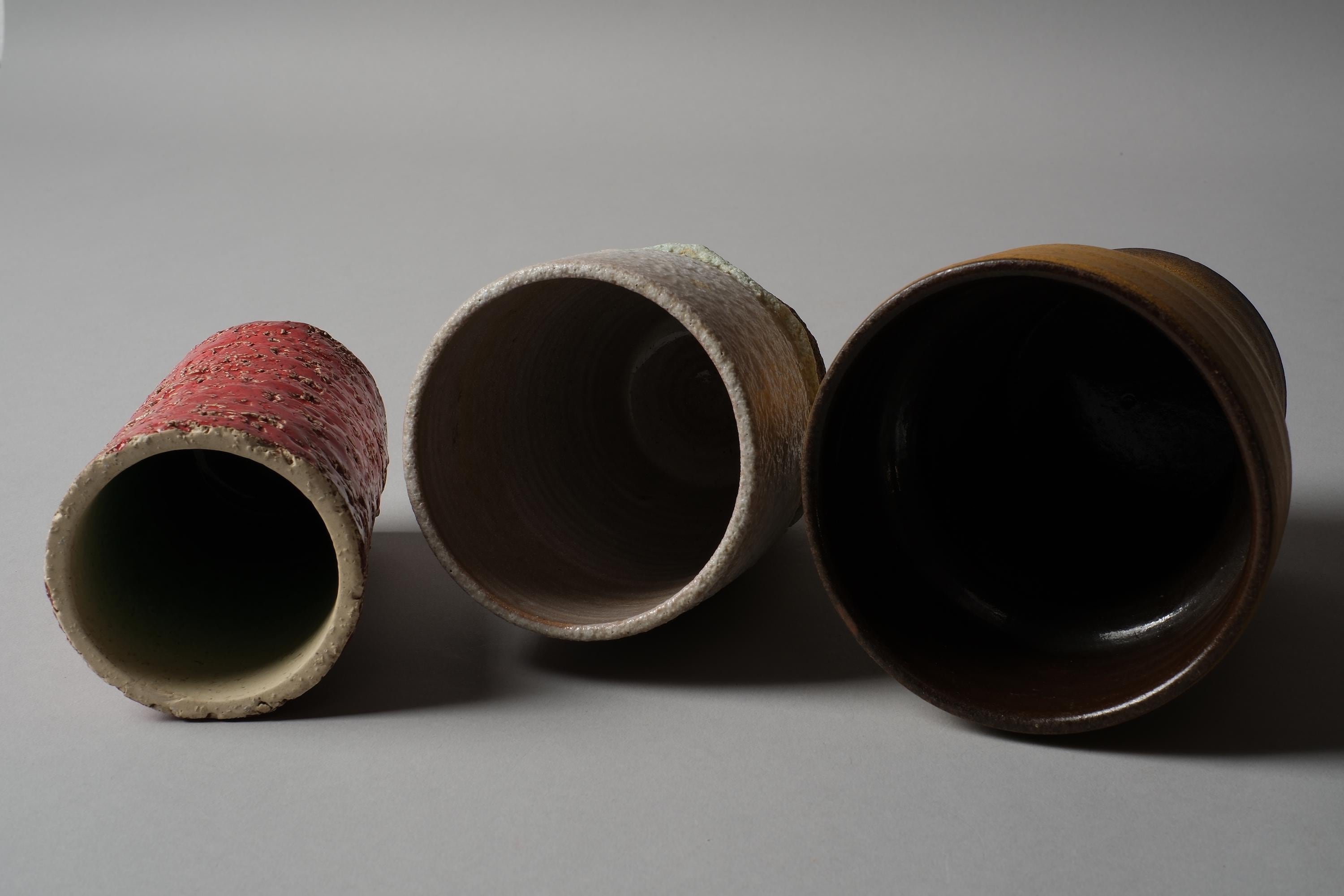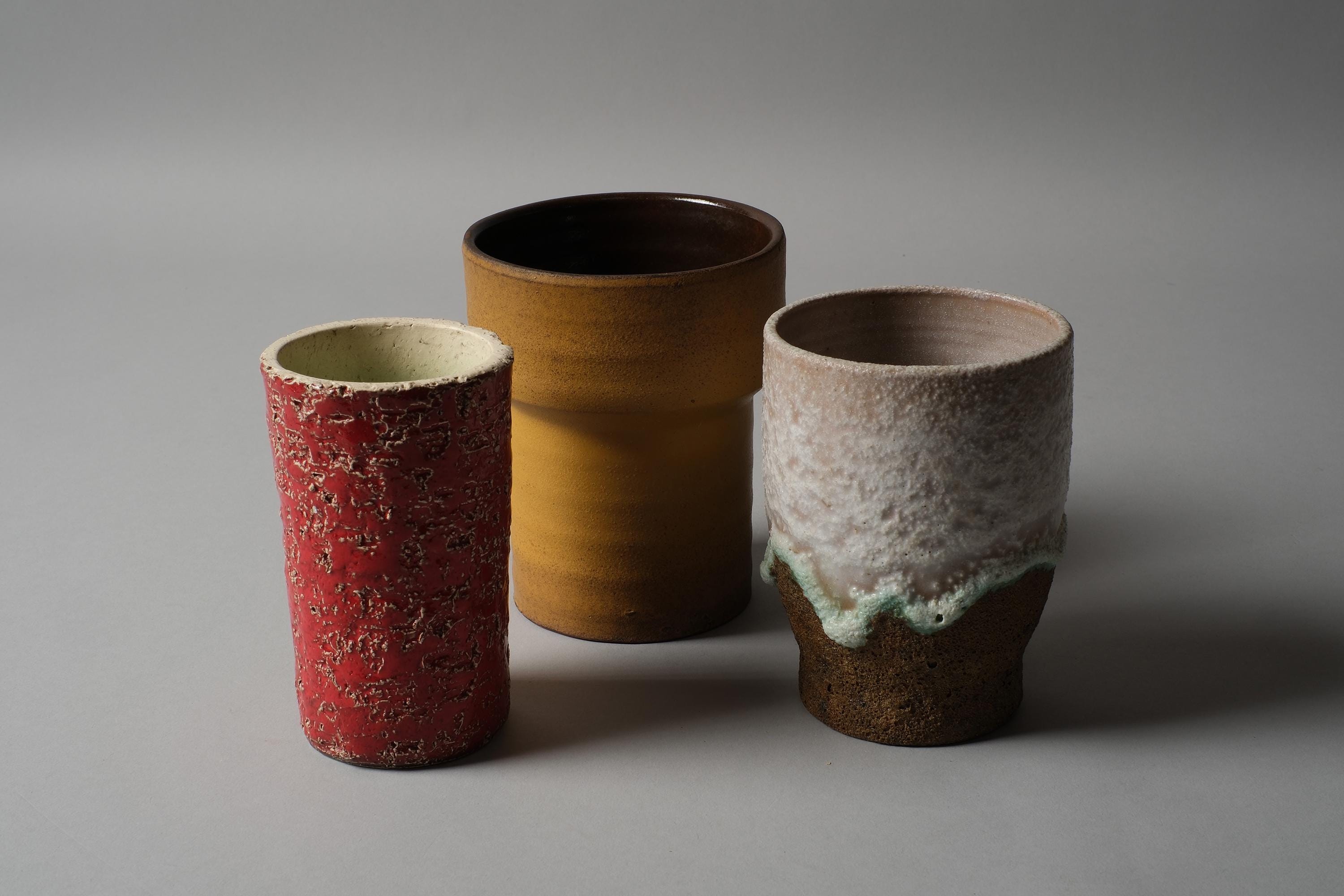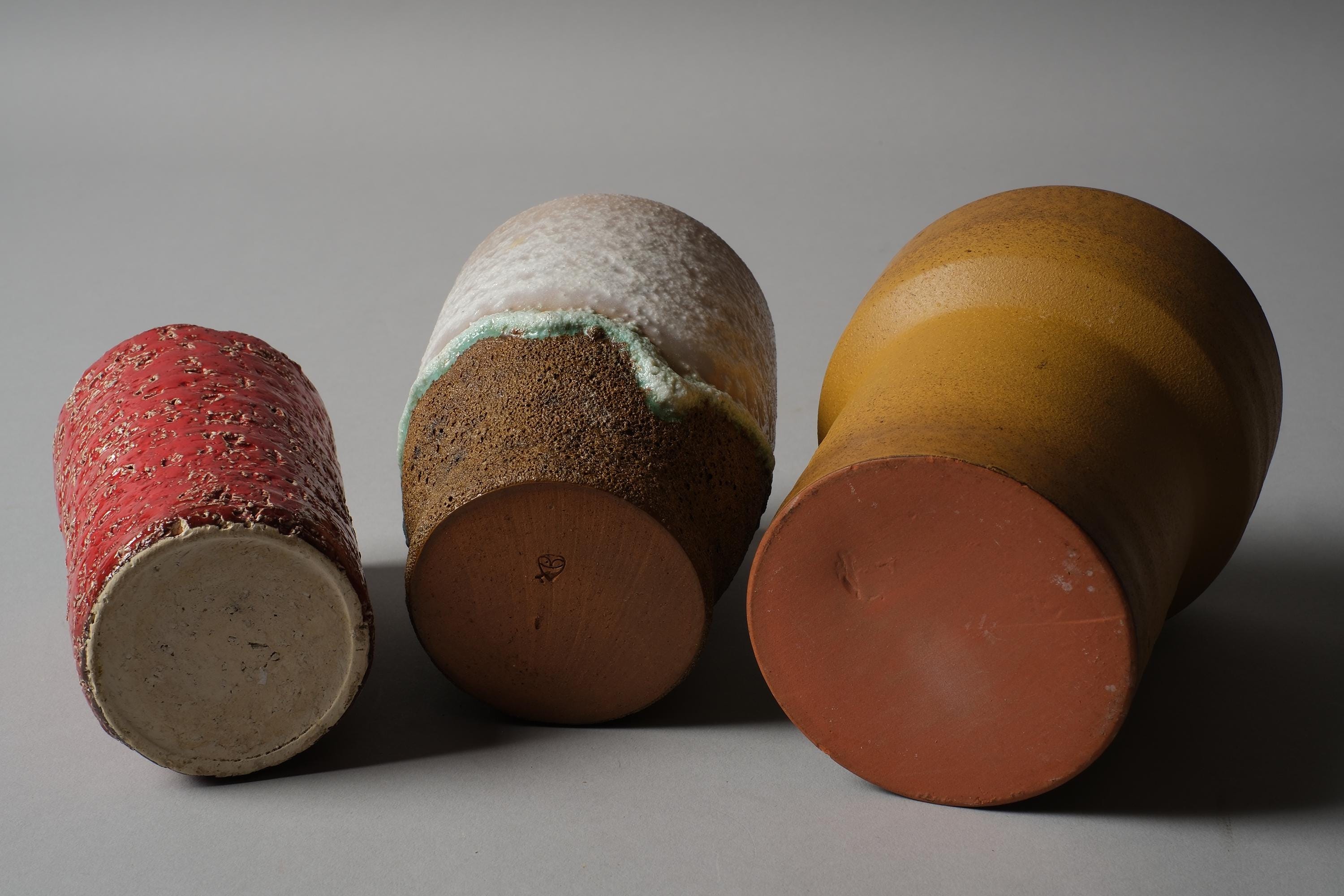 The oxblood-red earthenware bud vase is anonymous but formally strong, the dense textured surface and deep red glaze give it a brutalist presence that earns its place alongside the Goosen. The mustard yellow pottery vase, with its clean thrown form and warm glaze, anchors the set chromatically.