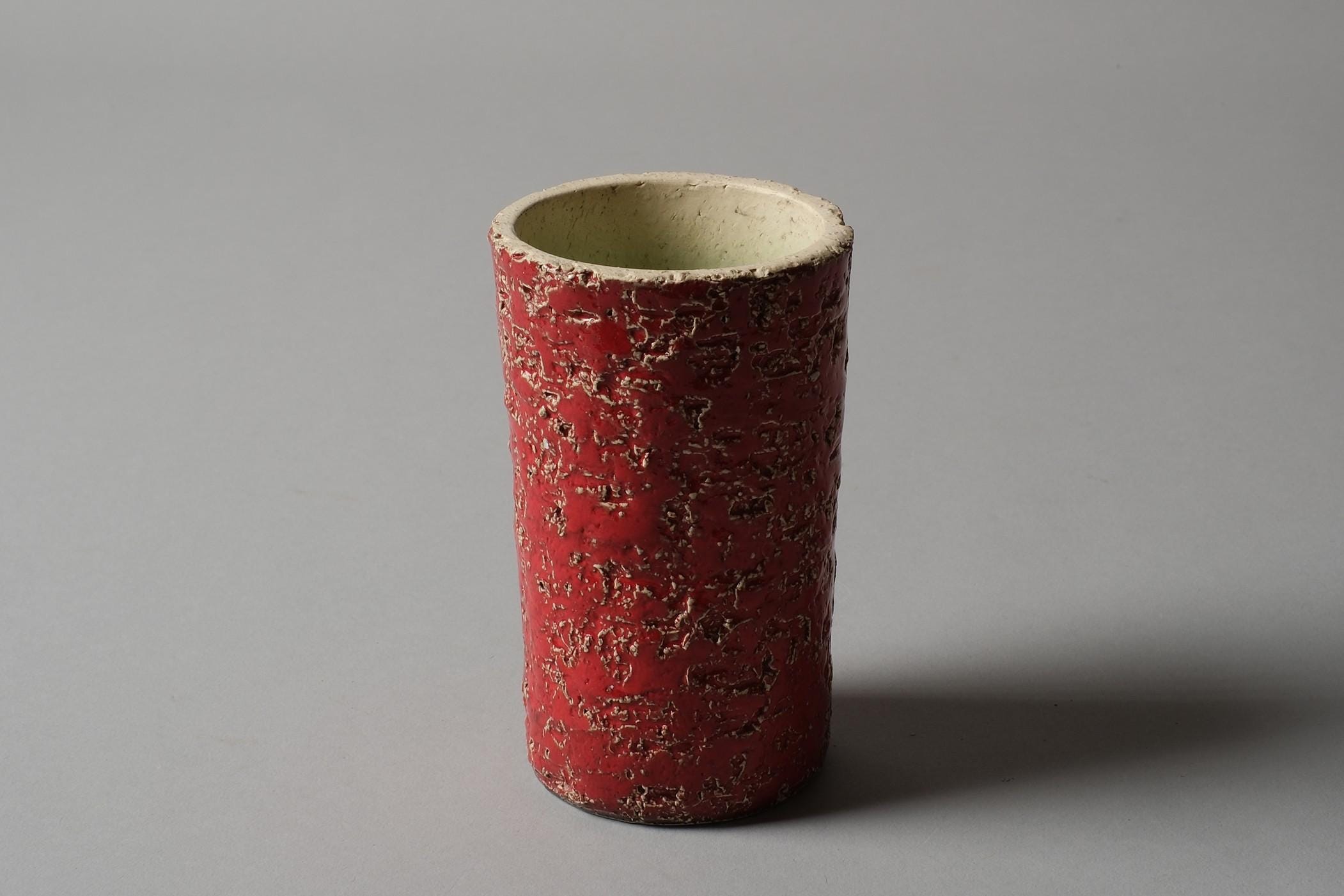 • Oxblood vase: Ø7 x H11.5 cm, textured red earthenware, unsigned.