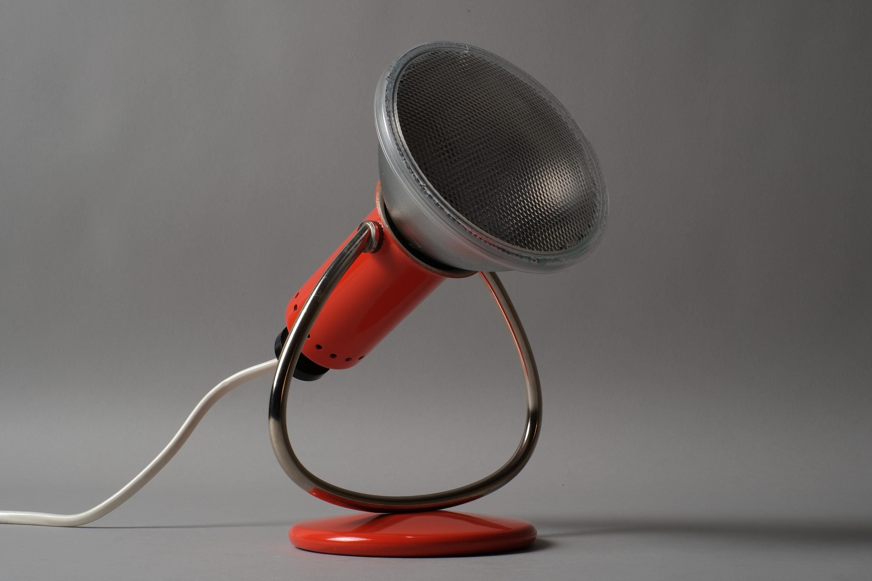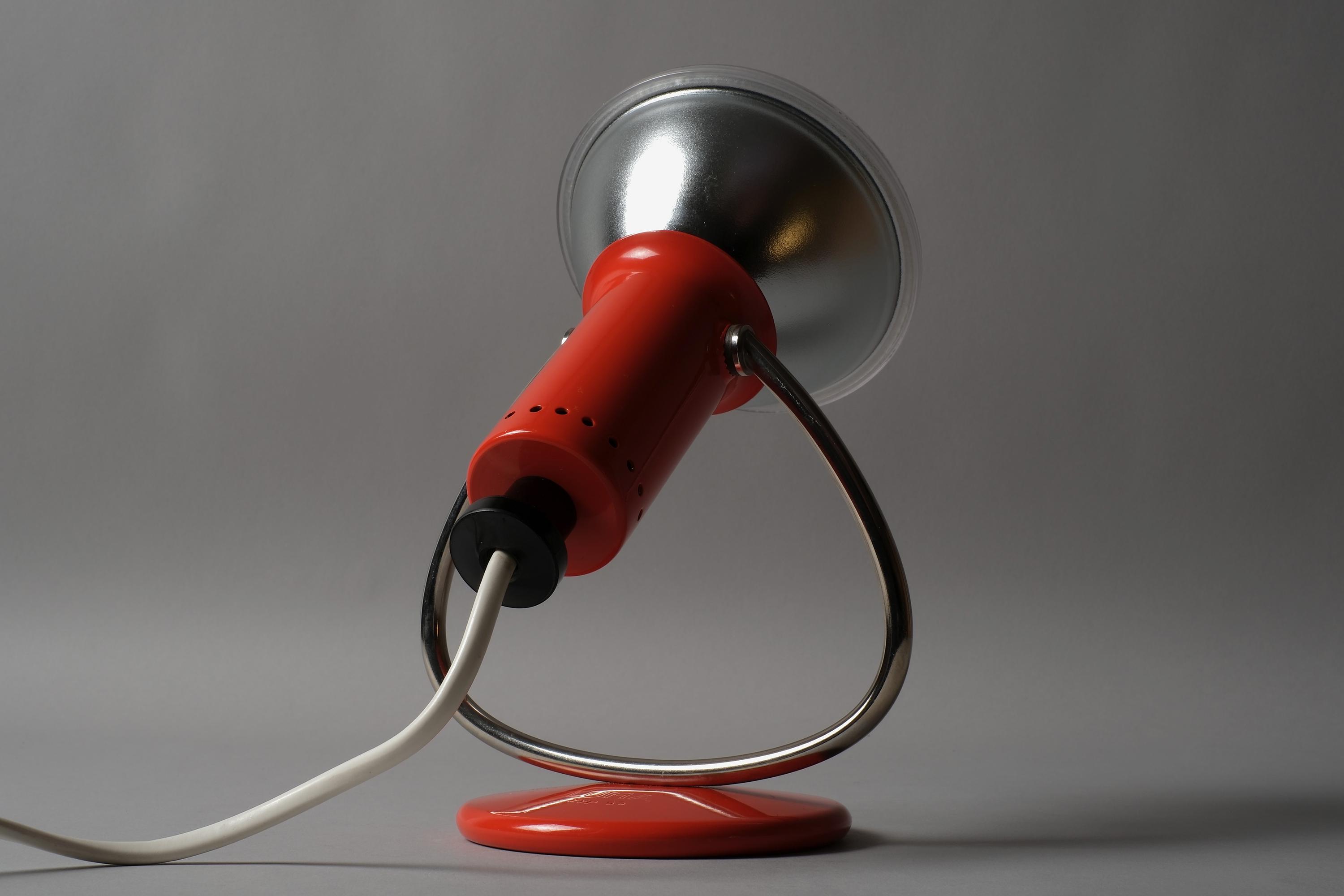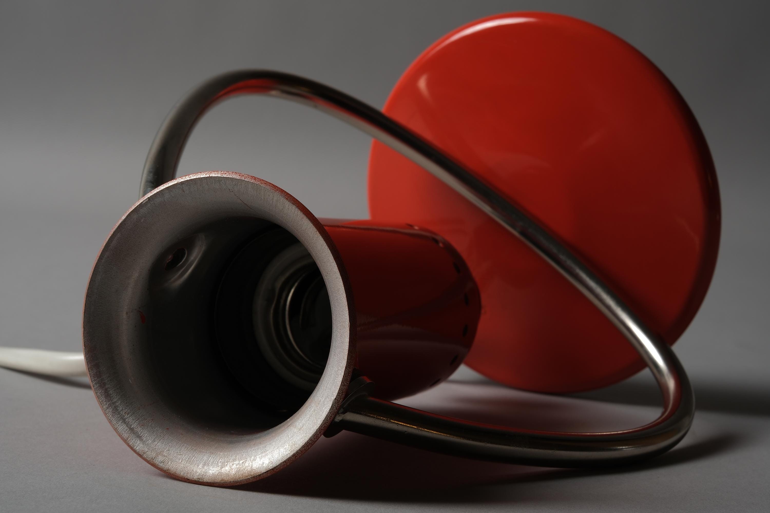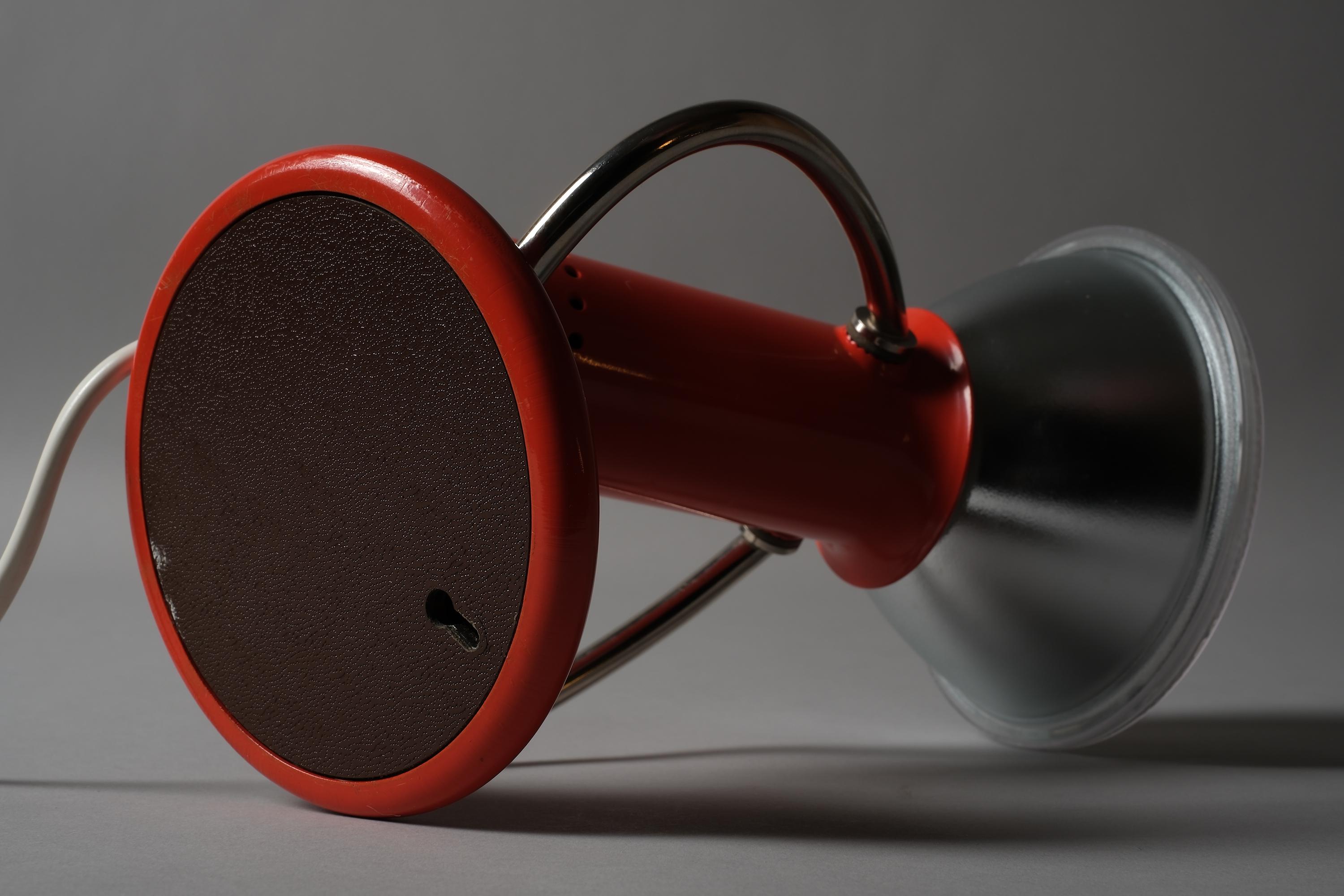 Luma Type 53 desk and wall lamp in orange lacquered metal with a chrome curved arm and circular weighted base, dual function as a desk lamp or wall-mounted via the integrated hook on the base. Excellent condition with no chips, dents or damage to the shade or base.
