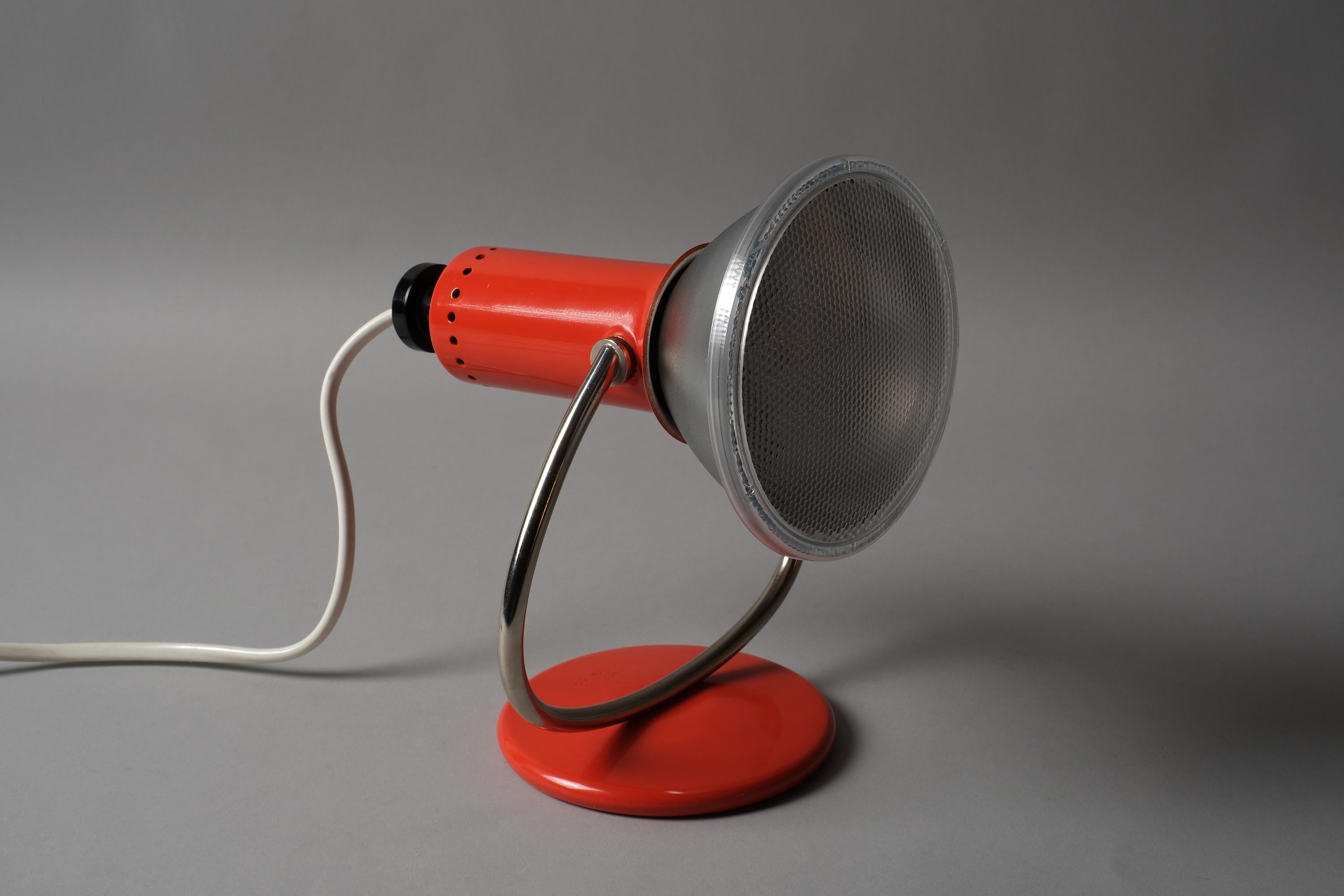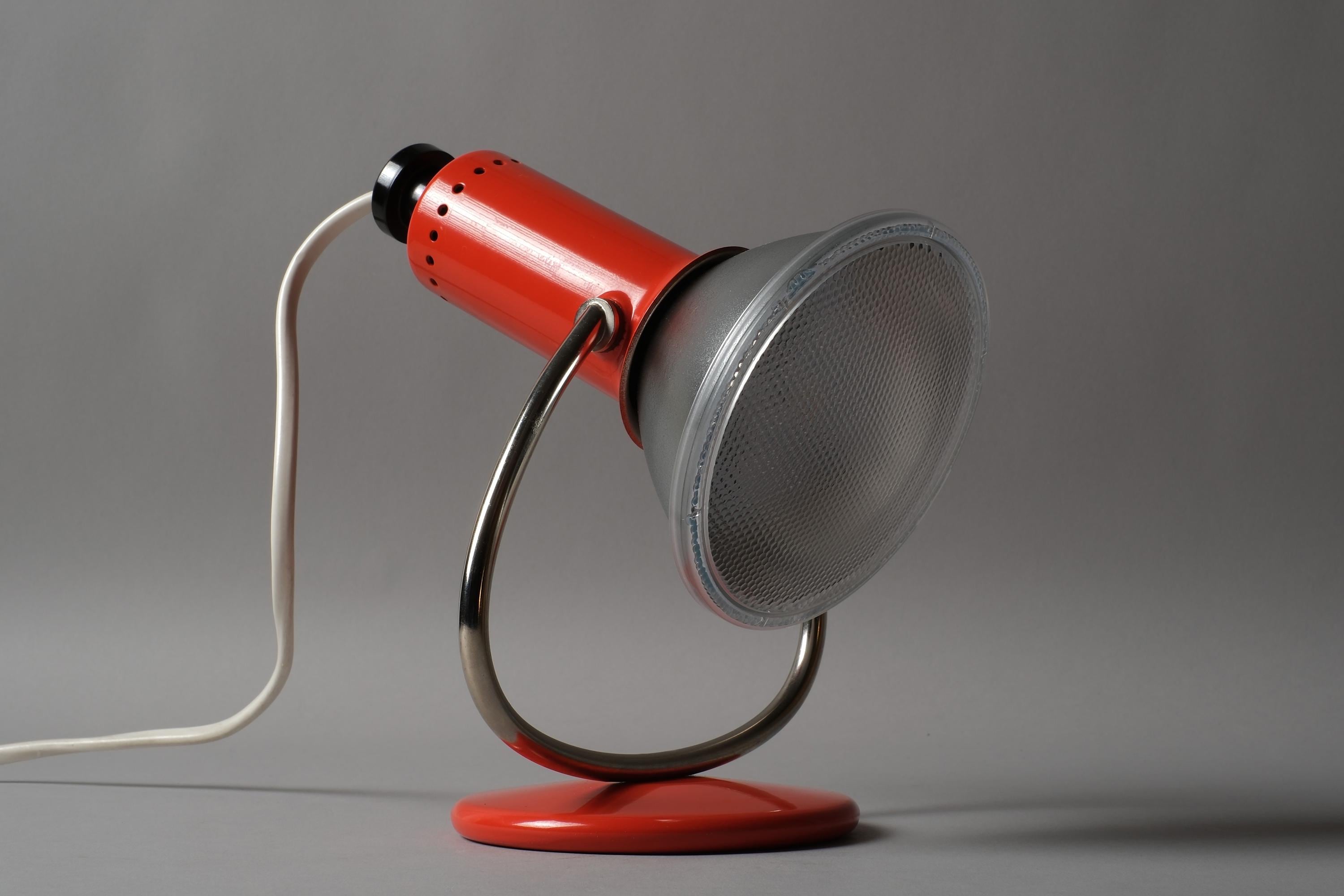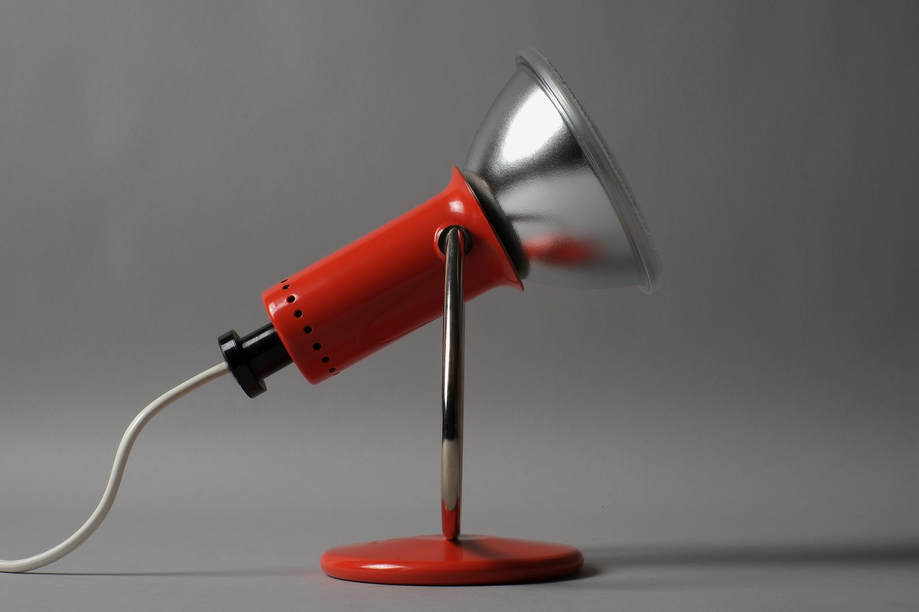Luma Type 53 desk and wall lamp in orange lacquered metal with a chrome curved arm and circular weighted base, dual function as a desk lamp or wall-mounted via the integrated hook on the base. Excellent condition with no chips, dents or damage to the shade or base.