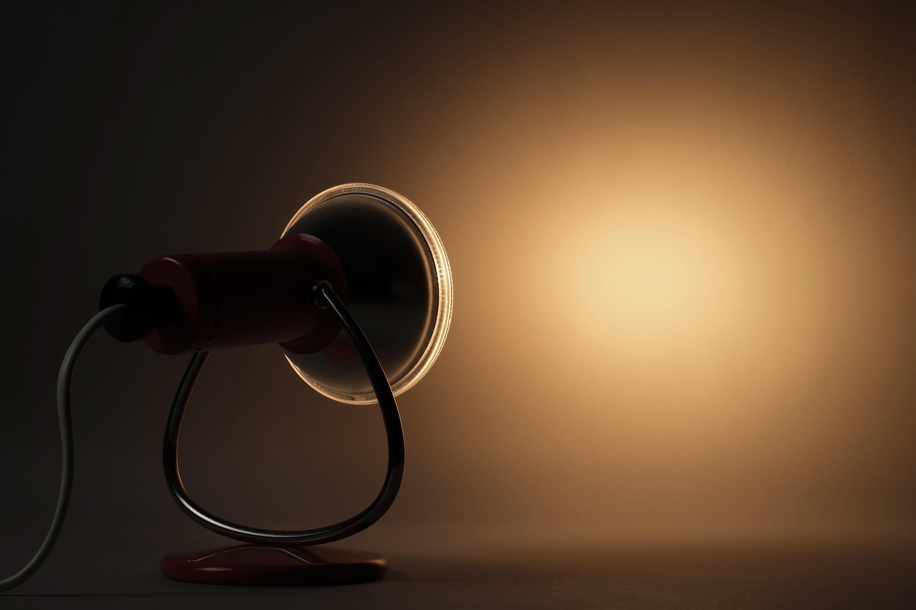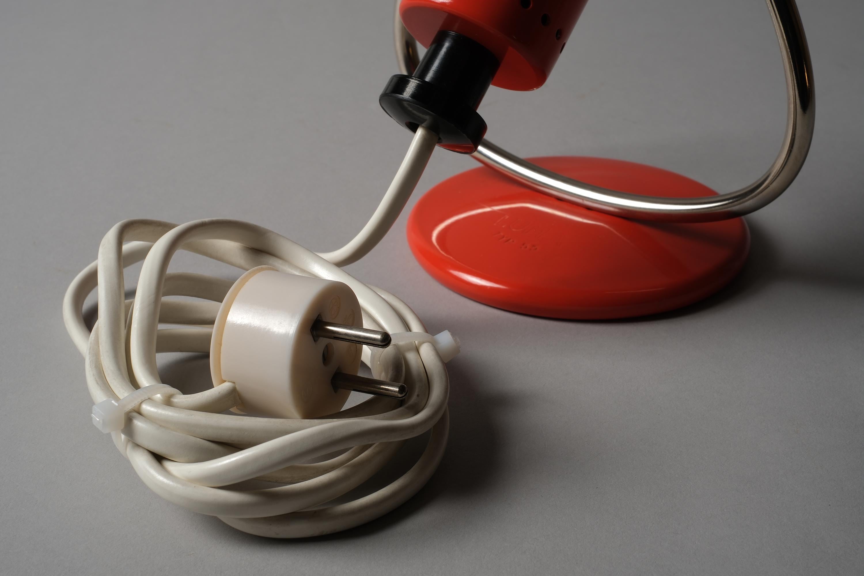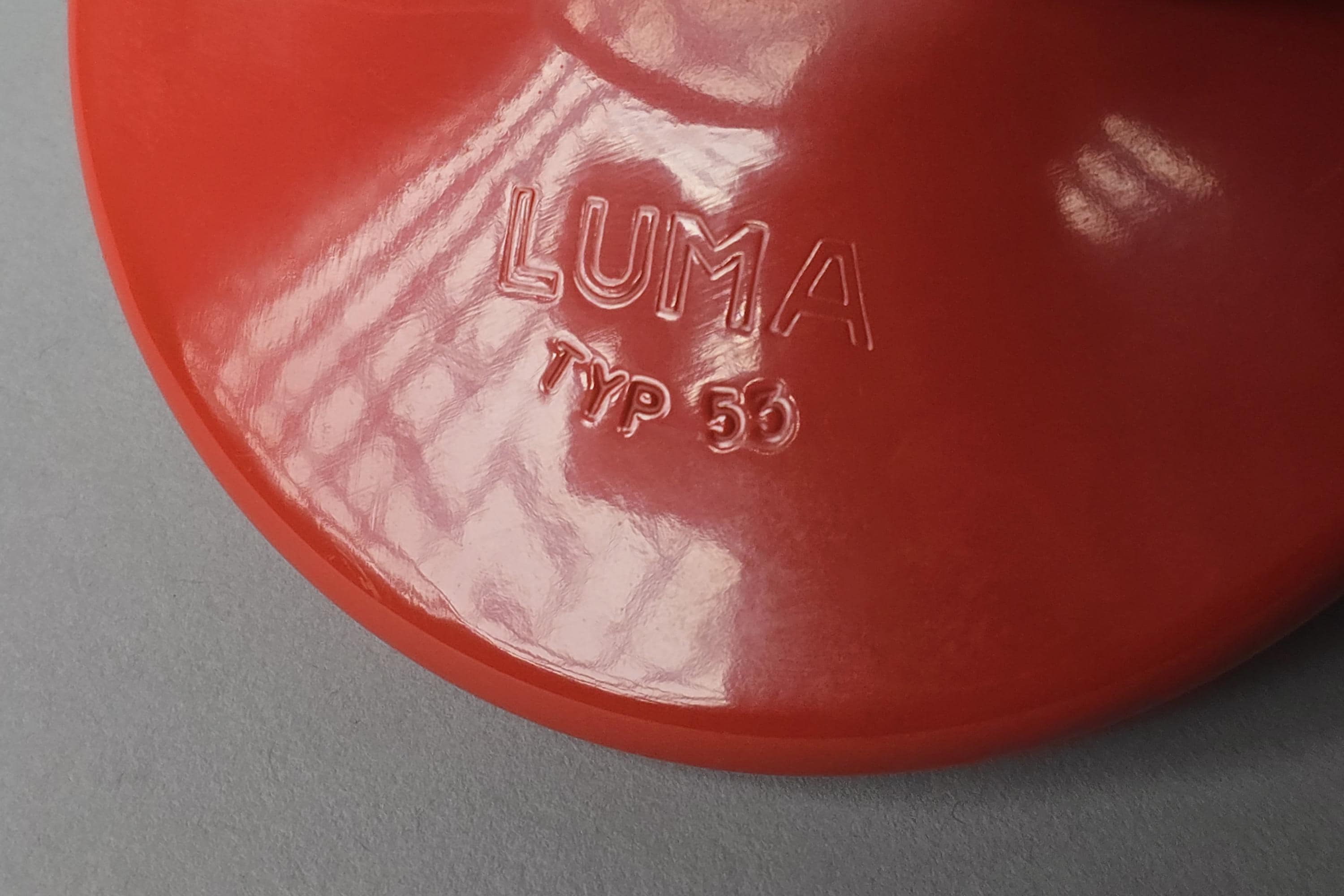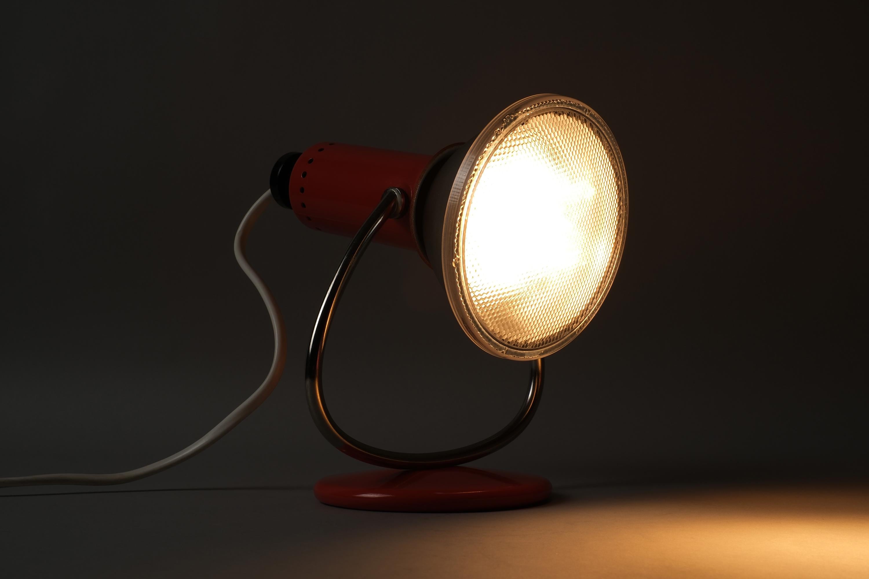 Luma Type 53 desk and wall lamp in orange lacquered metal with a chrome curved arm and circular weighted base, dual function as a desk lamp or wall-mounted via the integrated hook on the base. Excellent condition with no chips, dents or damage to the shade or base.