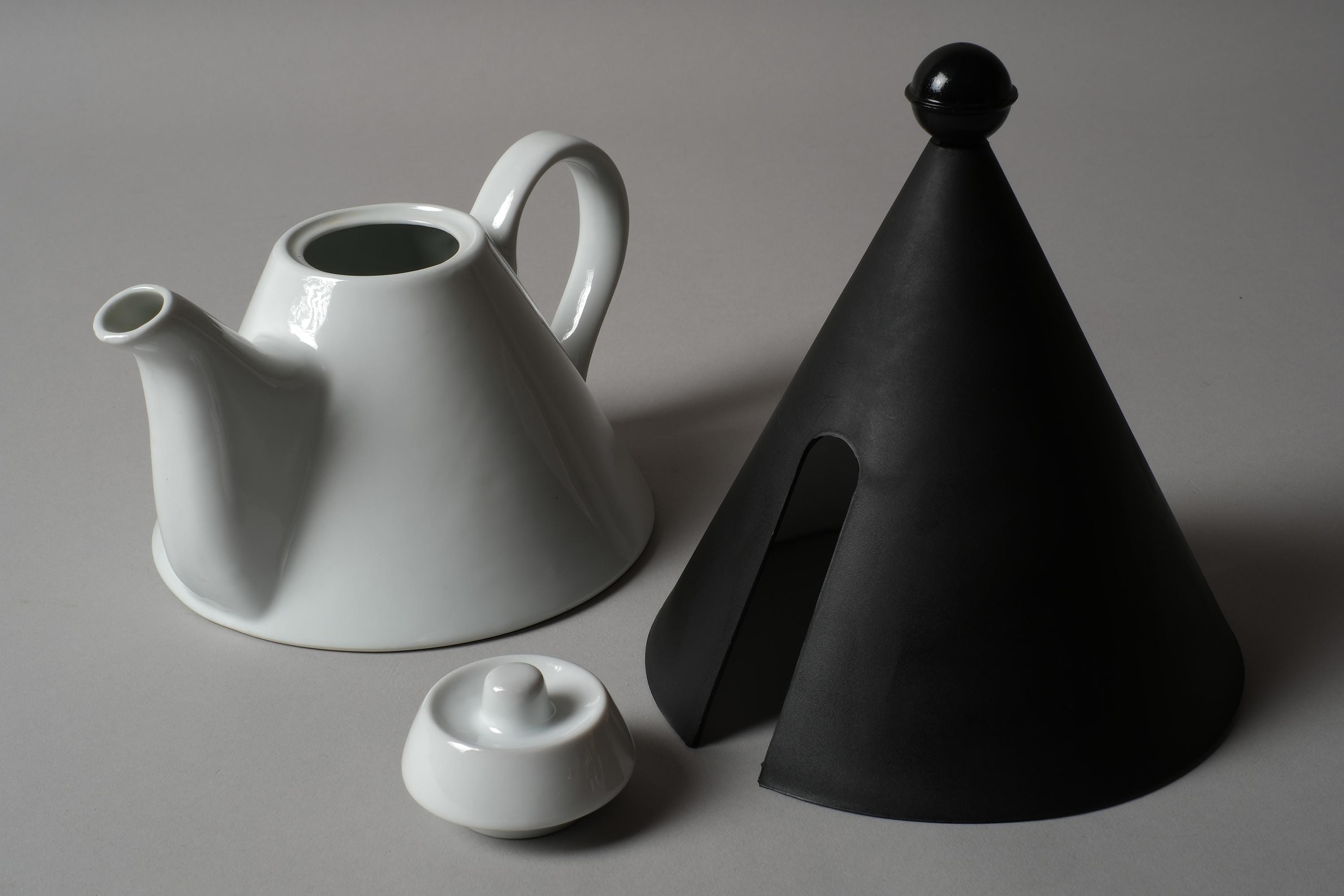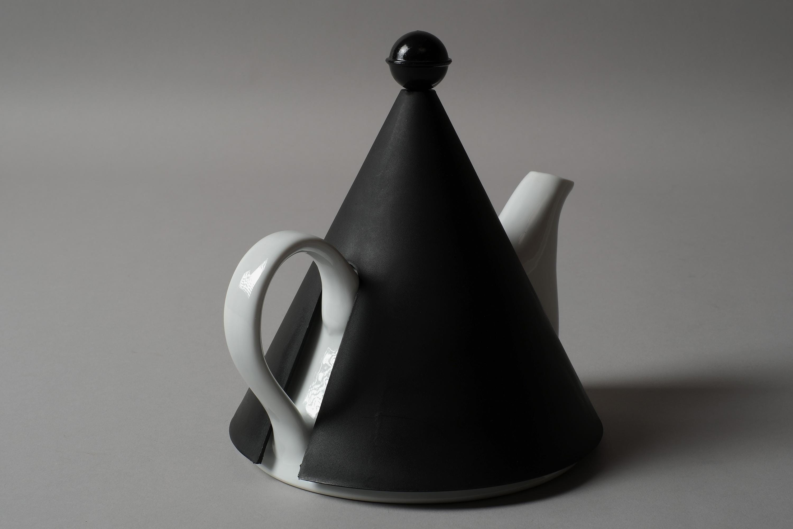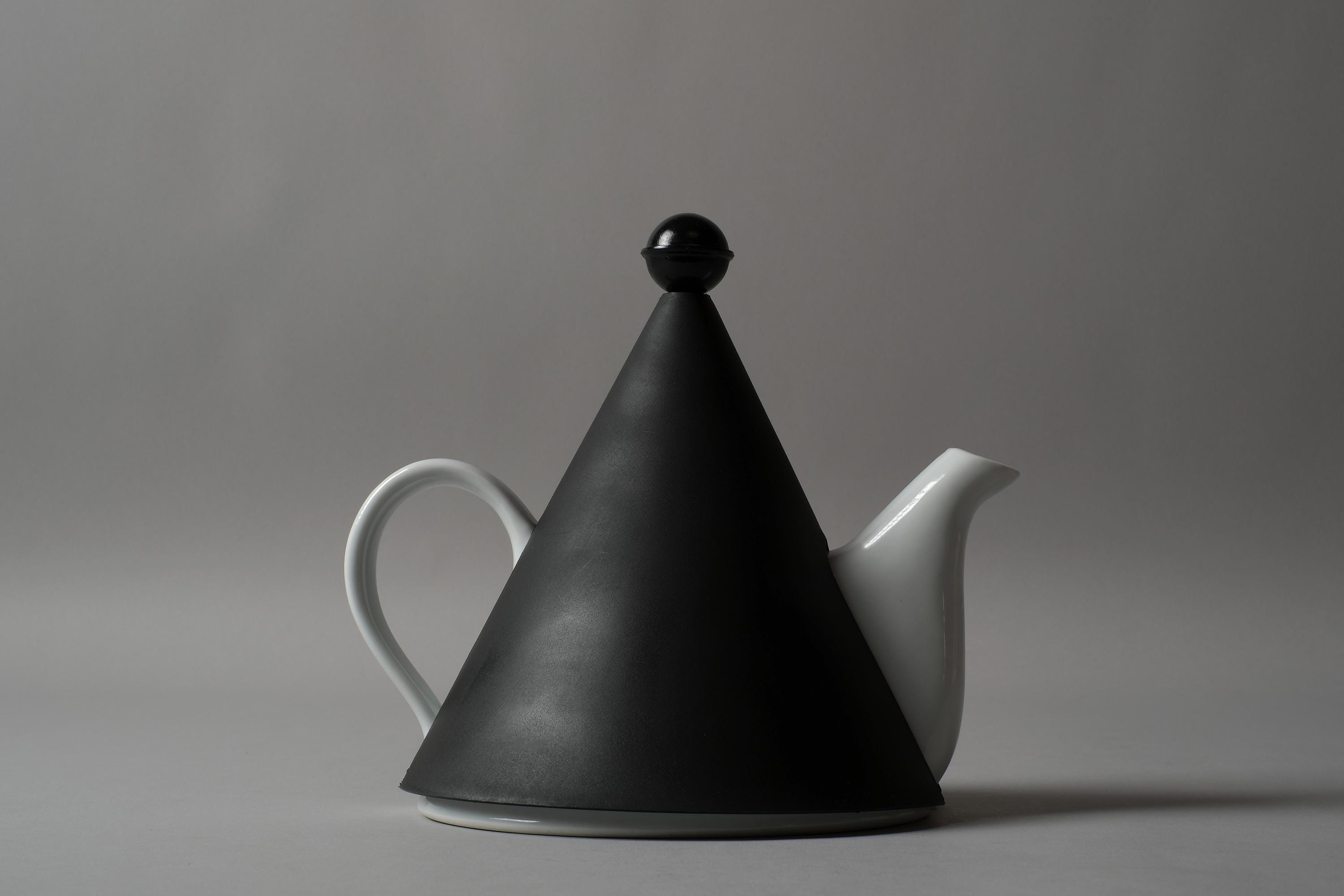 The Puur teapot is white ceramic with a removable black plastic cone-shaped insulating cover lined with felt, keeping the tea warm after brewing. The cone form is the design statement in matte black against the white ceramic body, the spherical knob at the tip completing the silhouette. Made in Holland, late 1990s.